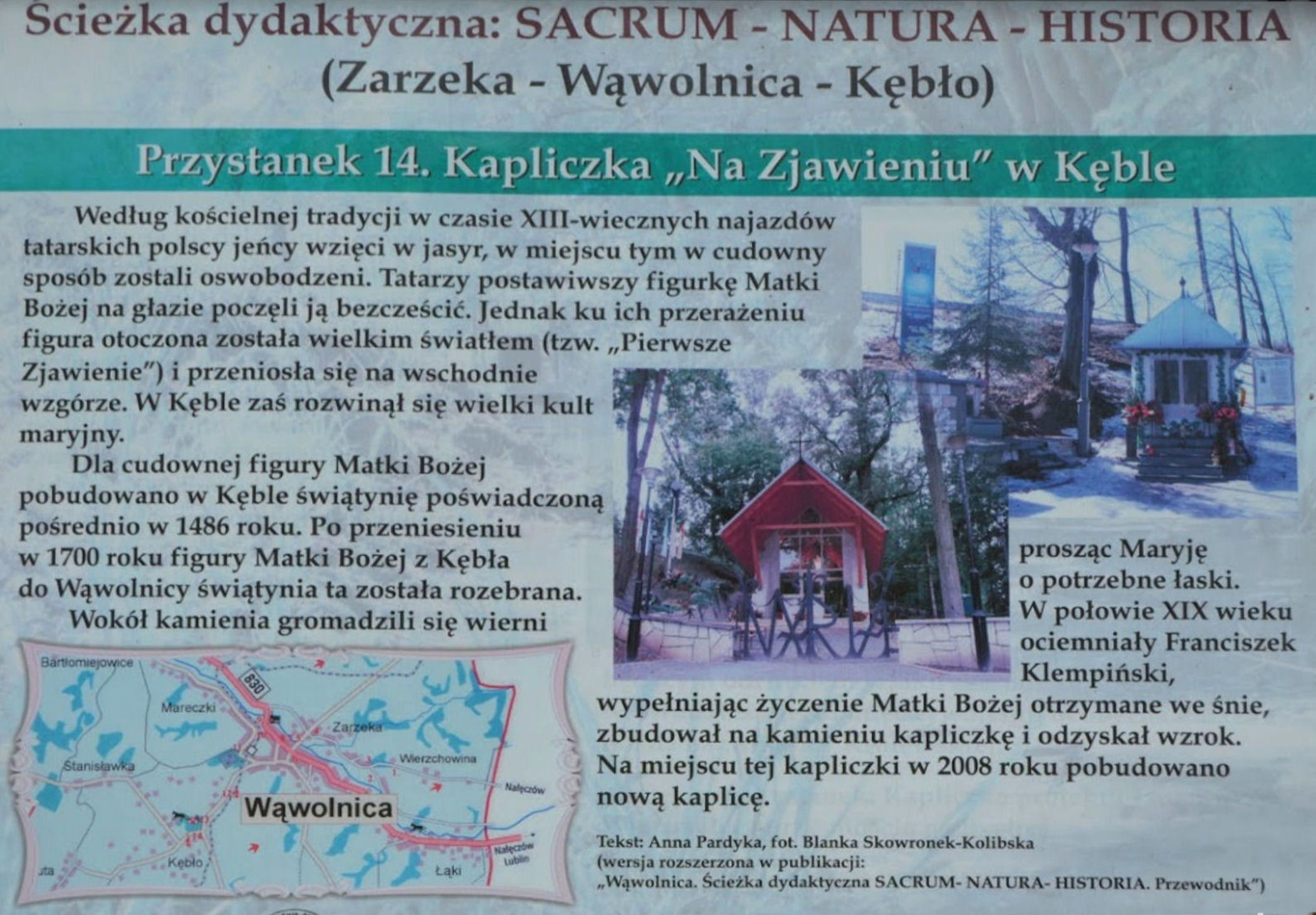 Wyjeżdżając z Nałęczowa mijamy Kapliczkę w Kęble . Miejsce oznaczone jest na mapie jako miejsce objawień Matki Bożej Ķębelskiej z Wąwolnicy. Opowieść i historia tego miejsca na tablicy (załączone zdjęcia) dla zainteresowanych .