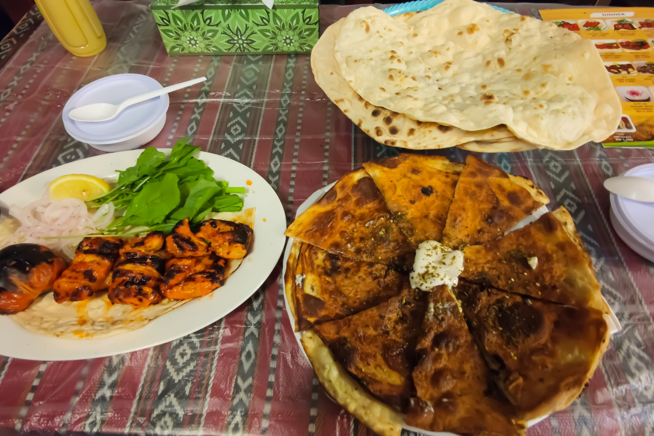 W kwestii jedzenia funkcjonuje tu prawdziwe „multi-kulti”. Skosztujemy tu chyba wszystkich możliwych kuchni świata, ale najtrudniej tu o kuchnie lokalną. Plotka głosi, że w Bahrajnie nie ma restauracji z jedzeniem tradycyjnym, a jeśli chcesz zjeść autentyczne jedzenie, wproś się do czyjegoś domu. To jednak plotka, bo zjedliśmy fantastyczne wyroby kuchni w knajpce w suku (patrz link powyżej). W galerii poniżej ta właśnie knajpka i menu z cenami. Ten placek o wyglądzie pizzy – to najlepsza rzecz jaką jedliśmy w Bahrajnie.
