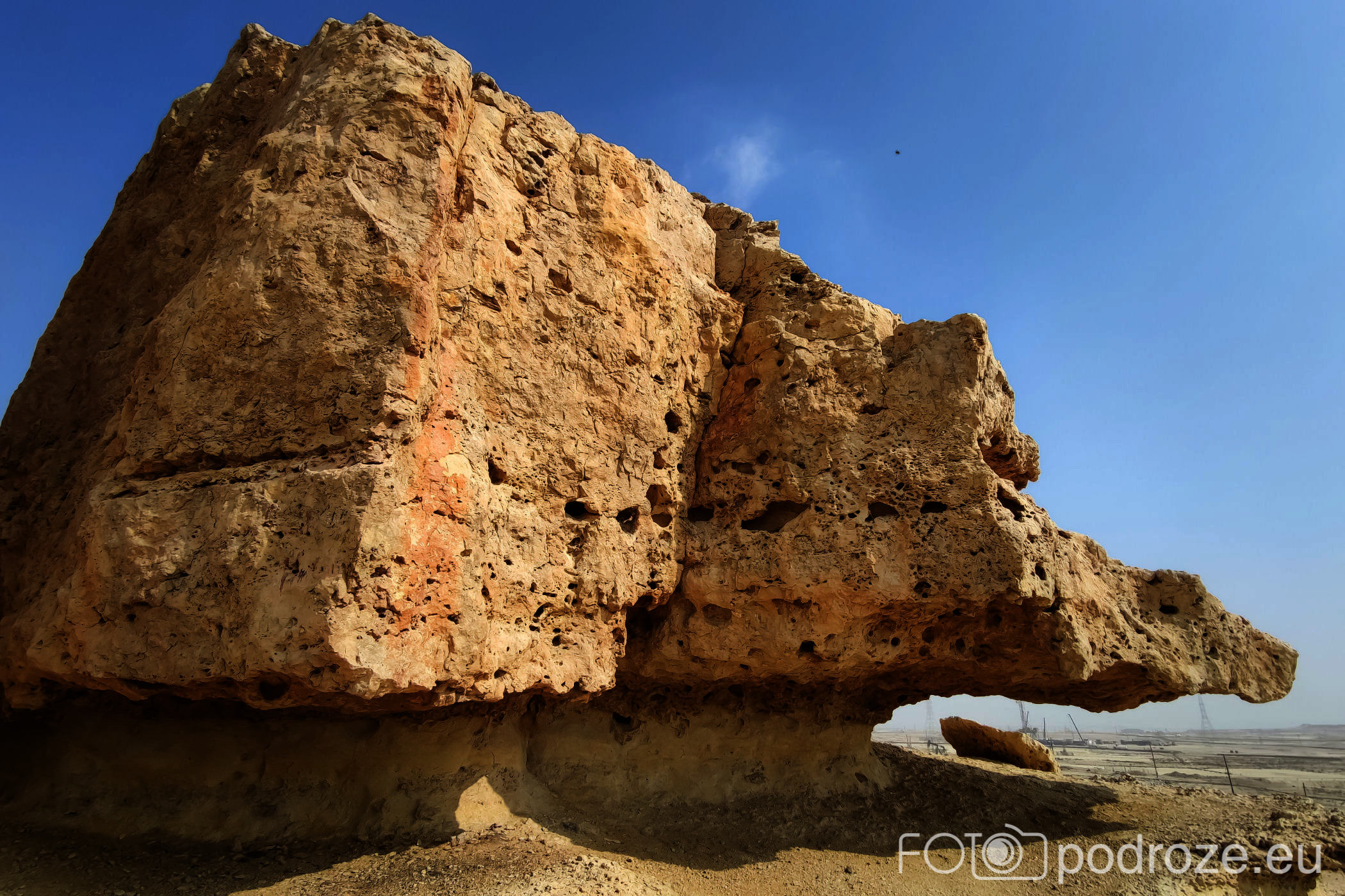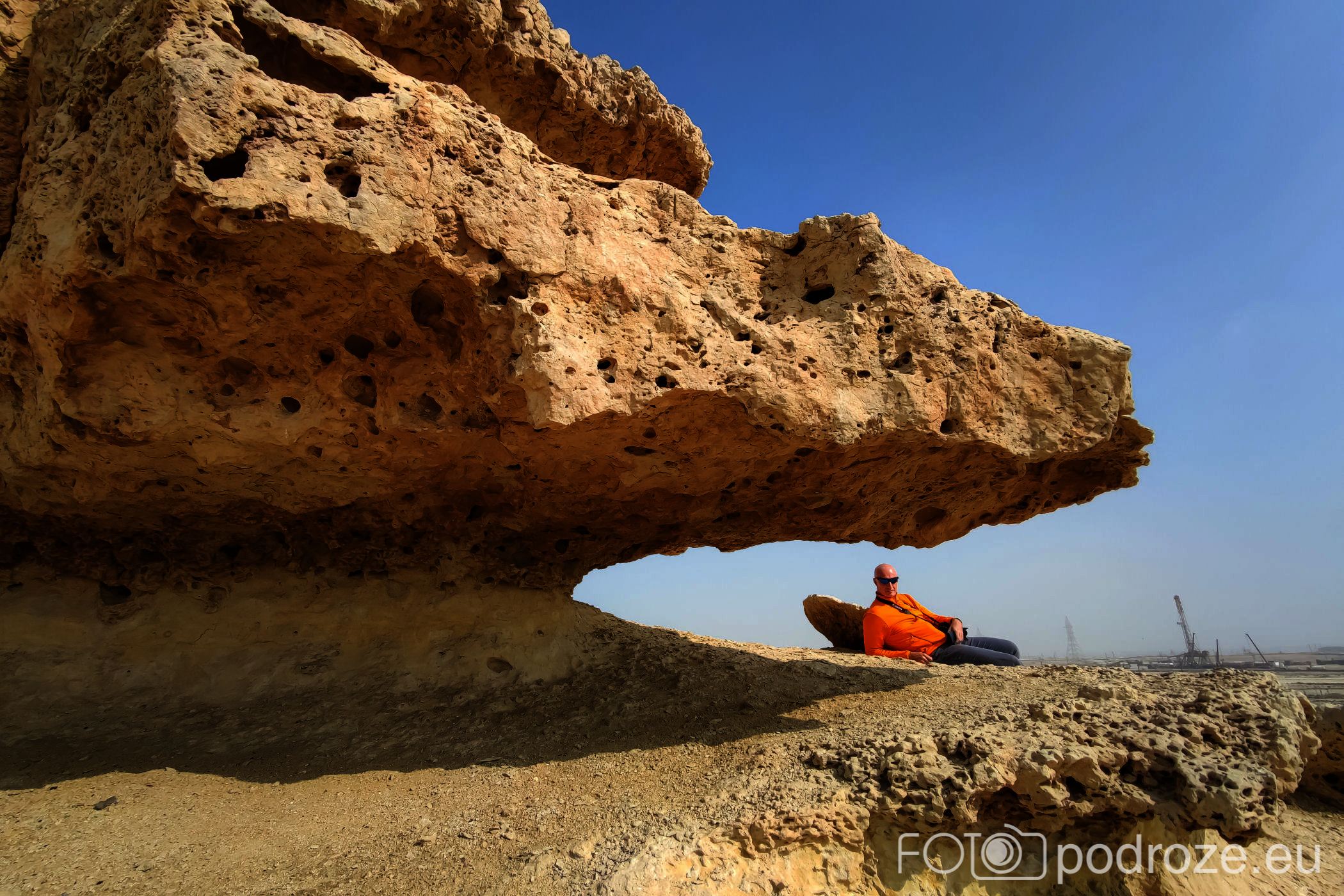 Teraz zabieram Was na tą część terytorium Bahrajnu, która w zasadzie stanowi większość, czy pustynię. Tutejsza pustynia nie jest malownicza i kolorowa jak te, które mieliśmy okazję oglądać w innych krajach Bliskiego Wschodu . Jest jednak kilka punktów i na niej, o których warto wspomnieć. Jednym z nich jest skała znajdująca się pośrodku pola naftowego nazwana z racji swojego kształtu Dragon Rocks, czyli Smoczą Skałą. Łatwa do podejścia, to zaledwie kilkaset metrów, od miejsca gdzie można „porzucić” samochód. Z bliska faktycznie ciekawa i malownicza, choć otoczenie pustyni pełnej szybów naftowych już mniej. Oprócz nas jest tu jedna rodzinka, która przyjechała na piknik.