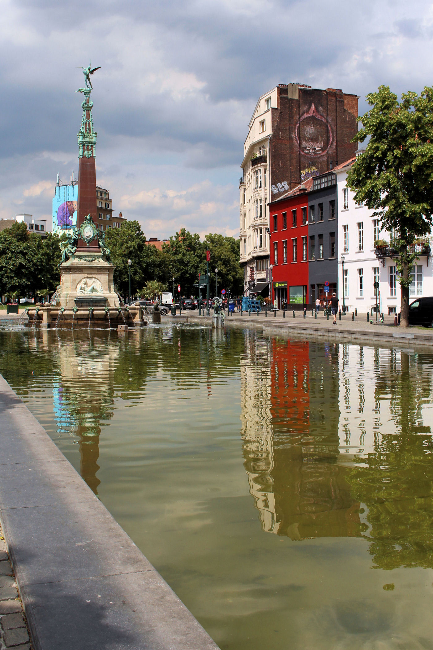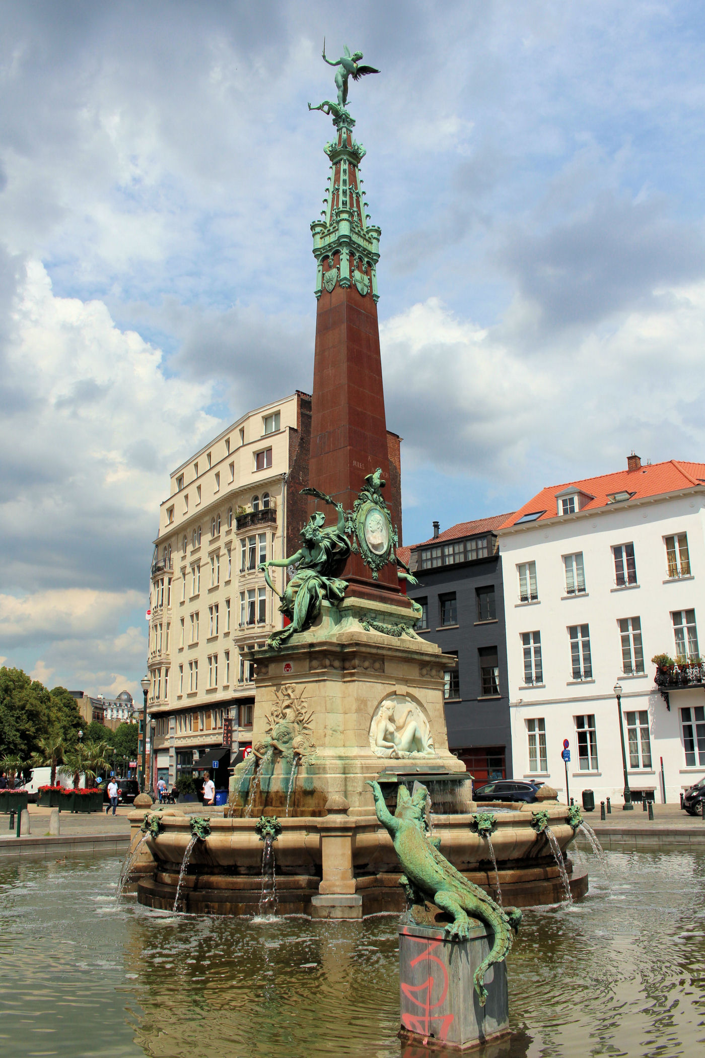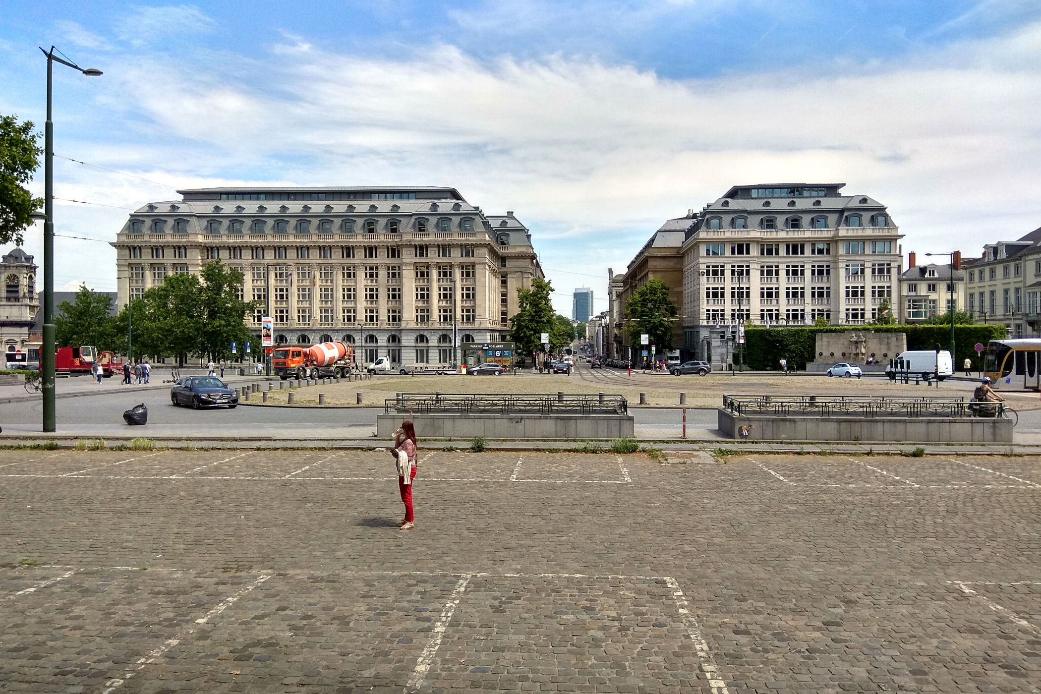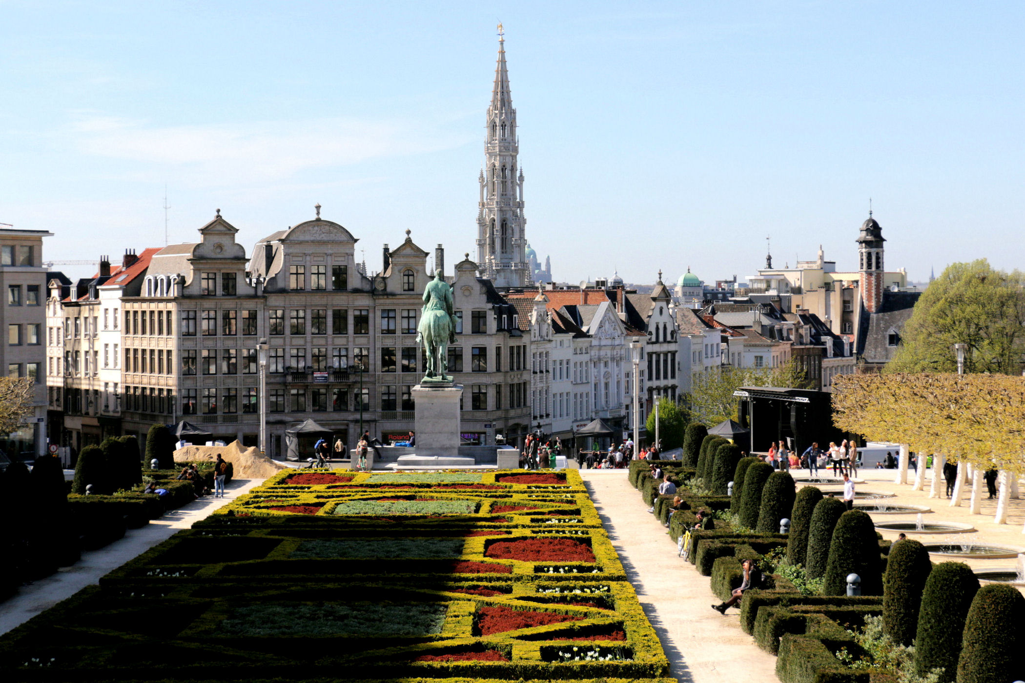 Z placu kierujemy się na zachód. Mijamy jeden z najpiękniejszych budynków Brukseli w którym mieści się Muzeum Instrumentów. Mijamy fontannę i stajemy w miejscu skąd widać piękne ogrody oraz panoramę starego miasta z górującą nad wszystkim charakterystyczną wieżą ratuszową. Przy Placu znajduje się Biblioteka Królewska Belgii a po drugiej stronie Centrum Konferencyjne. Plac kończy się schodami z pomnikiem Alberta I. Miejsce było by piękne, gdyby nie fakt, że zbiera się tu mnóstwo młodzieży różnej narodowości, a wszystko jest niestety „osprejowane” – te przykre widoki będą nam towarzyszyć w całym centrum Brukseli.