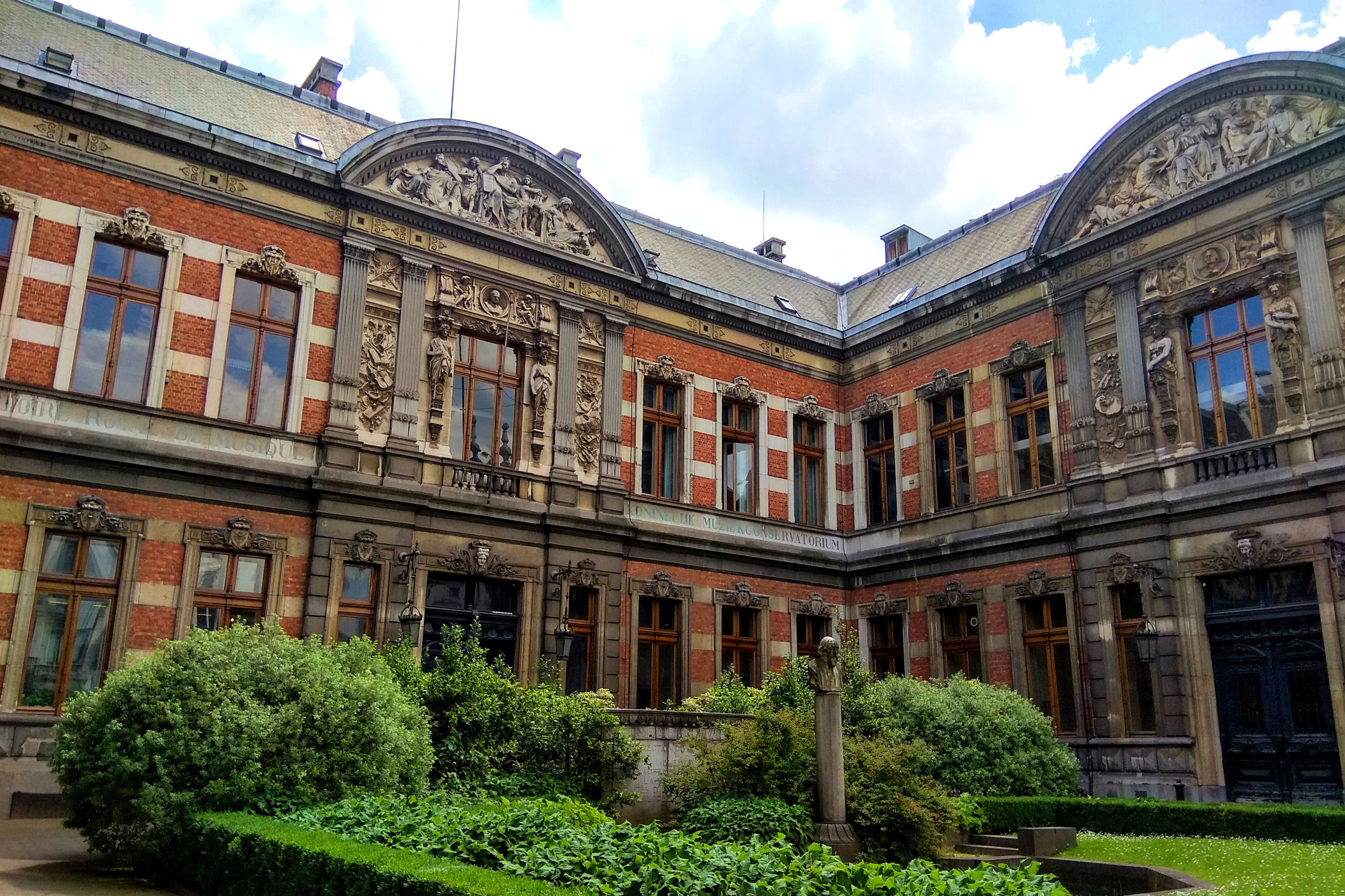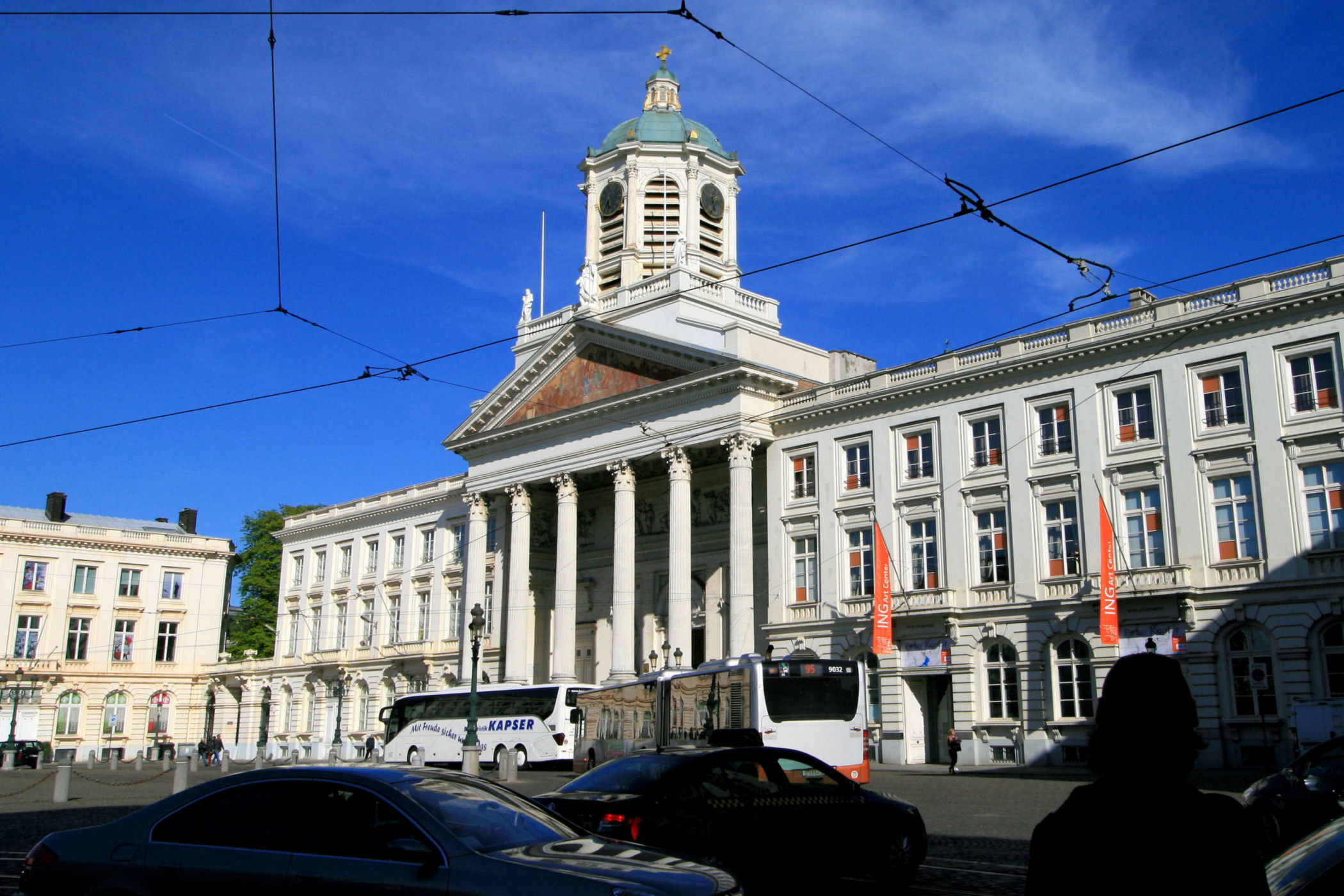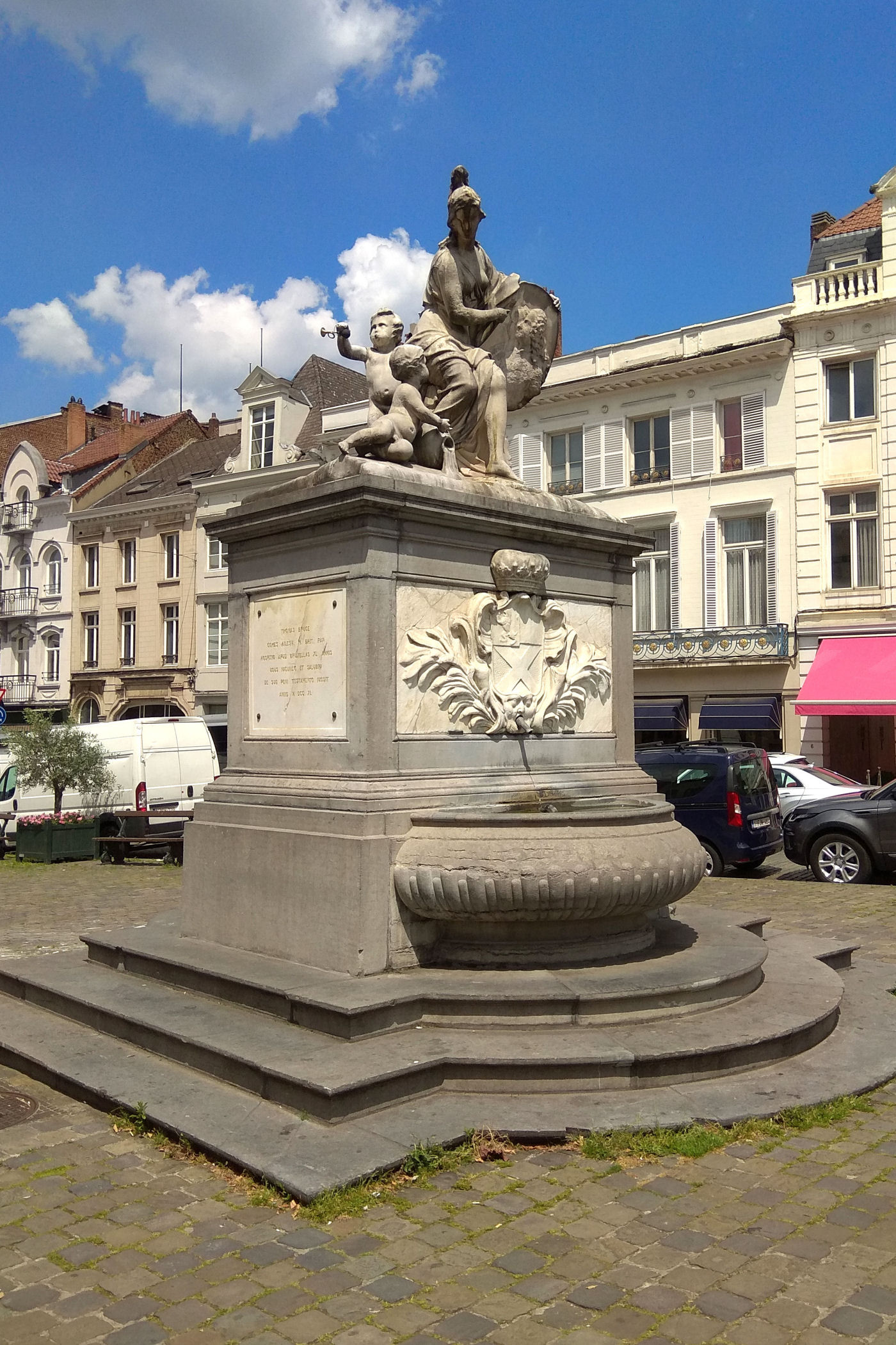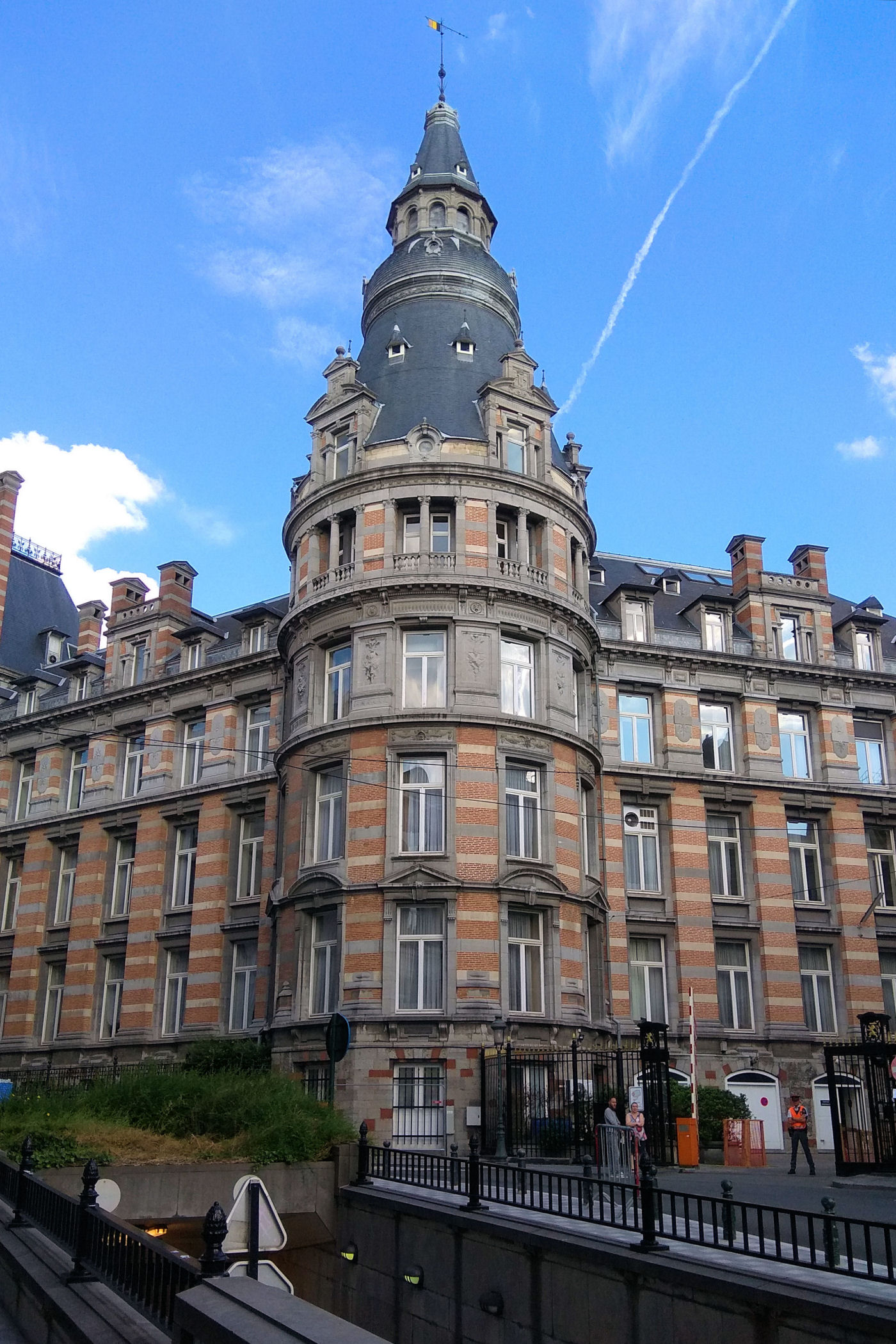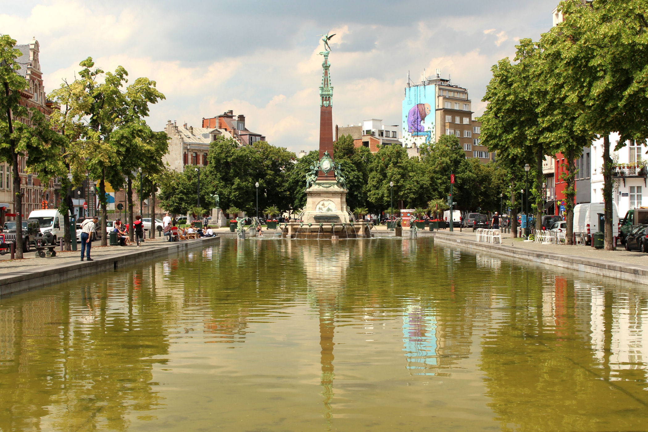 Z placu kierujemy się na zachód. Mijamy jeden z najpiękniejszych budynków Brukseli w którym mieści się Muzeum Instrumentów. Mijamy fontannę i stajemy w miejscu skąd widać piękne ogrody oraz panoramę starego miasta z górującą nad wszystkim charakterystyczną wieżą ratuszową. Przy Placu znajduje się Biblioteka Królewska Belgii a po drugiej stronie Centrum Konferencyjne. Plac kończy się schodami z pomnikiem Alberta I. Miejsce było by piękne, gdyby nie fakt, że zbiera się tu mnóstwo młodzieży różnej narodowości, a wszystko jest niestety „osprejowane” – te przykre widoki będą nam towarzyszyć w całym centrum Brukseli.