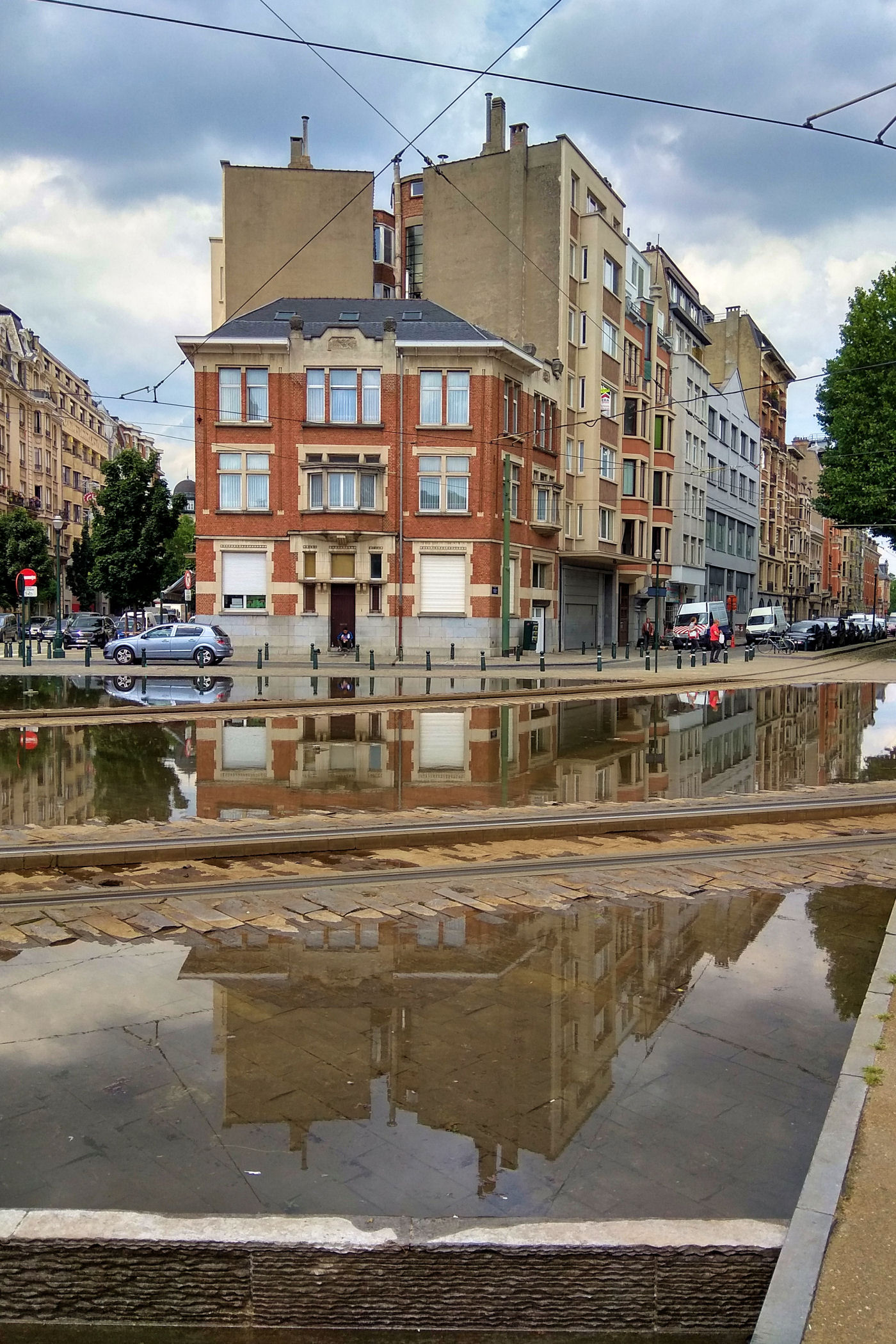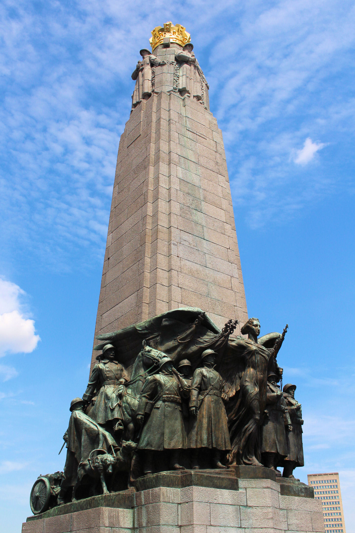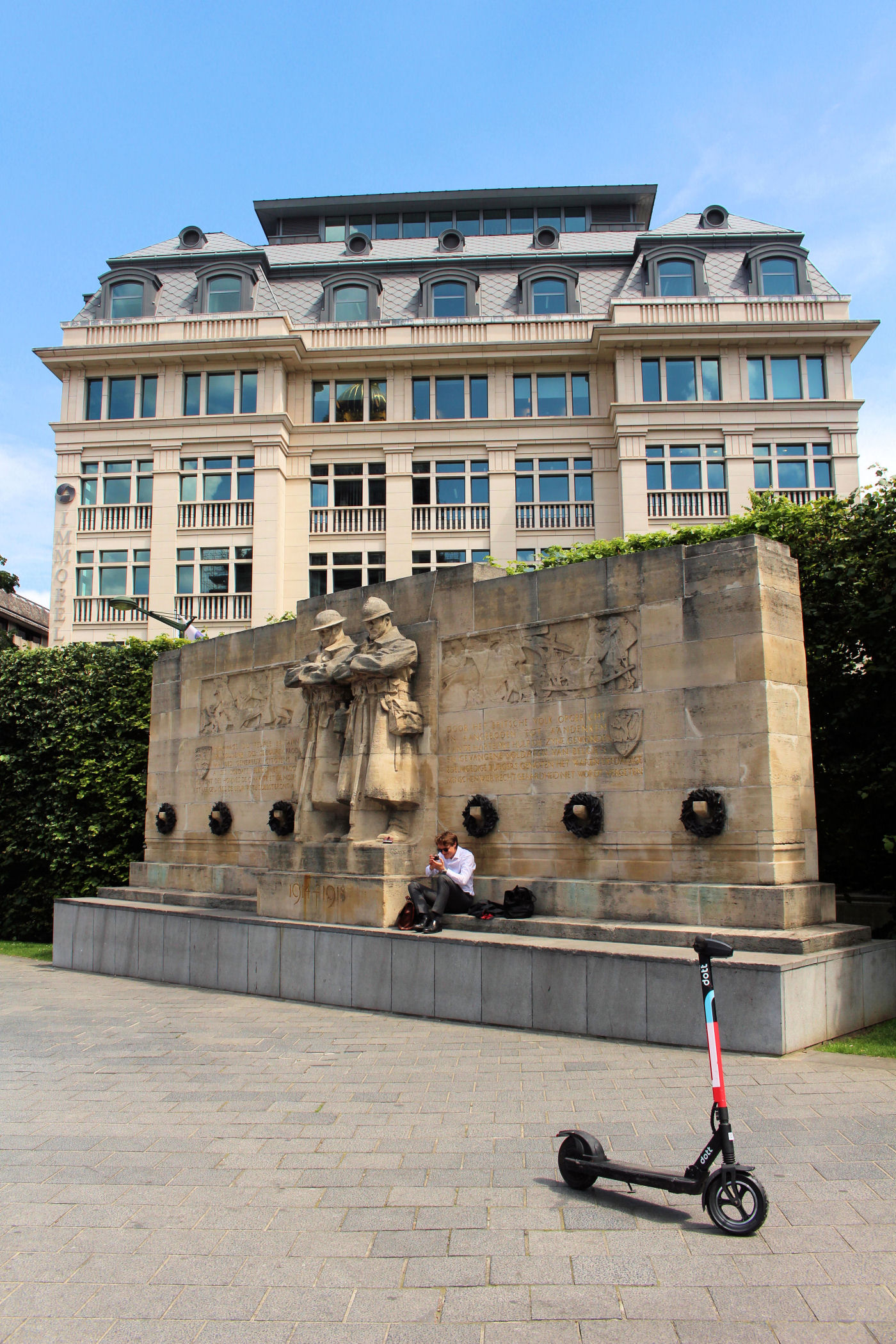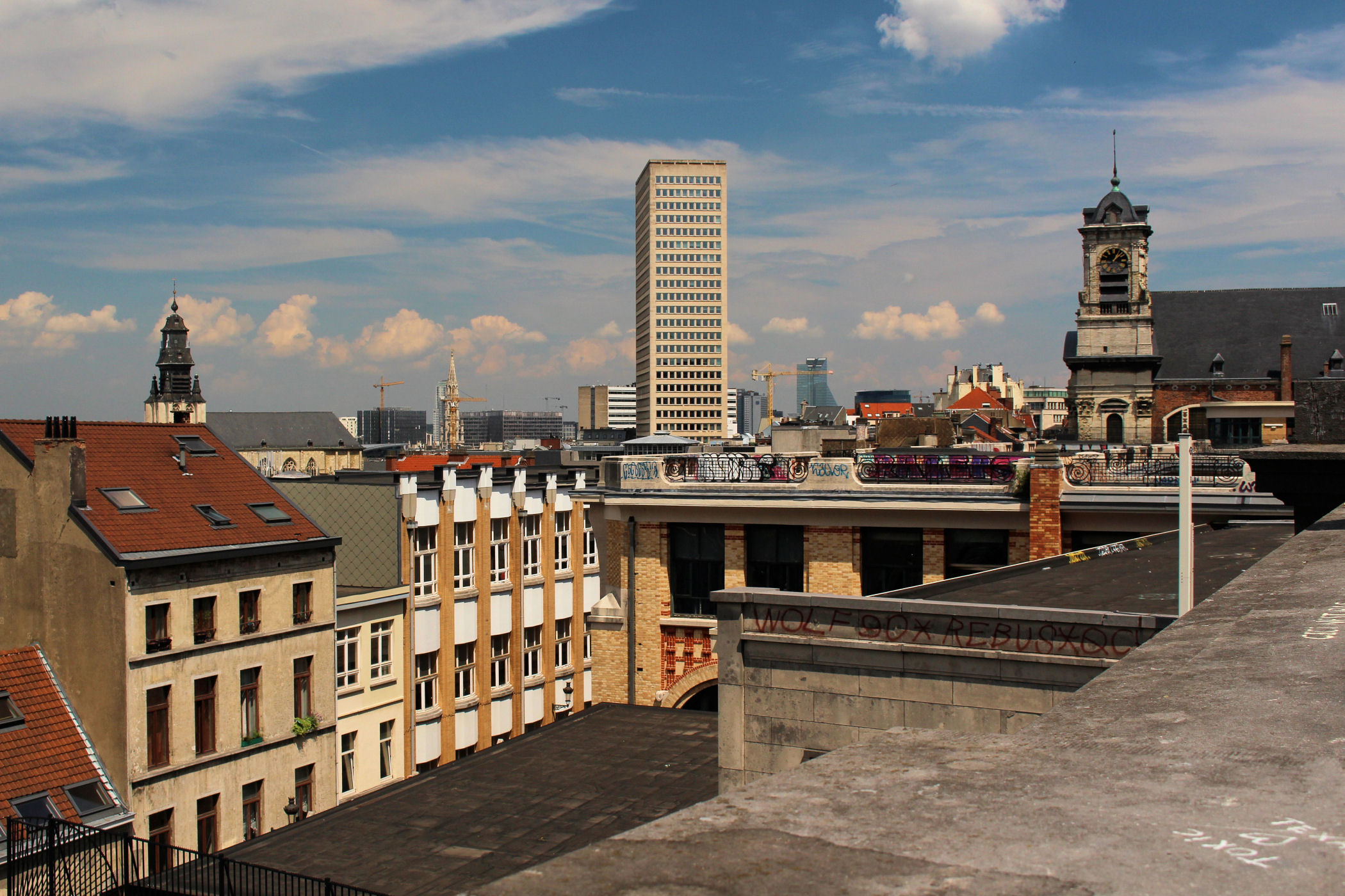 Z placu kierujemy się na zachód. Mijamy jeden z najpiękniejszych budynków Brukseli w którym mieści się Muzeum Instrumentów. Mijamy fontannę i stajemy w miejscu skąd widać piękne ogrody oraz panoramę starego miasta z górującą nad wszystkim charakterystyczną wieżą ratuszową. Przy Placu znajduje się Biblioteka Królewska Belgii a po drugiej stronie Centrum Konferencyjne. Plac kończy się schodami z pomnikiem Alberta I. Miejsce było by piękne, gdyby nie fakt, że zbiera się tu mnóstwo młodzieży różnej narodowości, a wszystko jest niestety „osprejowane” – te przykre widoki będą nam towarzyszyć w całym centrum Brukseli.