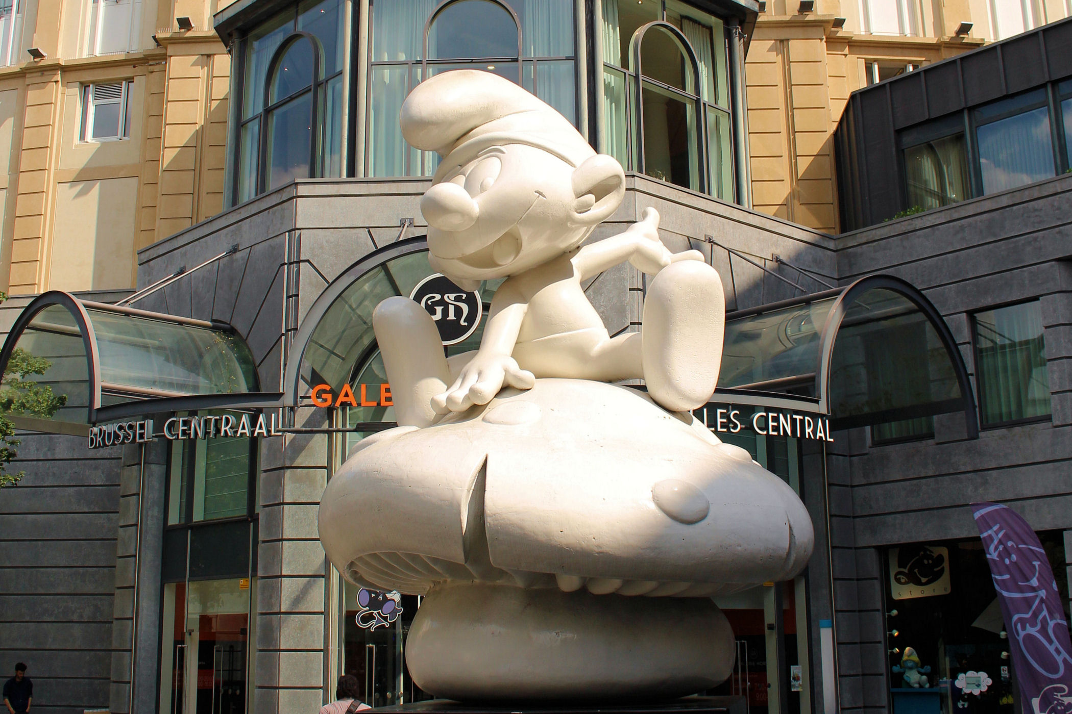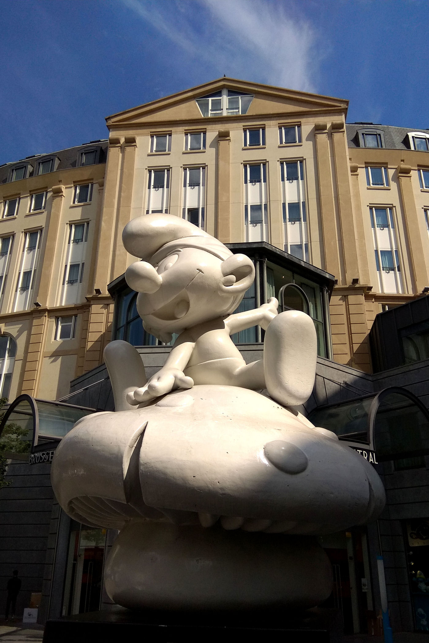 MOOF MUSEUM znajduje się w jednym z budynków Dworca Centralnego. Wejścia jednak jest od strony zachodniej . Trudno jednak tu nie trafić, bo nad drzwiami króluje wielka figura Smerfa. Oto dworzec i najbliższa okolica oraz wejście do muzeum :