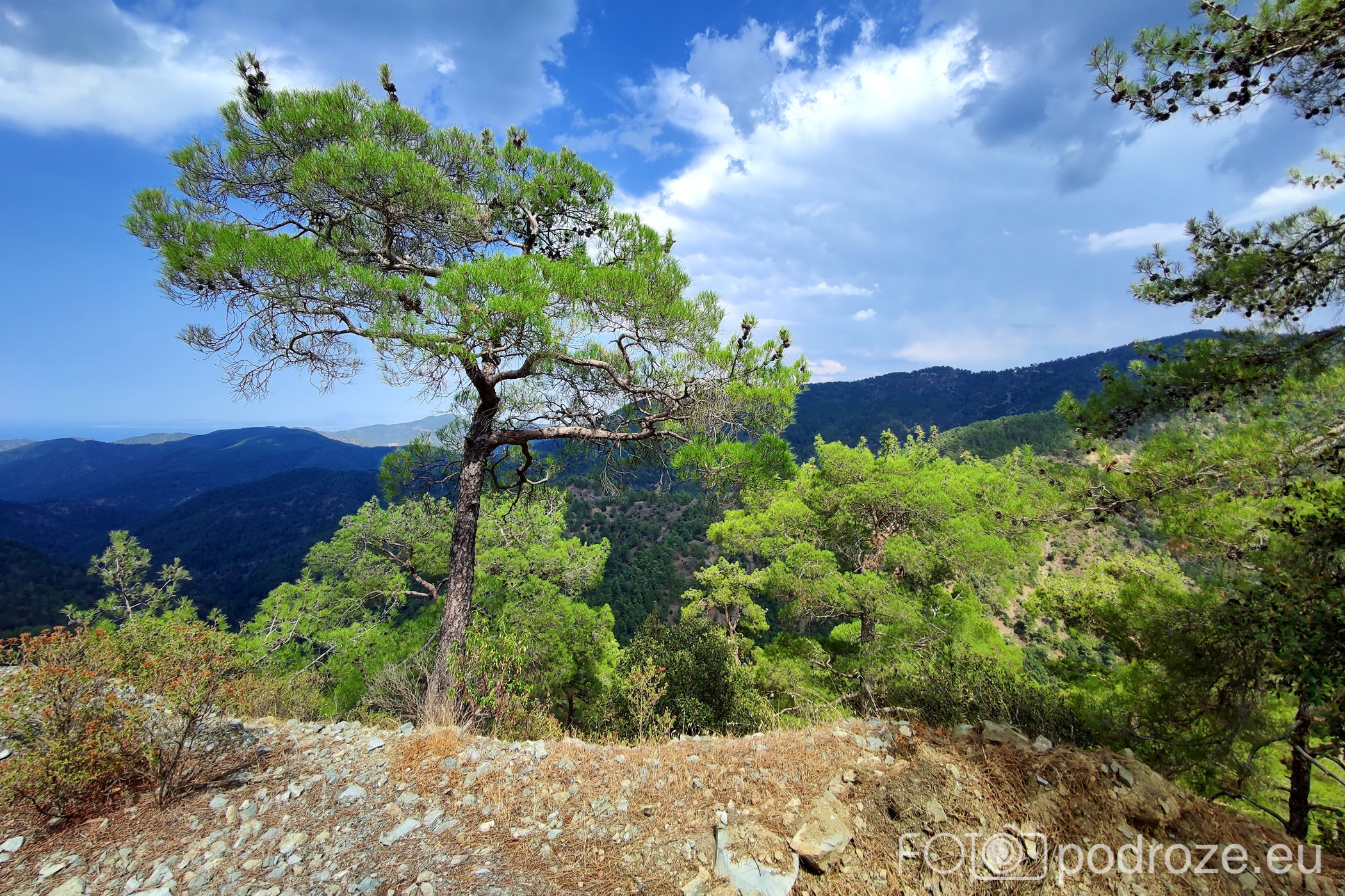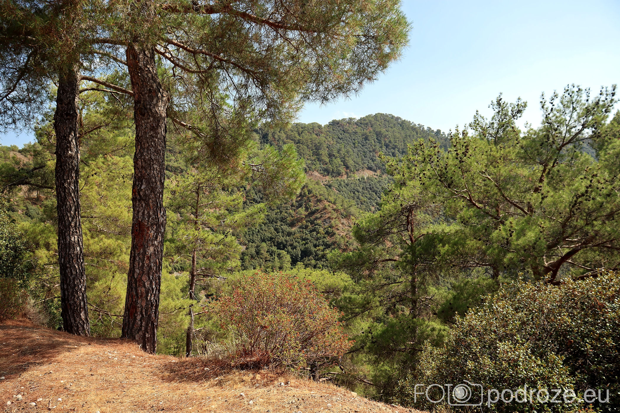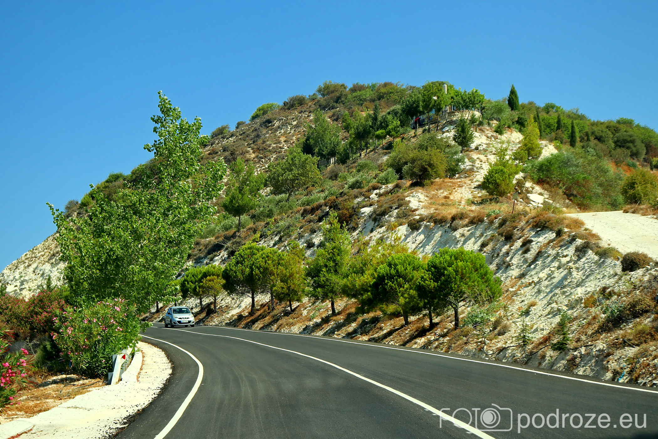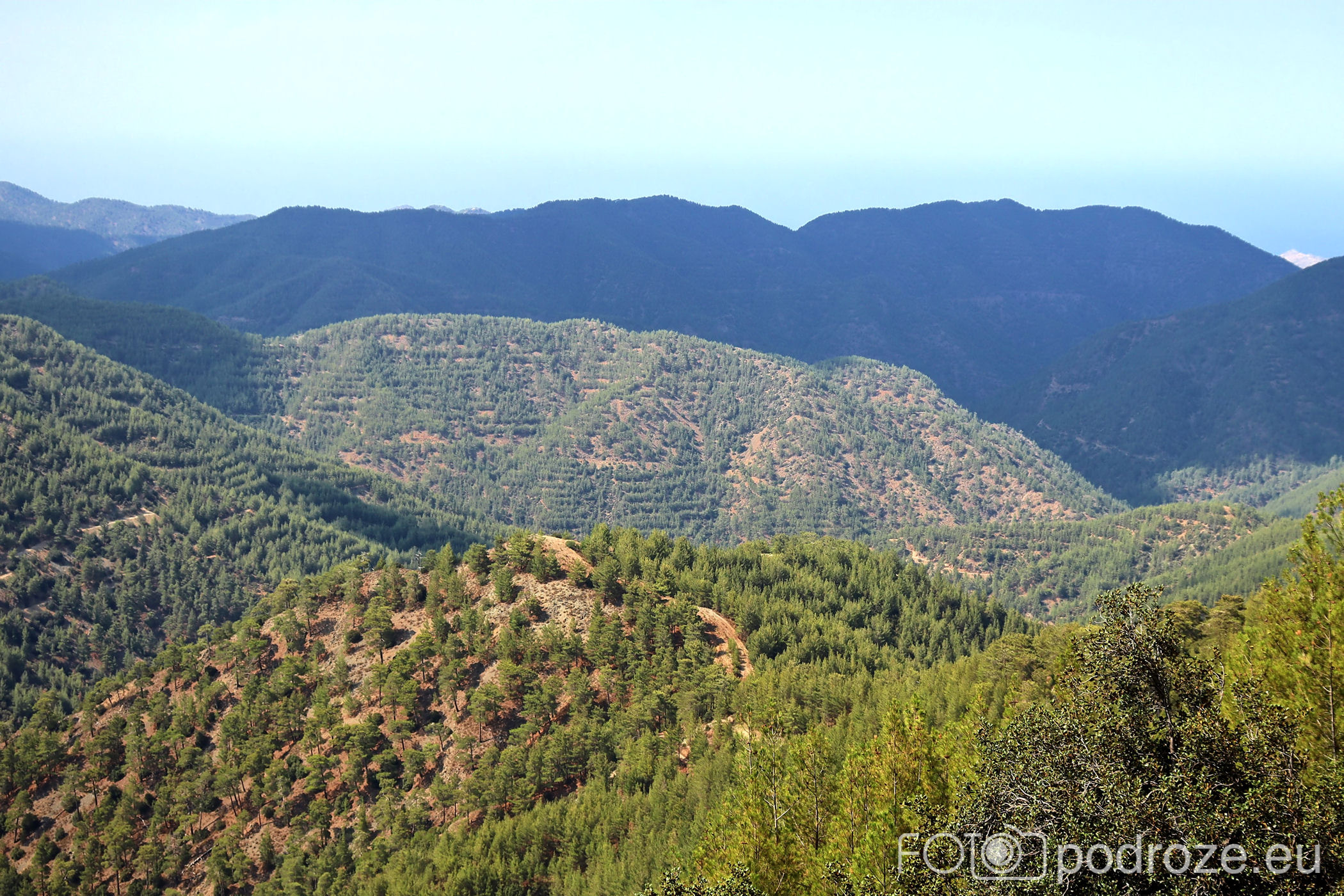Naszą trasę przez centralną część wyspy zaczynamy od nadmorskiego miasta Pomos. Od tego miejsca niezwykle kręta droga prowadzi nas coraz wyżej w góry. Chwilę później wjeżdżamy w przepiękny rejon górski, ale ze względu na ochronę militarną jest tu zakaz fotografowania. Cóż, mimo pięknych zdjęć nie mogę się nimi z Wami podzielić. Dalej mamy już tylko las, który stanowi dla nas ogromne zaskoczenie. Nigdzie indziej wcześniej nie widzieliśmy tak wielkich połaci lasu pozbawionych jakiejkolwiek cywilizacji. Jedziemy, jedziemy i poza wąską drogą asfaltową nie ma absolutnie nic poza lasem i górami na horyzoncie. Żadnego słupa elektrycznego, żadnej budki pasterskiej, żadnego domu. Kiedy chwilę przed naszym przejazdem pada w tym rejonie deszcz do fascynujących efektów wizualnych dochodzą jeszcze zapachowe. Las zaczyna pachnieć jak najpiękniejsze perfumy świata, otwieramy okna i czujemy się za moment jak odurzeni. Przejazd tą niezwykle dziką i cudowną drogą zajmuje nam ponad 1,5 godziny .