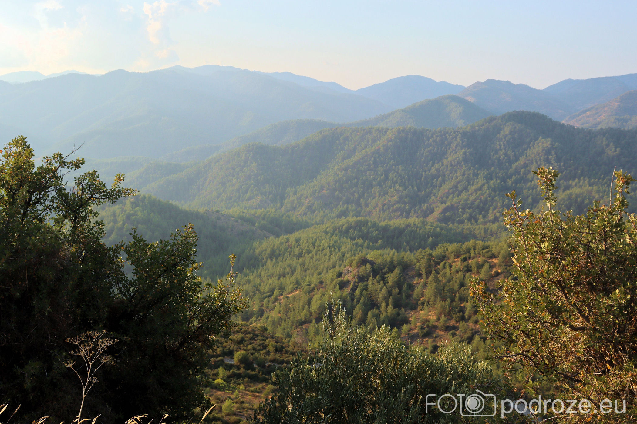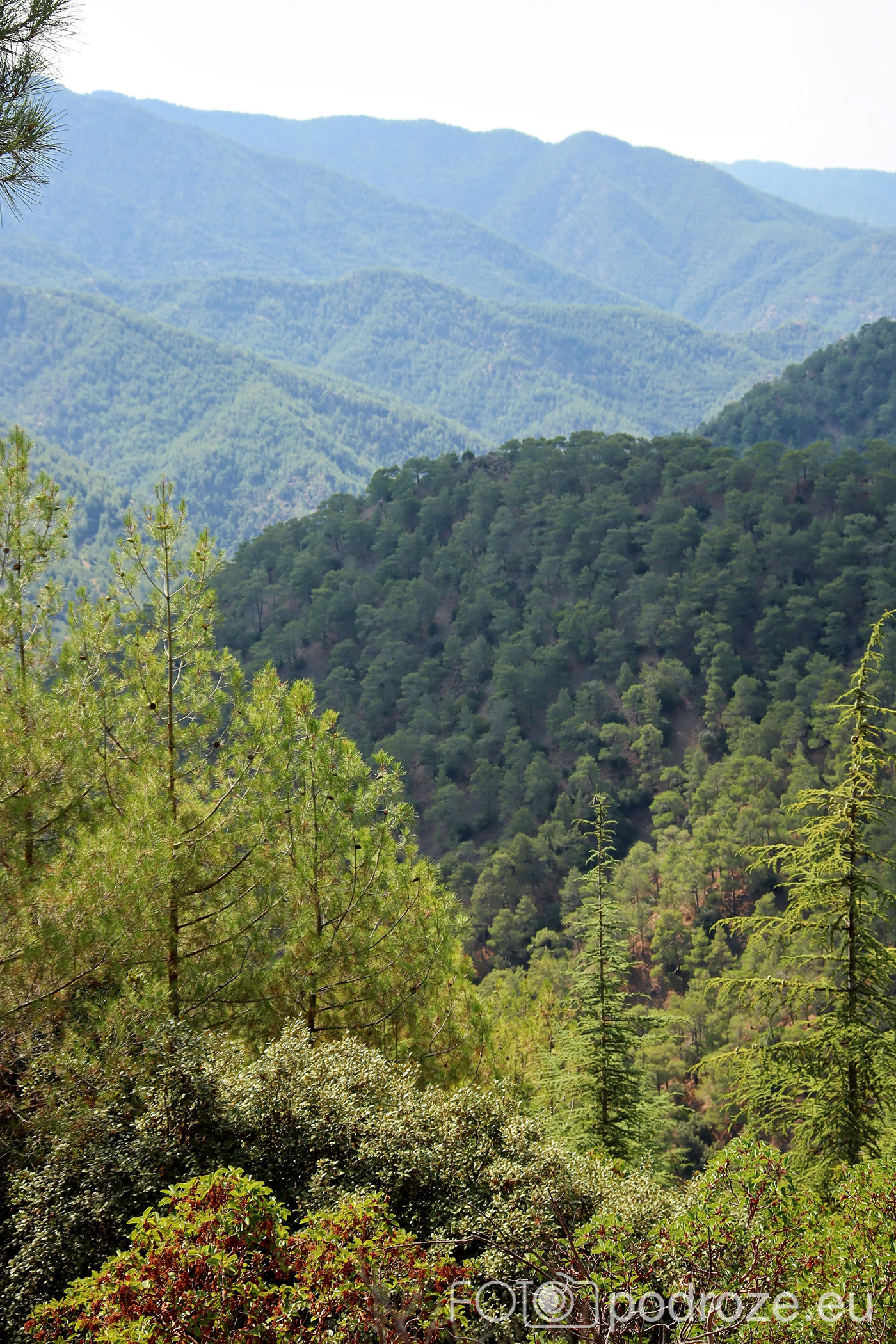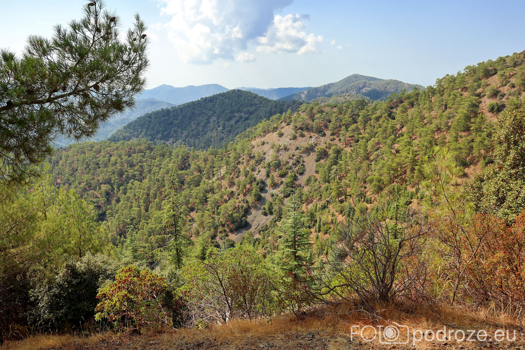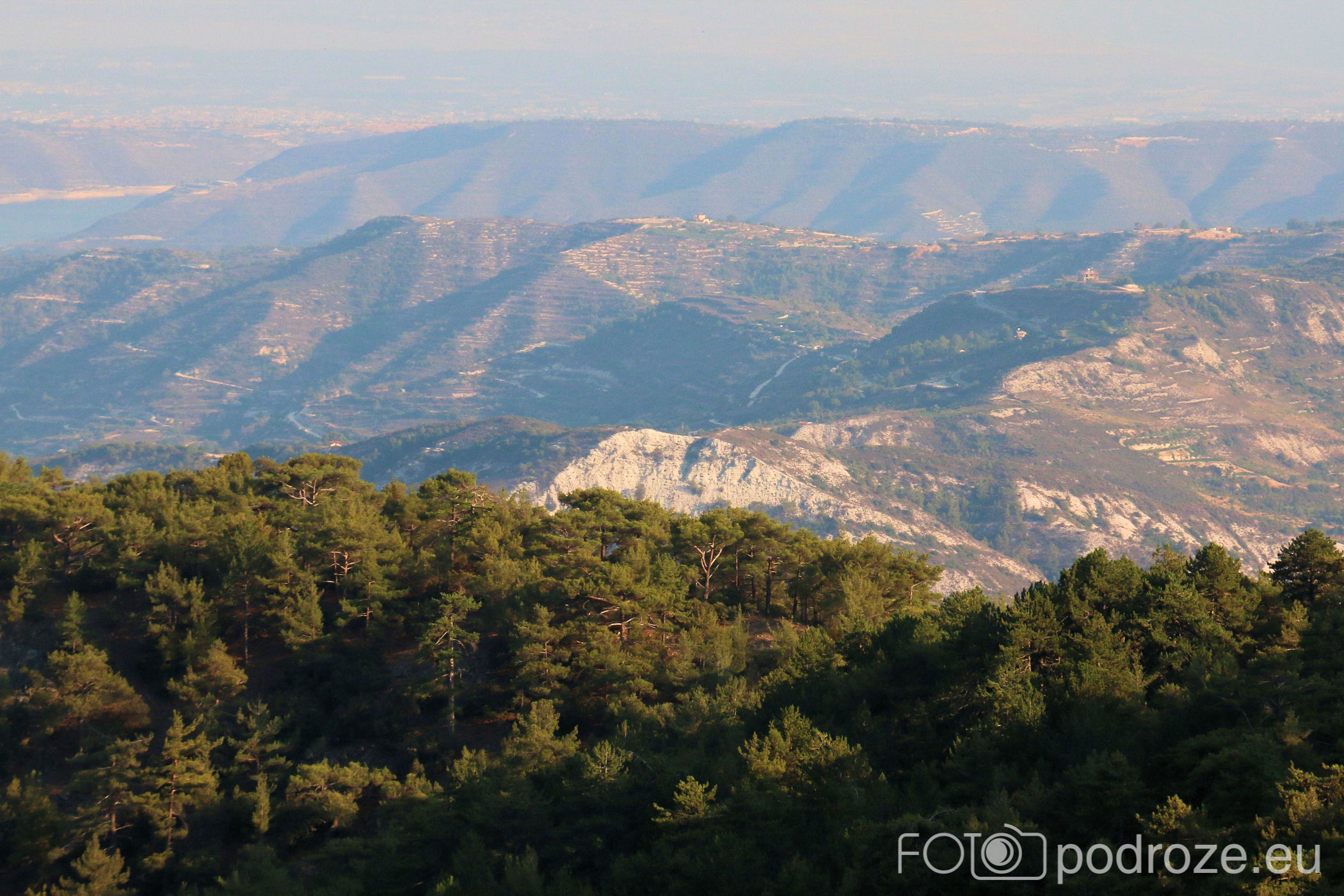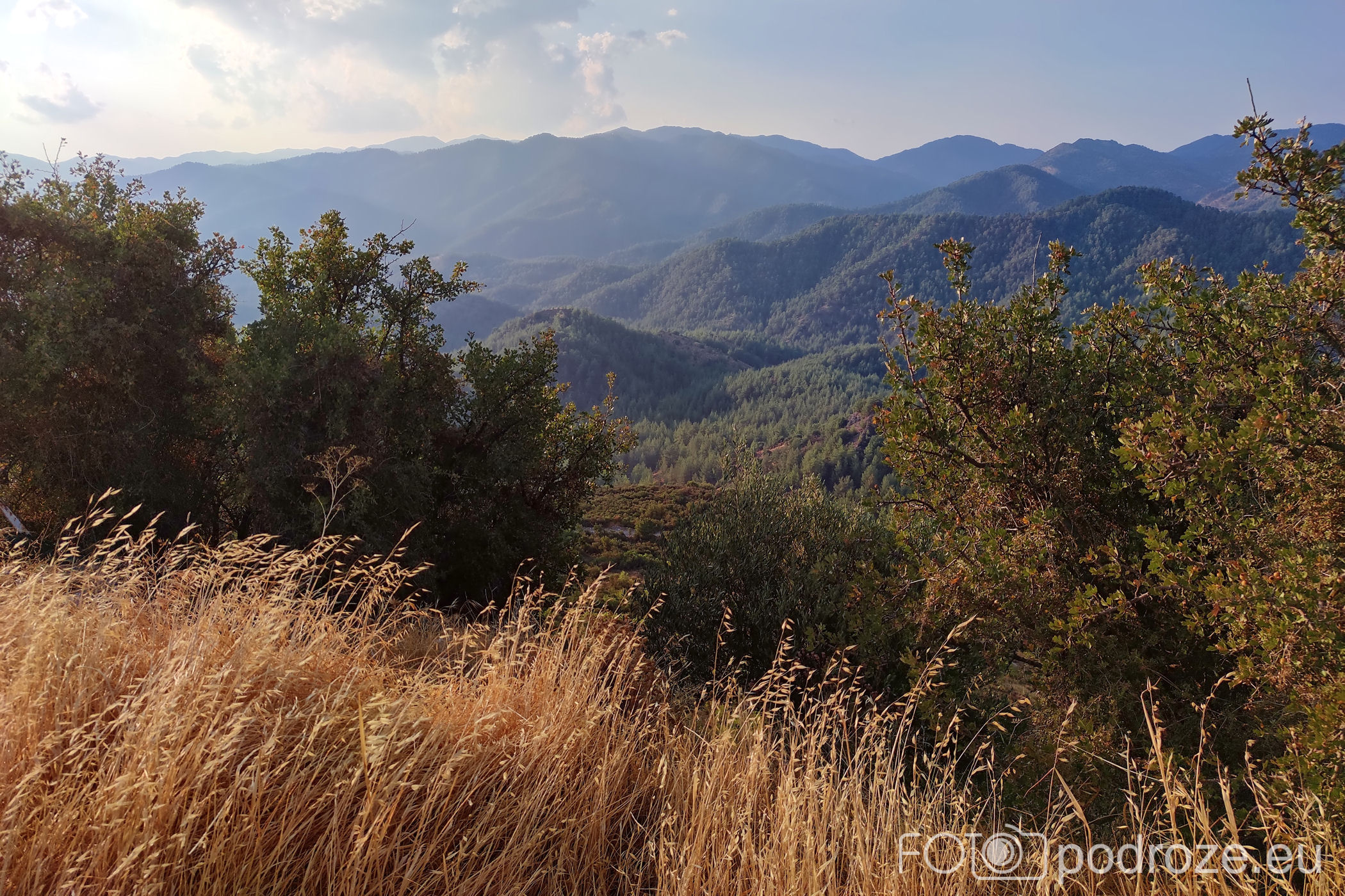 Tak jak sam najwyższy szczyt rozczarowuje to na pewno nie można tego powiedzieć o pozostałych szczytach i pasmach górskich. Z przyjemnością zatrzymujemy się co jakiś czas, aby móc spojrzeć w dal na spokojnie. Po drodze jest piękny punkt widokowy oznaczony nazwą : Gerokamina view point. Jedziemy przez góry już późnym popołudniem. W rejonie miasta Troodos znajduje się początek kilku bardzo ciekawych szlaków, ale niestety nie mamy już czasu, aby na nie wyruszyć. W planach jest co prawda dojście (mimo późnej pory) do jednego z wodospadów: Caledoni lub Miillomeris, ale ruch w tym rejonie jest ogromny, a brak miejsc do zaparkowania samochodu skutecznie weryfikuje nasze plany. Trudno, nie da się niestety być wszędzie. Opuszczamy Góry Troodos zostawiając za sobą całą masę pięknych miejsc: miasteczek, klasztorów i szlaków, których tym razem nie było nam dane zobaczyć.