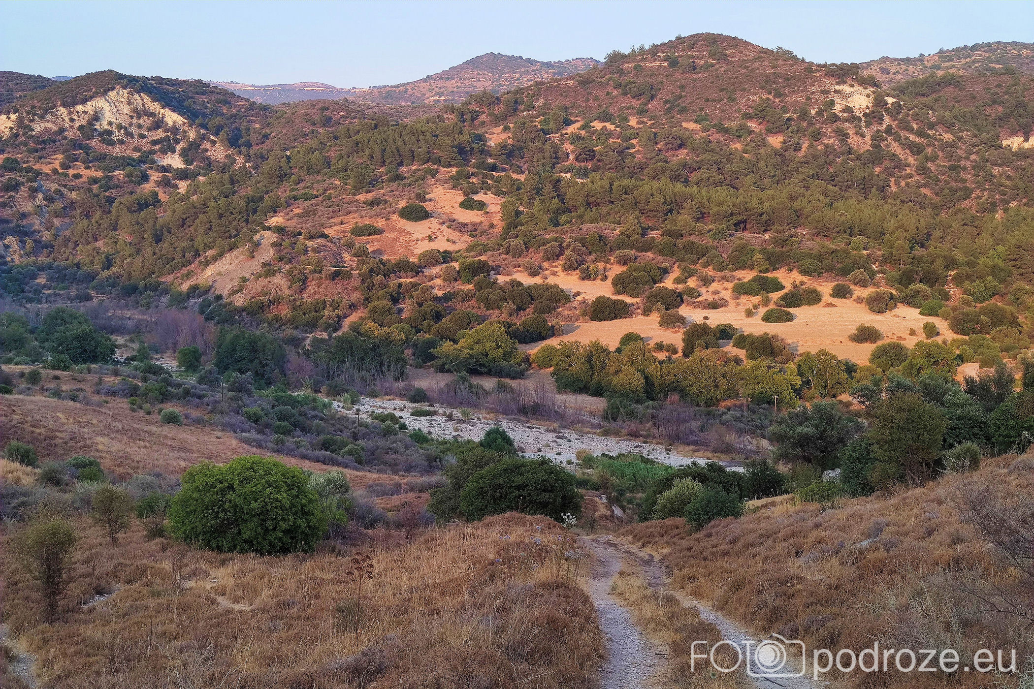 Ostatnie ciekawe miejsce jakie chciałam wam pokazać w tej części Cypru to ciekawe formacje skalne. Na mapie googla znajdziecie to miejsce pod nazwą Stone Maze Park. Dołem doliny płynie potok, a droga przecina formacje skalne (tego akurat nie ujęłam na zdjęciach, bo były już w cieniu). Zatrzymujemy się za to kawałek dalej aby spojrzeć na dolinę jeszcze w ostatnich promieniach słońca.