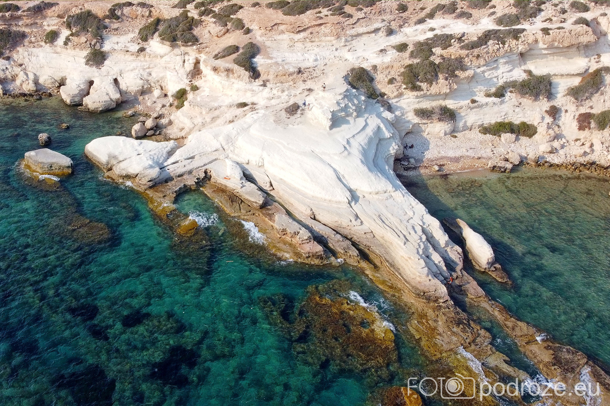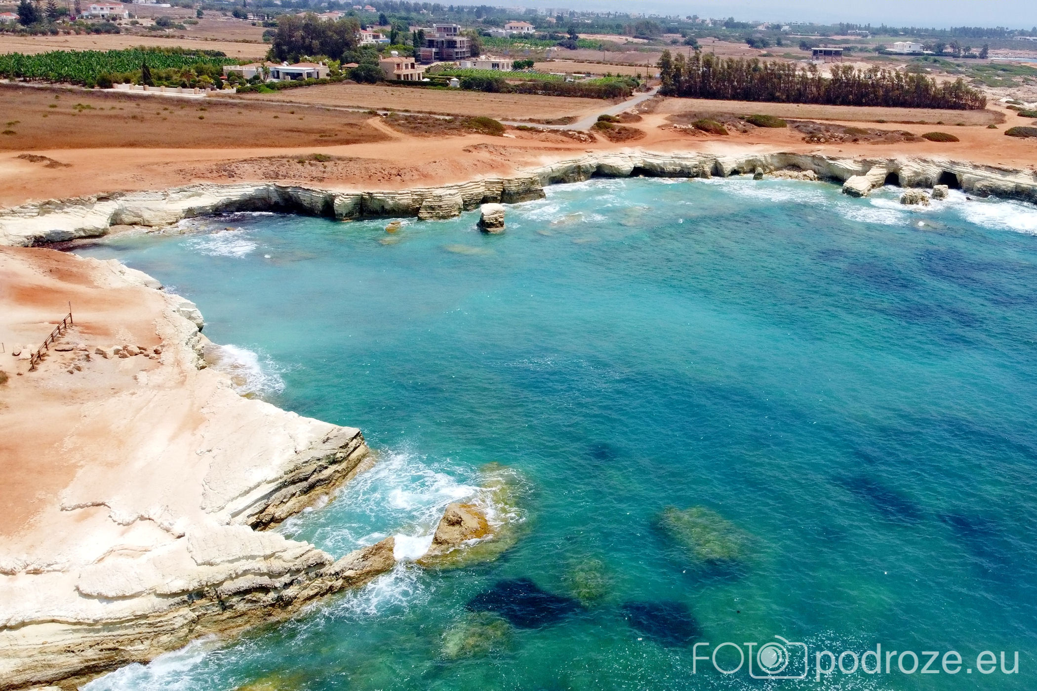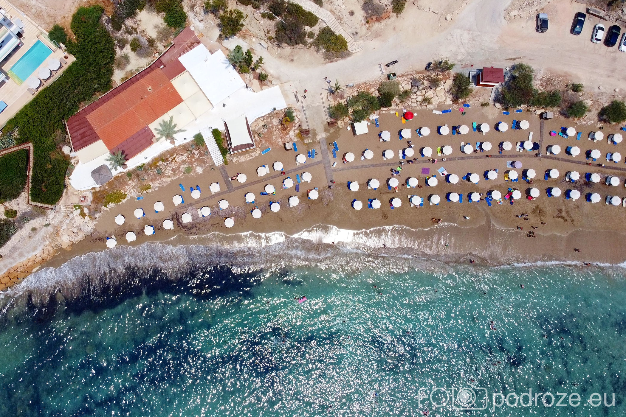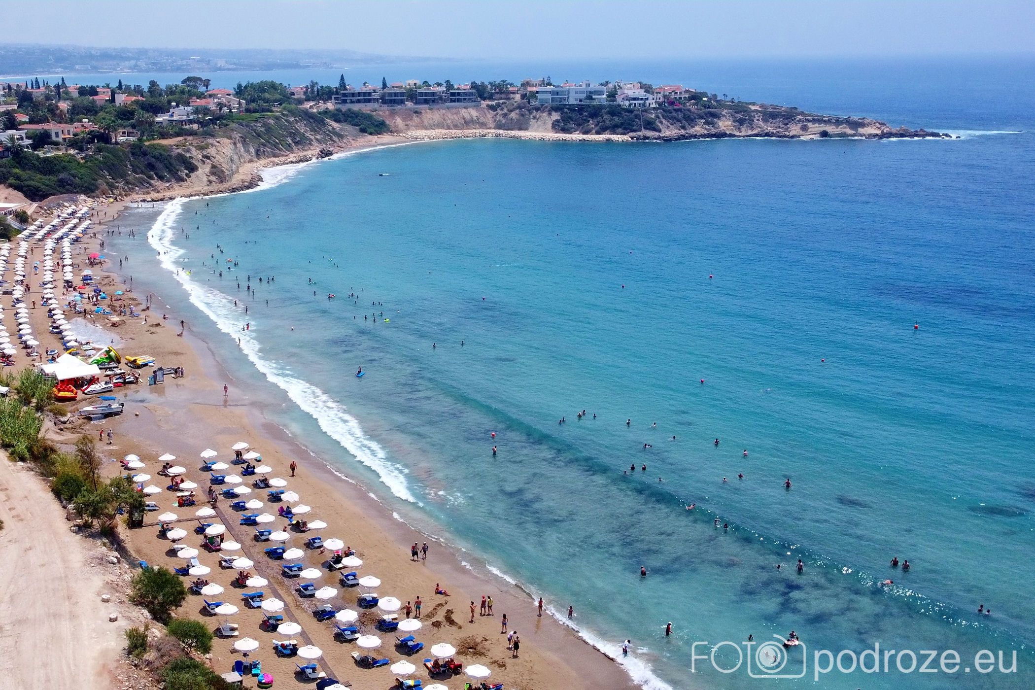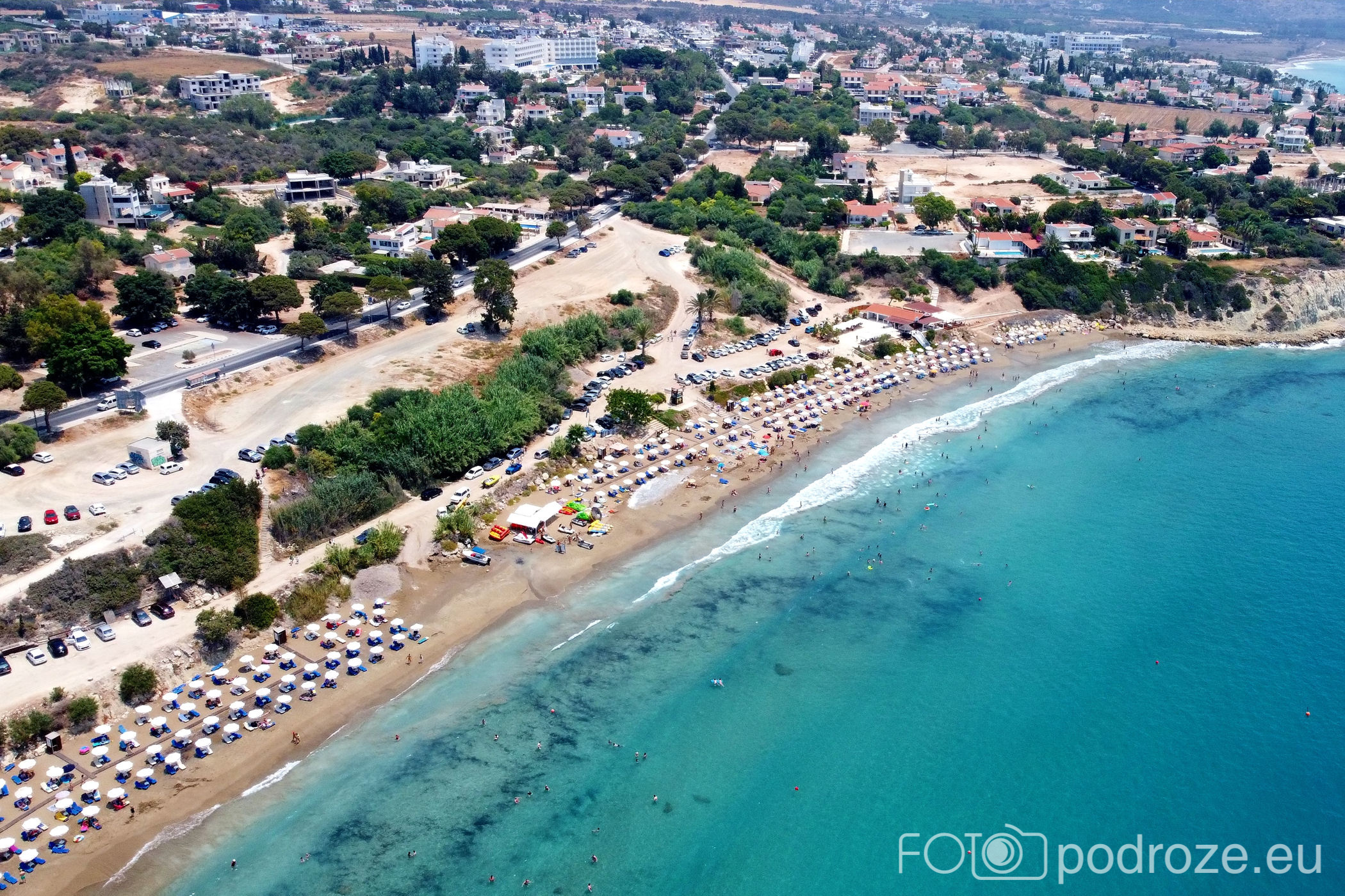 Coral Bay, czyli zatoka Koralowa to jedno z tych miejsc o których poczytacie w każdym przewodniku. To jedna z tych plaż, która przyciąga masę plażowiczów. Jasny piasek i turkusowa woda – dla wielu to wszystko, czego im potrzeba. My nie jesteśmy miłośnikami komercyjnych plaż pełnych leżaków i parasoli, choć jak widać z ujęć drona – i takie miejsce może być piękne. Warto wiedzieć, że na północnym cyplu okalającym zatokę znajduje się Muzeum Archeologiczne – Mycenaean settlement of Cyprus Museum. Widać je wyraźnie z góry, jest ukryte w skale, a na zewnątrz widoczne jako okrąg.