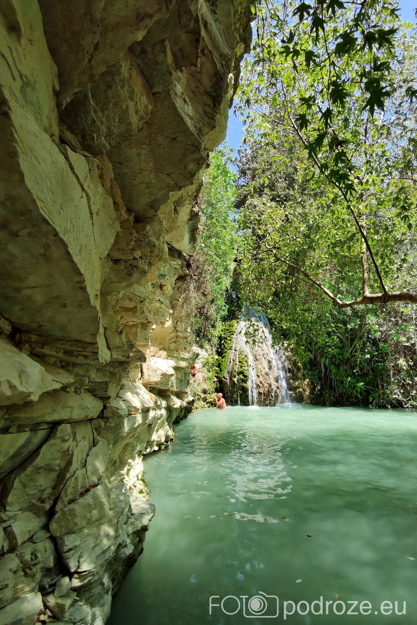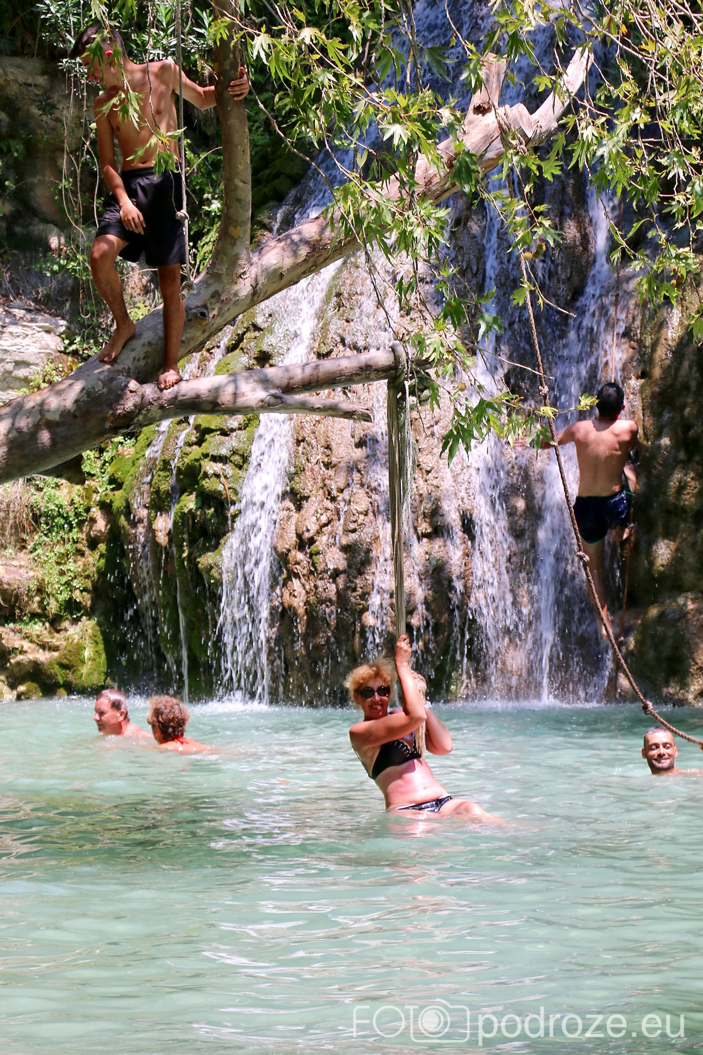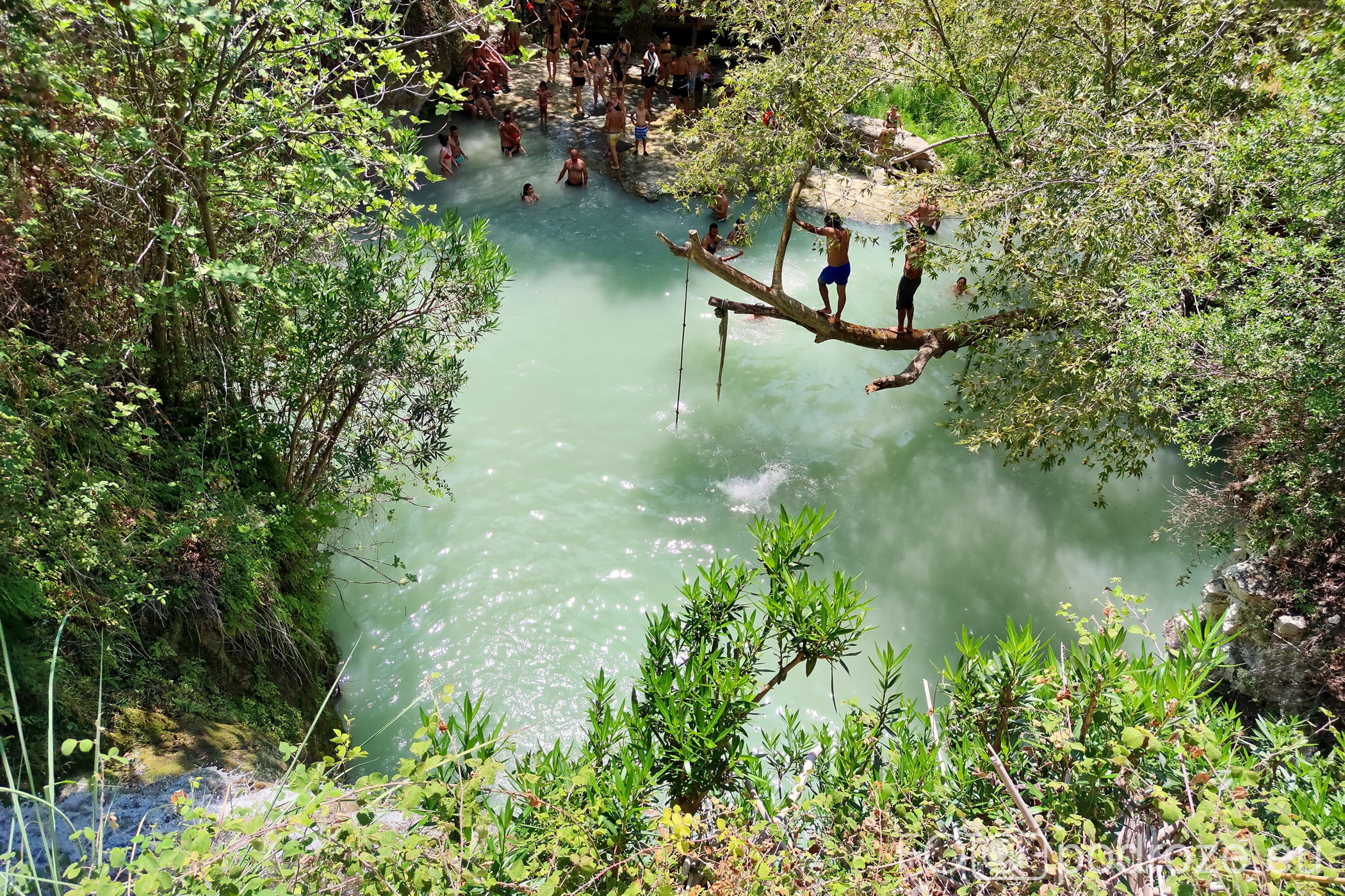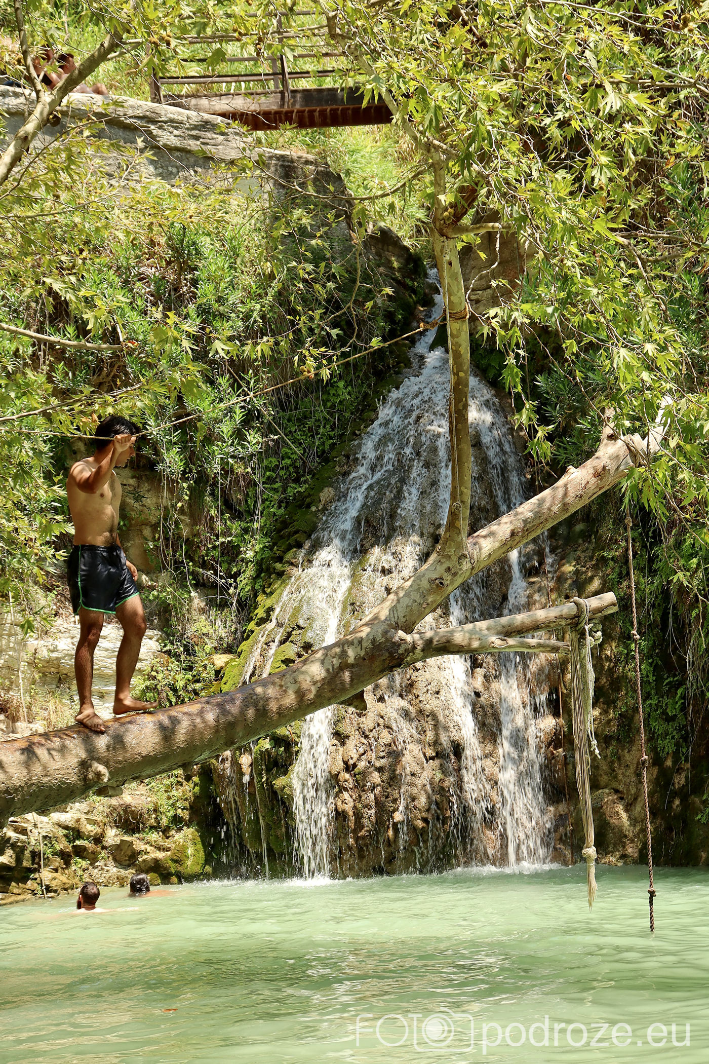 W końcu docieramy do celu naszej wizyty tutaj . Kamienne schody w dół prowadzą nas do naturalnego zbiornika wodnego z niewielkim, ale uroczym wodospadem. Małe jeziorko otoczone jest z trzech stron skałami, a pośrodku znajduje się pochylone drzewo. To ulubione miejsce do wspinania się i skakania do wody. Można też skorzystać z powieszonych wokół lin, a widzieliśmy też śmiałków skaczących z górnego poziomu. Woda jest tu dość głęboka i bardzo, bardzo zimna (mimo piekielnego upału), ale przez to stanowi cudowne orzeźwienie. Przy dolnym zbiorniku znajduje się też mały bar i taras ze stolikami, ale szansa na znalezienie tu miejsca do siedzenia jest znikoma.