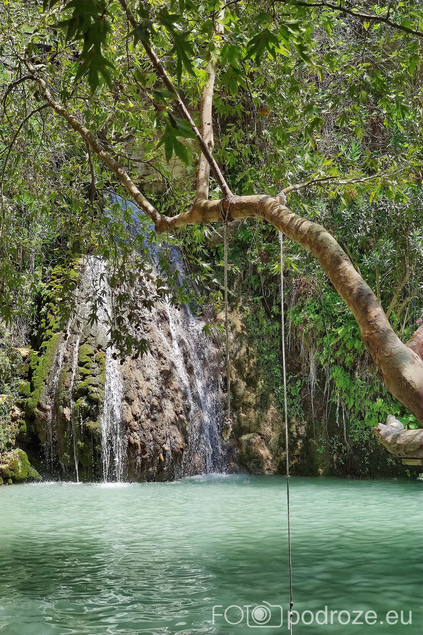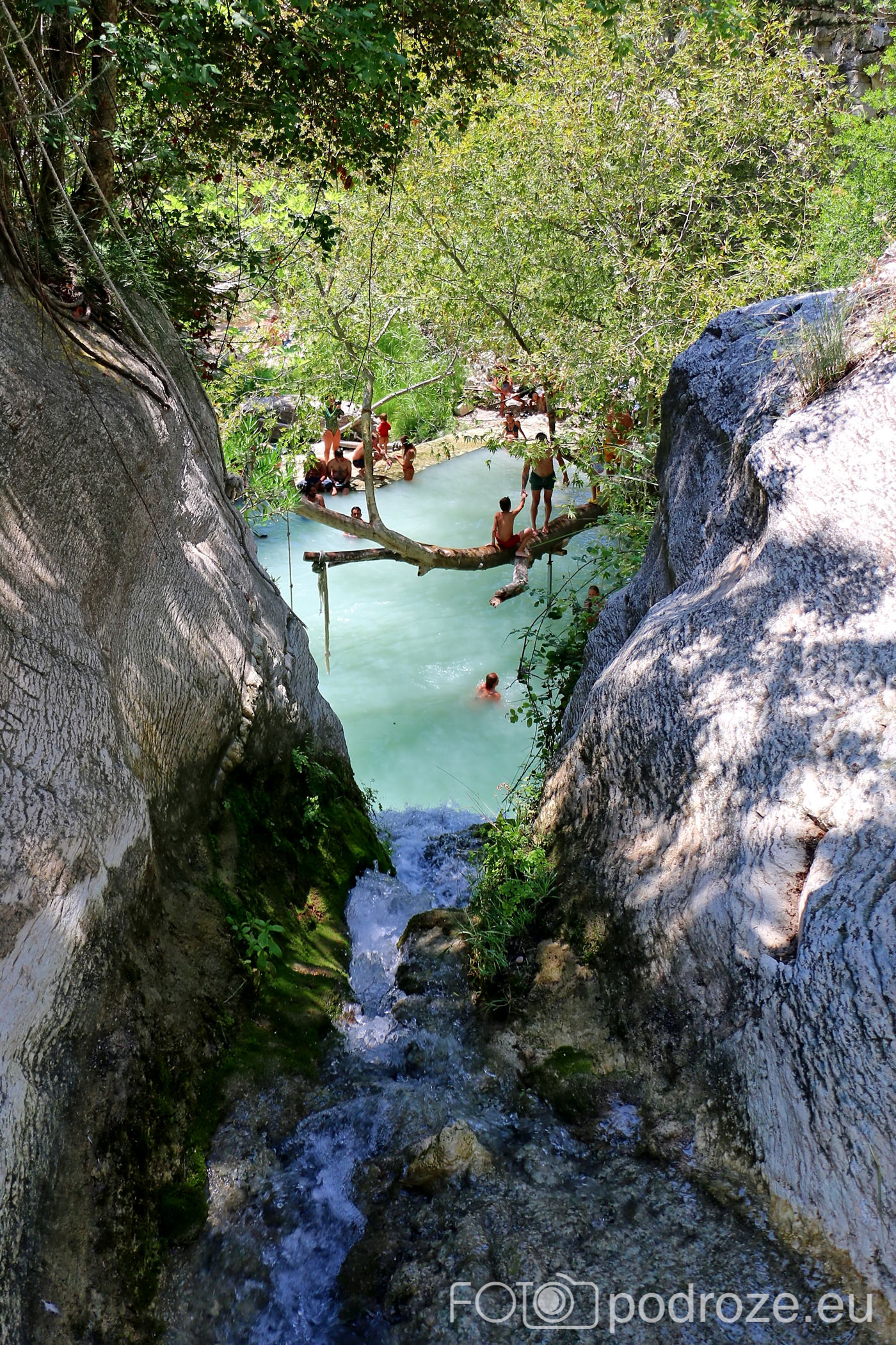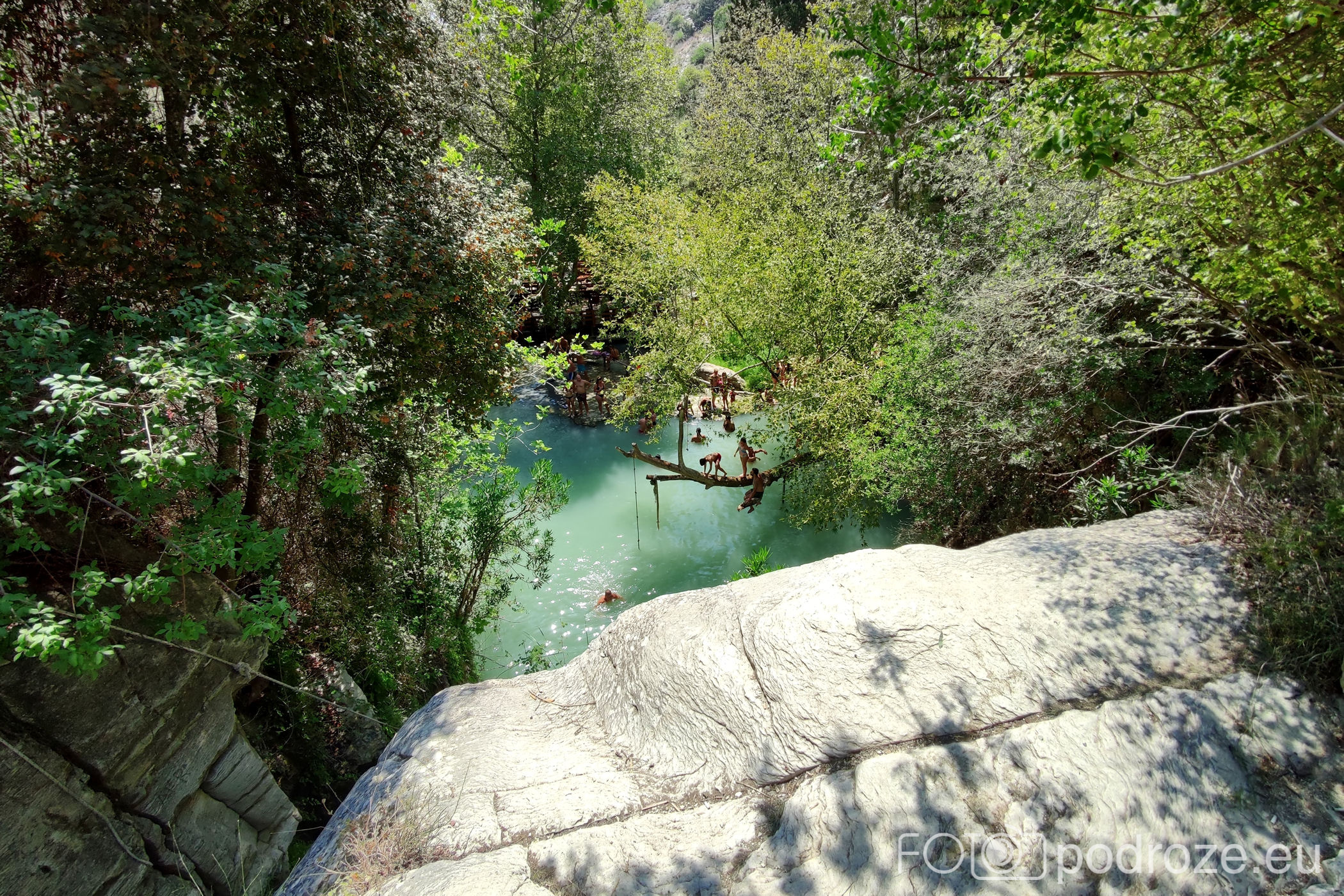 W końcu docieramy do celu naszej wizyty tutaj . Kamienne schody w dół prowadzą nas do naturalnego zbiornika wodnego z niewielkim, ale uroczym wodospadem. Małe jeziorko otoczone jest z trzech stron skałami, a pośrodku znajduje się pochylone drzewo. To ulubione miejsce do wspinania się i skakania do wody. Można też skorzystać z powieszonych wokół lin, a widzieliśmy też śmiałków skaczących z górnego poziomu. Woda jest tu dość głęboka i bardzo, bardzo zimna (mimo piekielnego upału), ale przez to stanowi cudowne orzeźwienie. Przy dolnym zbiorniku znajduje się też mały bar i taras ze stolikami, ale szansa na znalezienie tu miejsca do siedzenia jest znikoma.