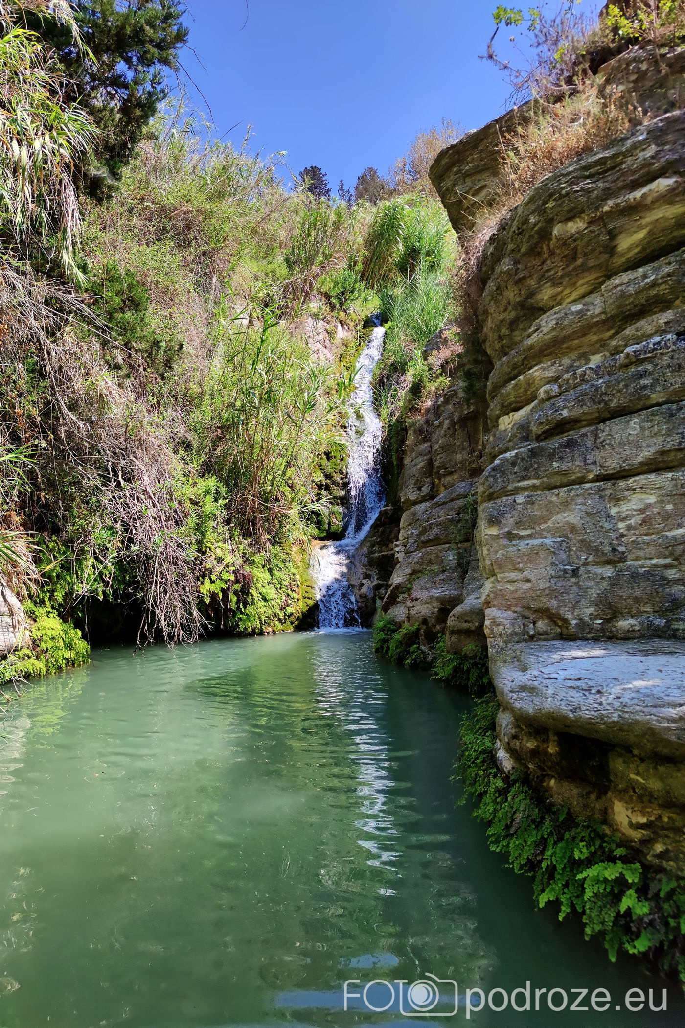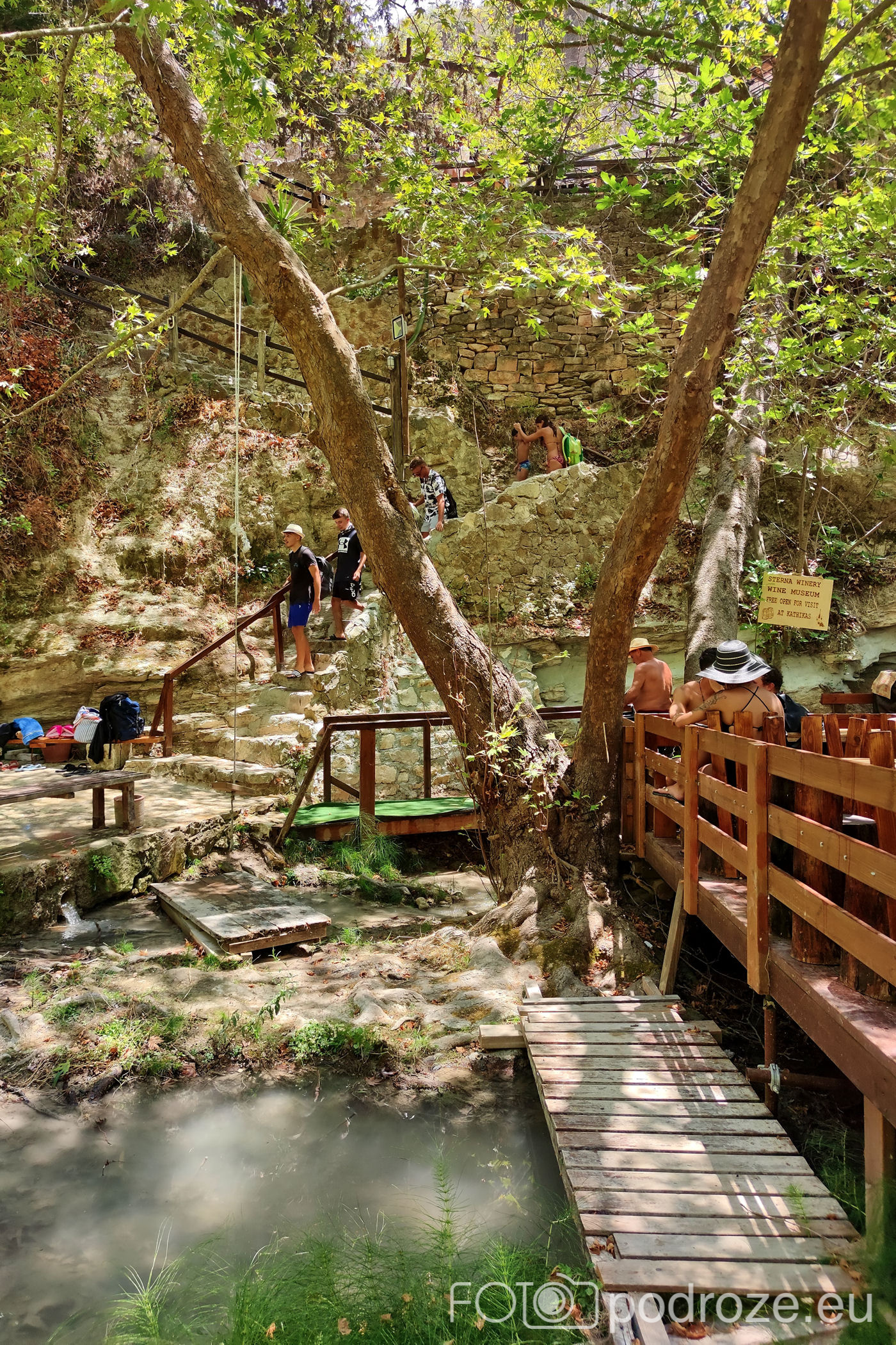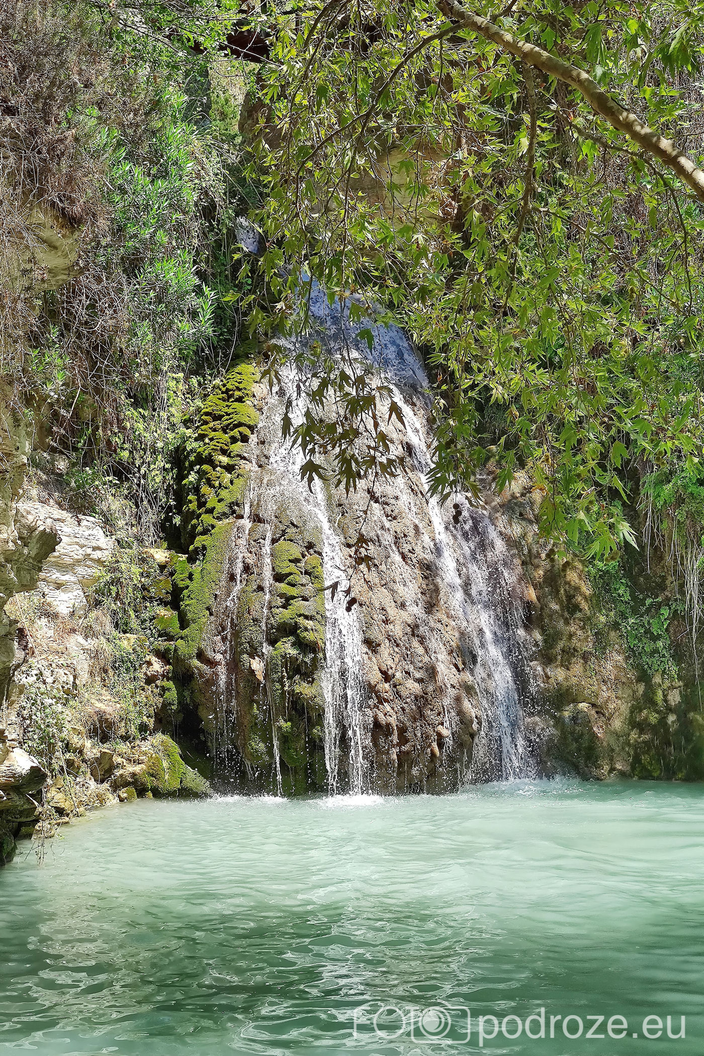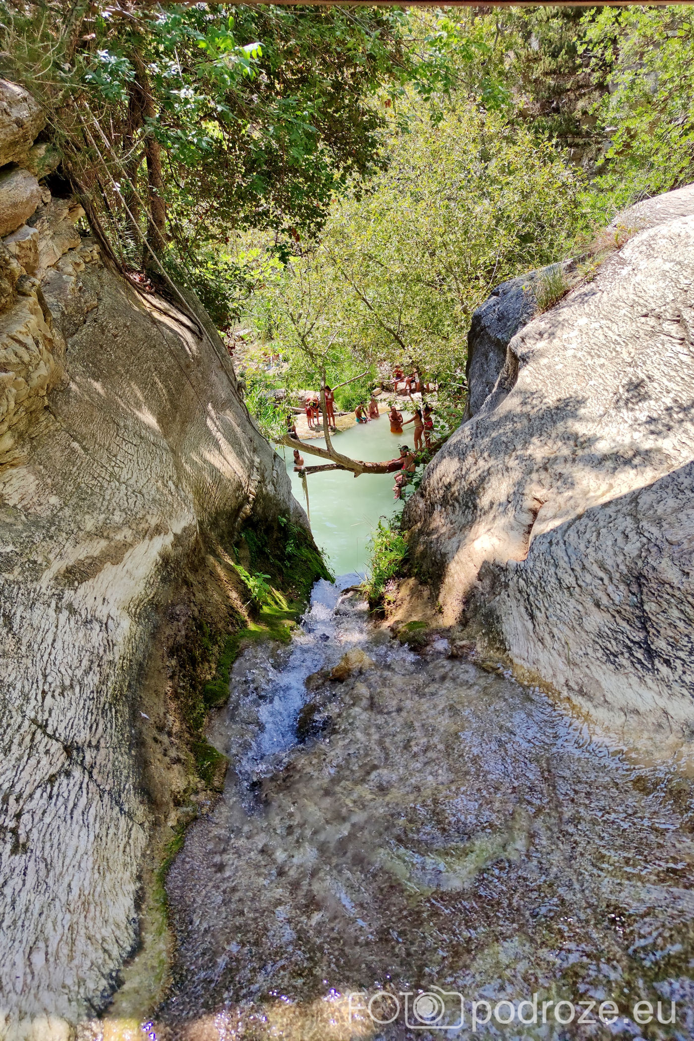 W końcu docieramy do celu naszej wizyty tutaj . Kamienne schody w dół prowadzą nas do naturalnego zbiornika wodnego z niewielkim, ale uroczym wodospadem. Małe jeziorko otoczone jest z trzech stron skałami, a pośrodku znajduje się pochylone drzewo. To ulubione miejsce do wspinania się i skakania do wody. Można też skorzystać z powieszonych wokół lin, a widzieliśmy też śmiałków skaczących z górnego poziomu. Woda jest tu dość głęboka i bardzo, bardzo zimna (mimo piekielnego upału), ale przez to stanowi cudowne orzeźwienie. Przy dolnym zbiorniku znajduje się też mały bar i taras ze stolikami, ale szansa na znalezienie tu miejsca do siedzenia jest znikoma.