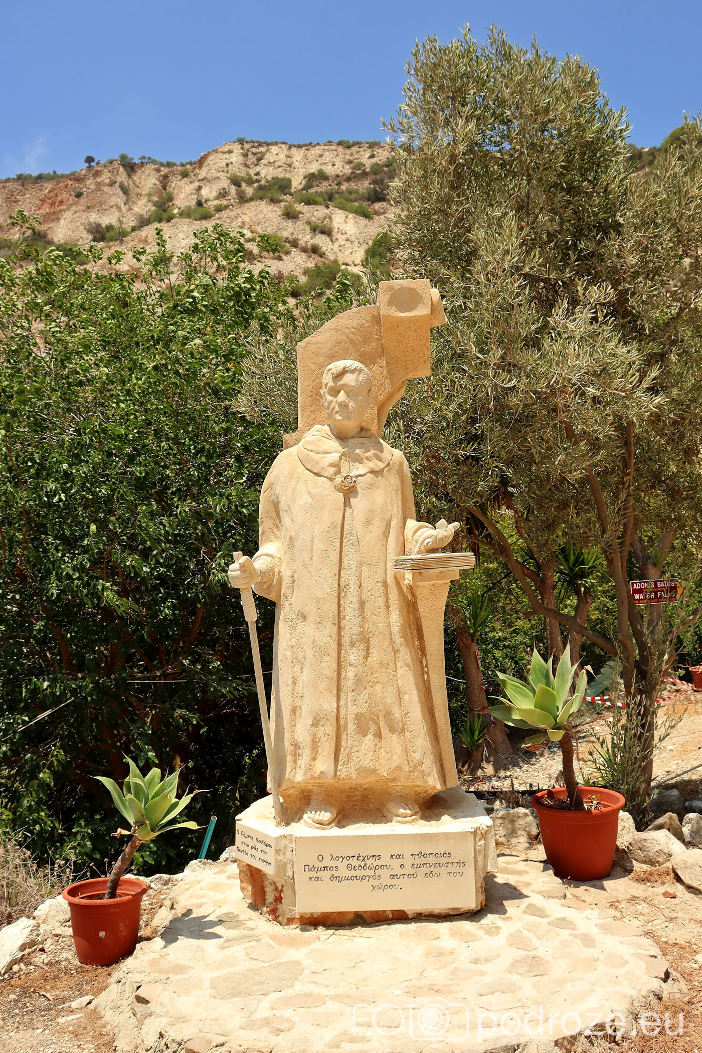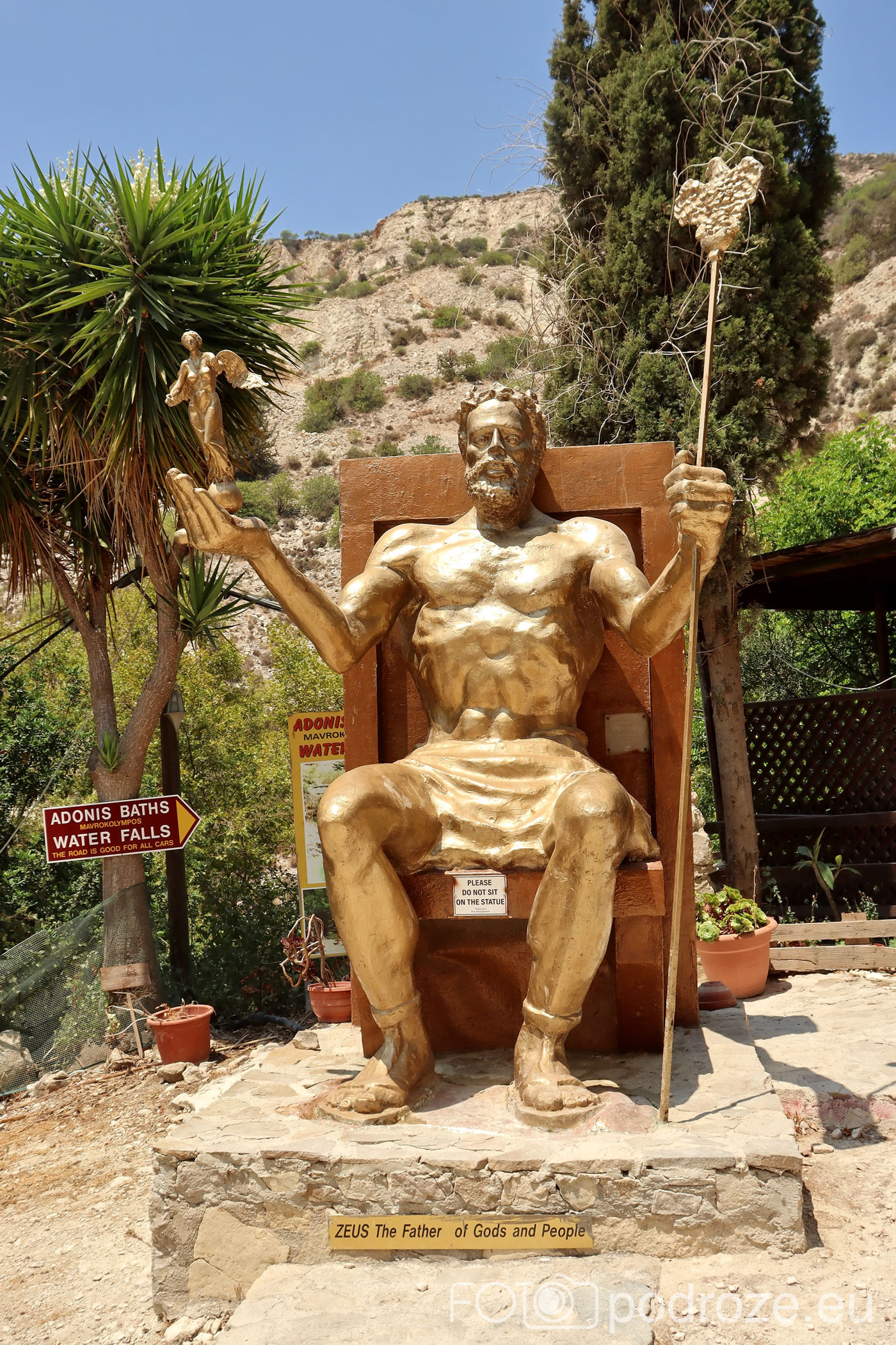 Jeszcze zanim przekroczymy wejście do właściwego kompleksu w oczy rzuca się ogromna , bo aż 10 metrowa, biała figura bogini Afrodyty. Bogini miłości jest wszechobecna na wyspie, pojawia się w nazwach niemalże wszystkich miejsc i atrakcji. Oprócz Afrodyty znajdziemy tu posągi Zeusa, Adonisa i inne. Wygląda to troszkę kiczowato, ale taka już uroda tego miejsca.