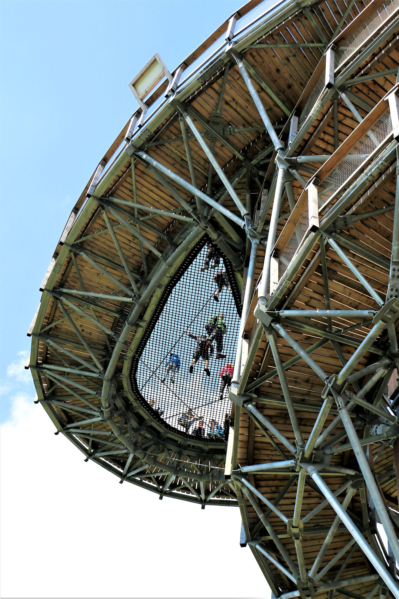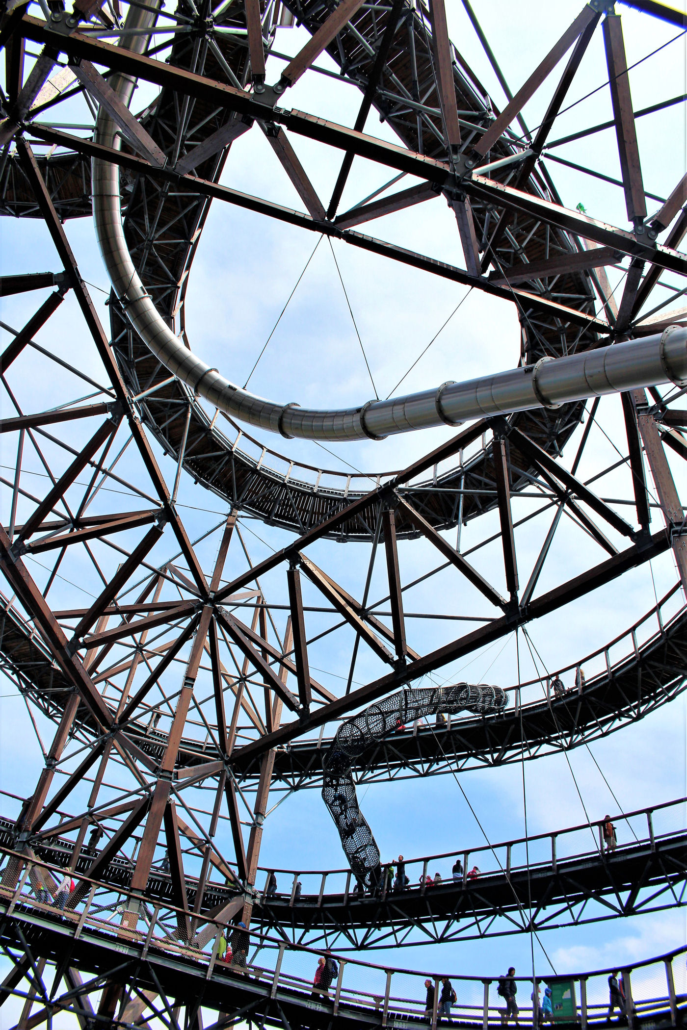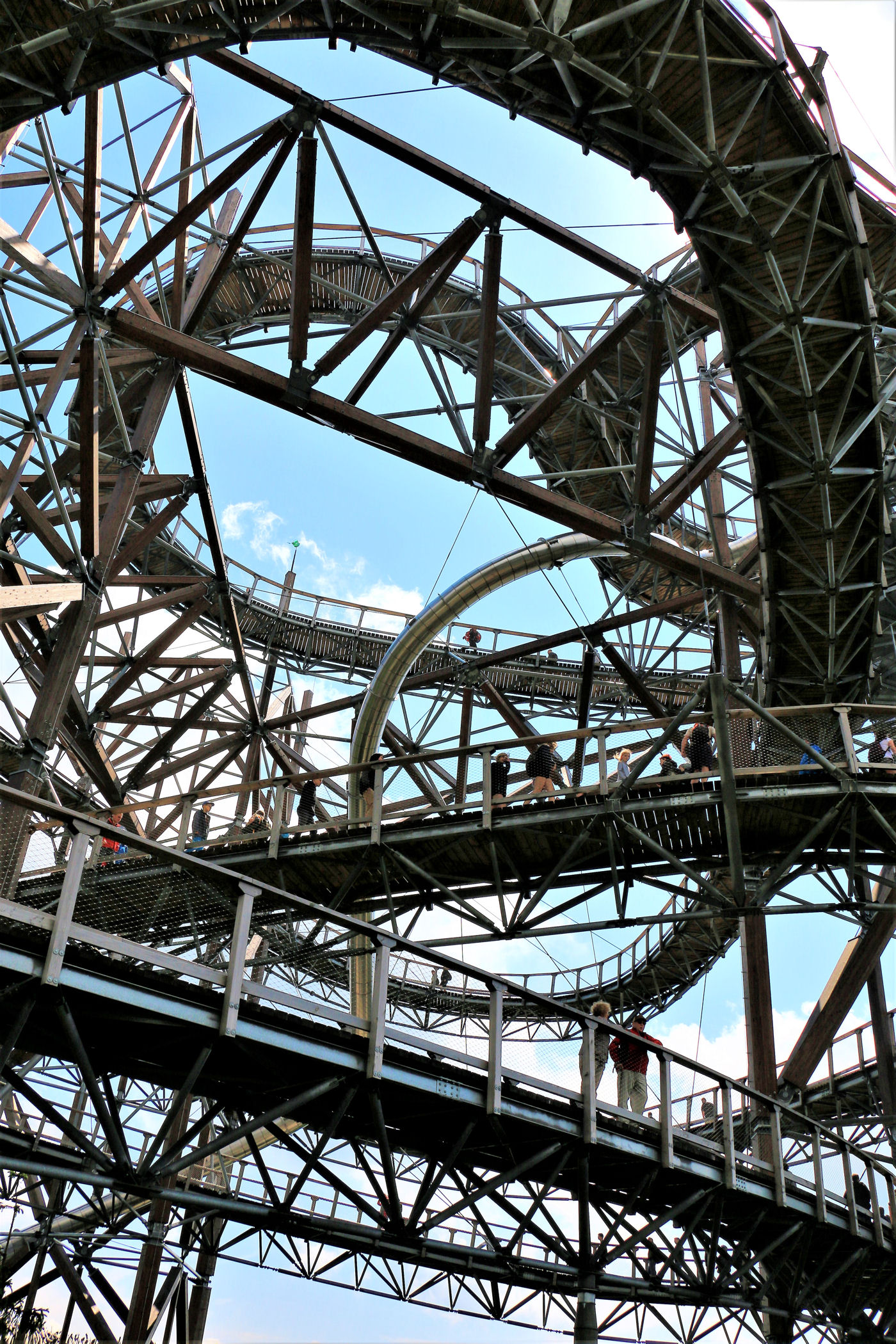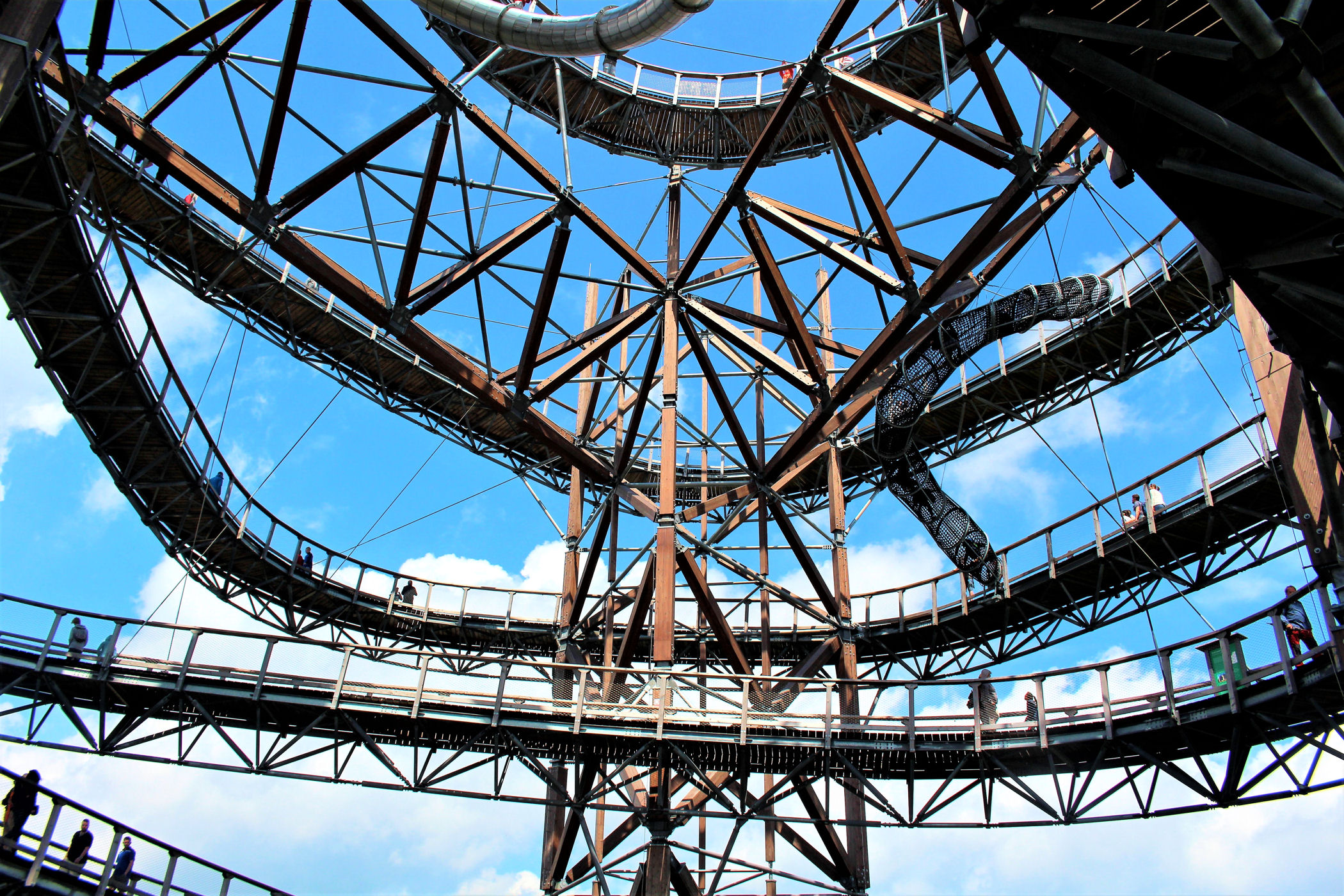 Kupujemy bilety wstępu (na wieżę) i pniemy się powoli w górę, fotografując niemal każdy jej fragment. Syn też jest zachwycony, czekają tu na niego atrakcje w postaci siatkowego tunelu, zjeżdżalni stalowej z całej niemal wysokości oraz siatki rozpiętej na szczycie po której można pochodzić. Nie będę ukrywać – my się też świetnie bawimy.