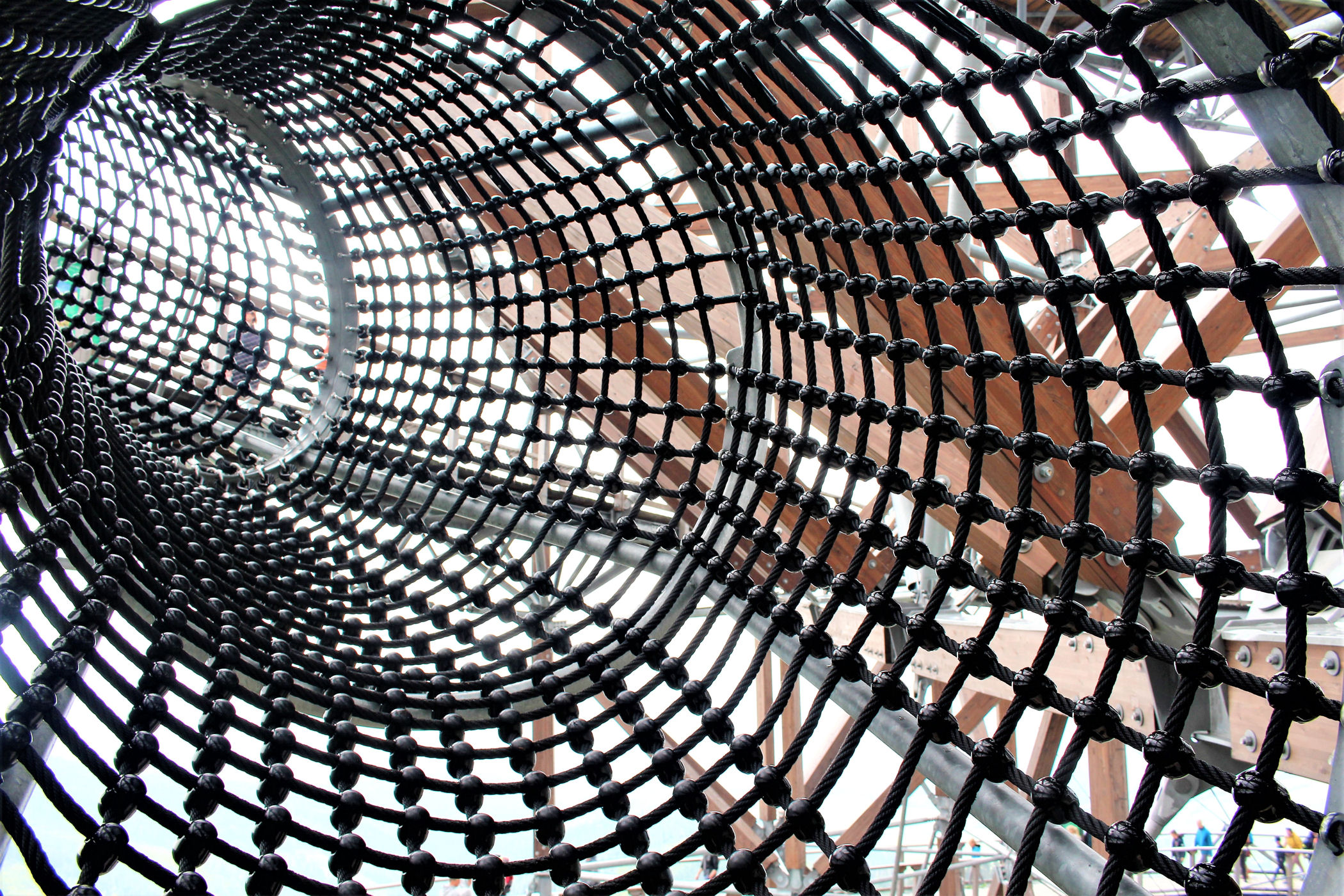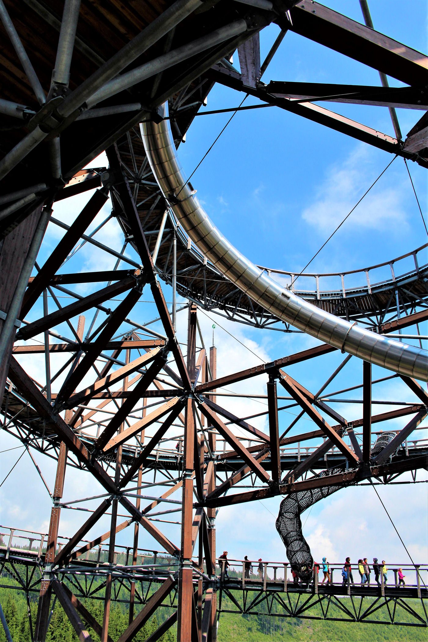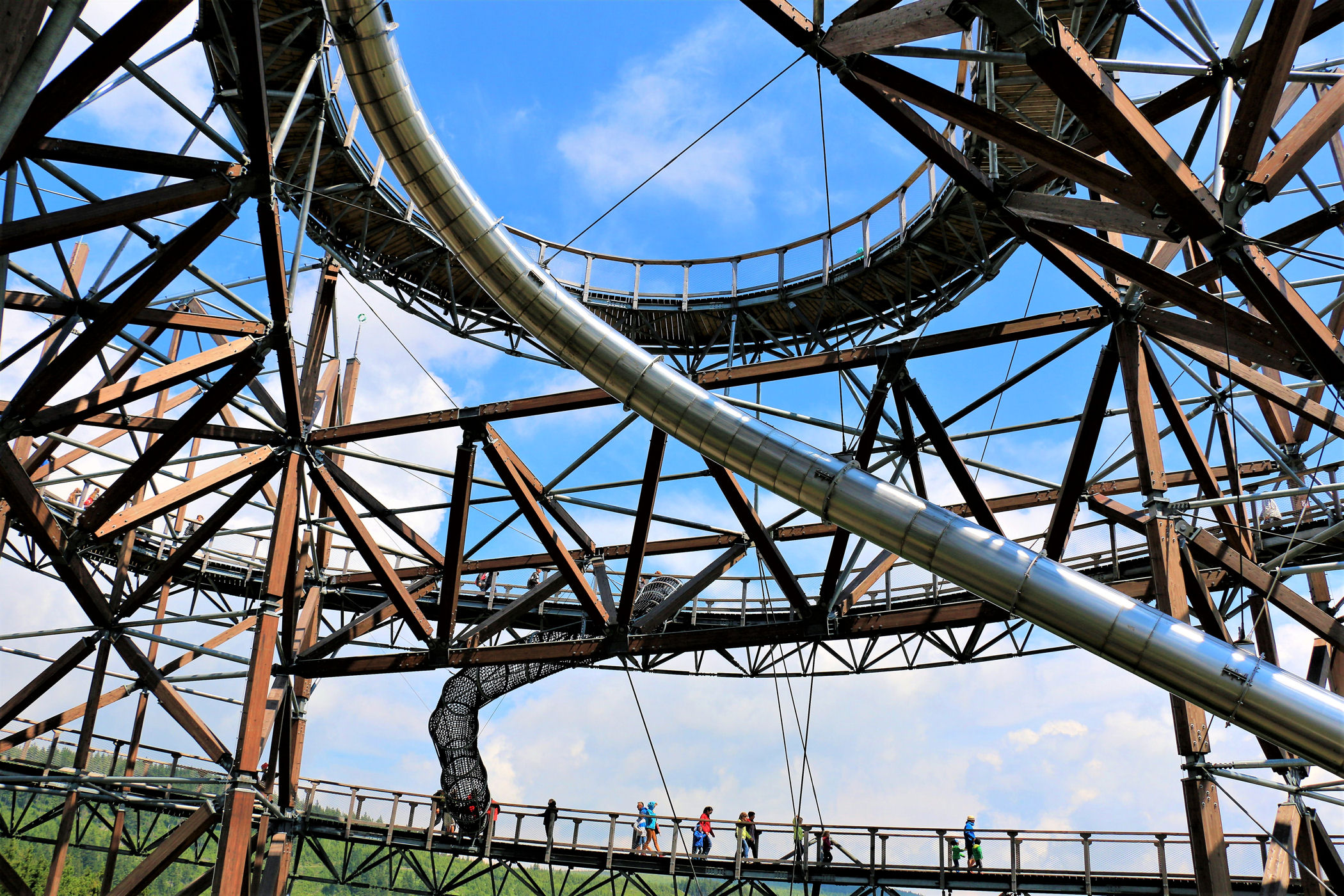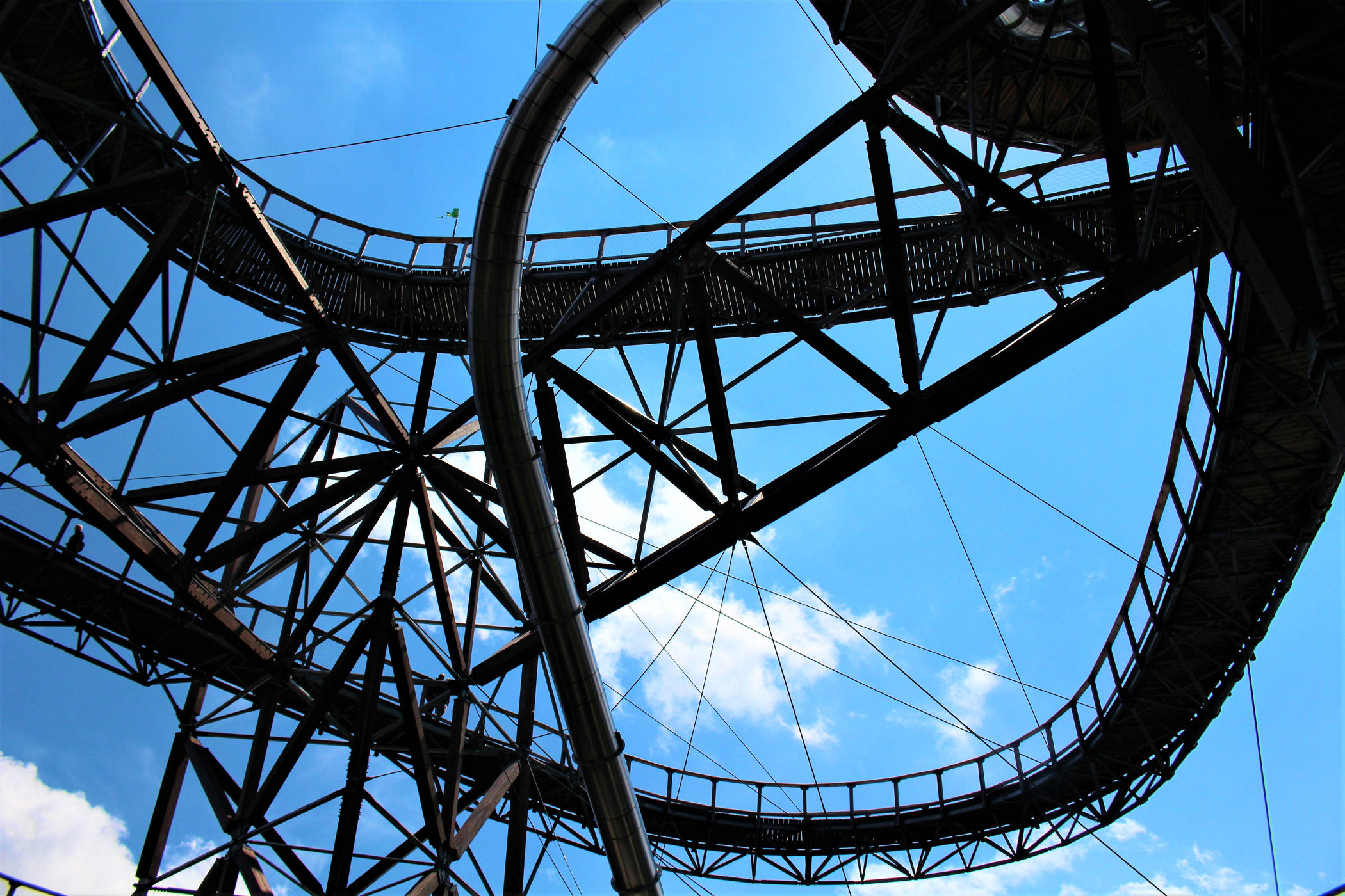 Kupujemy bilety wstępu (na wieżę) i pniemy się powoli w górę, fotografując niemal każdy jej fragment. Syn też jest zachwycony, czekają tu na niego atrakcje w postaci siatkowego tunelu, zjeżdżalni stalowej z całej niemal wysokości oraz siatki rozpiętej na szczycie po której można pochodzić. Nie będę ukrywać – my się też świetnie bawimy.