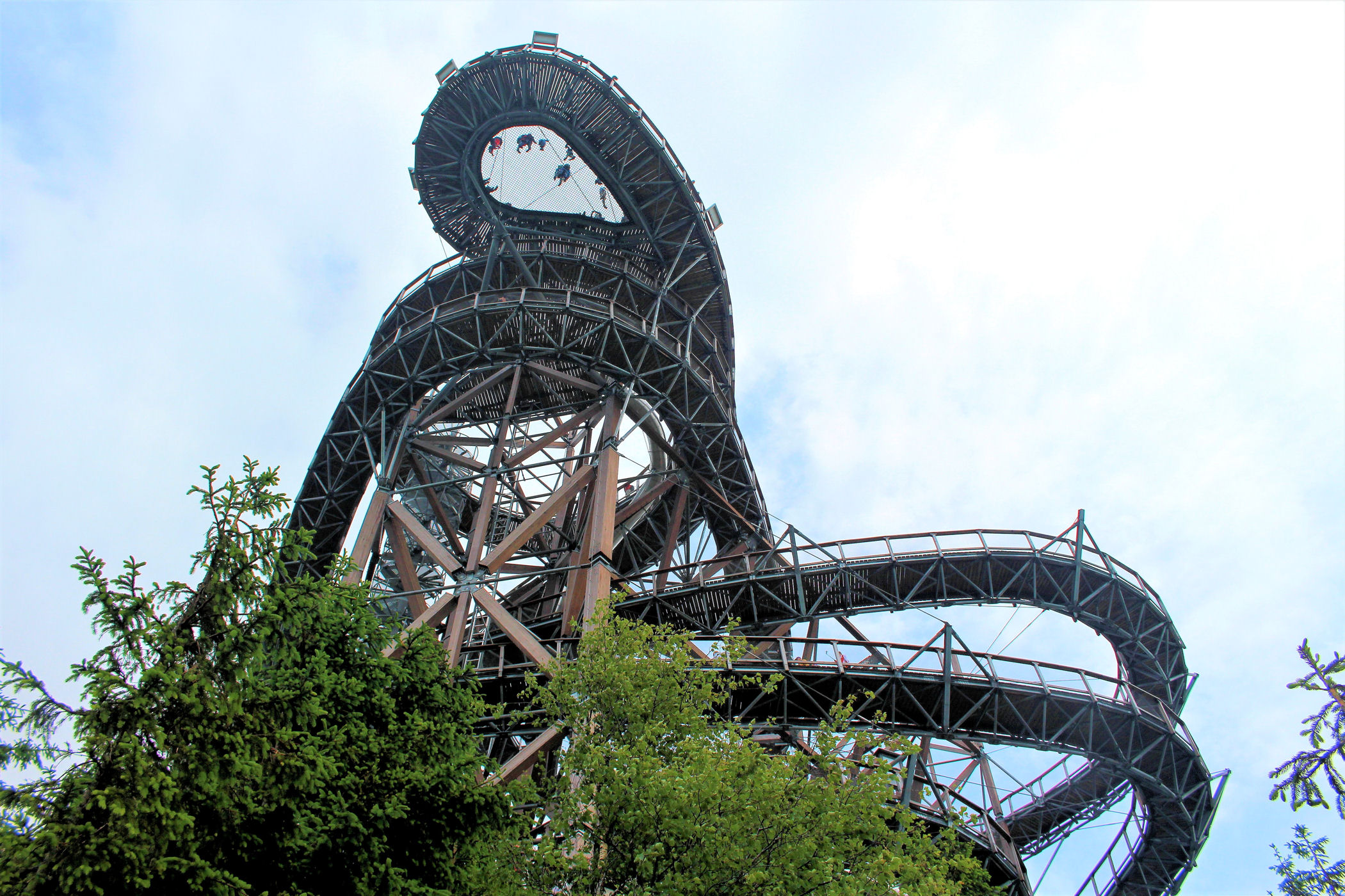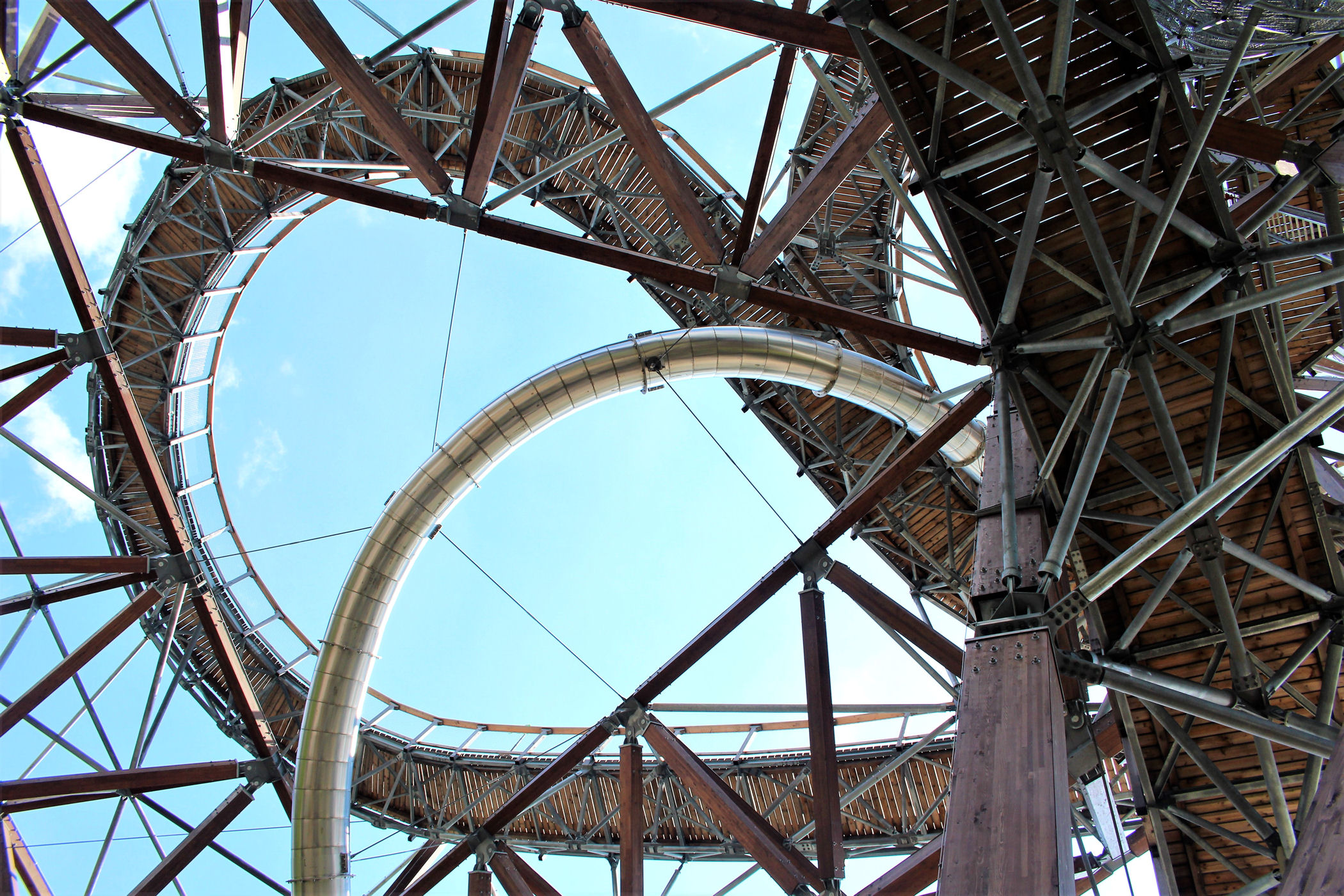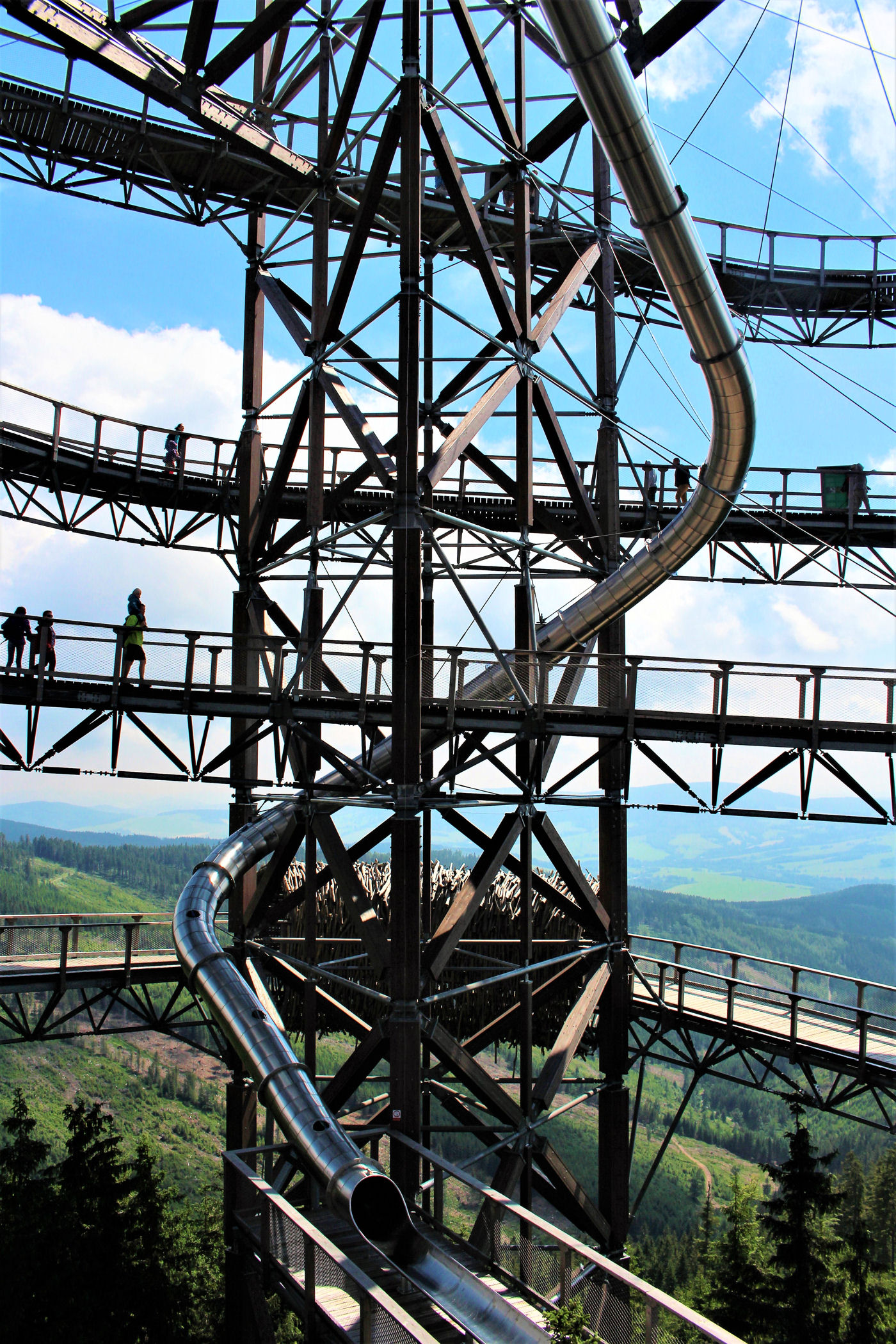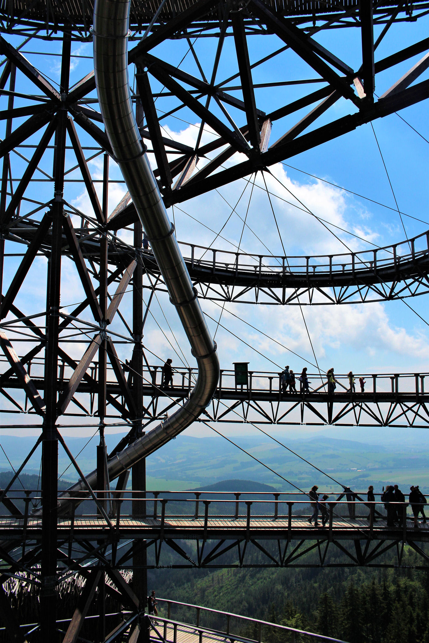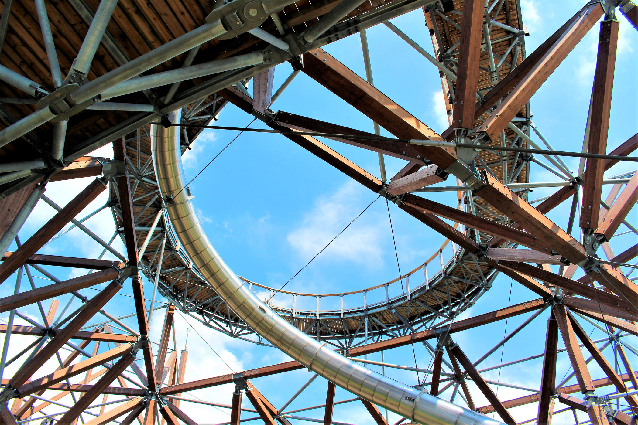Kupujemy bilety wstępu (na wieżę) i pniemy się powoli w górę, fotografując niemal każdy jej fragment. Syn też jest zachwycony, czekają tu na niego atrakcje w postaci siatkowego tunelu, zjeżdżalni stalowej z całej niemal wysokości oraz siatki rozpiętej na szczycie po której można pochodzić. Nie będę ukrywać – my się też świetnie bawimy.