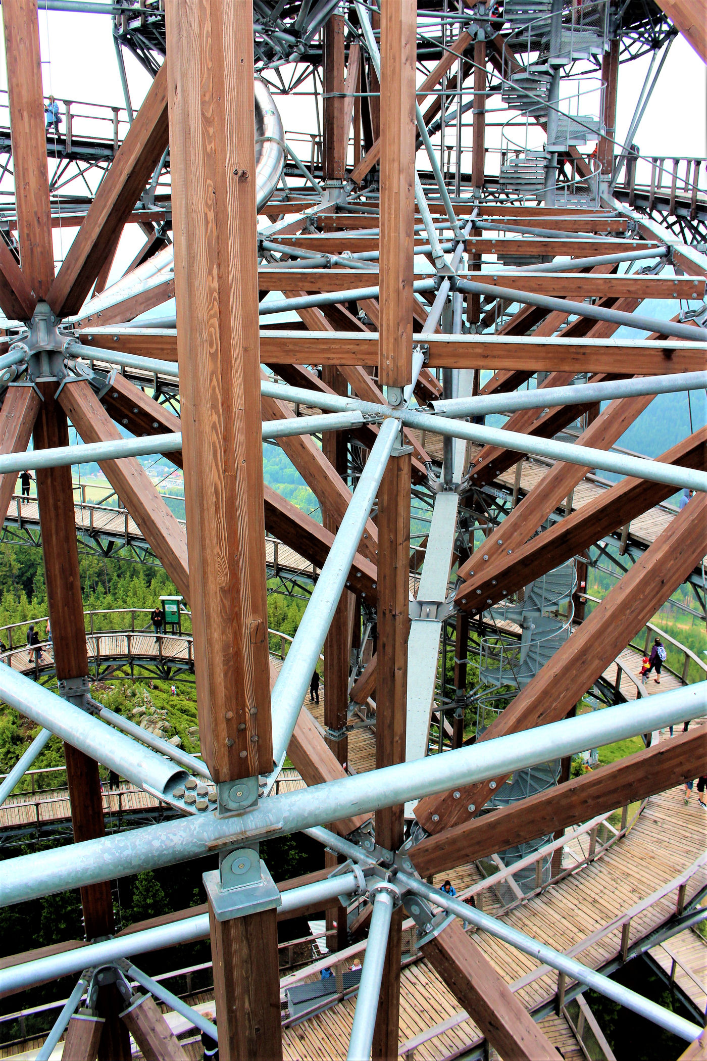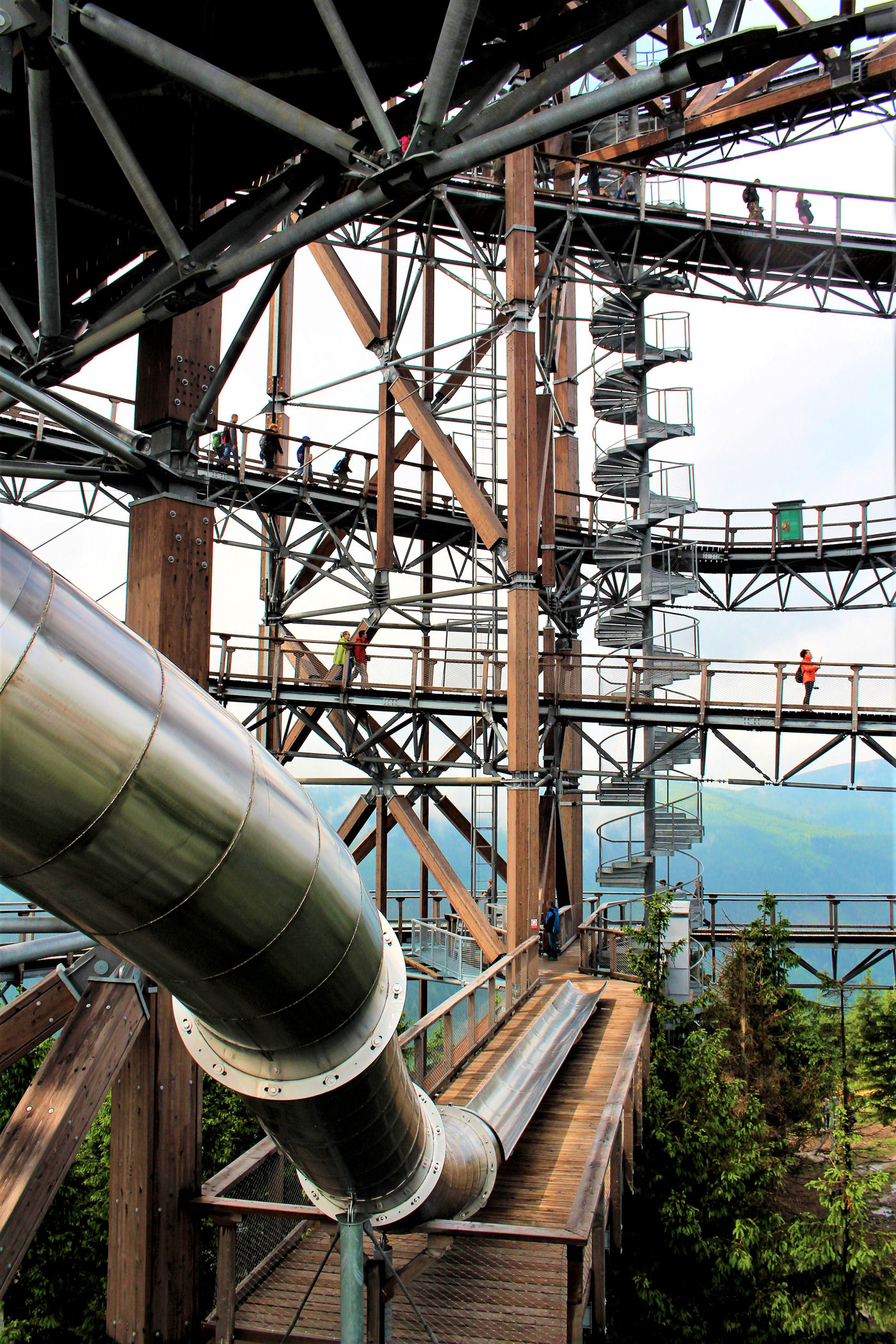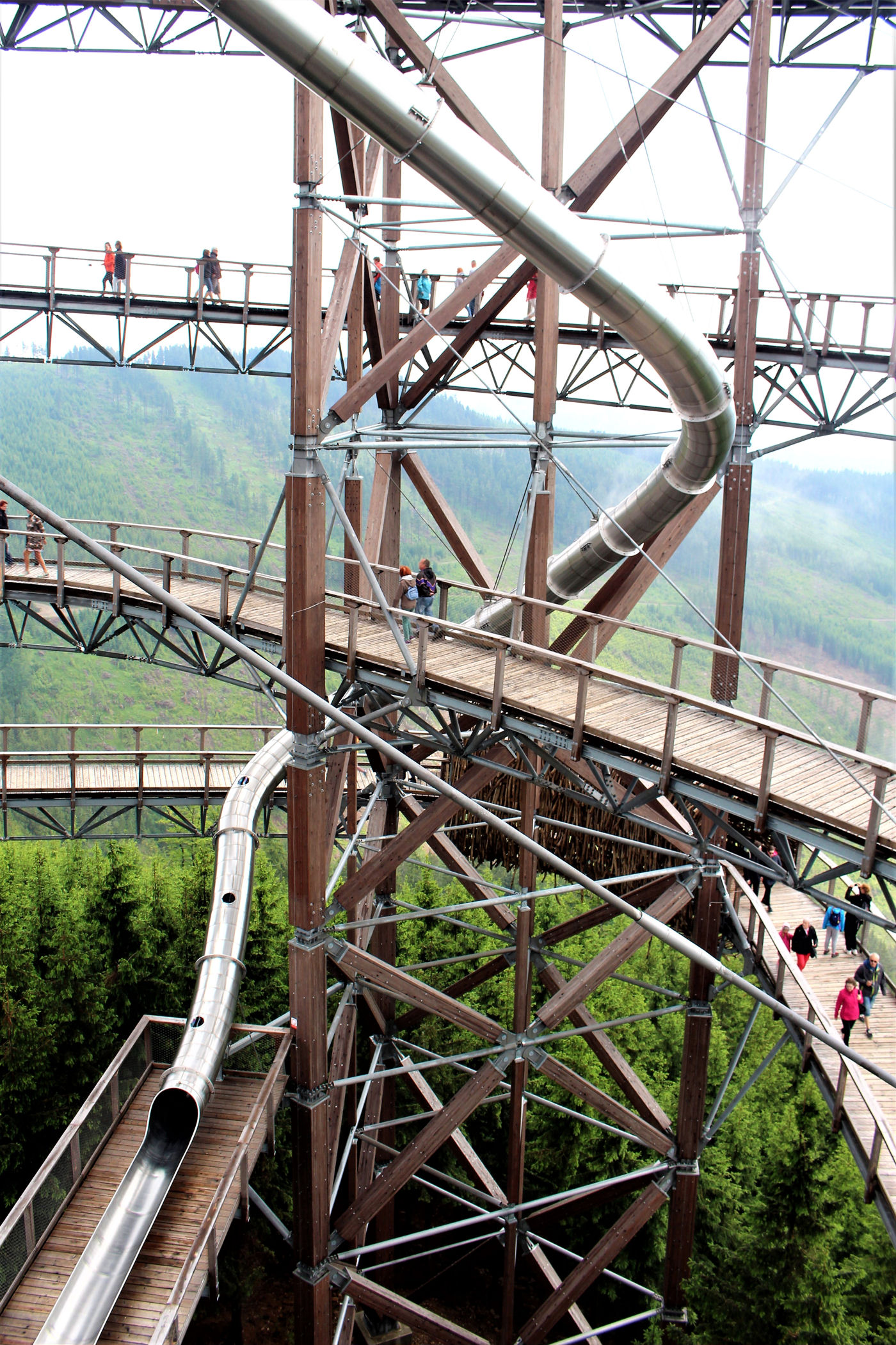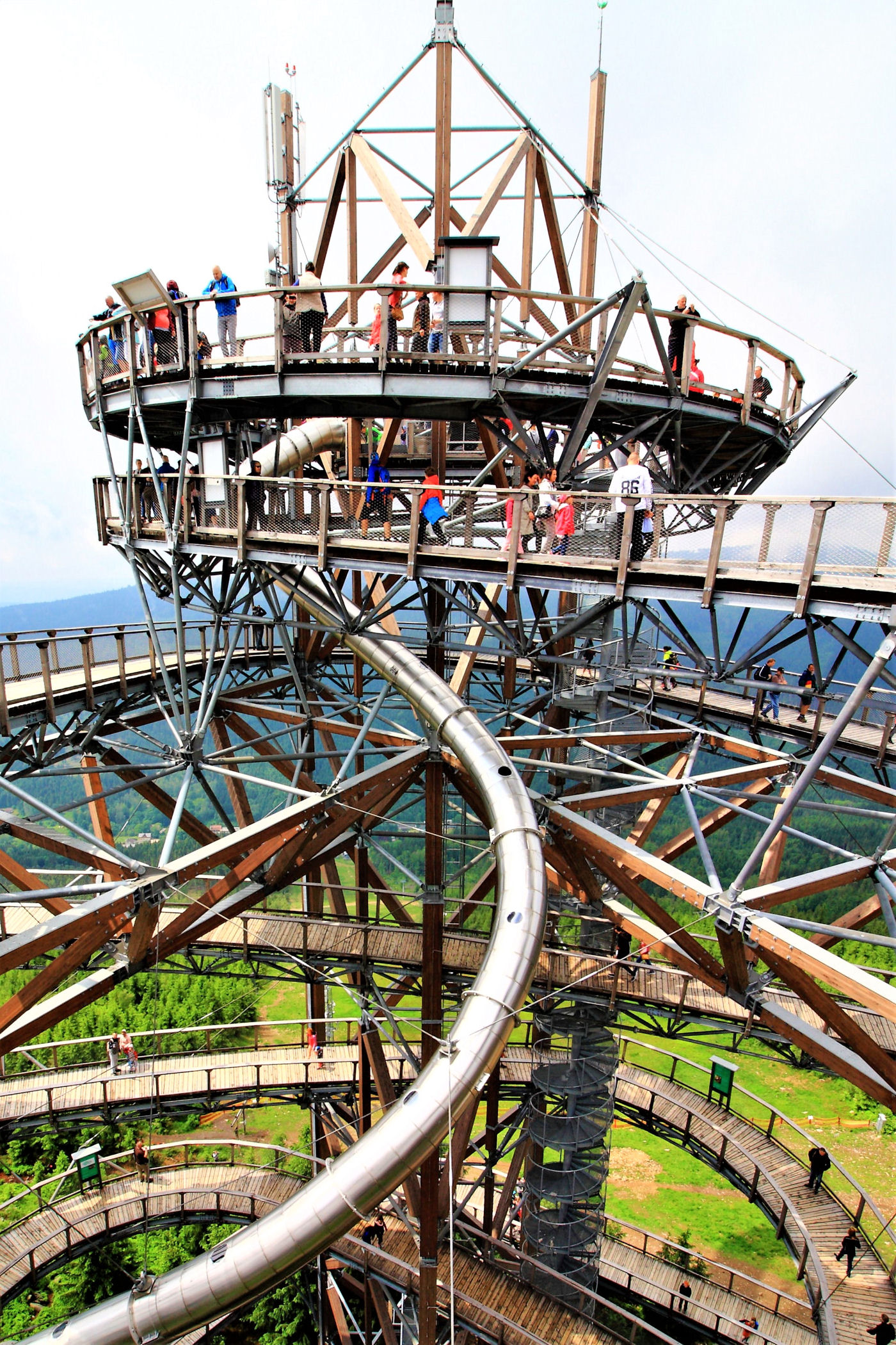 Kupujemy bilety wstępu (na wieżę) i pniemy się powoli w górę, fotografując niemal każdy jej fragment. Syn też jest zachwycony, czekają tu na niego atrakcje w postaci siatkowego tunelu, zjeżdżalni stalowej z całej niemal wysokości oraz siatki rozpiętej na szczycie po której można pochodzić. Nie będę ukrywać – my się też świetnie bawimy.