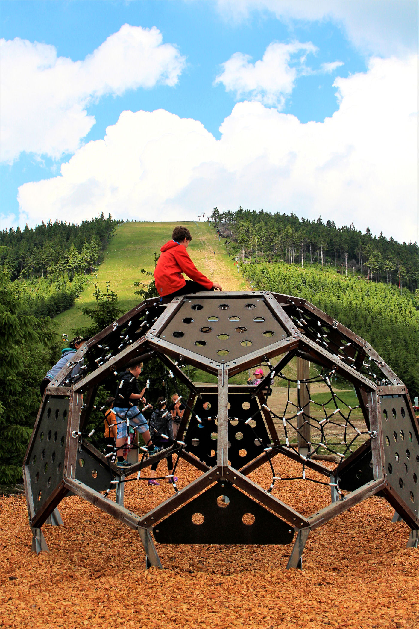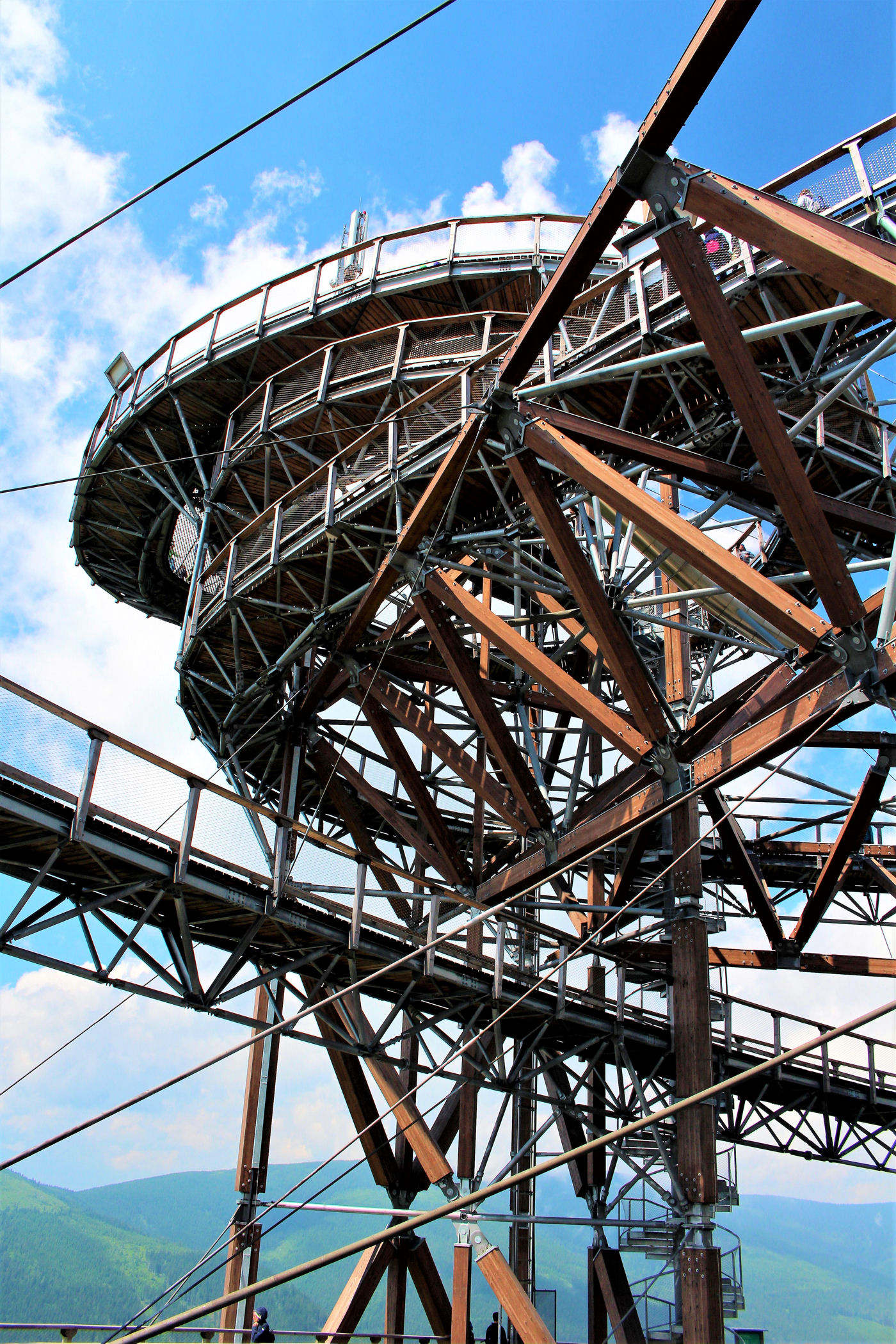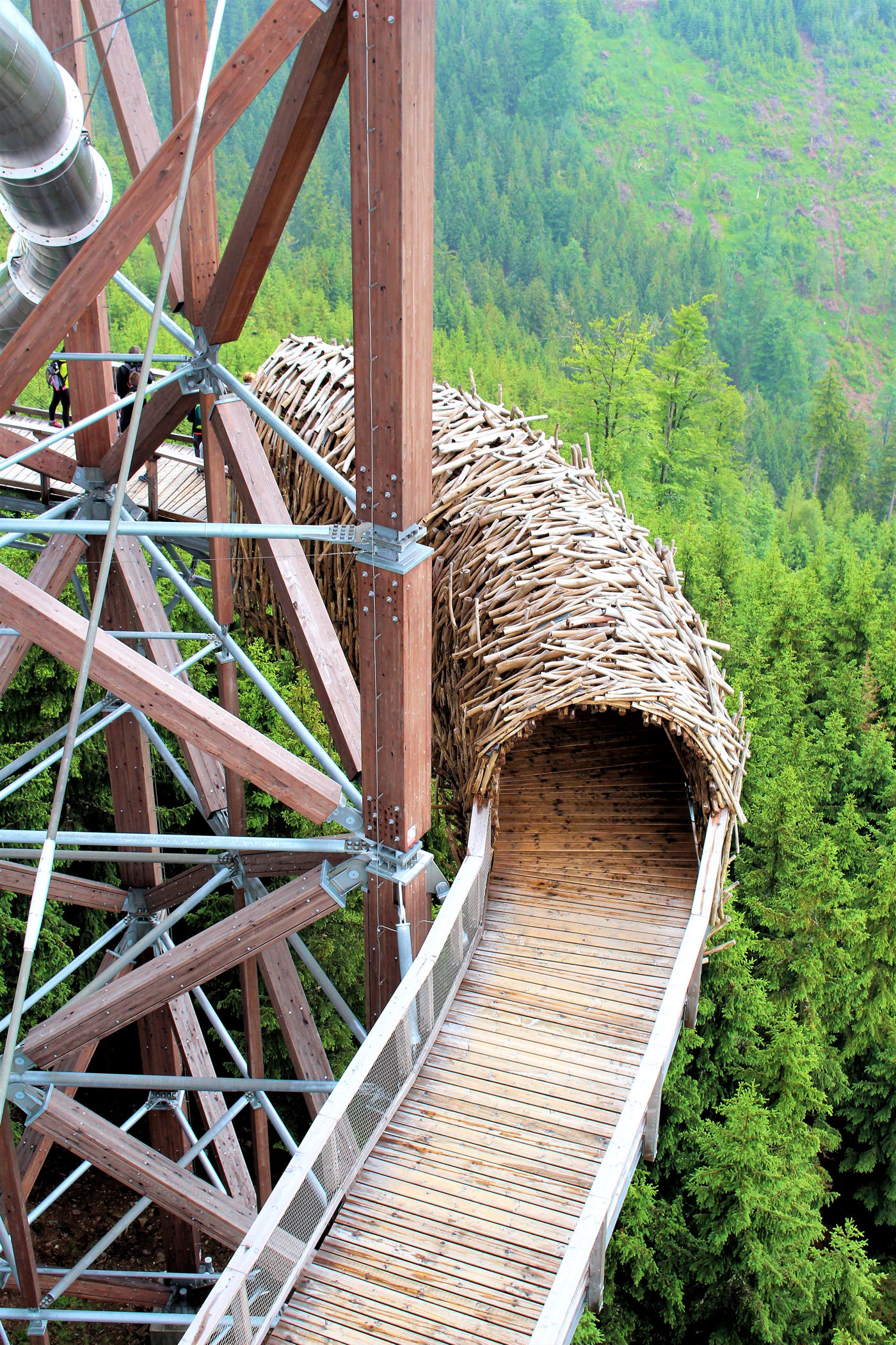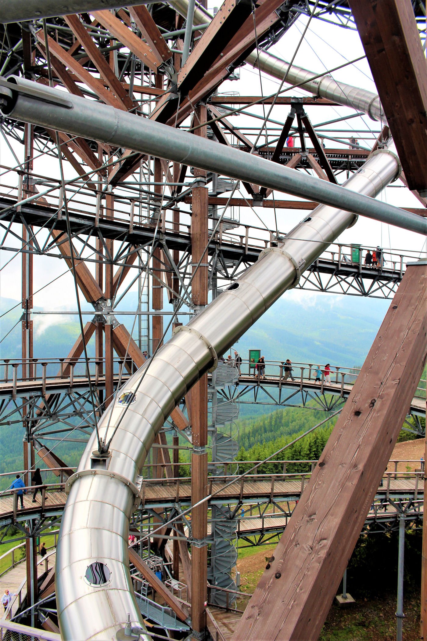 Kupujemy bilety wstępu (na wieżę) i pniemy się powoli w górę, fotografując niemal każdy jej fragment. Syn też jest zachwycony, czekają tu na niego atrakcje w postaci siatkowego tunelu, zjeżdżalni stalowej z całej niemal wysokości oraz siatki rozpiętej na szczycie po której można pochodzić. Nie będę ukrywać – my się też świetnie bawimy.