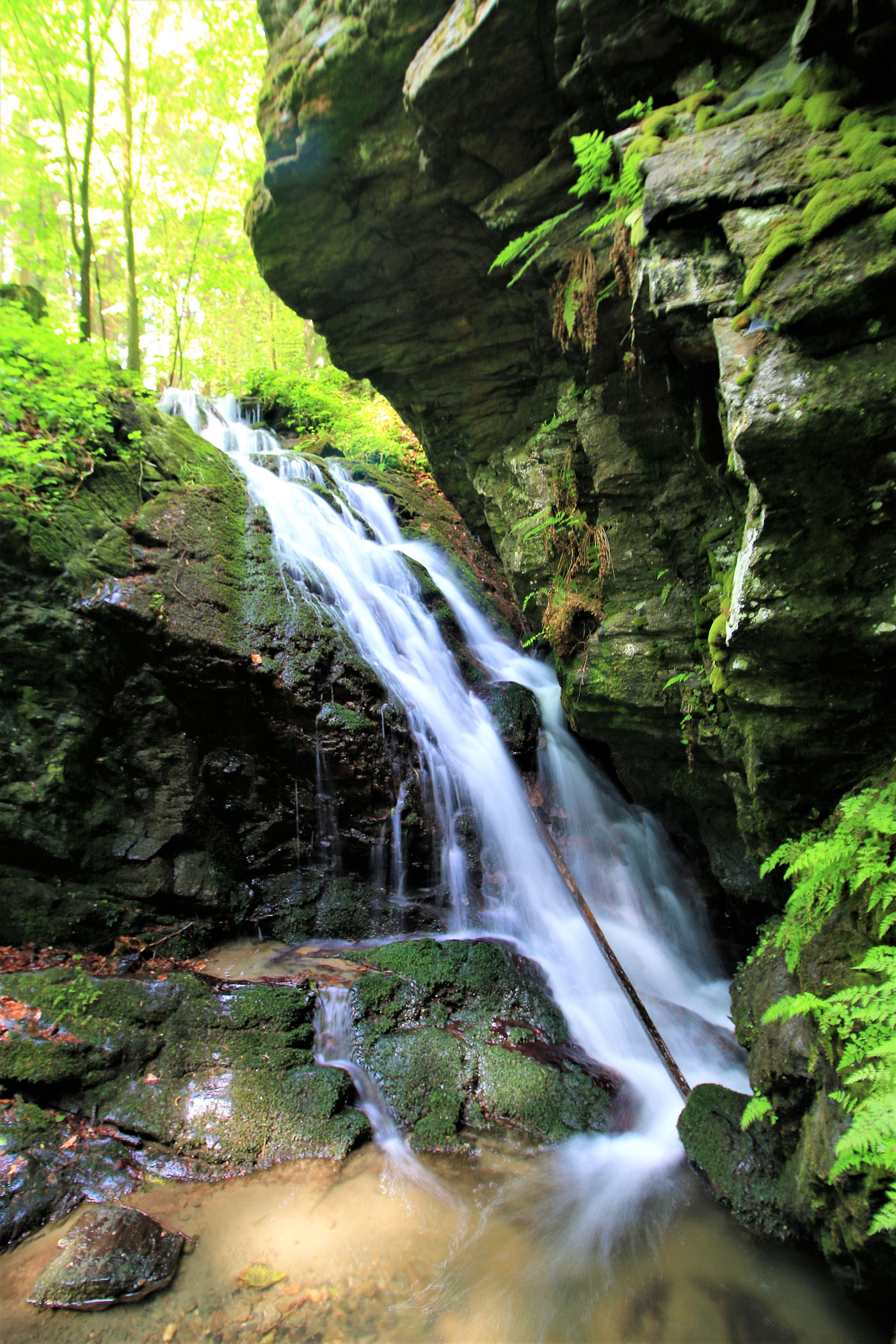 W drodze do głównego celu naszej wyprawy robimy jeszcze krótki postój w jednym niepozornym, ale urokliwym miejscu – przy Żlebskim Wodospadzie . Miejsce jest kompletnie niewidoczne z drogi – tylko poszerzenie drogi w tym miejscu może na coś nakierować. Wodospad można zobaczyć tak na prawdę tylko schodząc wgłąb wąwozu.