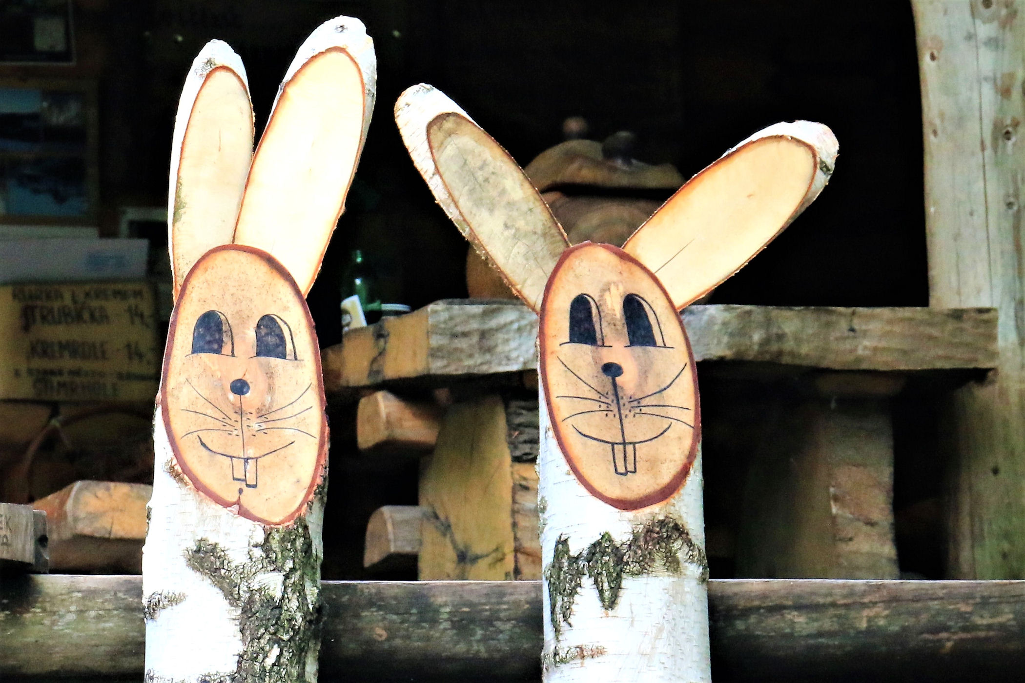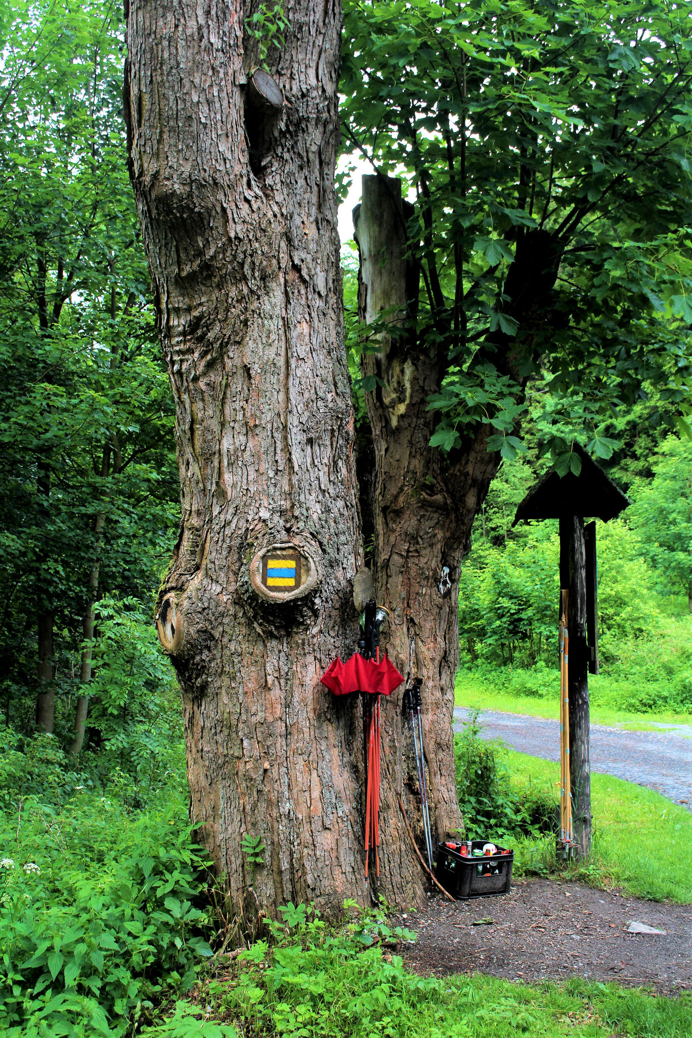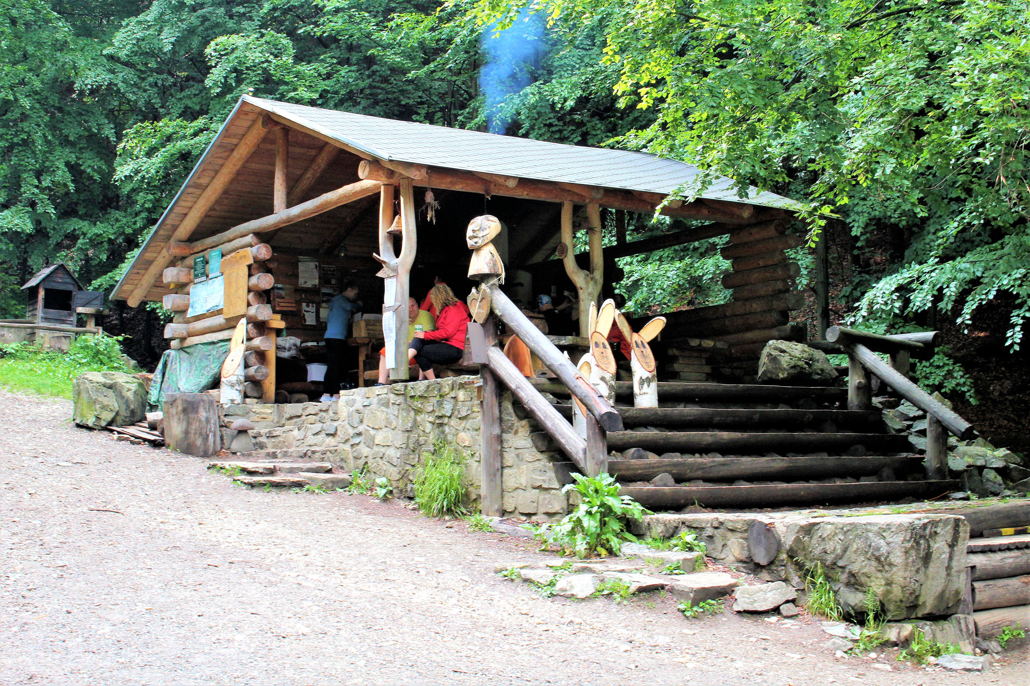 Czechy faktycznie potrafią zaskakiwać. Przed wyjazdem poszukując ciekawostek odnalazłam kolejną – bar w lesie. W sumie nic niezwykłego, ale zaintrygowała mnie informacja , że bar jest całkowicie samoobsługowy. Podjeżdżamy na ostatni parking w lesie, a dalej już na piechotkę około 2 km do celu. Na wejściu jest drzewo z zawieszonymi kijkami trekkingowymi, a nawet parasol, za 10 koron można je sobie wypożyczyć na drogę. Szlak umilają rzeźby grzybów, twarzy, ścieżka zdrowia i zajączek z drewna.