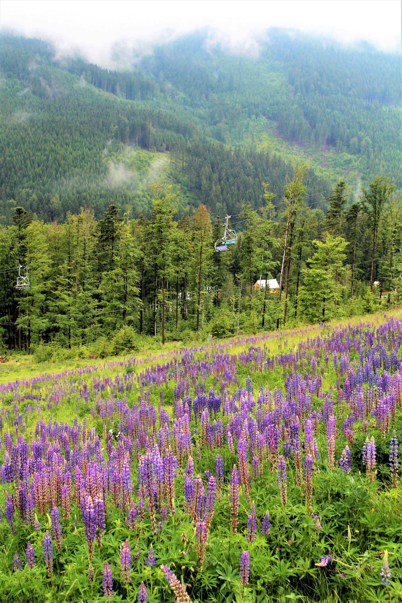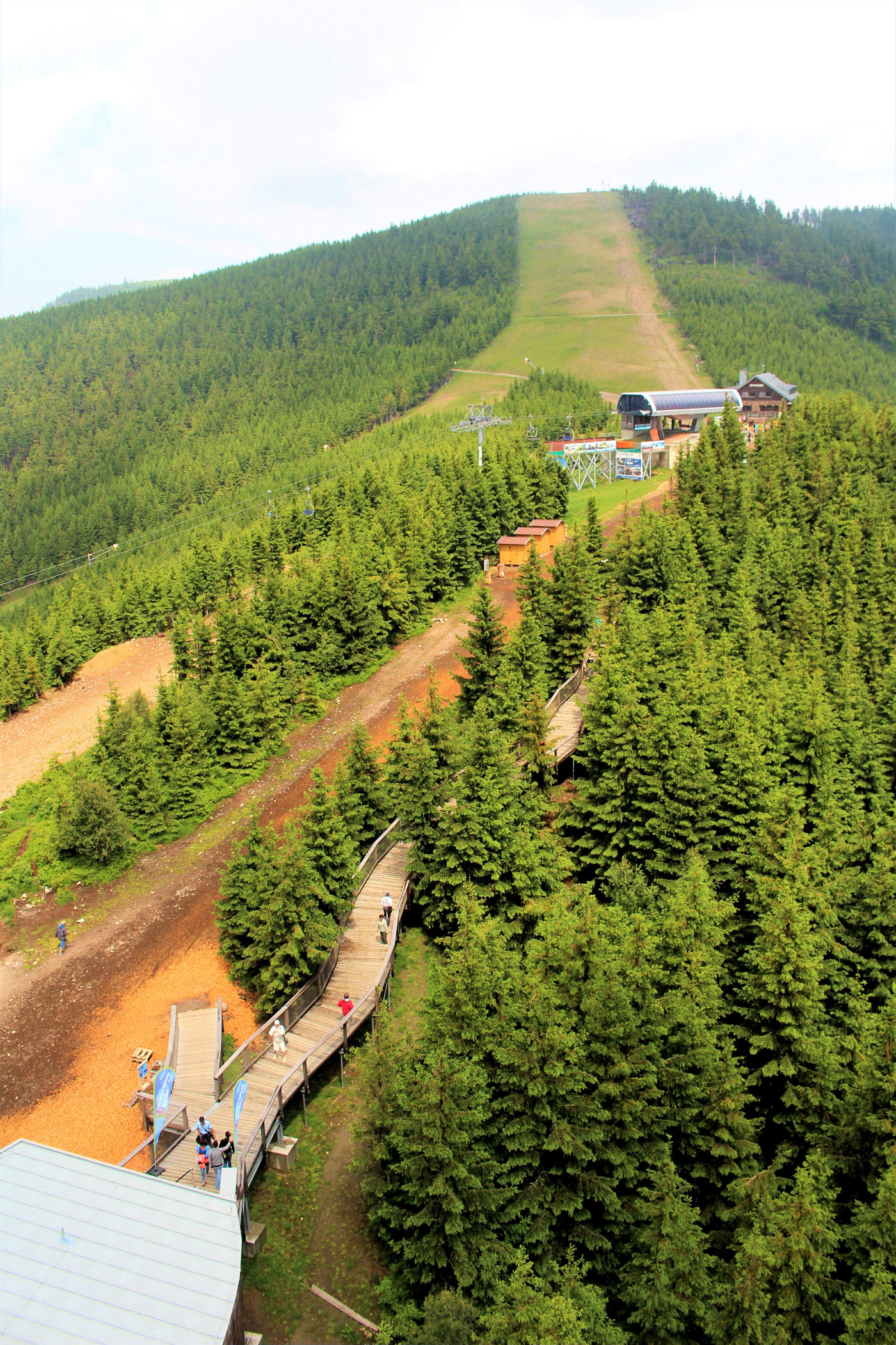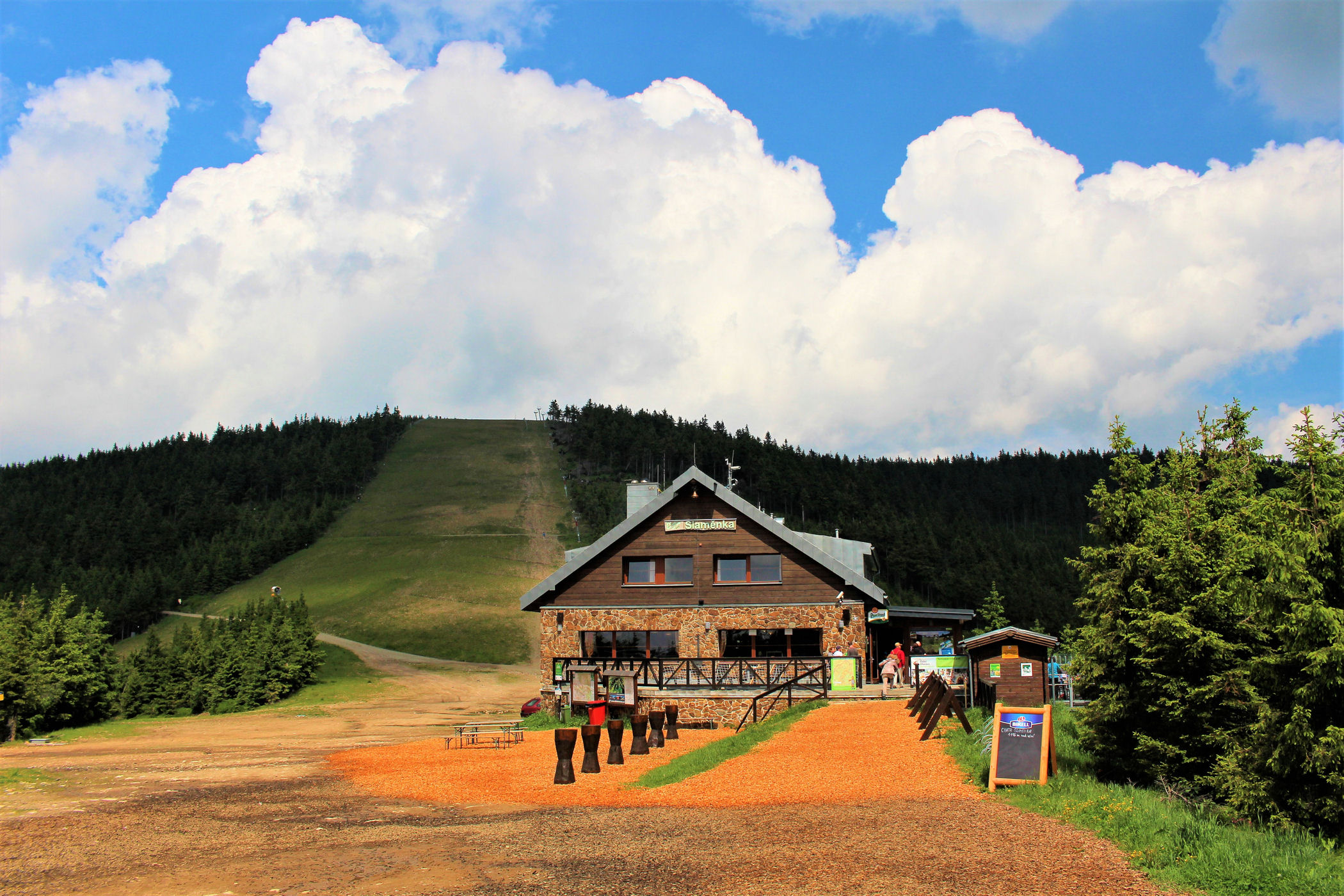 Na szczyt można wjechać kolejką krzesełkową, można też podrałować na piechotę początkowo wzdłuż wyciągu, a potem szlakiem przez las. I wersja kosztuje w pakiecie dla rodziny 790 koron, II – 500 koron. My wybieramy oczywiście opcje druga, ale zanim ruszymy na szlak jesteśmy uziemieni w knajpie koło kasy, bo właśnie rozpętała się burza.