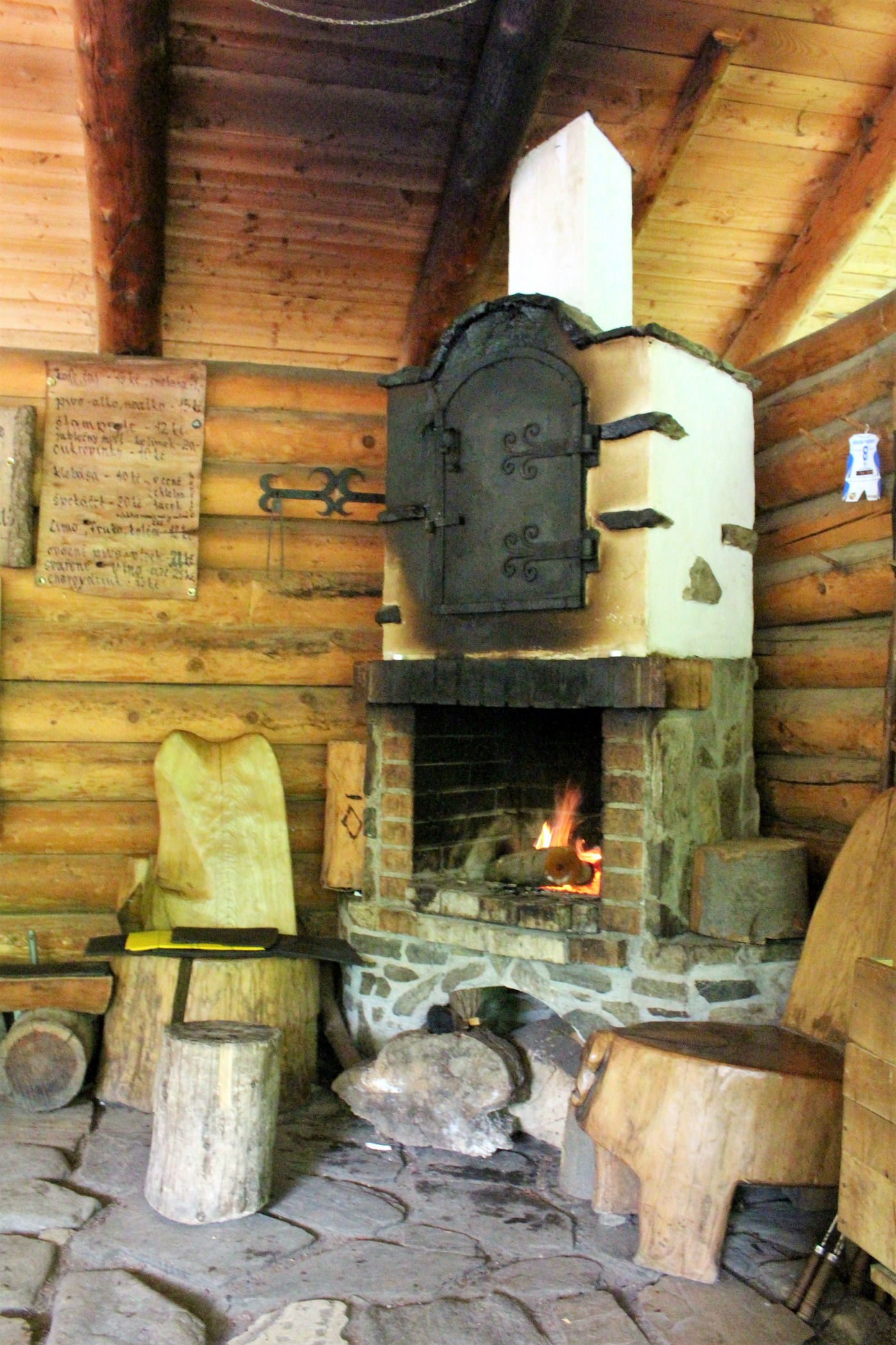 A piwo kosztuje tu tylko 15 koron (czyli nieco ponad 2 zł). Zaopatrzenie na miejscu faktycznie niczego sobie : piwo i inne napoje chłodzą się w specjalnych beczkach przez które przepływa górski potok. Jest kawa, herbata i kuchenka elektryczna. Cały czas płonie ogień w kominku i na ognisku na których można upiec sobie kiełbaski (czekają w specjalnie chłodzonym pojemniku razem z chlebkiem) . Mimo niepewnej pogody – na miejscu zastajemy niezły tłumek, a w drodze minęliśmy chyba z 50 osób – ruch więc w interesie jest całkiem spory . Ten wspaniały czeski eksperyment pokazuje , że nadal warto mieć wiarę w ludzi.