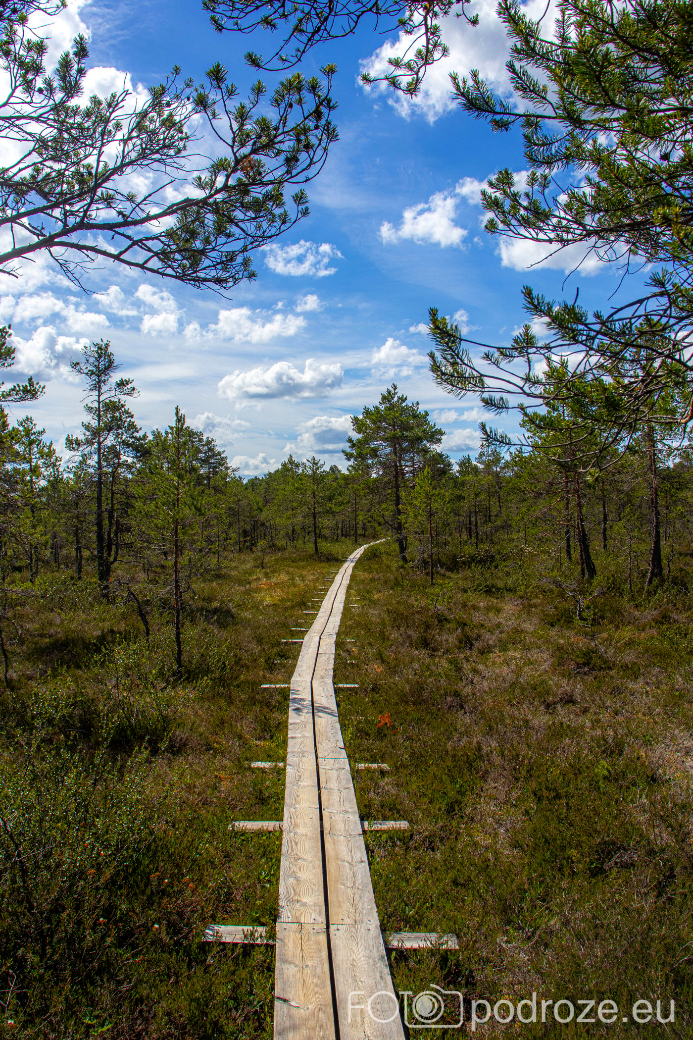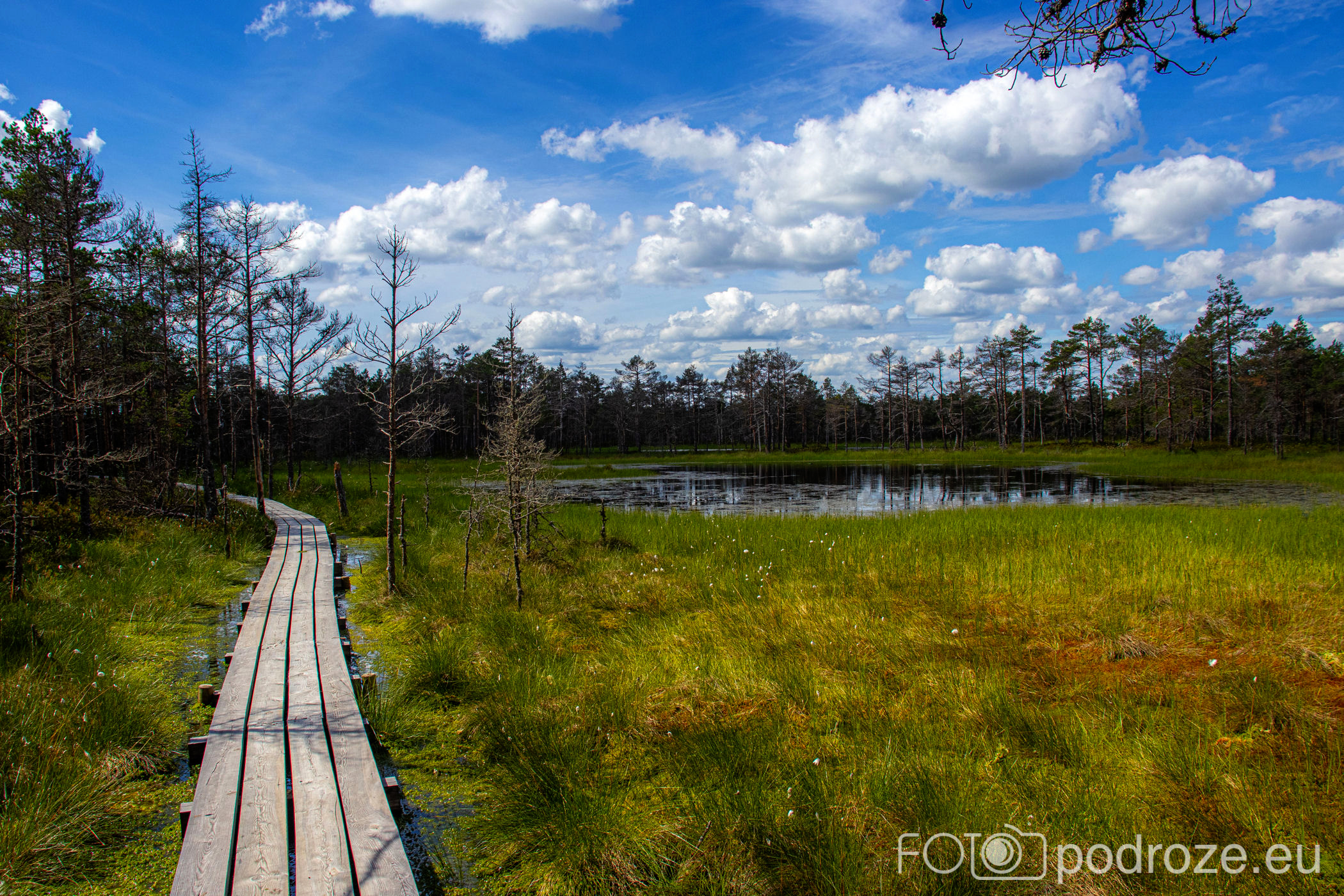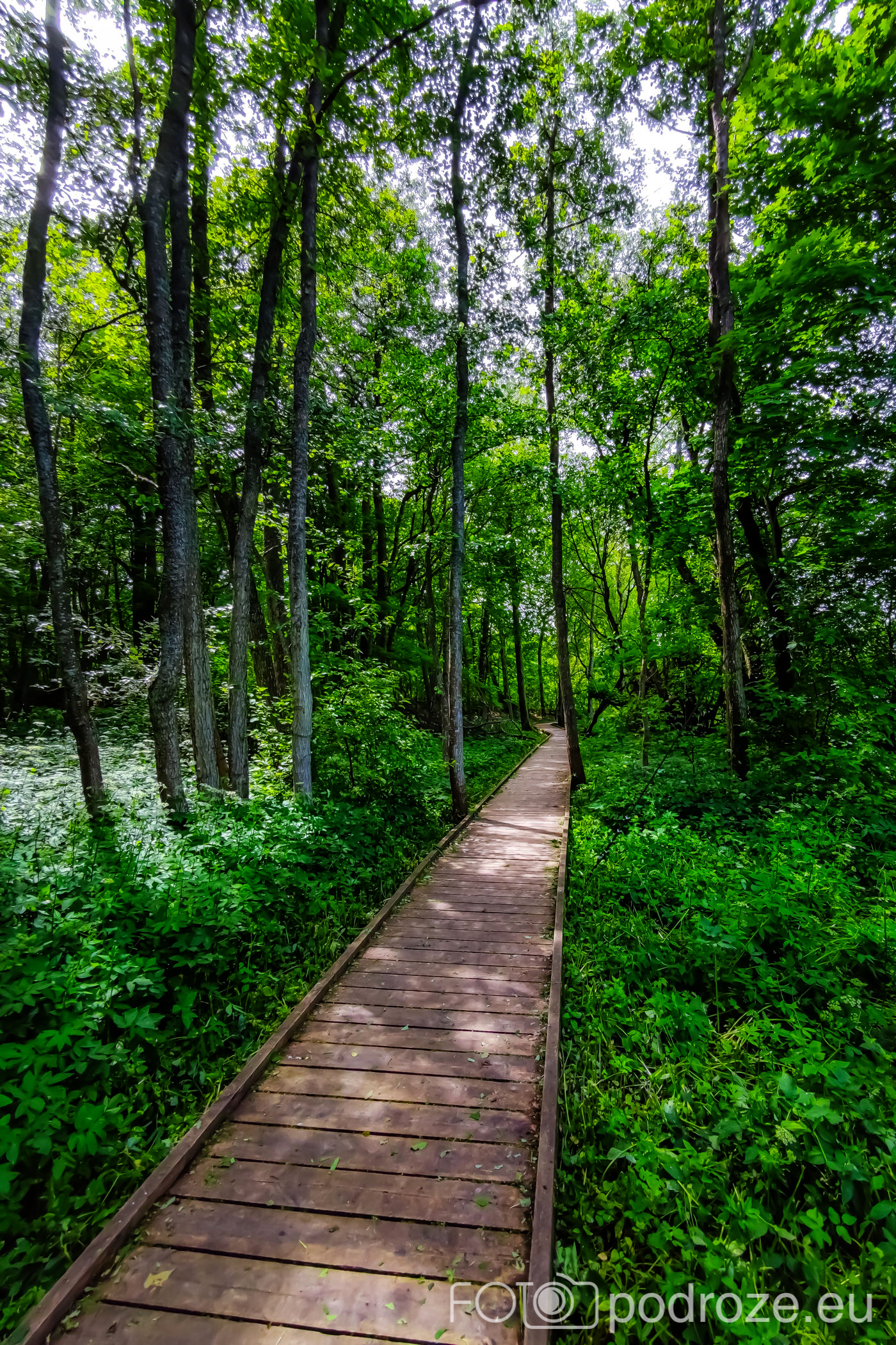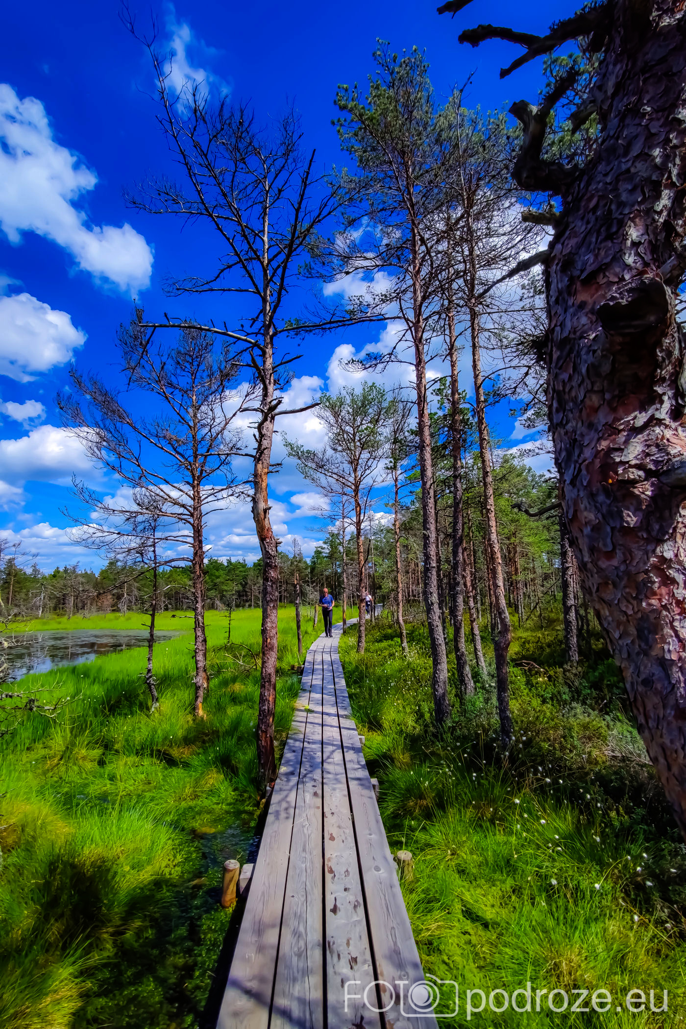 Na końcu odbijamy w prawo i teraz już idziemy po drewnianych kładkach przez podmokłe tereny. Początkowo kładki są bardzo wąskie, takie dosłownie na jedną osobę i wyminięcie się wymaga nie lada gimnastyki. Z czasem pomosty stają się szersze, a i wody wokół nas jest coraz więcej. Mamy szczęście tego dnia do pogody, bo taka obłędna aura nie zdarza się często.