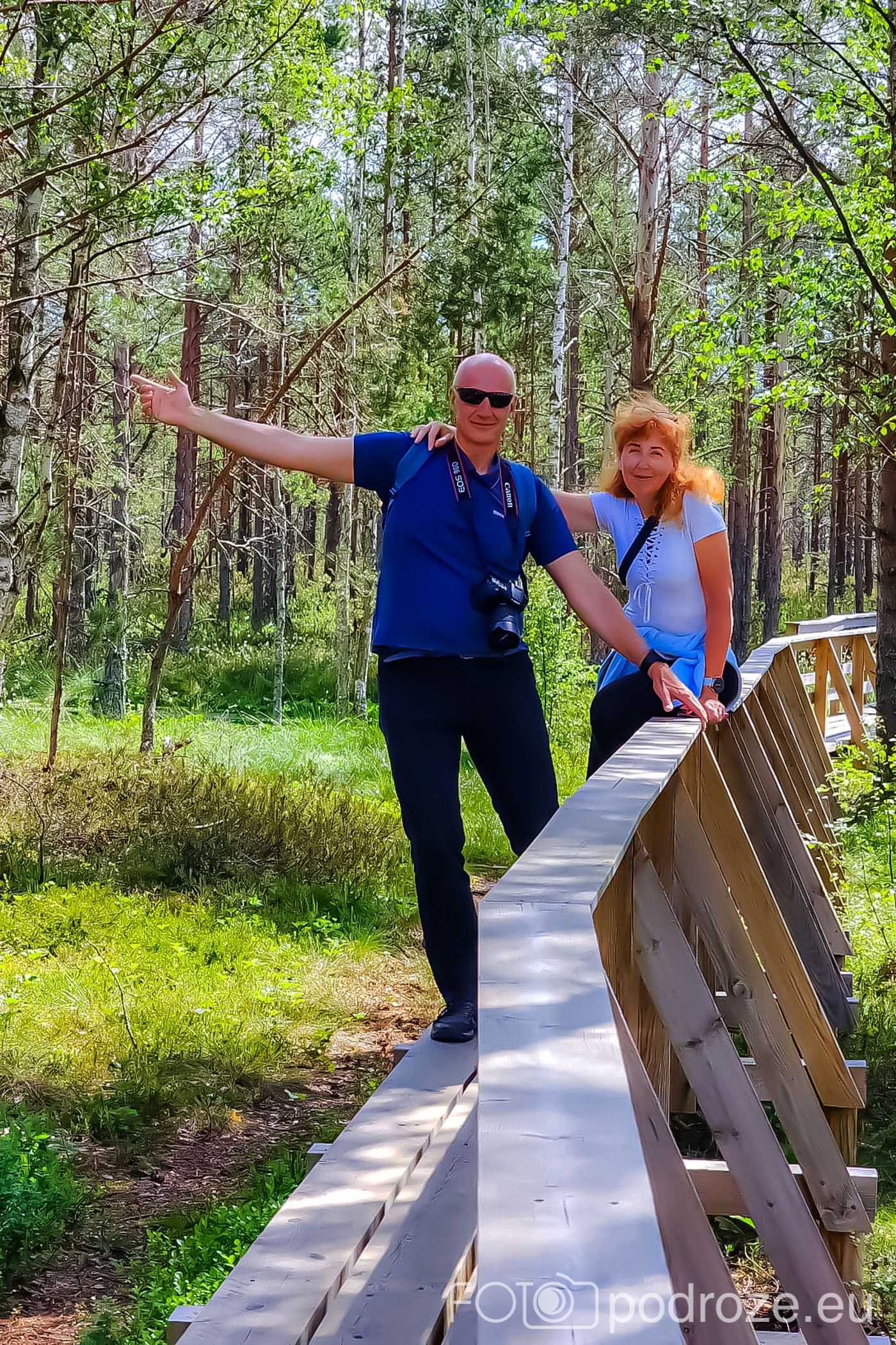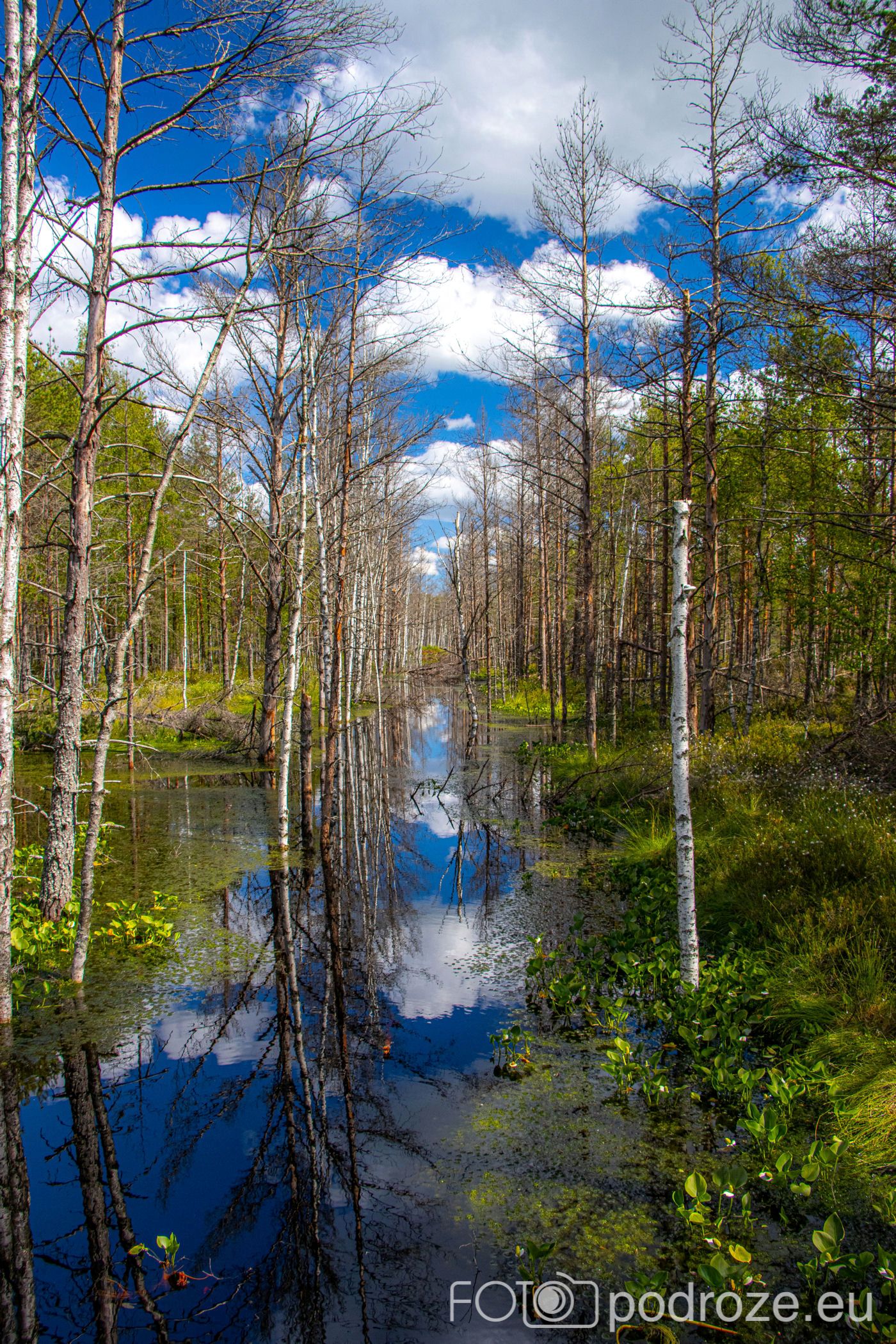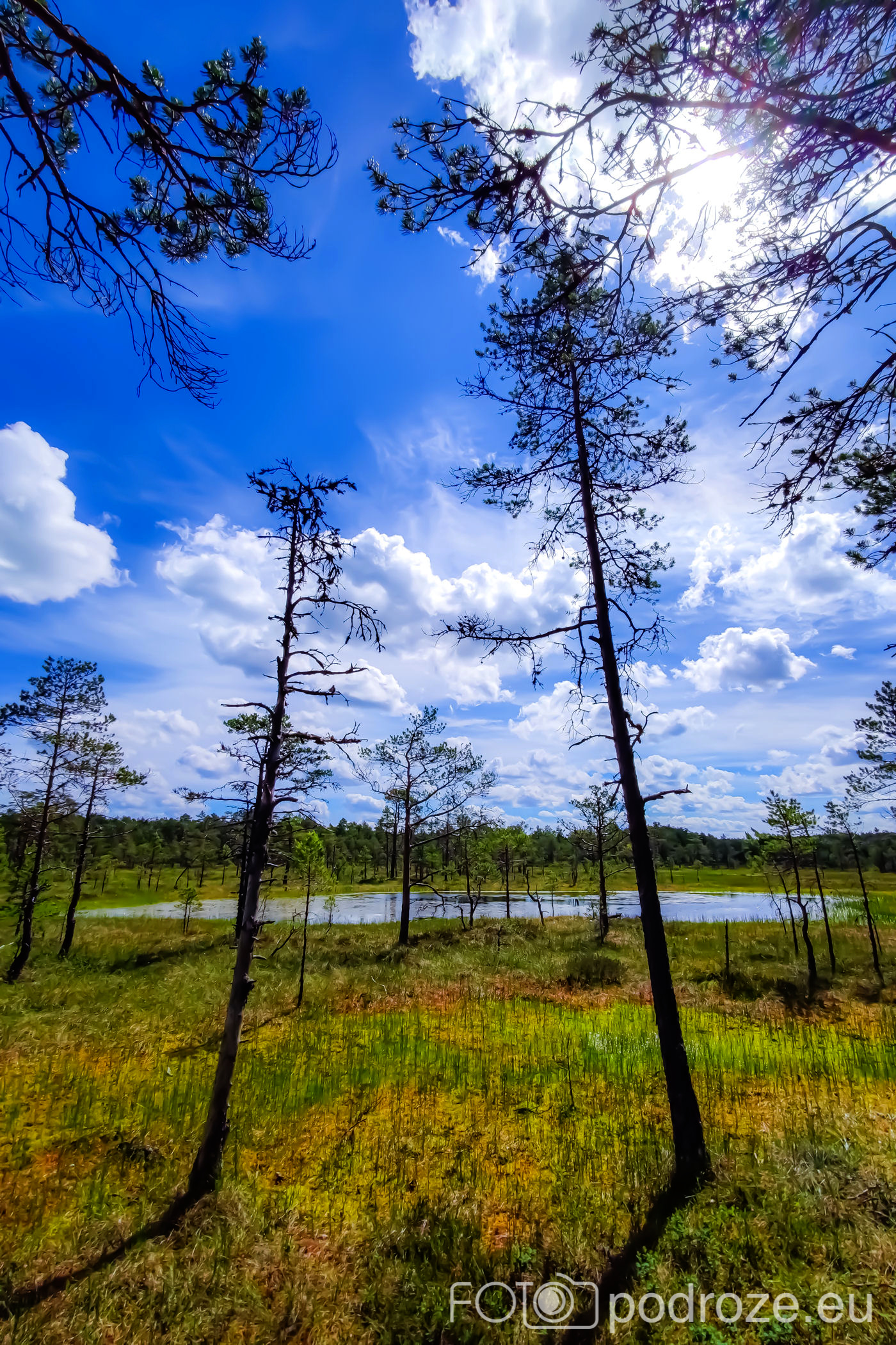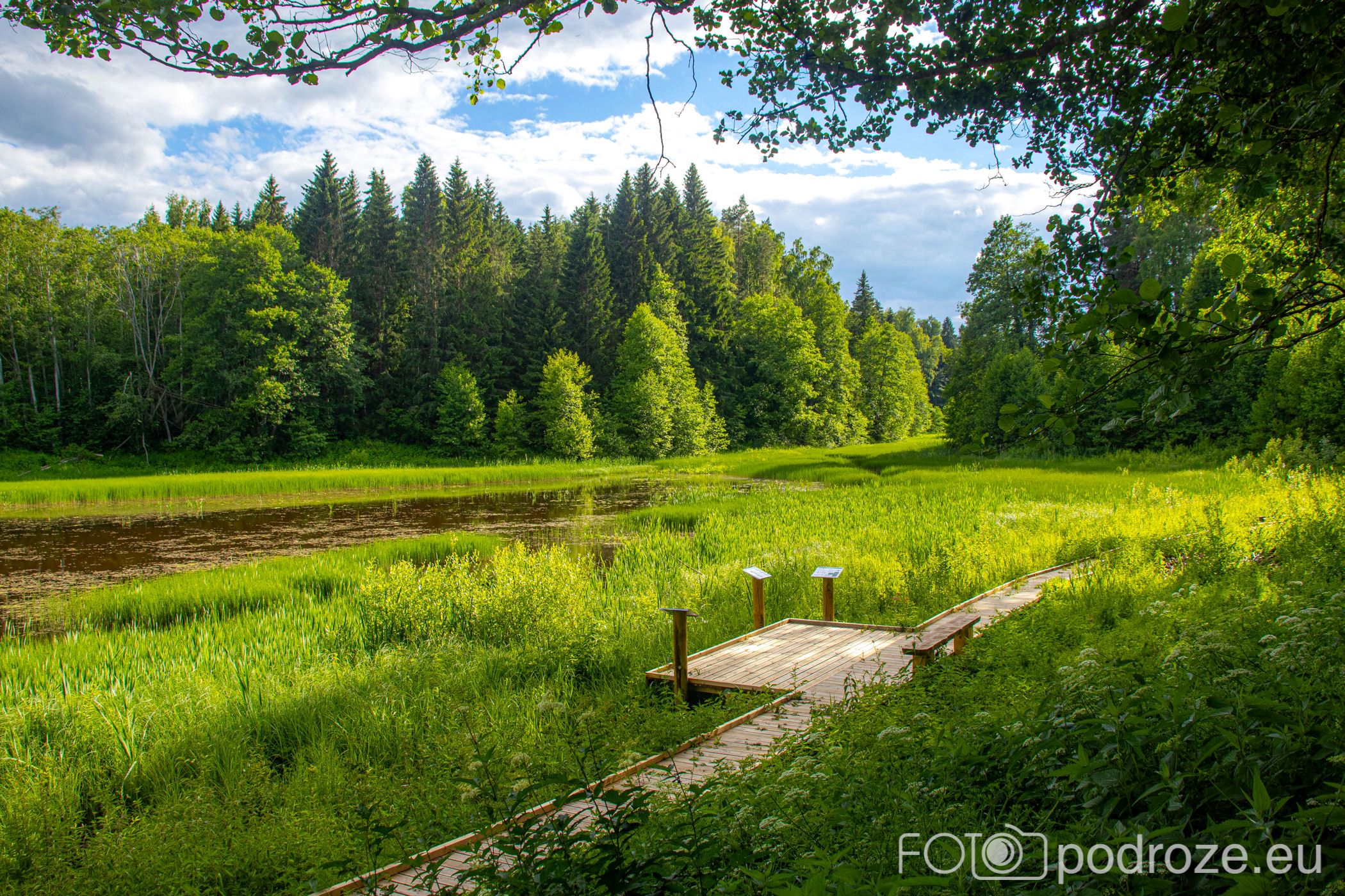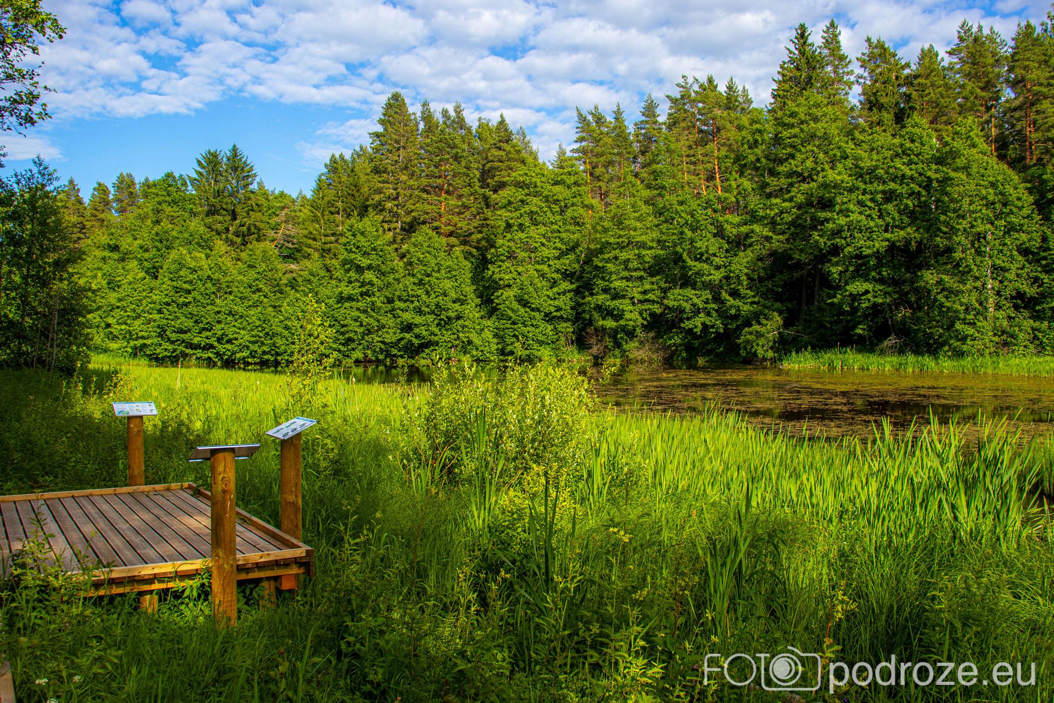Na końcu odbijamy w prawo i teraz już idziemy po drewnianych kładkach przez podmokłe tereny. Początkowo kładki są bardzo wąskie, takie dosłownie na jedną osobę i wyminięcie się wymaga nie lada gimnastyki. Z czasem pomosty stają się szersze, a i wody wokół nas jest coraz więcej. Mamy szczęście tego dnia do pogody, bo taka obłędna aura nie zdarza się często.
