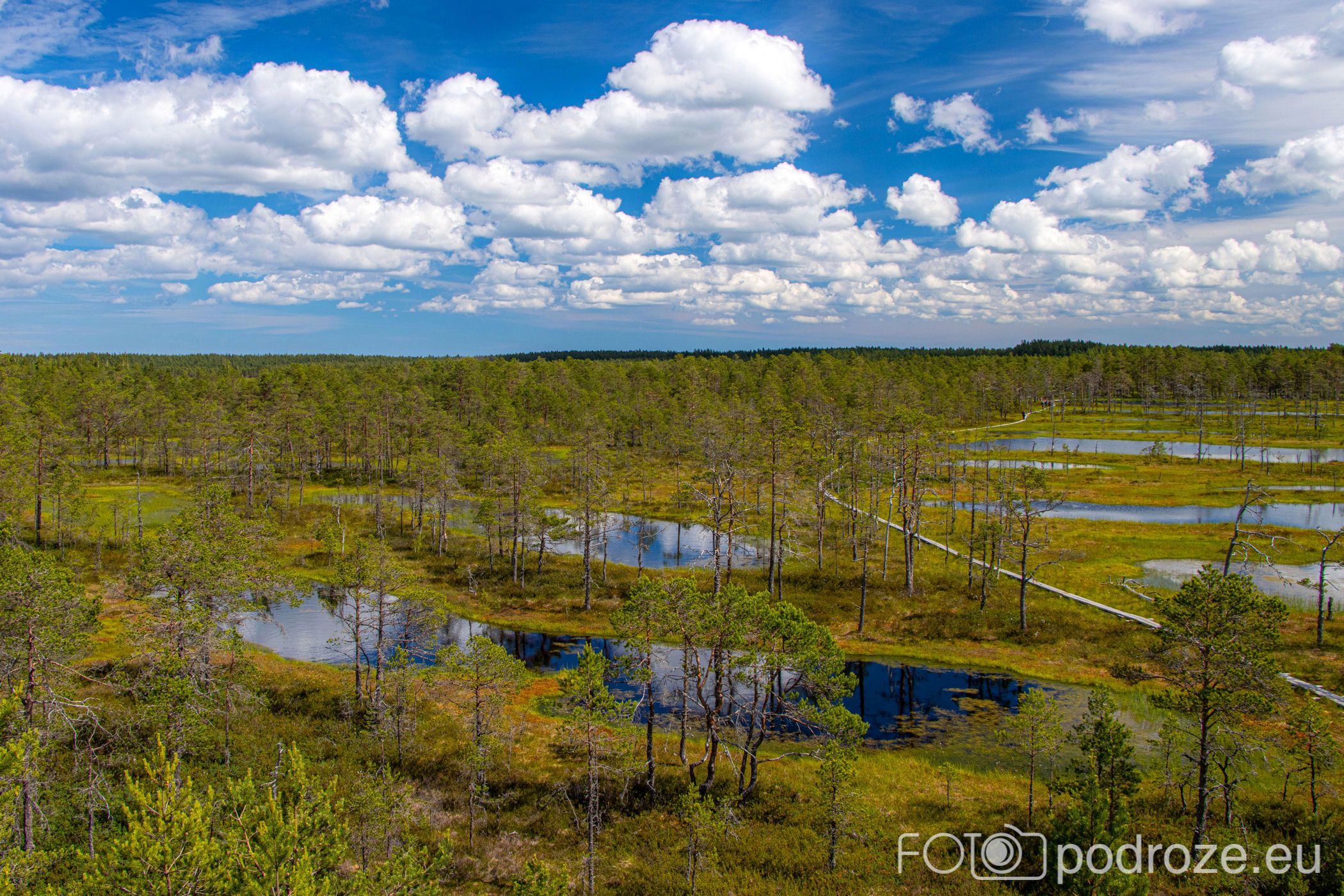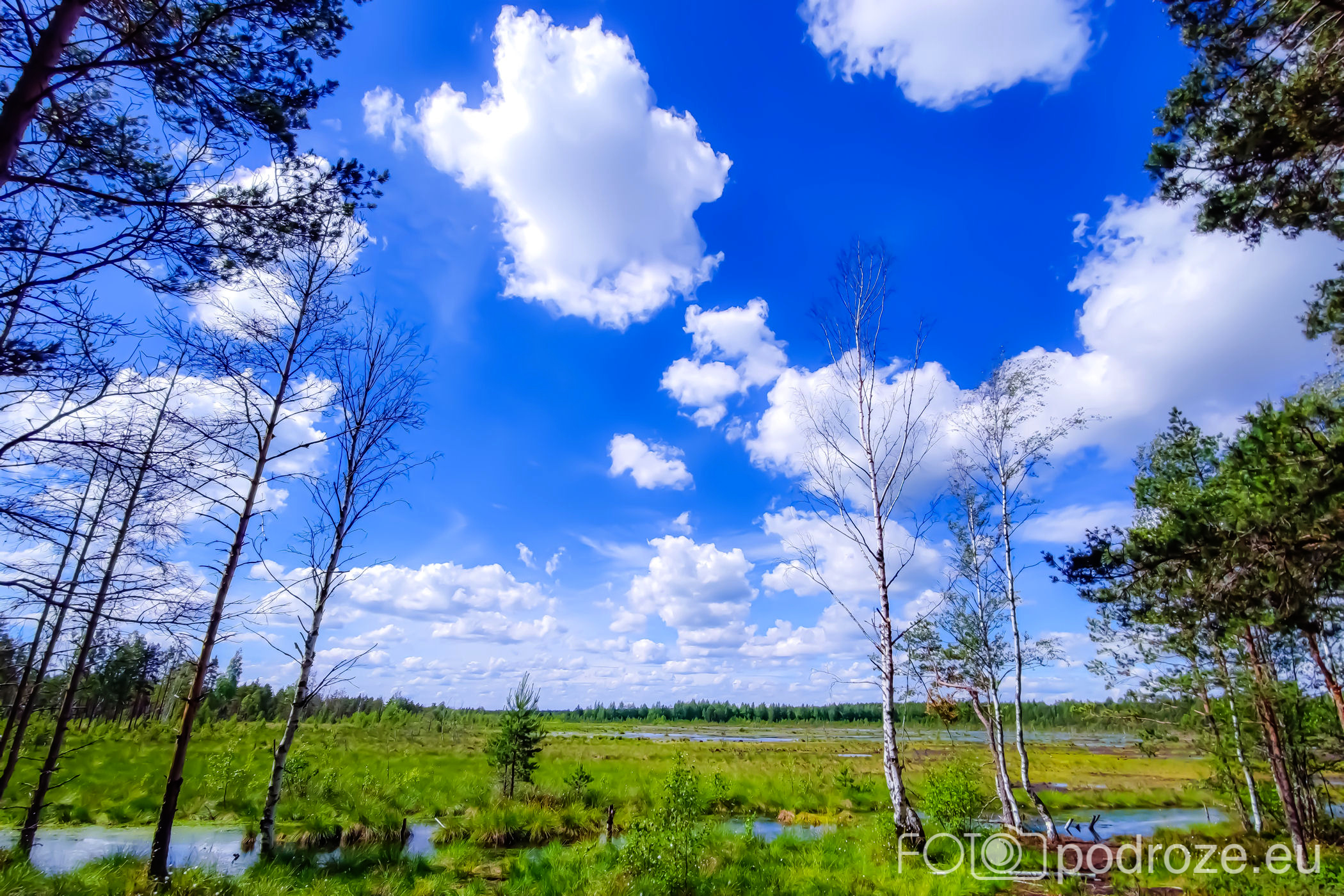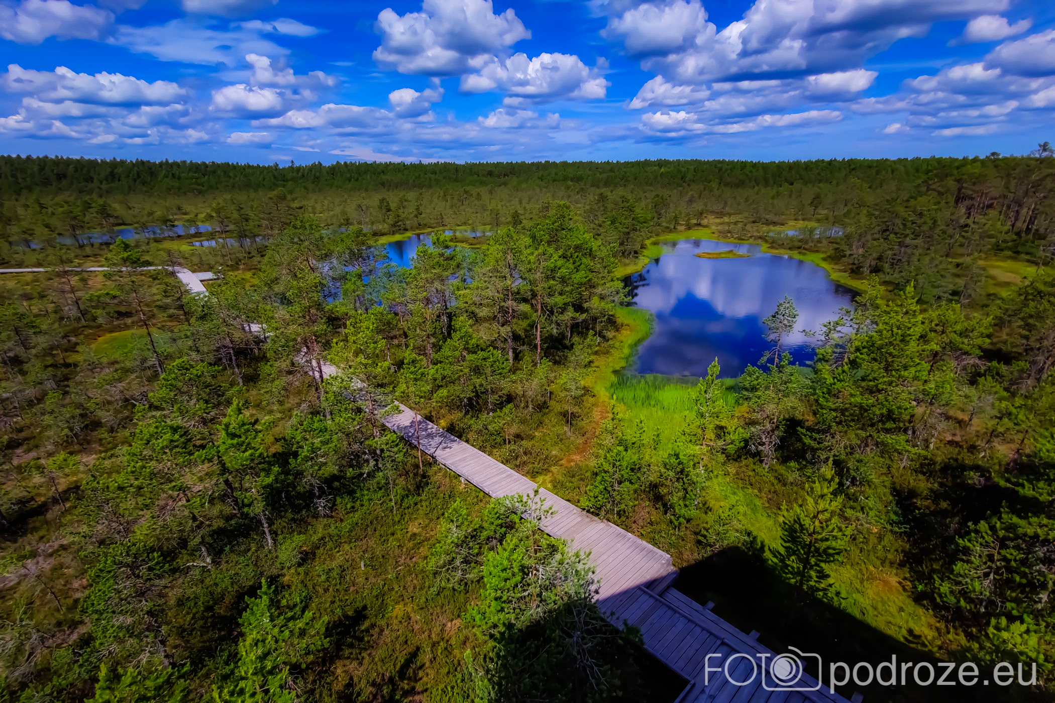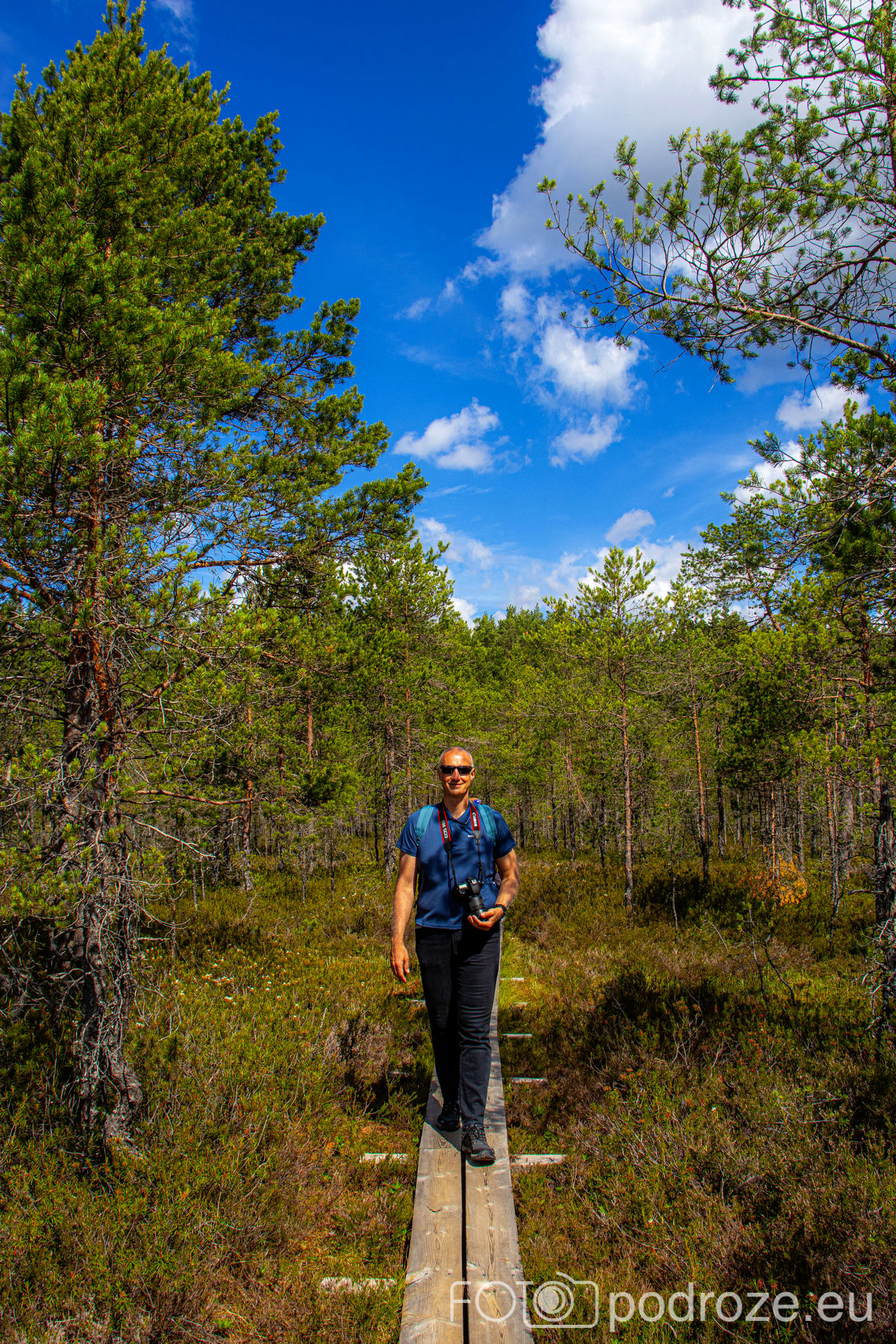 Na końcu odbijamy w prawo i teraz już idziemy po drewnianych kładkach przez podmokłe tereny. Początkowo kładki są bardzo wąskie, takie dosłownie na jedną osobę i wyminięcie się wymaga nie lada gimnastyki. Z czasem pomosty stają się szersze, a i wody wokół nas jest coraz więcej. Mamy szczęście tego dnia do pogody, bo taka obłędna aura nie zdarza się często.
