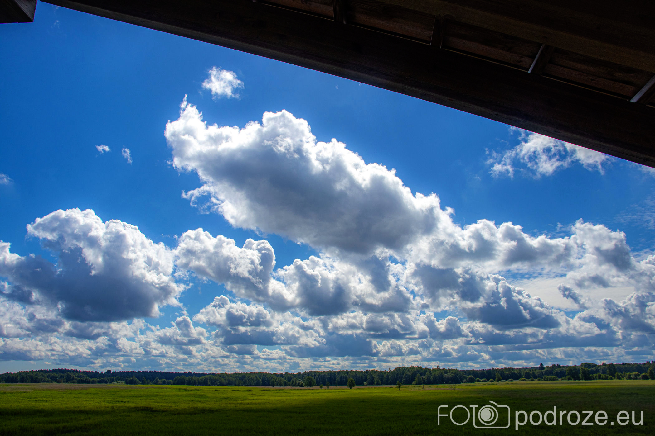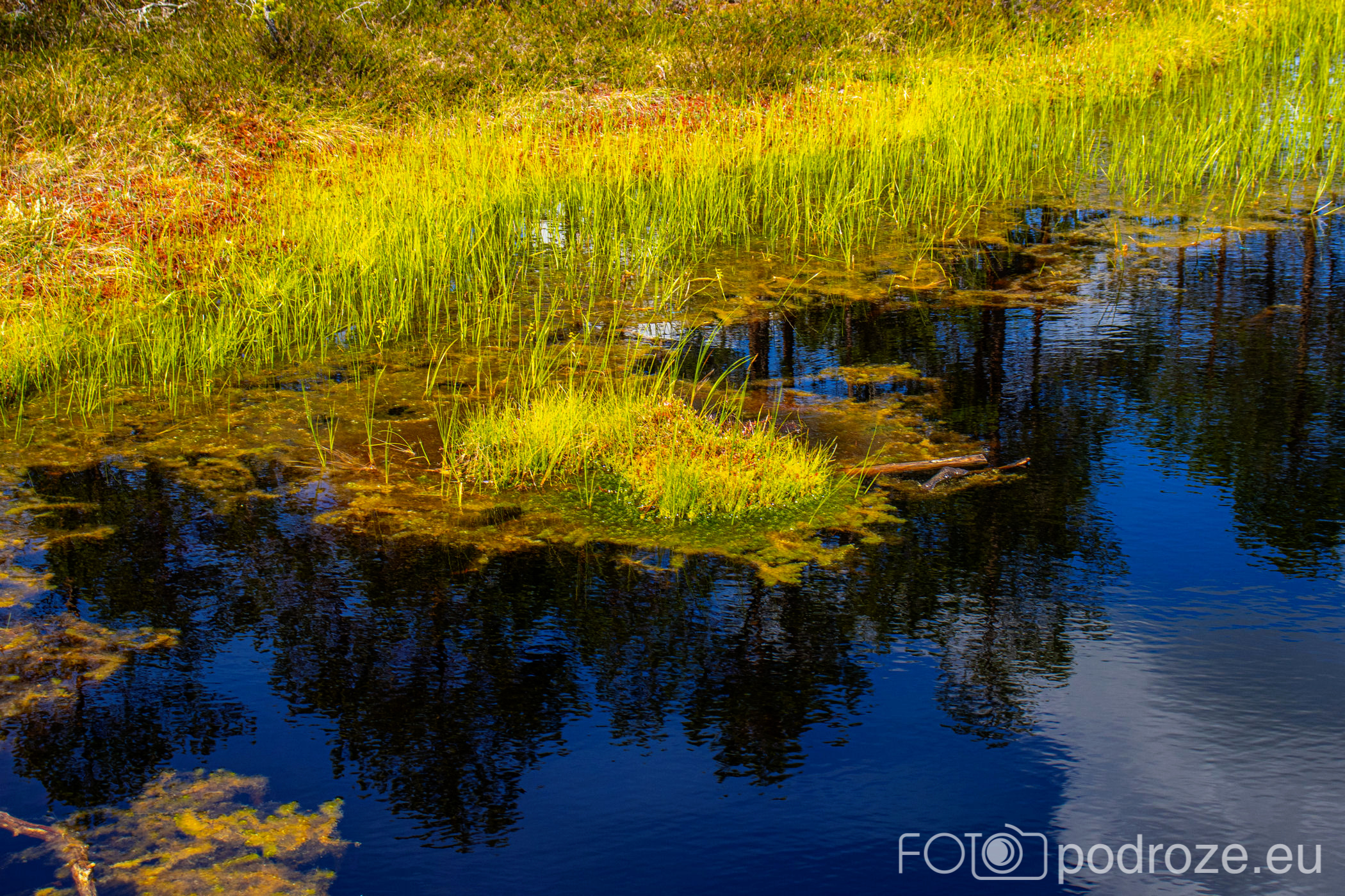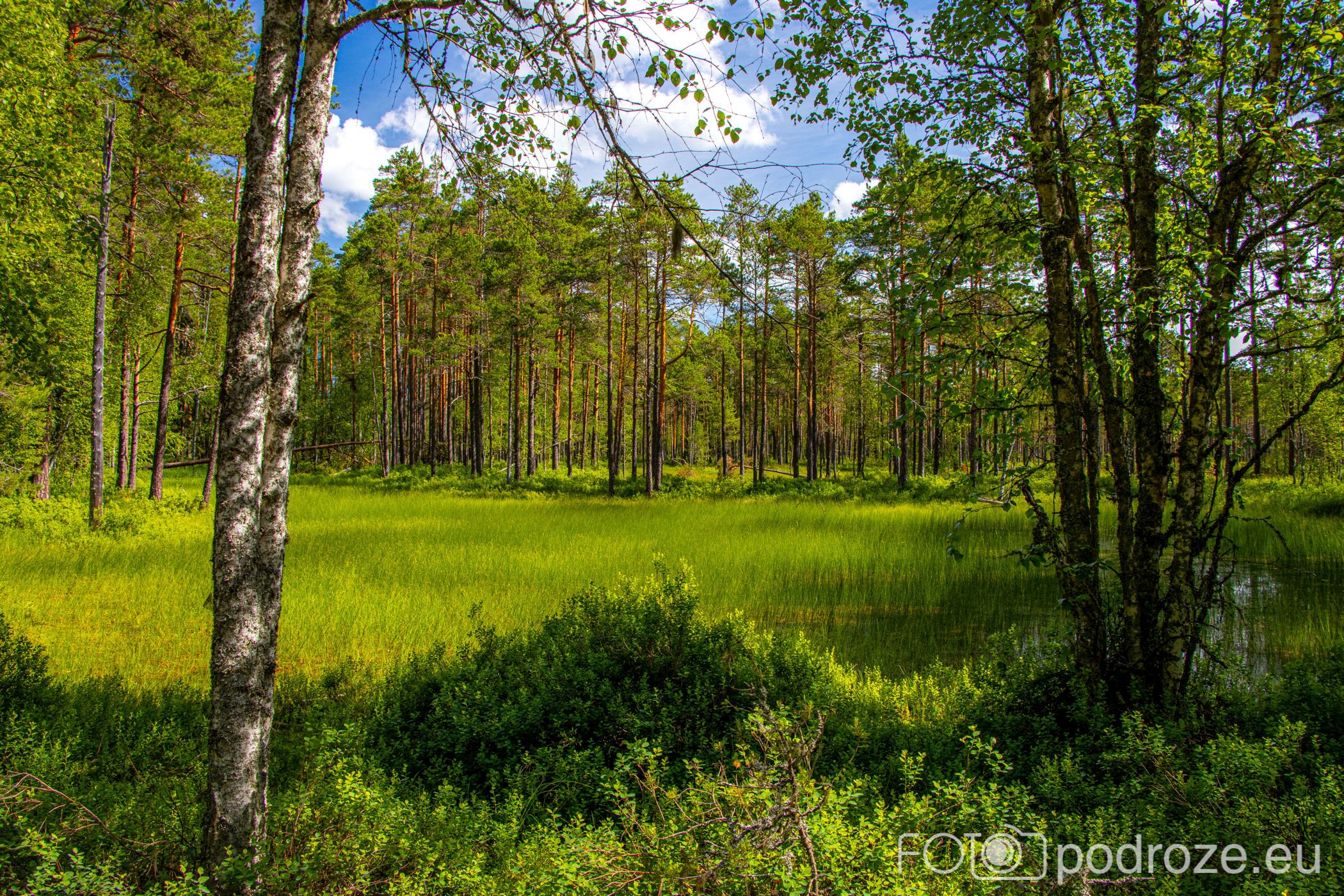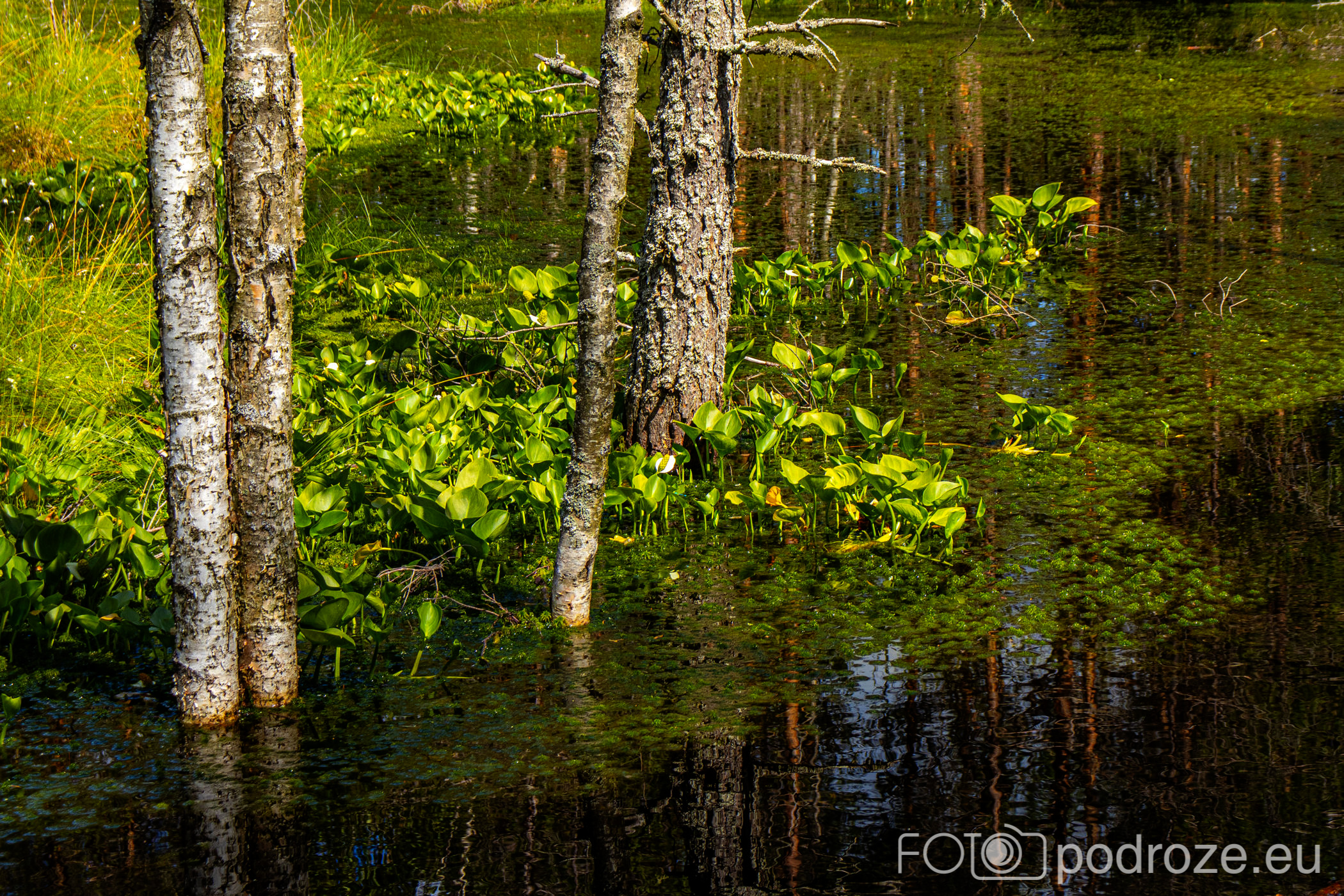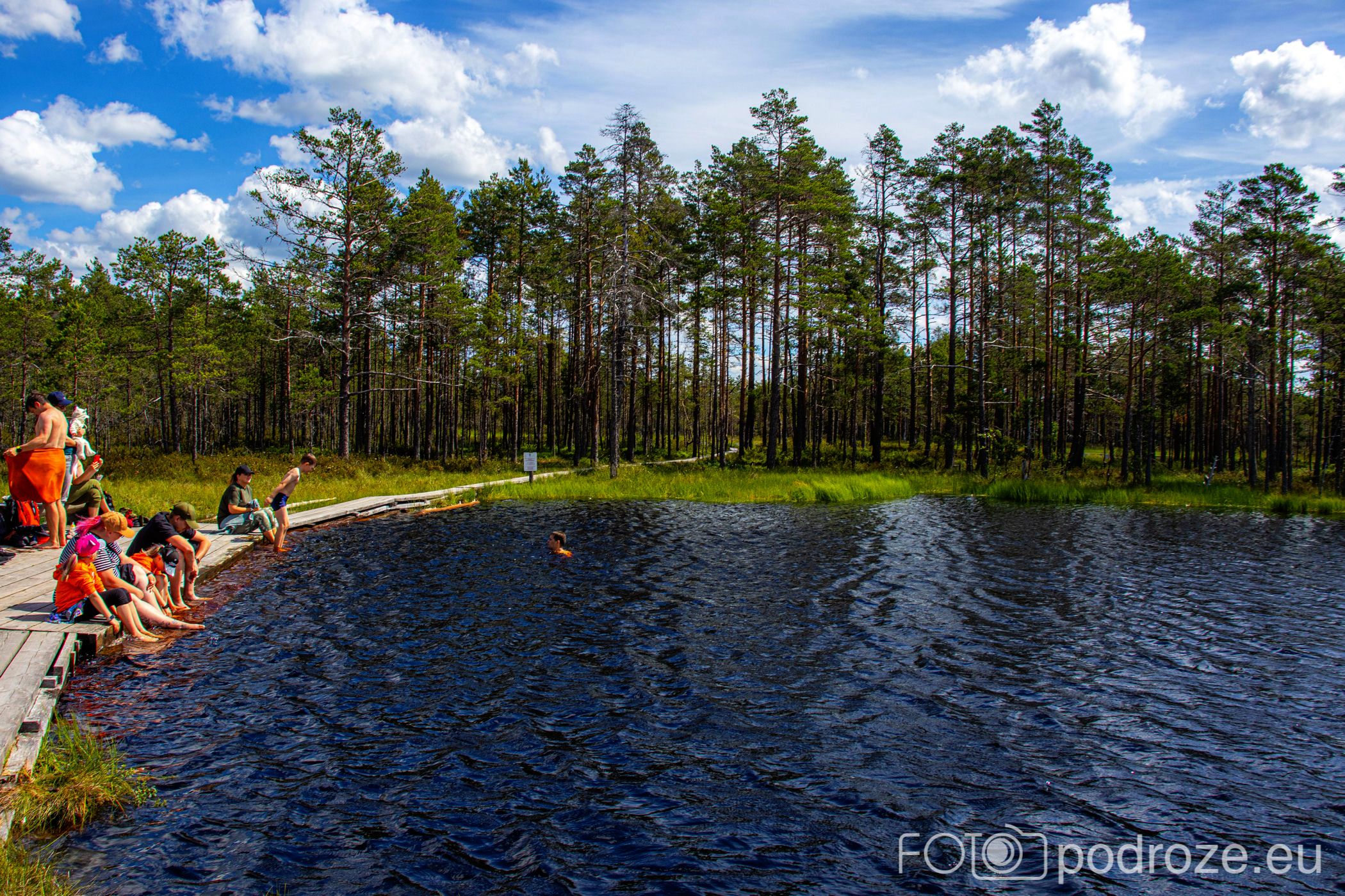 Na końcu odbijamy w prawo i teraz już idziemy po drewnianych kładkach przez podmokłe tereny. Początkowo kładki są bardzo wąskie, takie dosłownie na jedną osobę i wyminięcie się wymaga nie lada gimnastyki. Z czasem pomosty stają się szersze, a i wody wokół nas jest coraz więcej. Mamy szczęście tego dnia do pogody, bo taka obłędna aura nie zdarza się często.