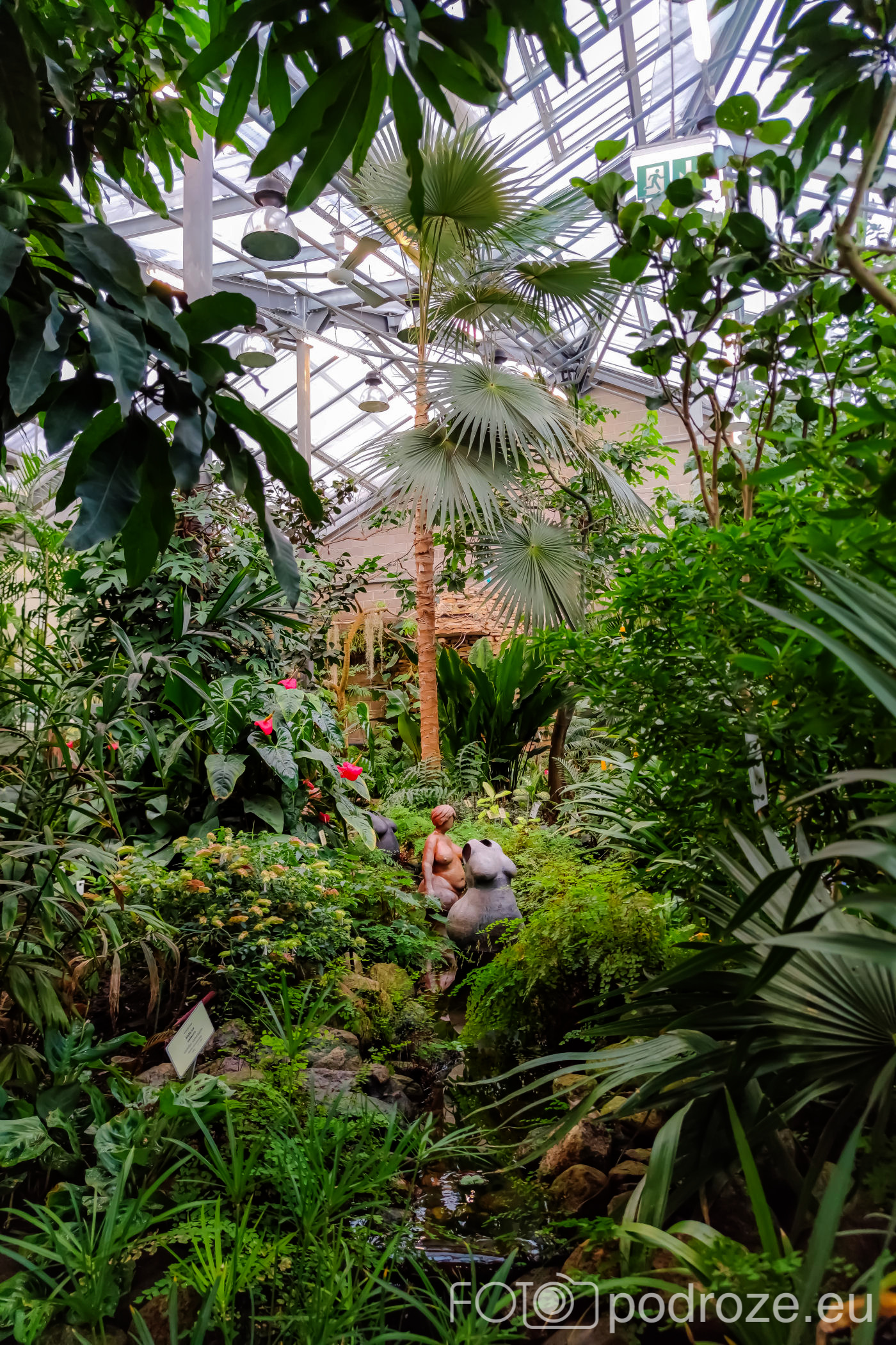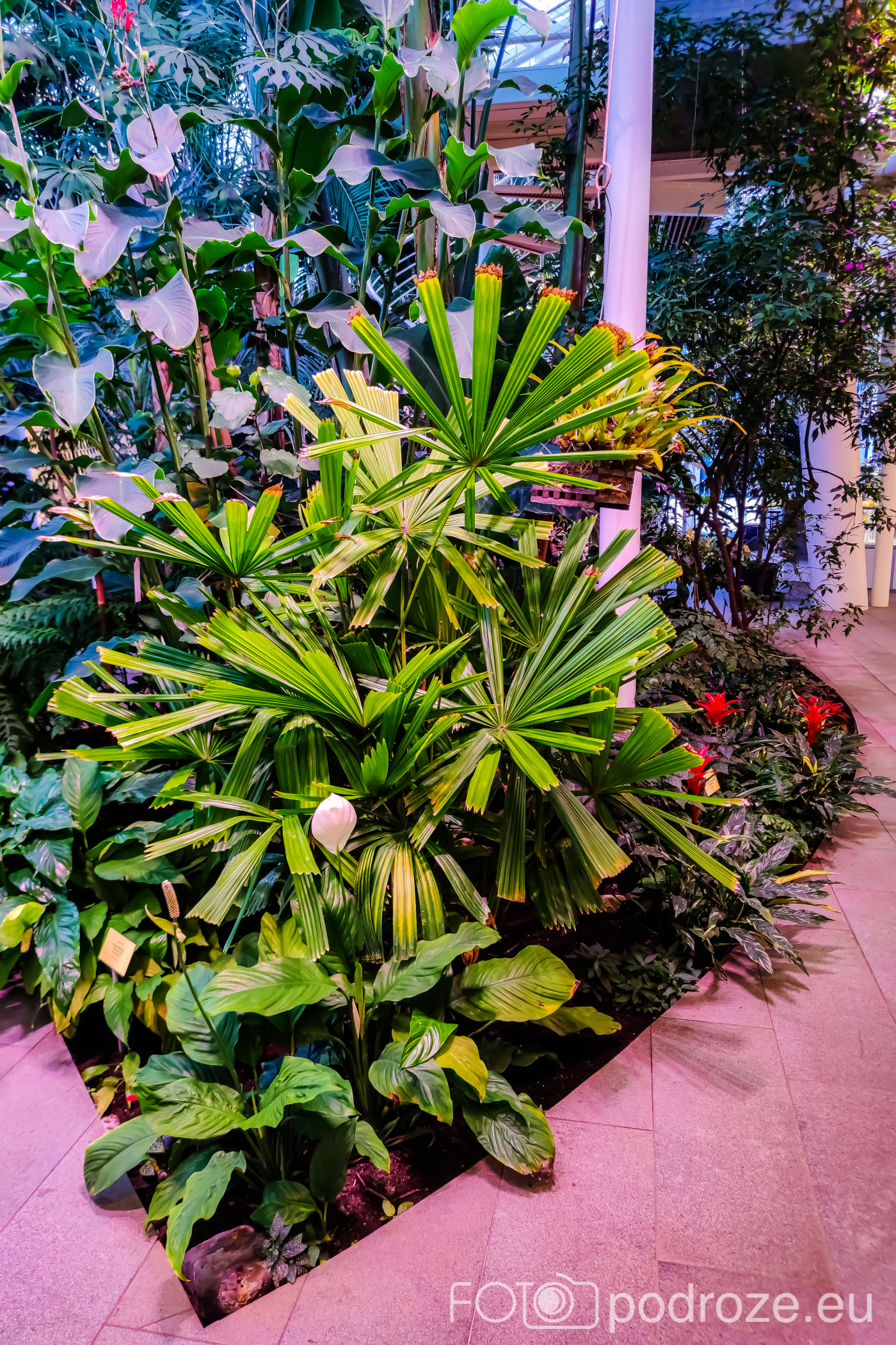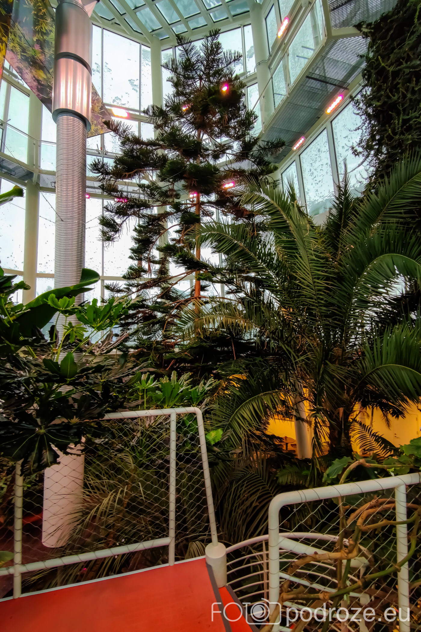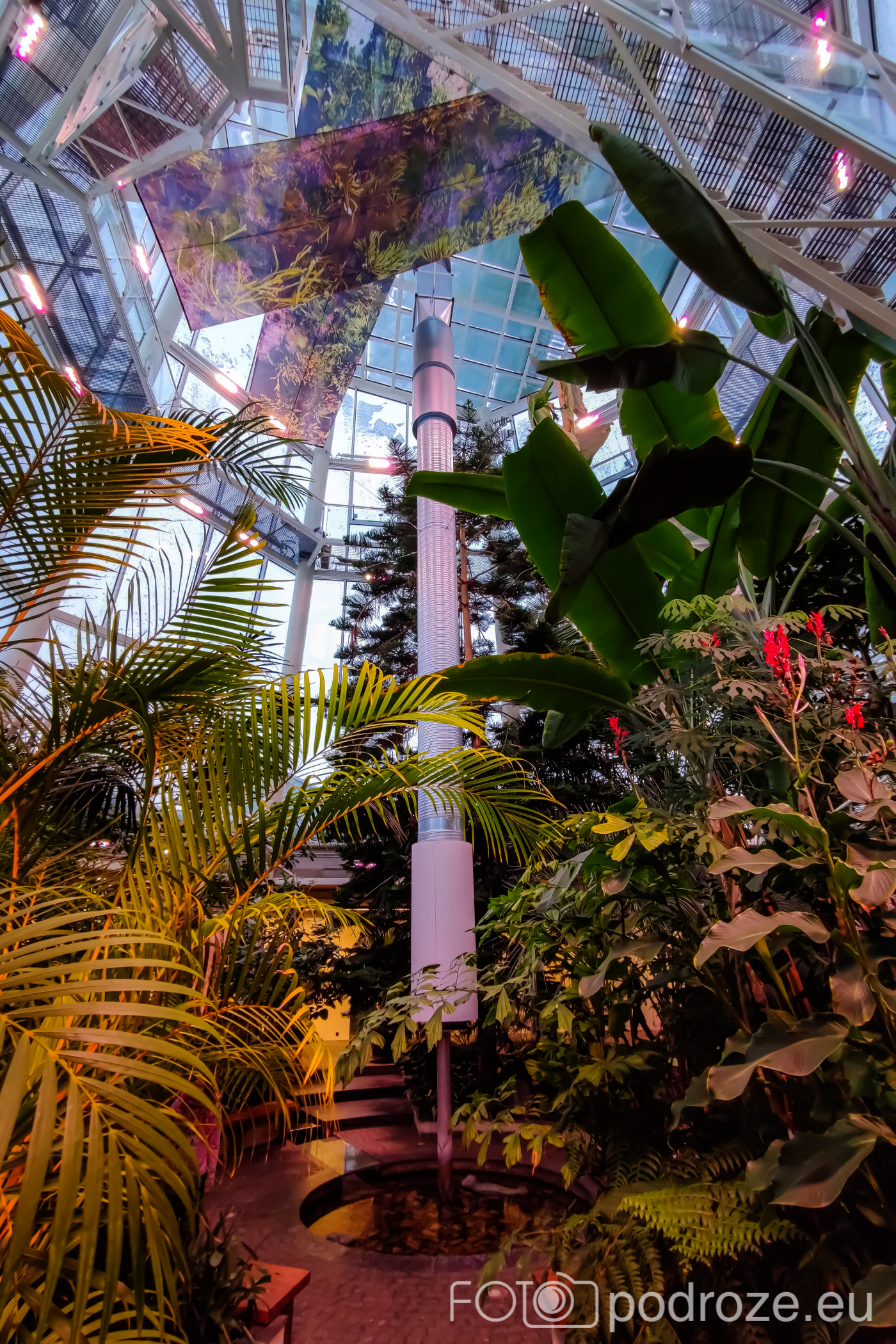 Wnętrza składają się z kilku różnych części. Zaczynamy od części środkowej, najwyższej gdzie znajduje się szatnia, kafeja i oczywiście pierwsze rośliny. Są tu też schodki z małą antresolą i widokiem na palmy od góry. Są też wejścia do kilku osobnych pomieszczeń w których na bieżąco odbywają się różne warsztaty.