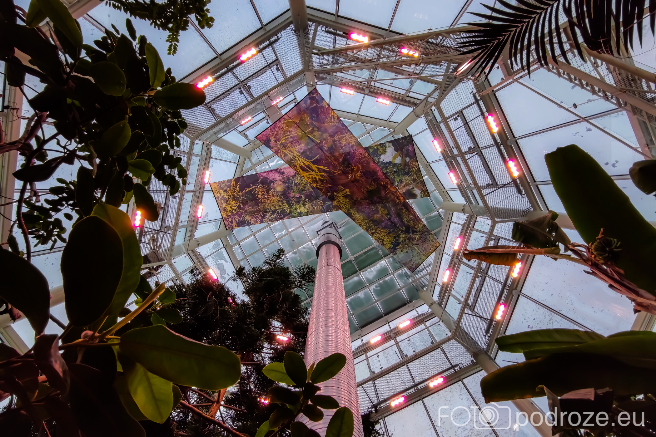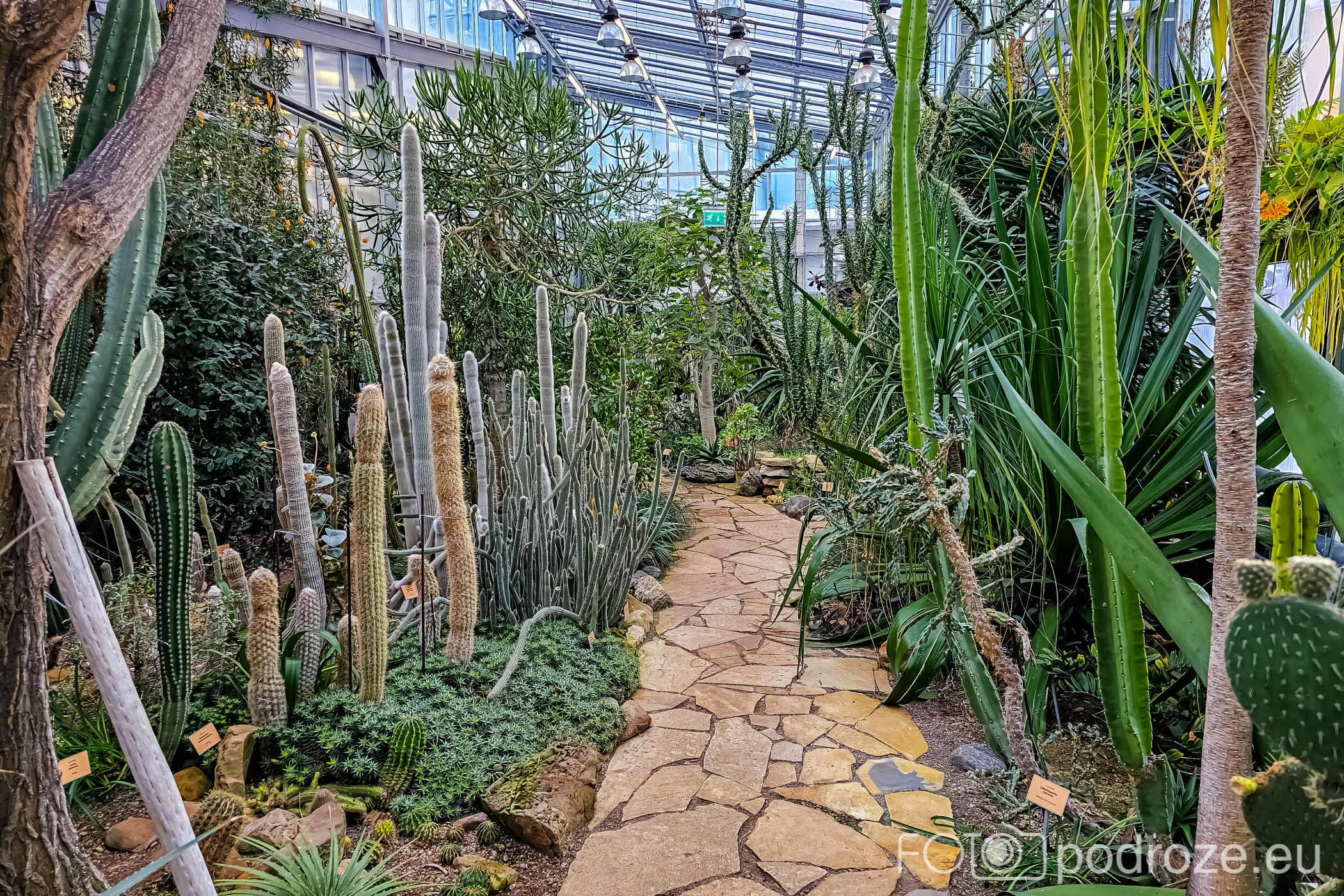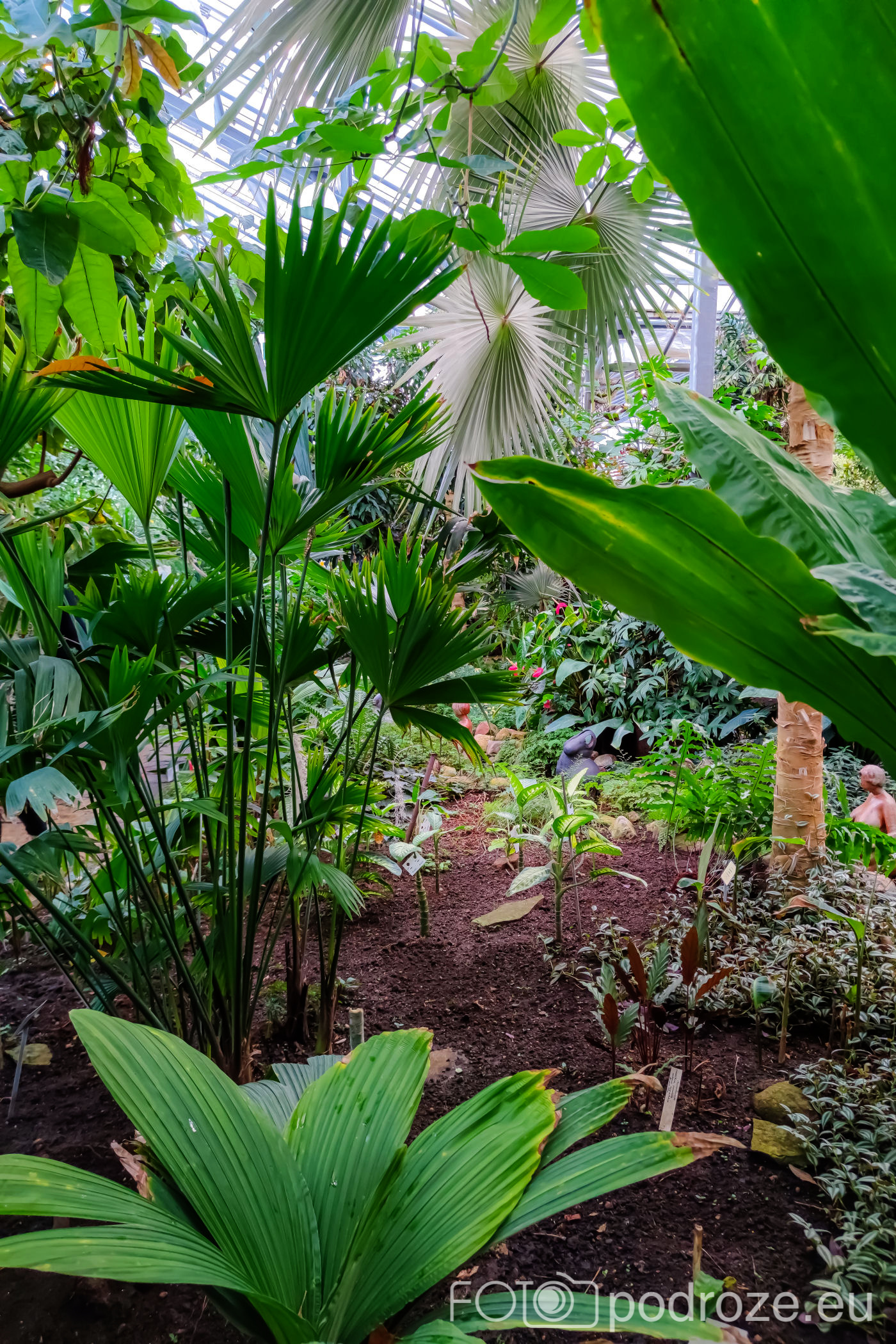 Wnętrza składają się z kilku różnych części. Zaczynamy od części środkowej, najwyższej gdzie znajduje się szatnia, kafeja i oczywiście pierwsze rośliny. Są tu też schodki z małą antresolą i widokiem na palmy od góry. Są też wejścia do kilku osobnych pomieszczeń w których na bieżąco odbywają się różne warsztaty.