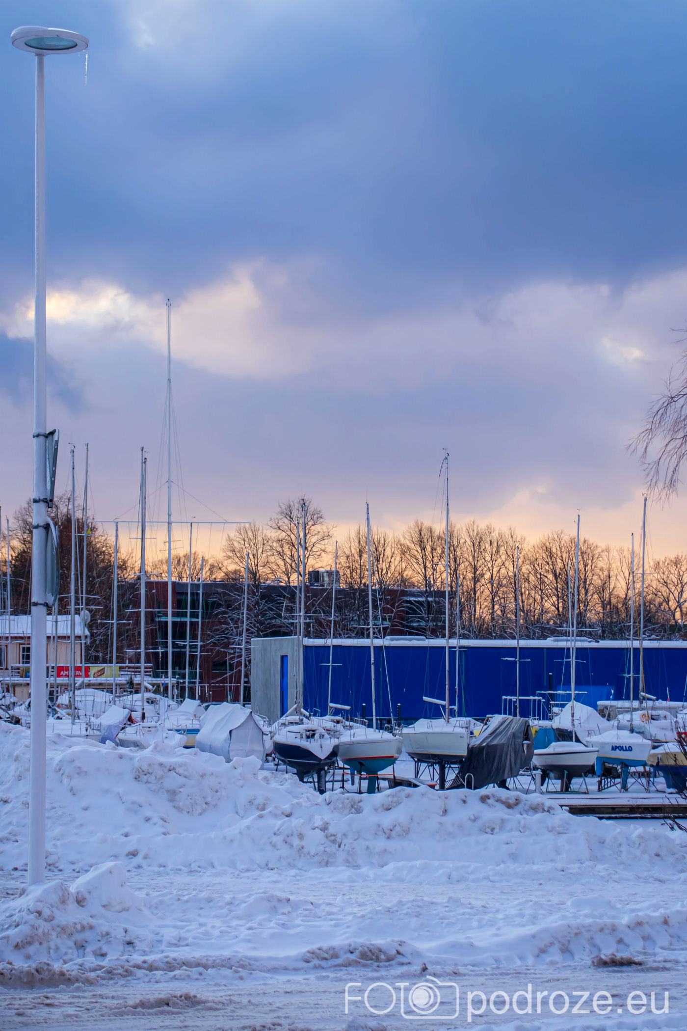Zimą port skuty jest lodem, a łódki stoją na nabrzeżu.