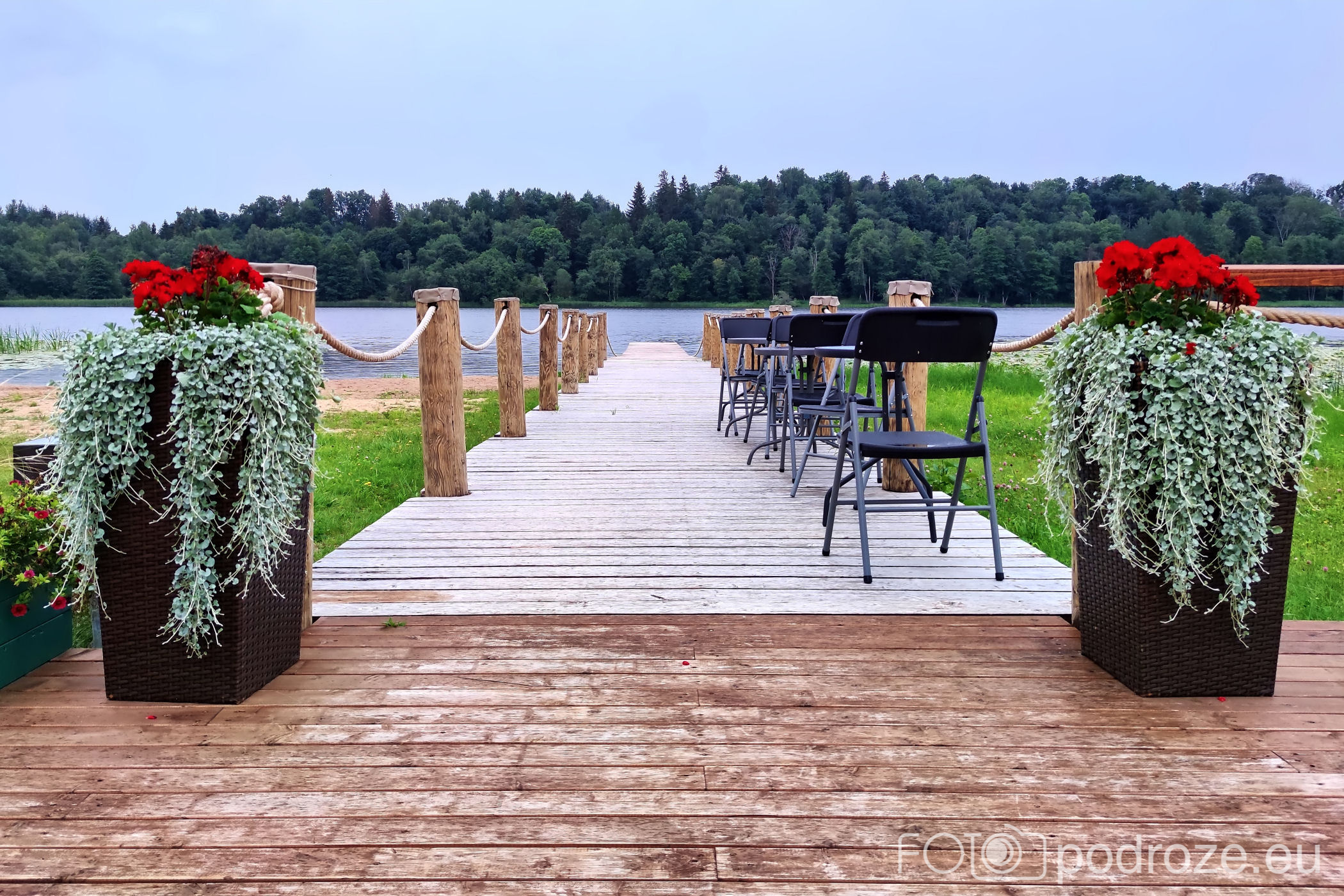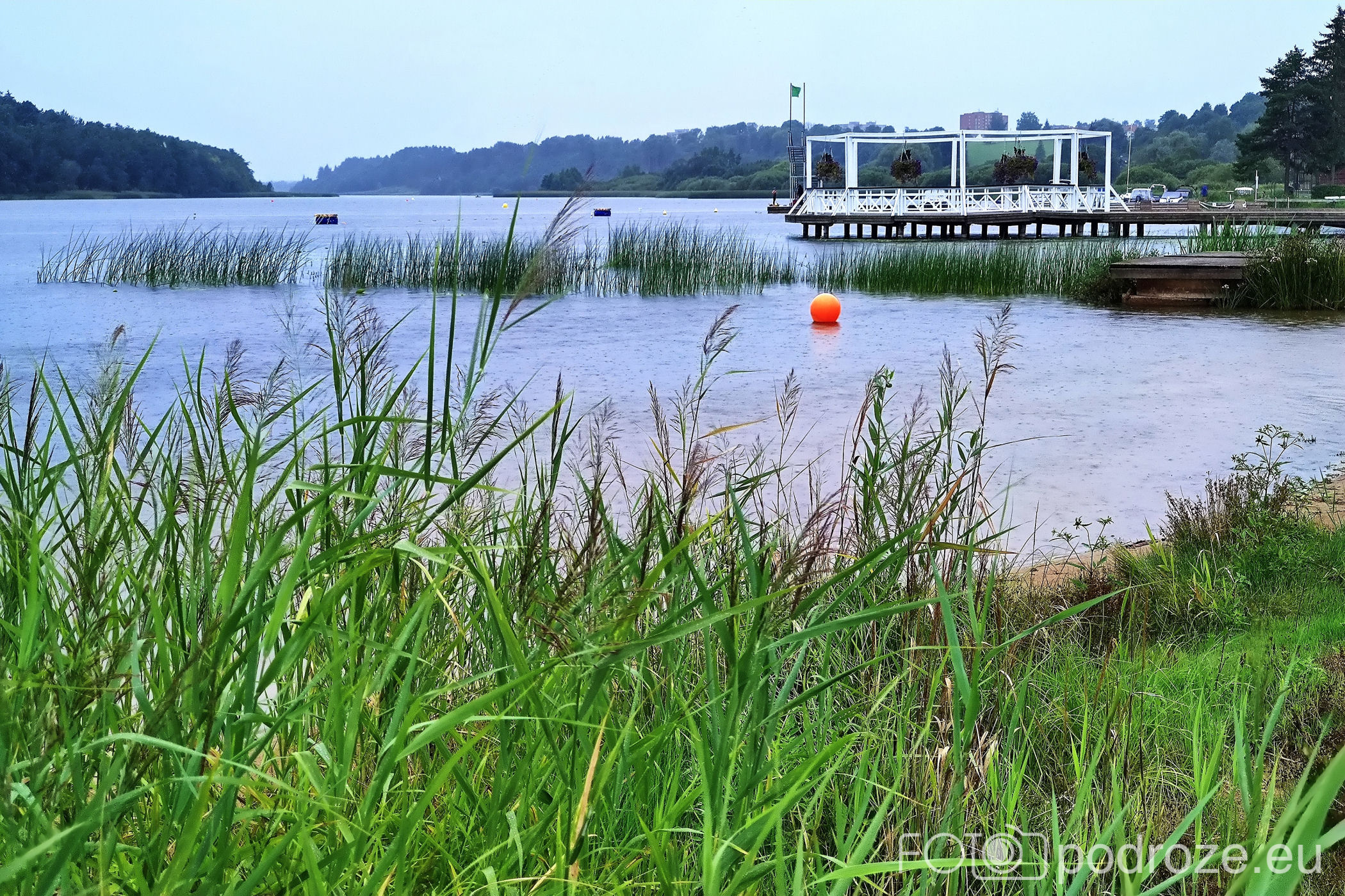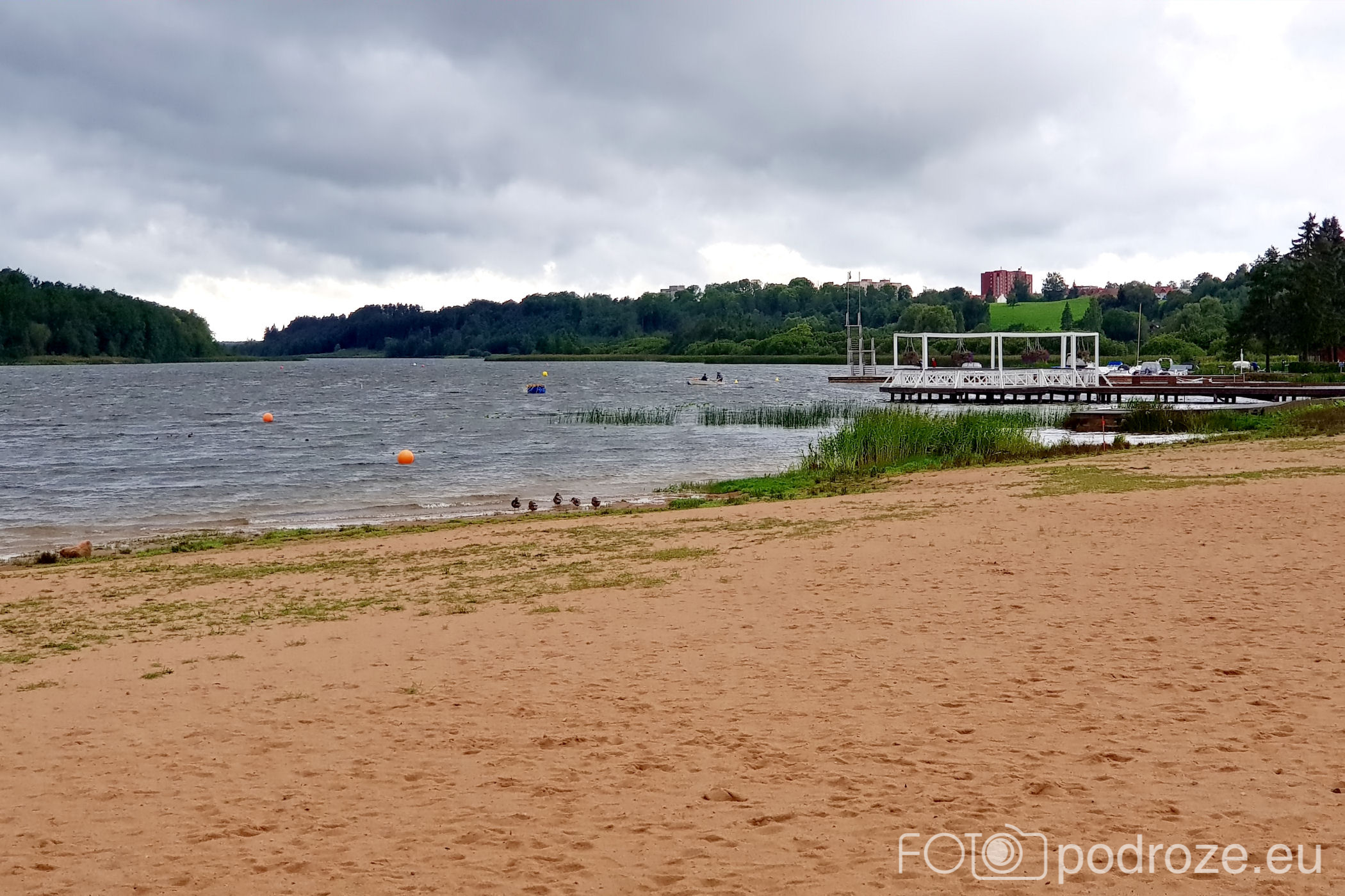 Nad jezioro wędruję dwukrotnie, najpierw sama, potem z mężem i nie niestety za każdym razem trafiam na deszcz i paskudną aurę. Miejsce, które zapewne w ciepłe, słoneczne dni tętni życie, jest teraz kompletnie opustoszałe. Plaże, urokliwa knajpka ze stolikami na pomoście, boiska, wypożyczalnie sprzętu wodnego i zero ludzi.