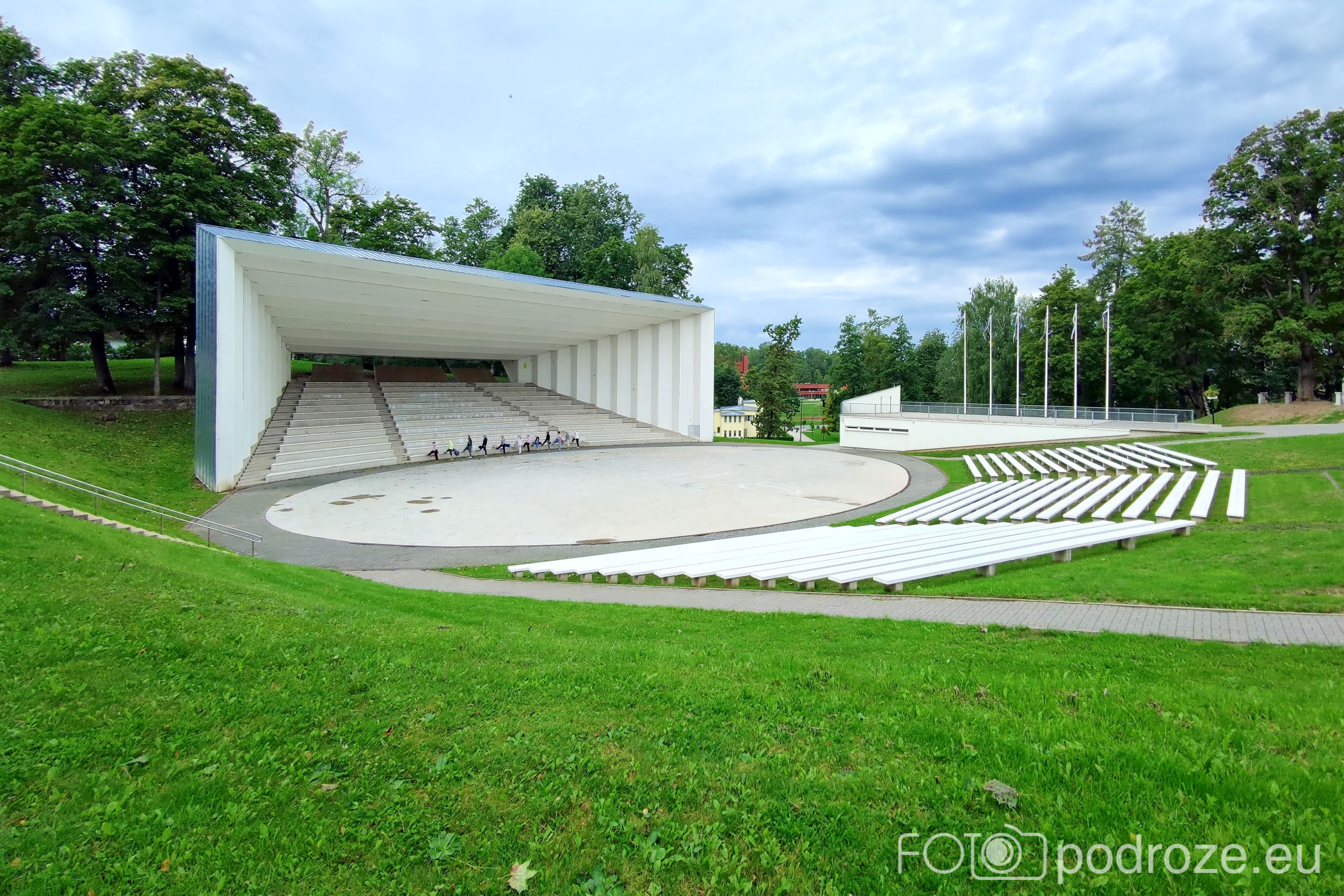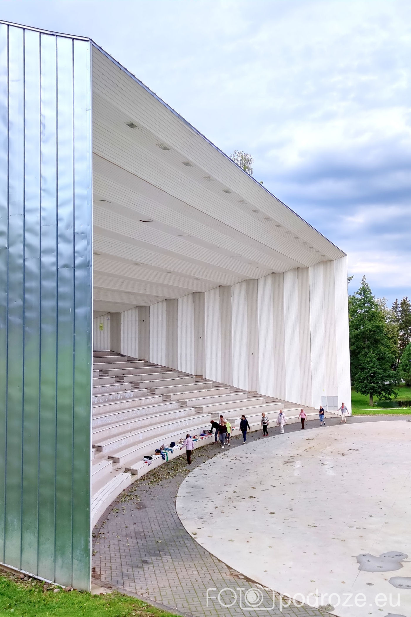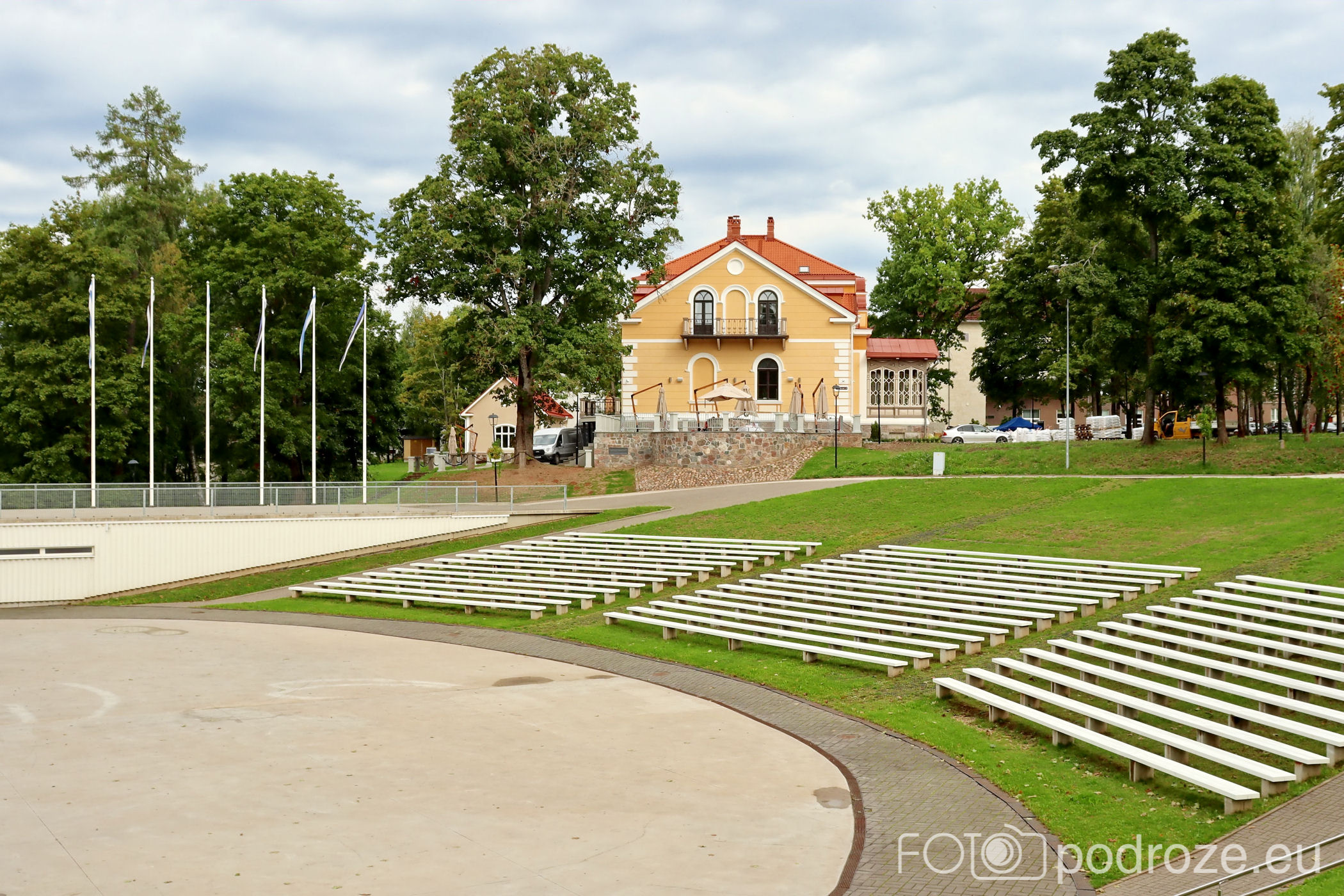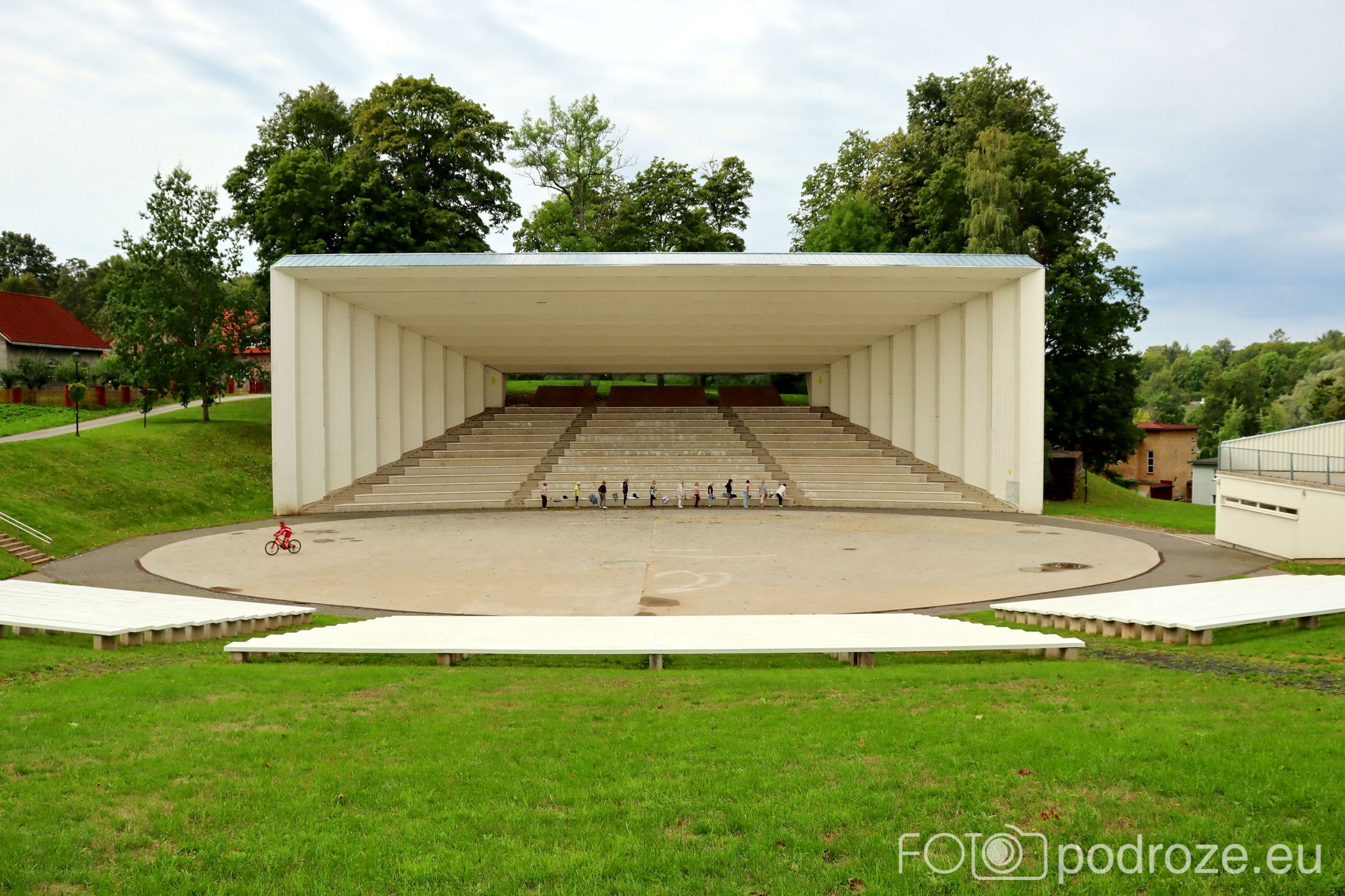 Tuż obok tego pięknego obiektu znajduje się już współcześnie postawiony amfiteatr. Jest imponujących rozmiarów, a ja właśnie trafiam na gimnastykę seniorów. Tuż za amfiteatrem mieszą się piękne budynki z apartamentami do wynajęcia.