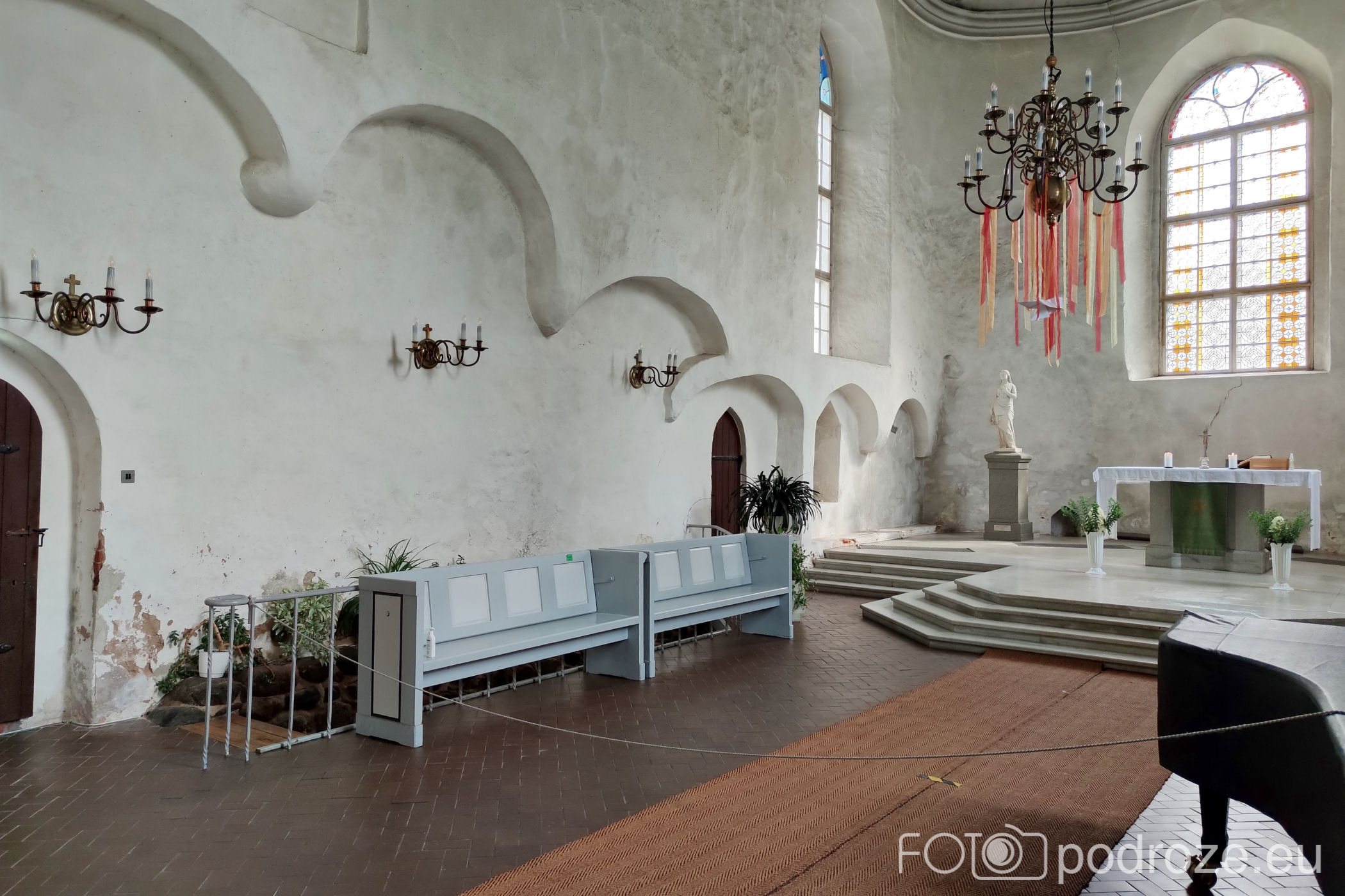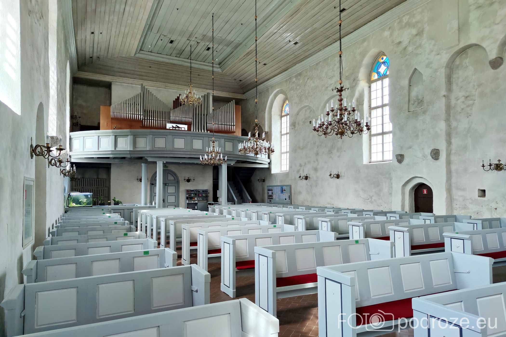 Zanim zapuszczę się w urokliwe uliczki centrum miasta obowiązkowo odwiedzam górujący w tej części miasta kościółek. Pierwotnie w tym miejscu znajdował się klasztor franciszkanów. W XVII wieku na jego ruinach wybudowano nowy kościół. Świątynia był wielokrotnie burzona, dewastowana i odbudowywana. W II połowie XX wieku Sowieci umieścili w jego wnętrzu magazyn. Do właściwej funkcji świątyni i sali koncertowej budynek wrócił dopiero w latach 90-tych. Wnętrze jest niesamowite, bo choć odbudowane współcześnie – wygląda na bardzo stare. W tylnej części kościoła zwraca moją uwagę znajdujący się tu kącik zabawy dla dzieci i akwarium z rybami. Nigdy wcześniej się w tym nie spotkałam.
