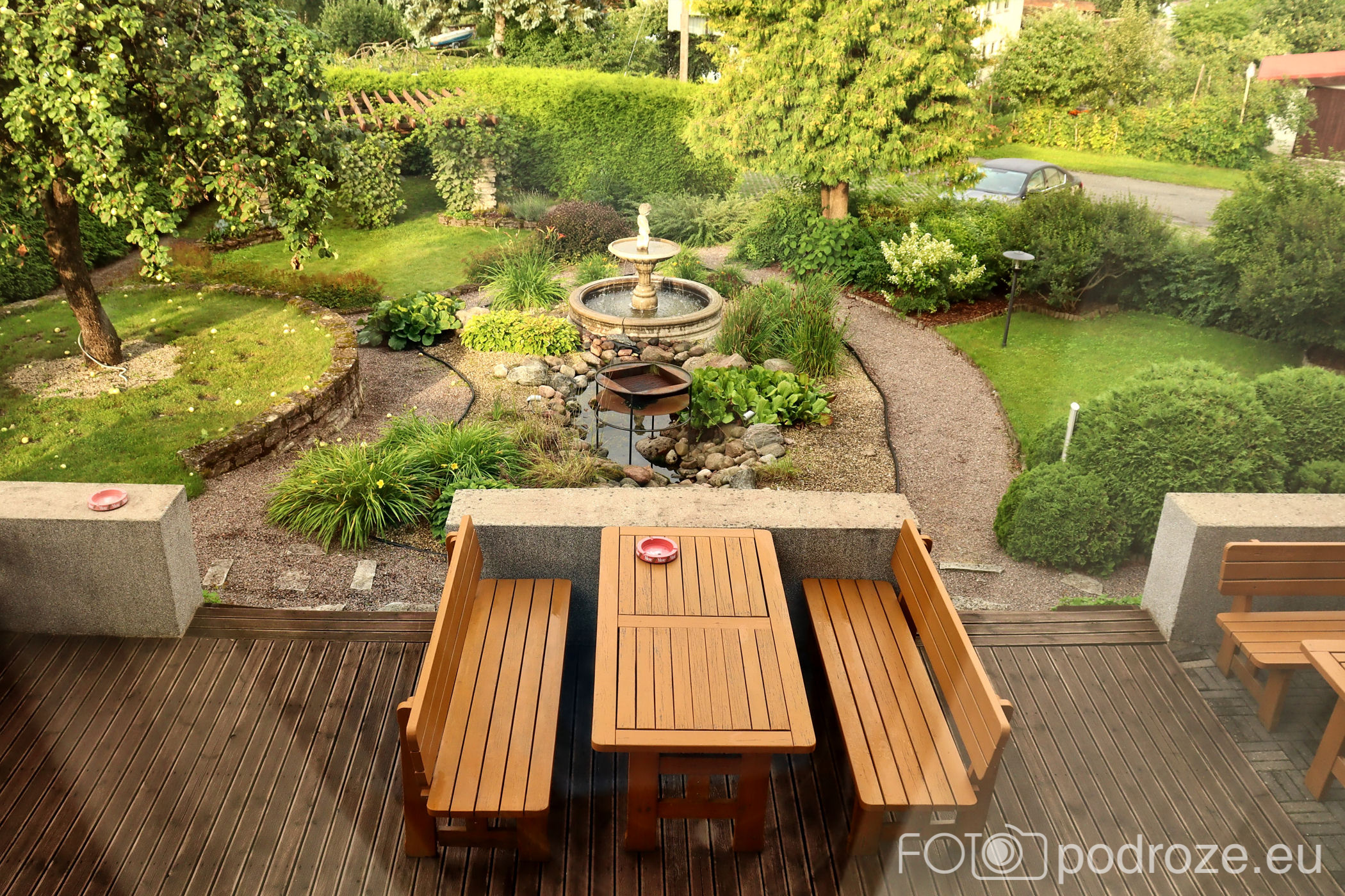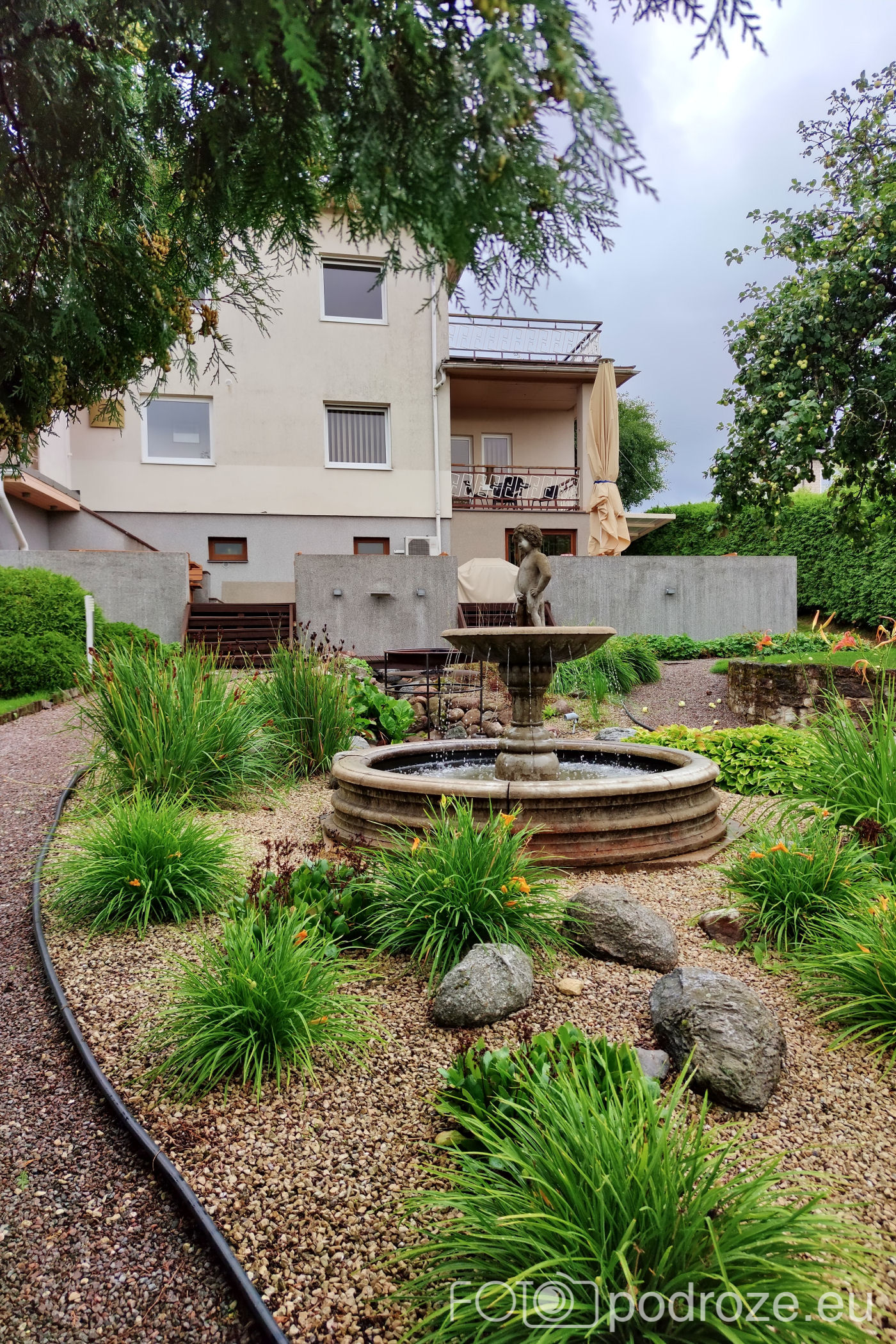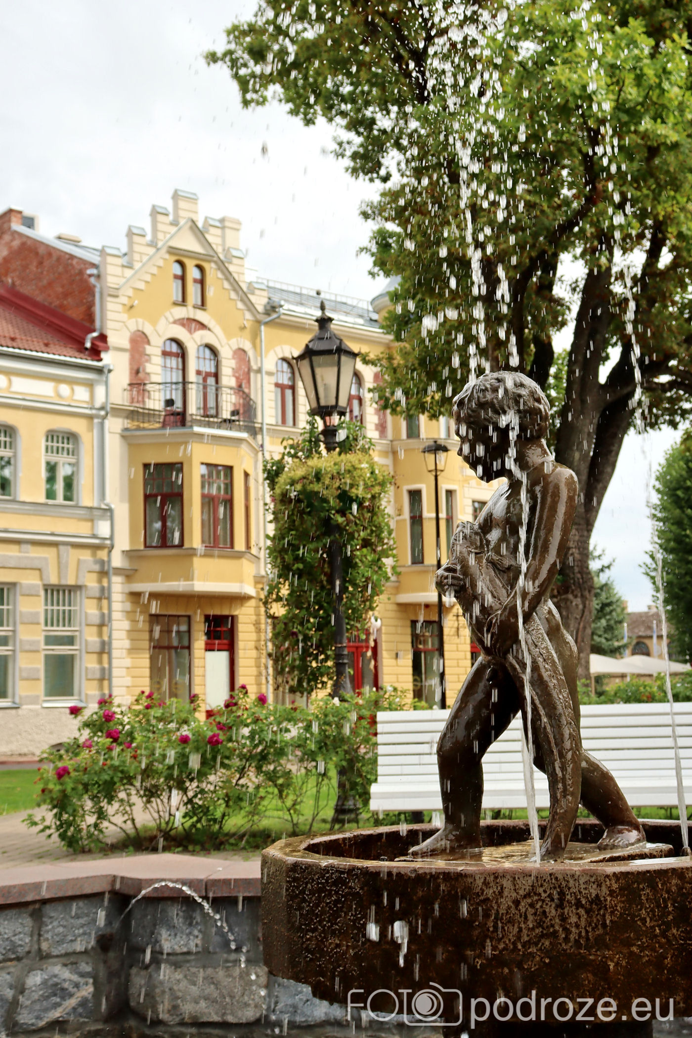 Plac jest bardzo zielony, a na środku znajduje się fontanna chłopca z rybą.