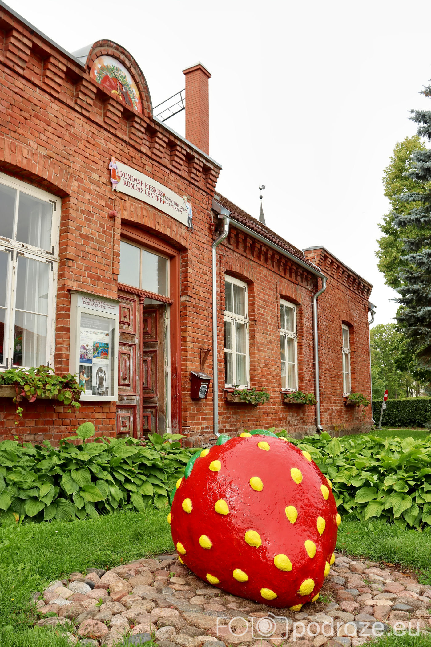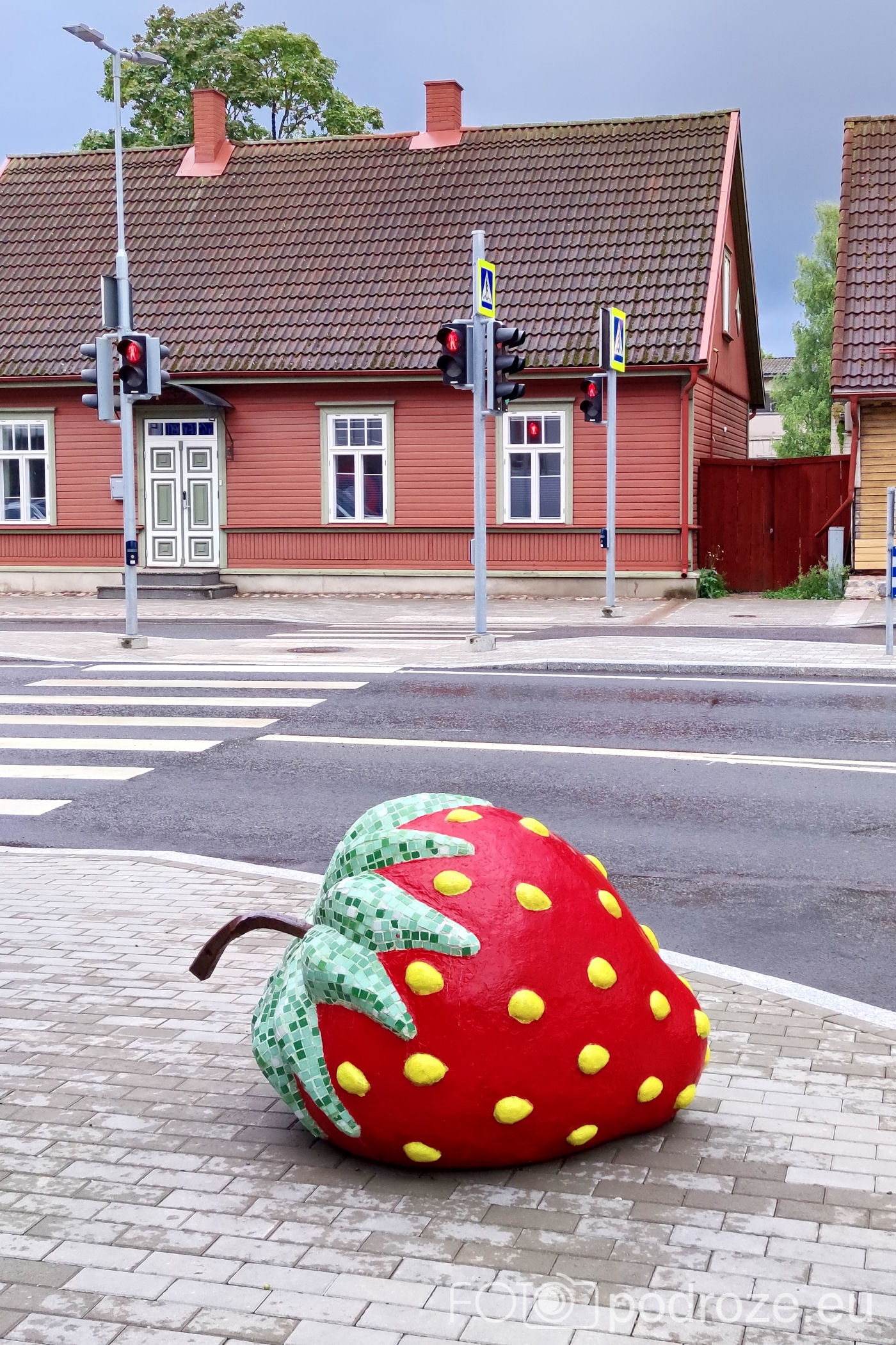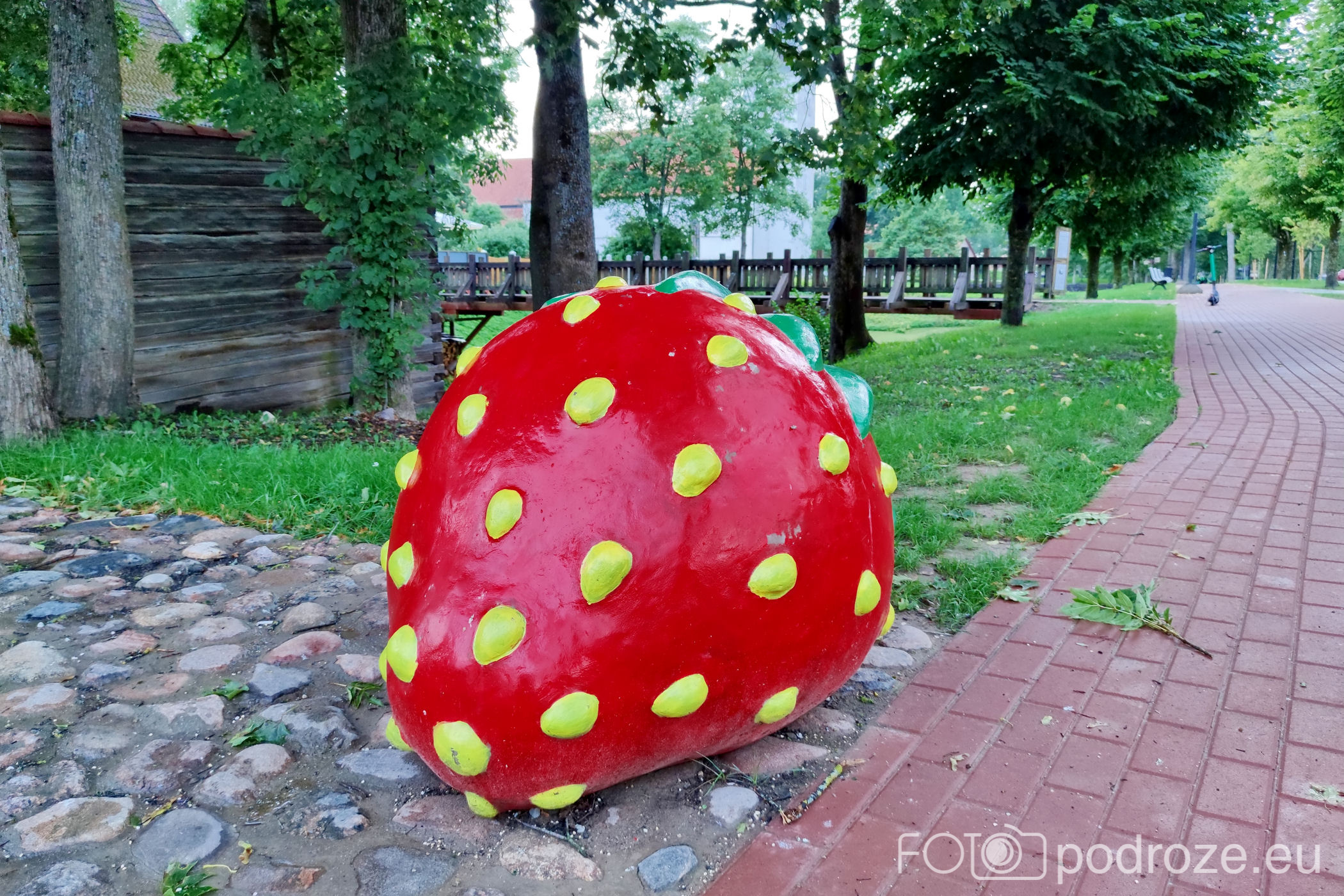 Od kościółka kieruję się na zachód wchodząc w zaczarowany świat kolorowych uliczek. Tuż za świątynią znajduje się ceglany budynek z wielka truskawką przed nim. Skąd ta truskawka? O tym poczytacie poniżej.