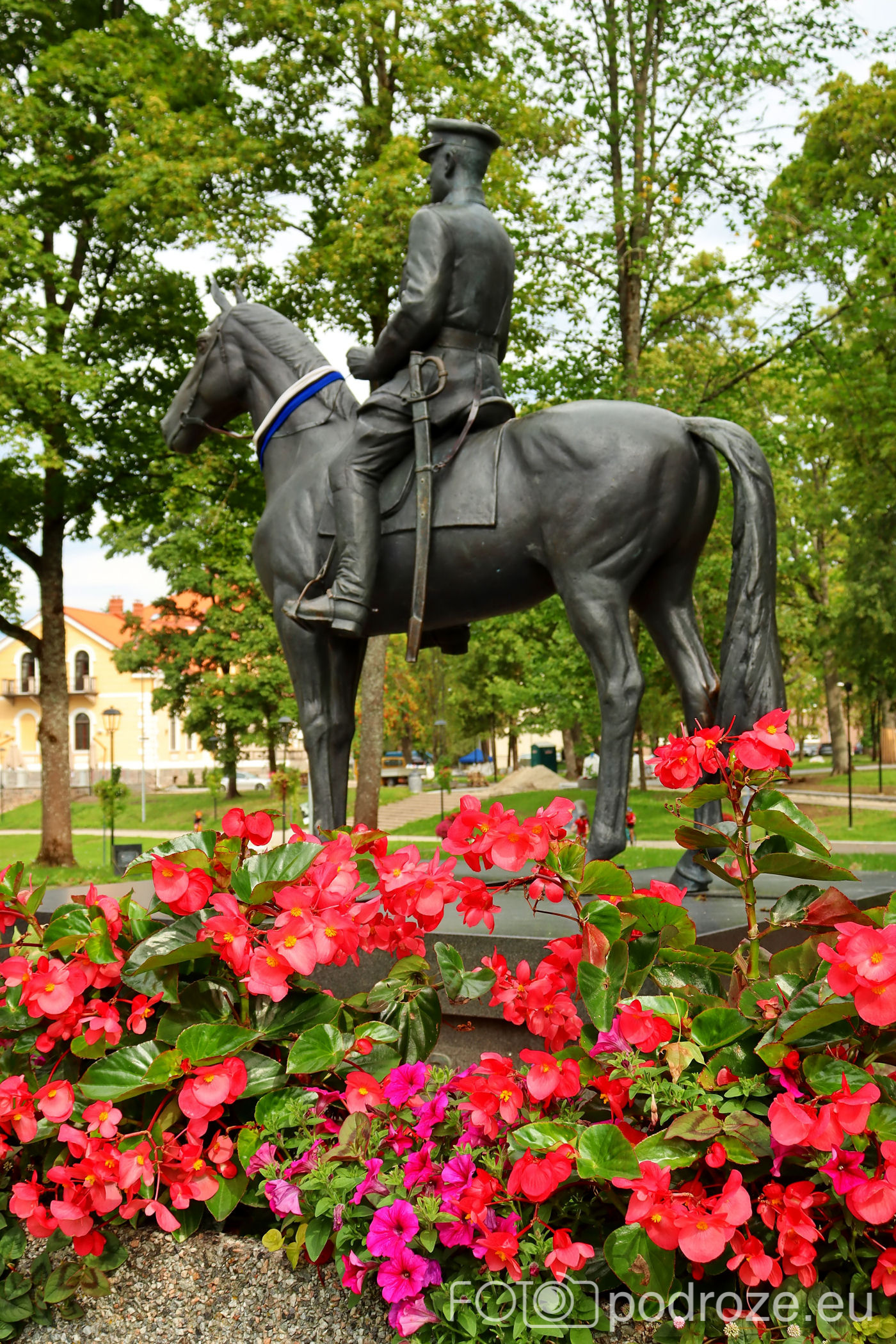 Teraz udaję się w kierunku południowym. To z pewnością jedna z najciekawszych i najbardziej zaskakujących części miasta. Przede mną piękny, dopiero co odrestaurowany obiekt zwany Zamkiem Felllin . Tak na prawdę nazwę swoją wziął od potężnego zamku Krzyżackiego zbudowanego kawałek dalej. Obiekt jest obecnie ekskluzywnym hotelem ze spa. Jego historia sięga jednak XVII wieku i króla Szwecji Gustaw II Adolfa. Centrum dworu zostało zbudowane na zachód od średniowiecznego miasta, pomiędzy miastem oraz dawnym zamkiem zakonnym, który legł w gruzach podczas wojen szwedzko-polskich. Pierwotny dwór rozebrano w 1938 roku, a obecnie w tym miejscu stoi pomnik konny generała Johana Laidonera (zdjęcia poniżej). Nowy dwór w stylu renesansowym został ukończony w 1880 roku.