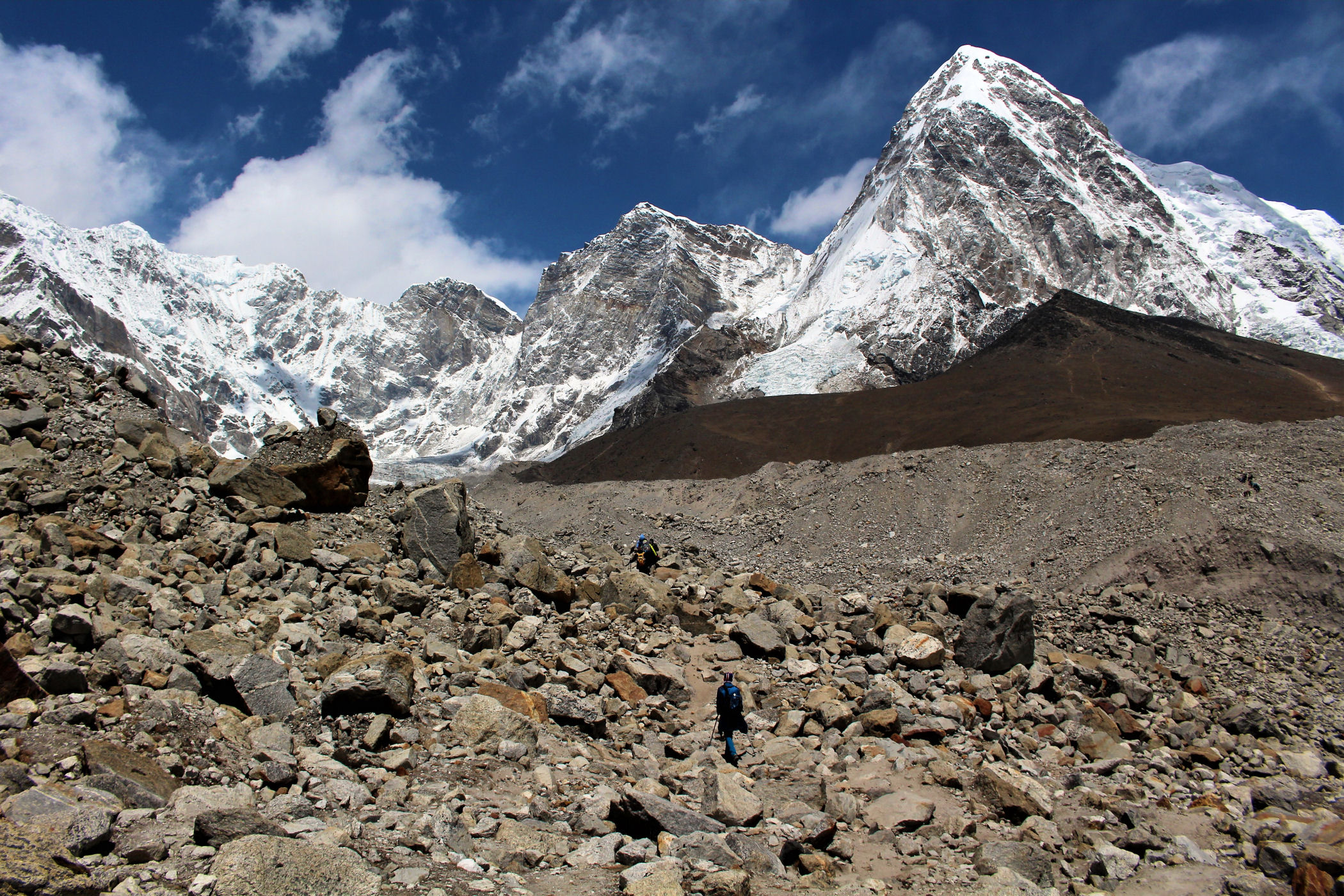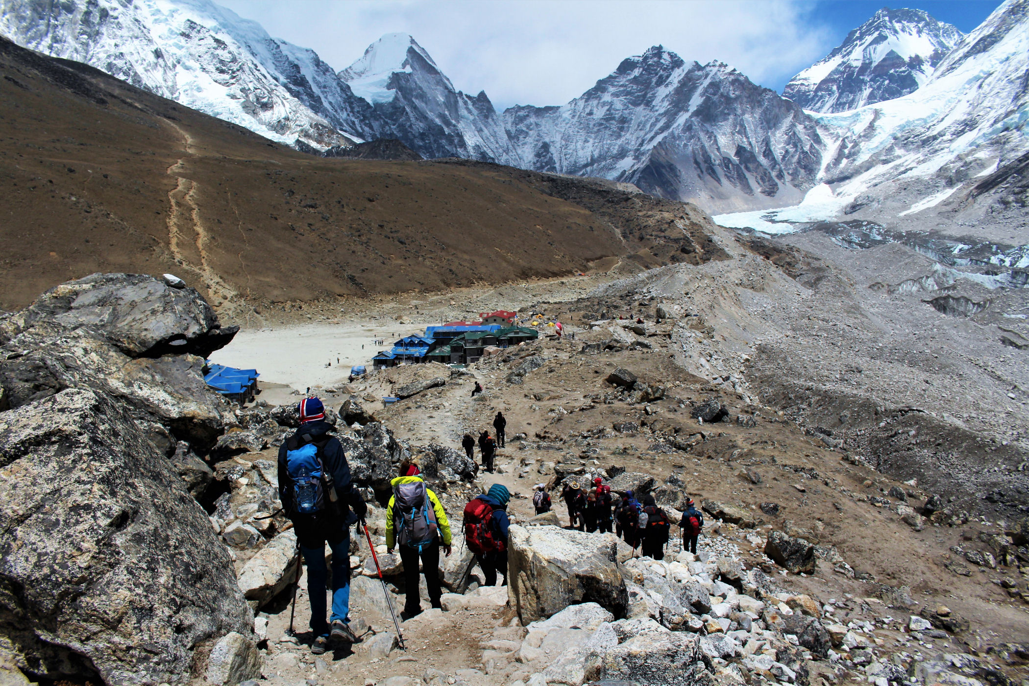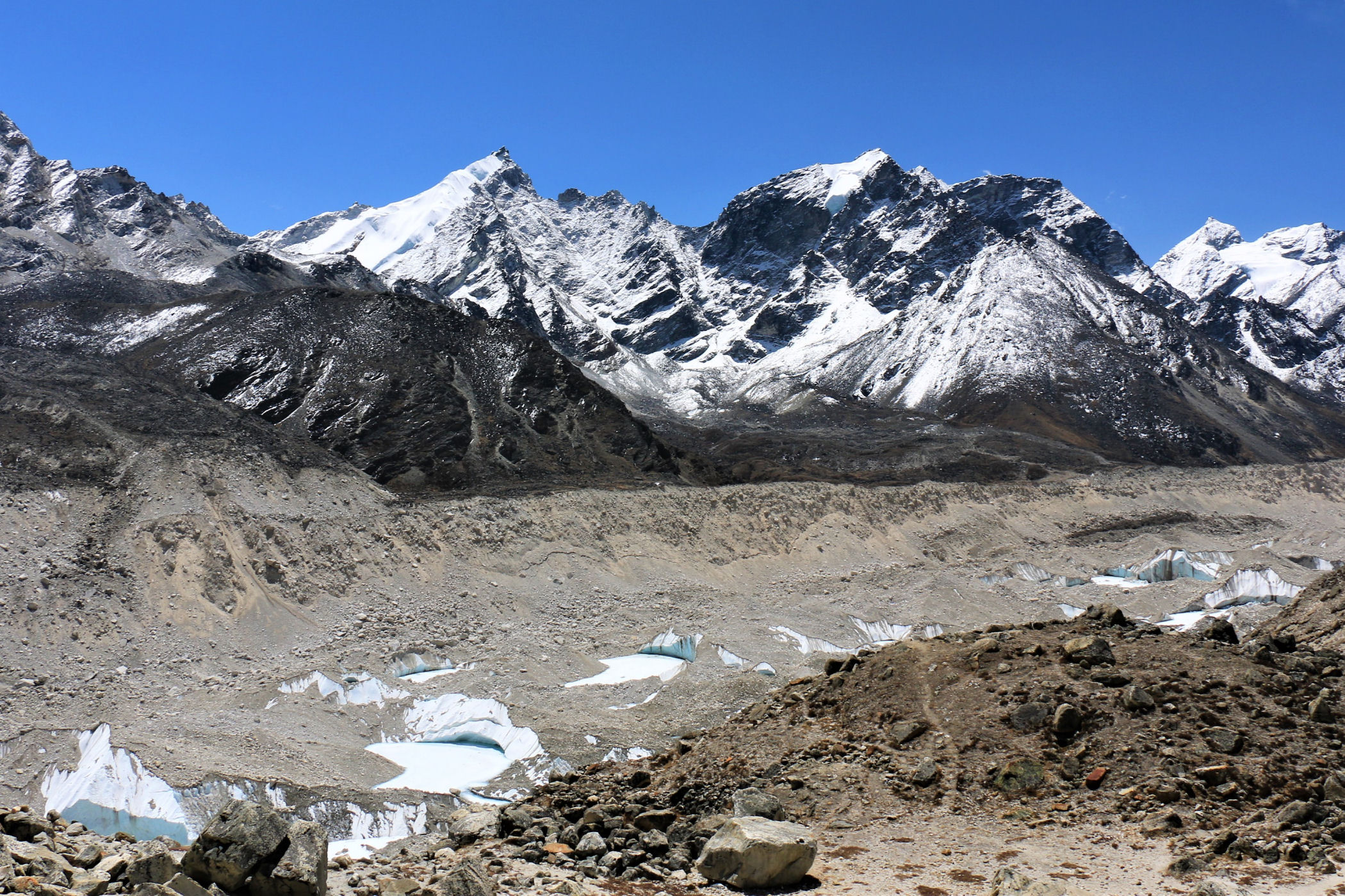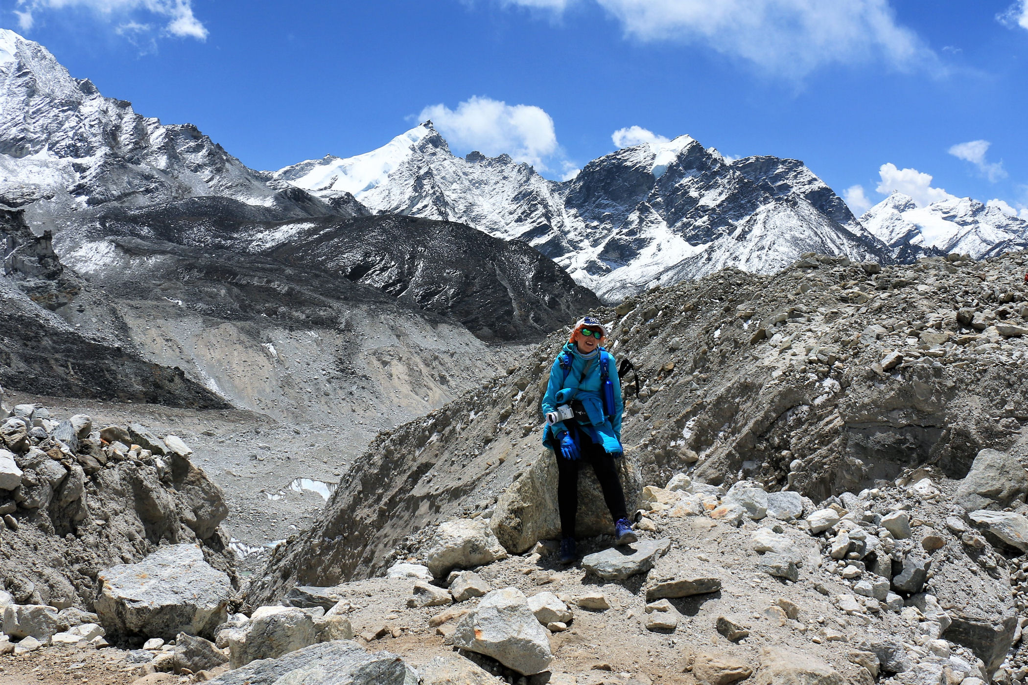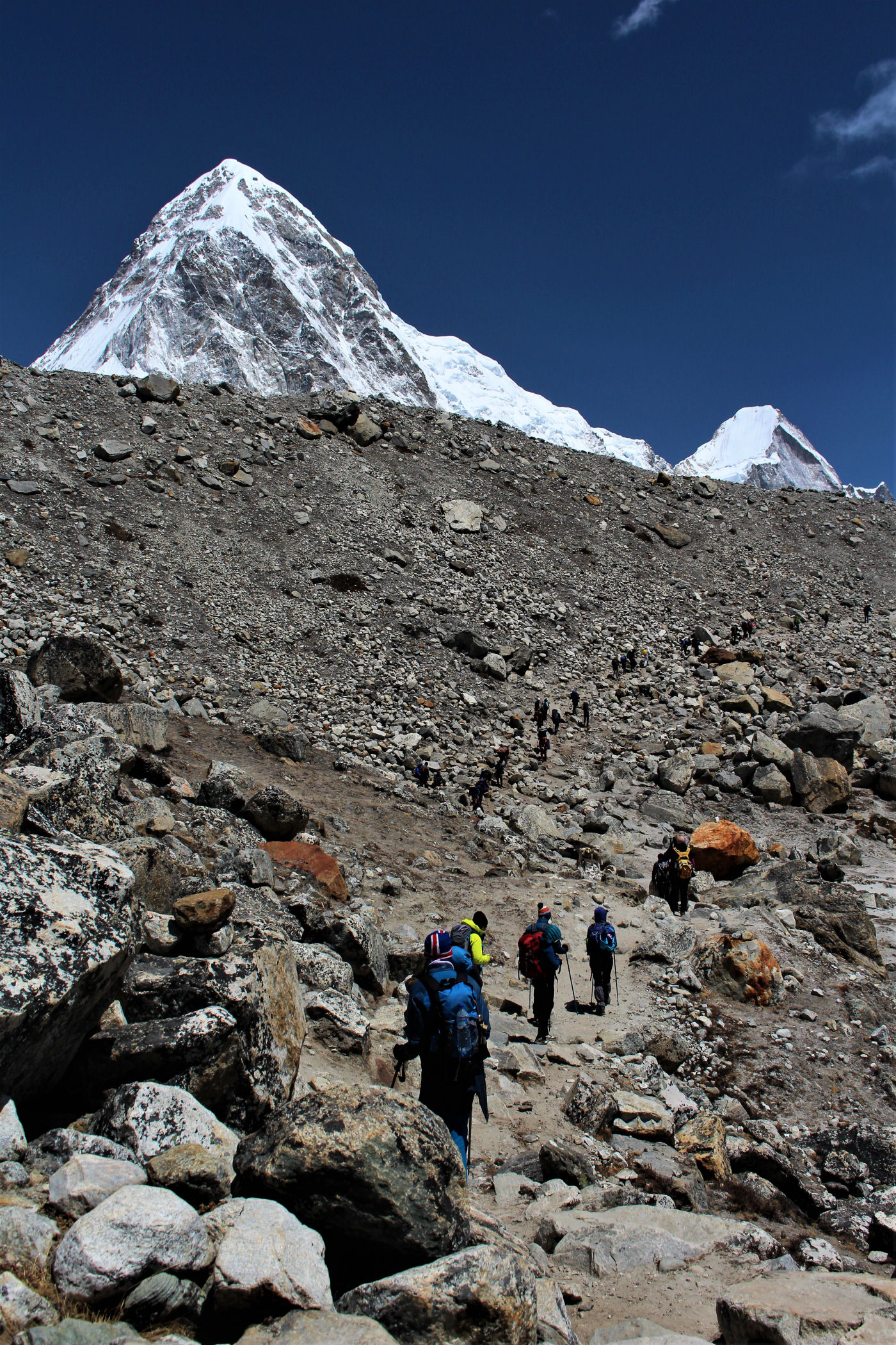 Tego dnia między punktem wyjścia , a celem nie ma już żadnej cywilizacji, a co za tym idzie – żadnego postoju. Można co prawda zboczyć ze szlaku do włoskiej stacji badawczej, ale my tego nie robimy. Mamy do pokonania zaledwie 270m różnicy wysokości i 6km drogi, ale zajmuje nam to prawie 4 godziny. Wszyscy są już strasznie zmęczeni, wysokość robi swoje. Cały dzisiejszy szlak ciągnie się wzdłuż Lodowca Khumbu. Po lewej stronie masyw Lobuche (6135m), po prawej Mehra Peak (5820m) , za nim przepiękny szczyt Nuptse (7864m). Krajobraz jest już całkowicie surowy, tylko kamienie, skały i lód, zero roślinności.