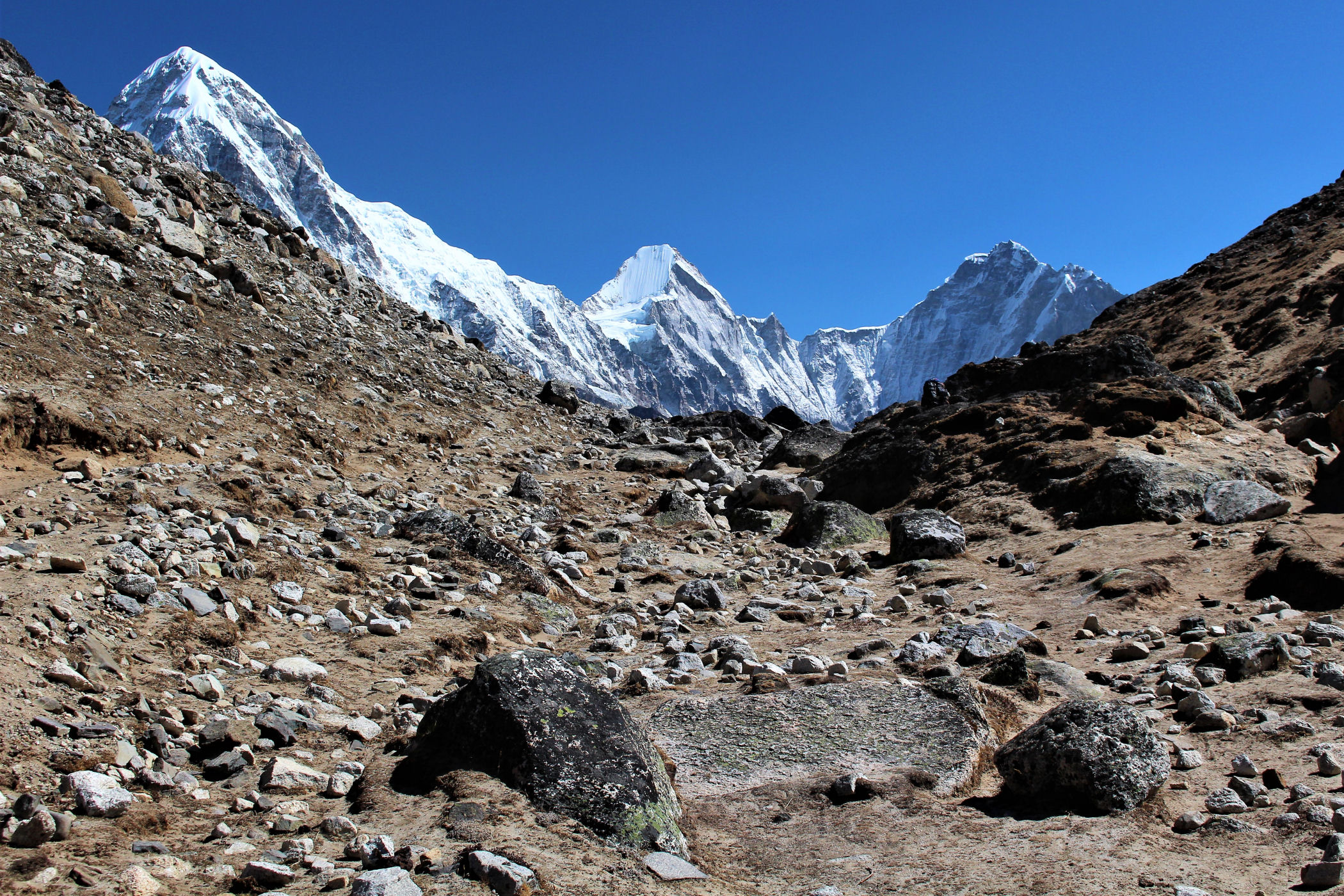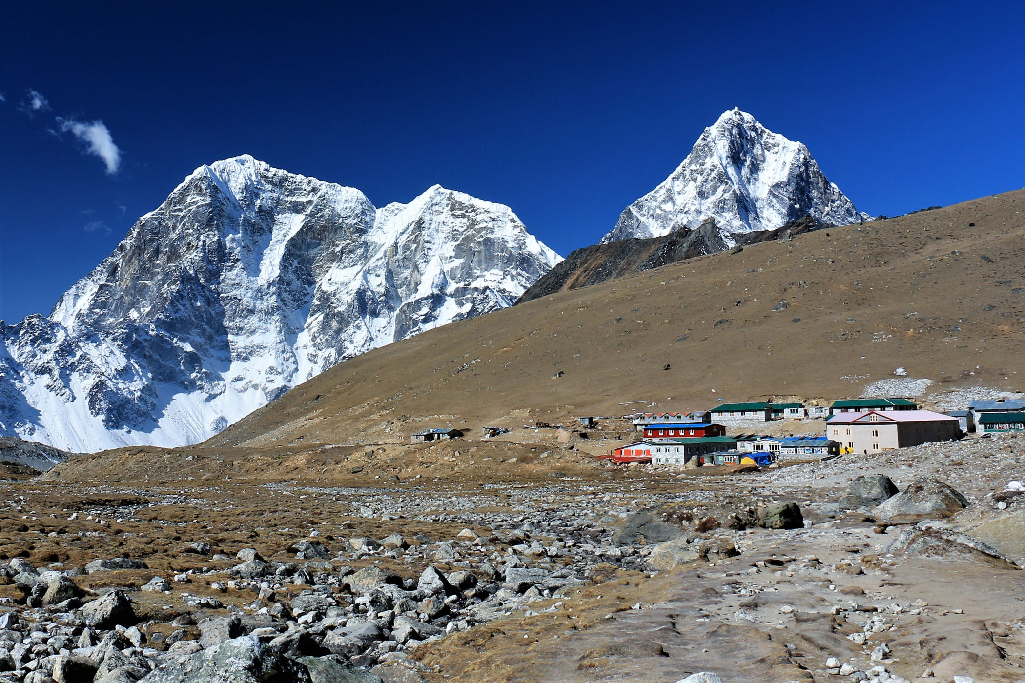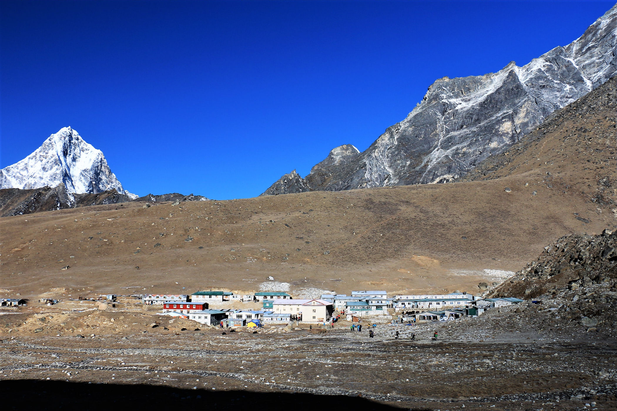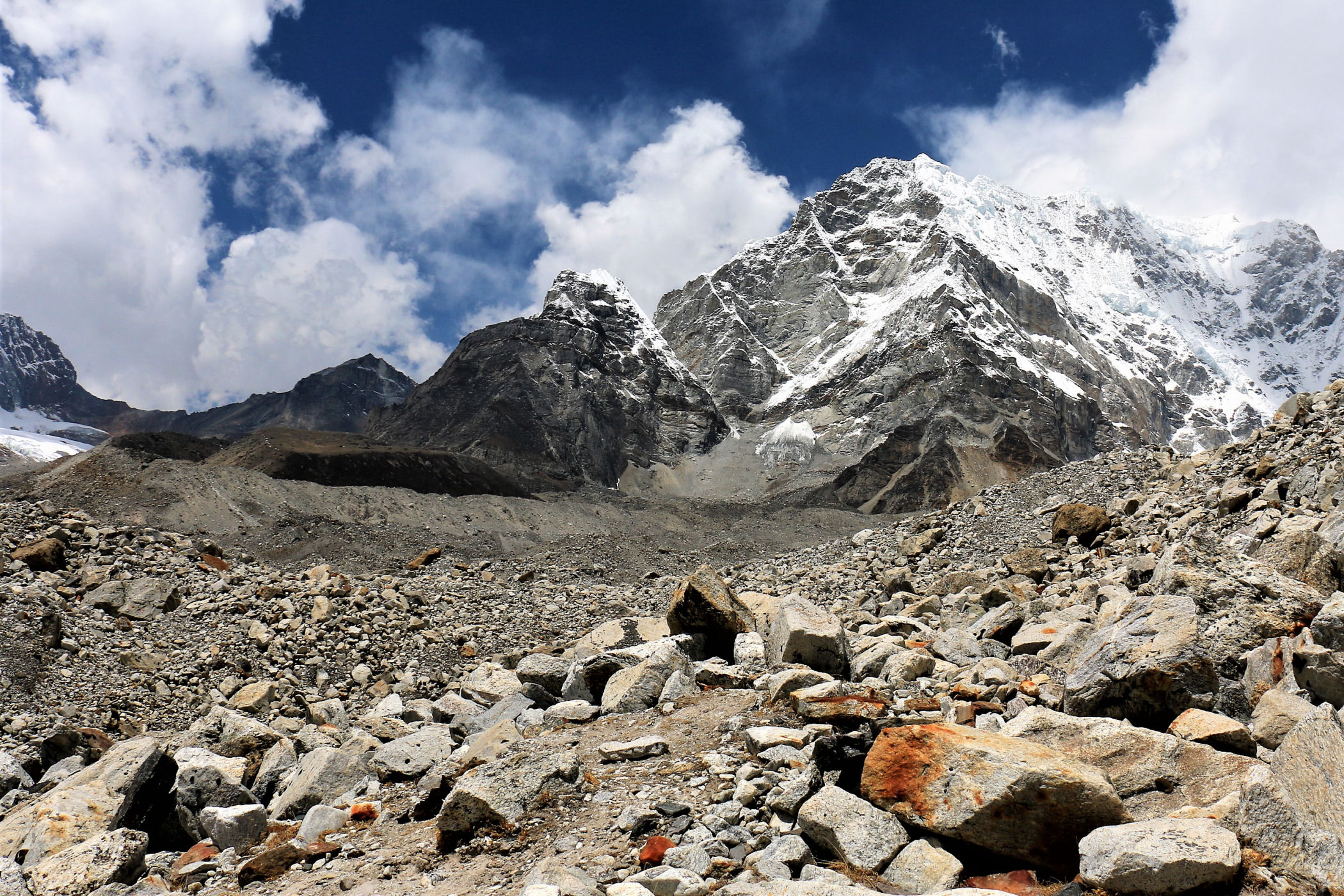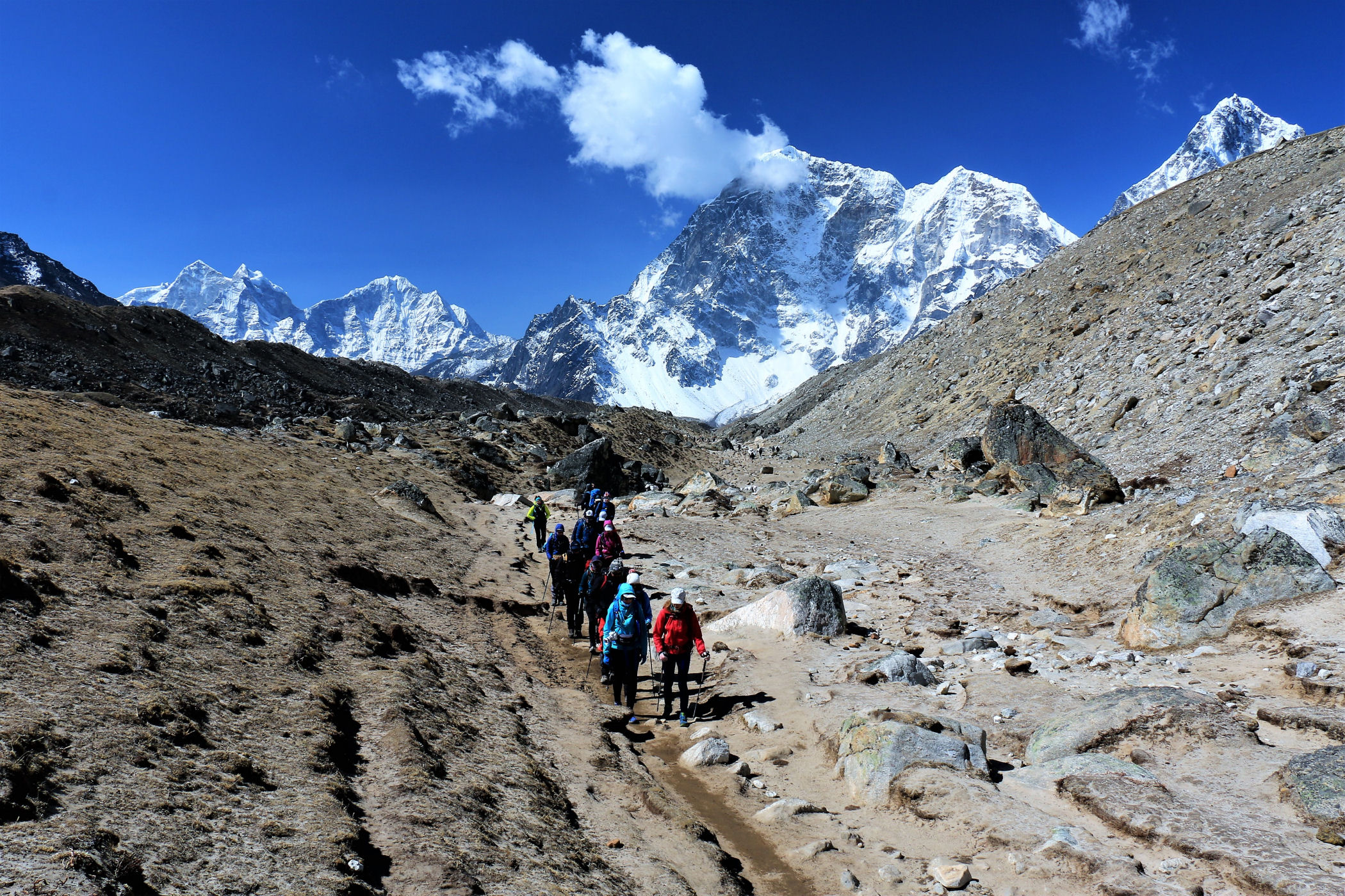 Tego dnia między punktem wyjścia , a celem nie ma już żadnej cywilizacji, a co za tym idzie – żadnego postoju. Można co prawda zboczyć ze szlaku do włoskiej stacji badawczej, ale my tego nie robimy. Mamy do pokonania zaledwie 270m różnicy wysokości i 6km drogi, ale zajmuje nam to prawie 4 godziny. Wszyscy są już strasznie zmęczeni, wysokość robi swoje. Cały dzisiejszy szlak ciągnie się wzdłuż Lodowca Khumbu. Po lewej stronie masyw Lobuche (6135m), po prawej Mehra Peak (5820m) , za nim przepiękny szczyt Nuptse (7864m). Krajobraz jest już całkowicie surowy, tylko kamienie, skały i lód, zero roślinności.