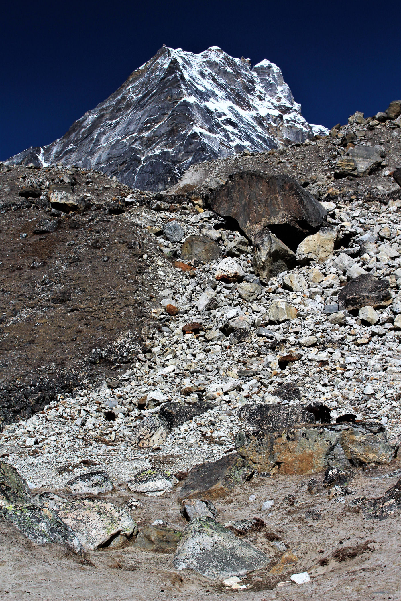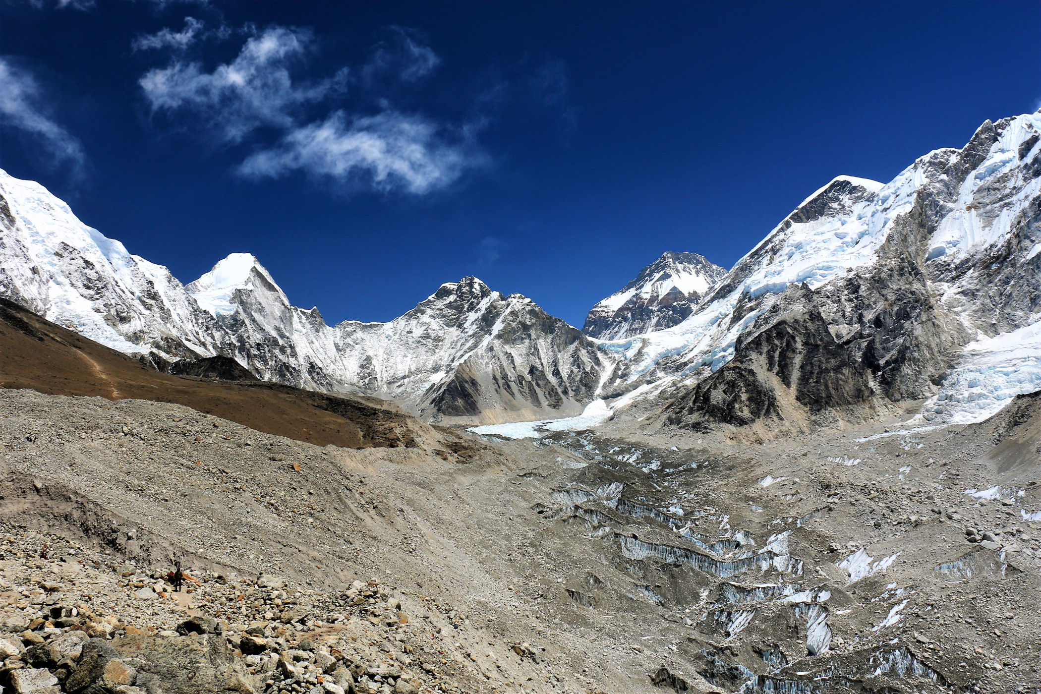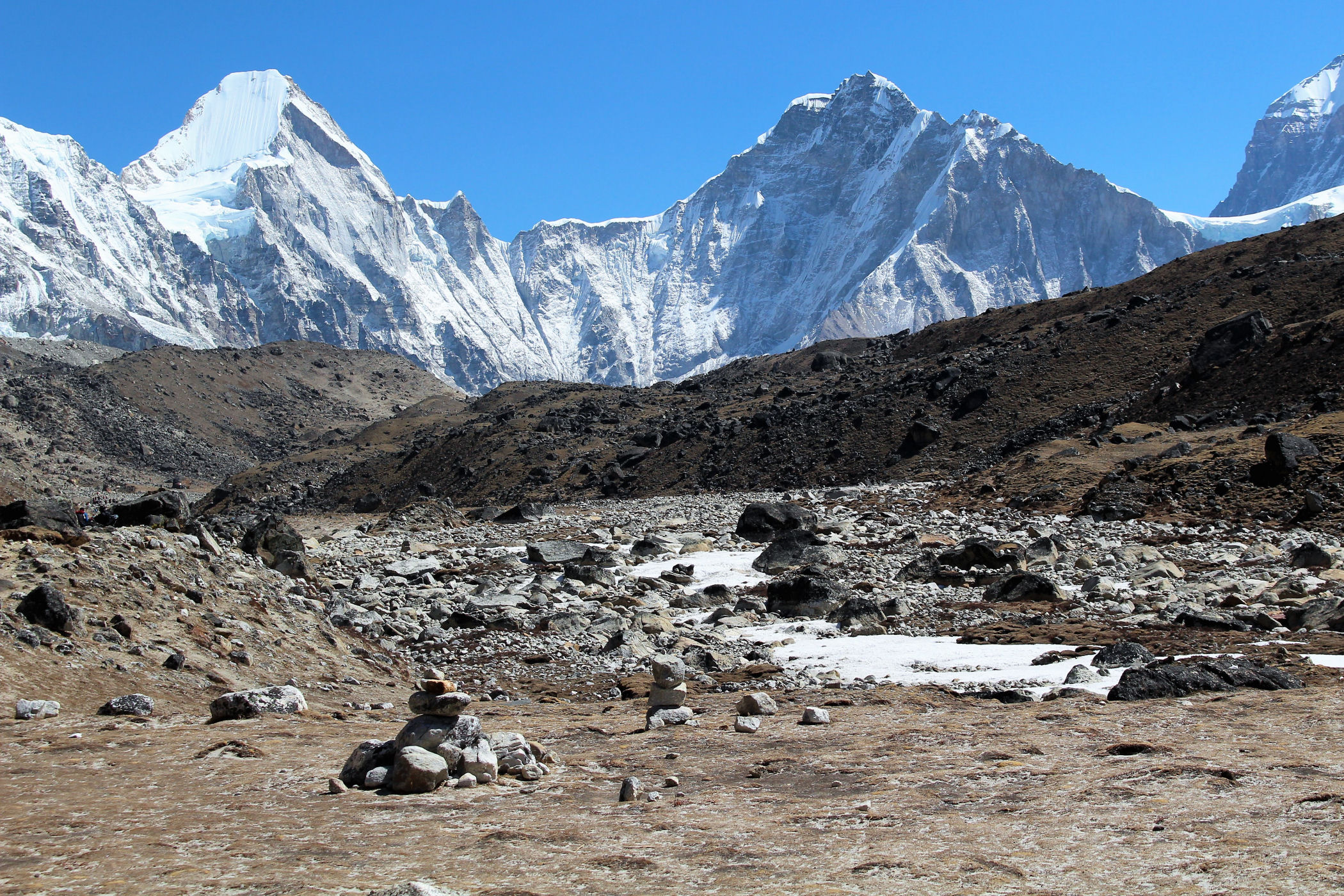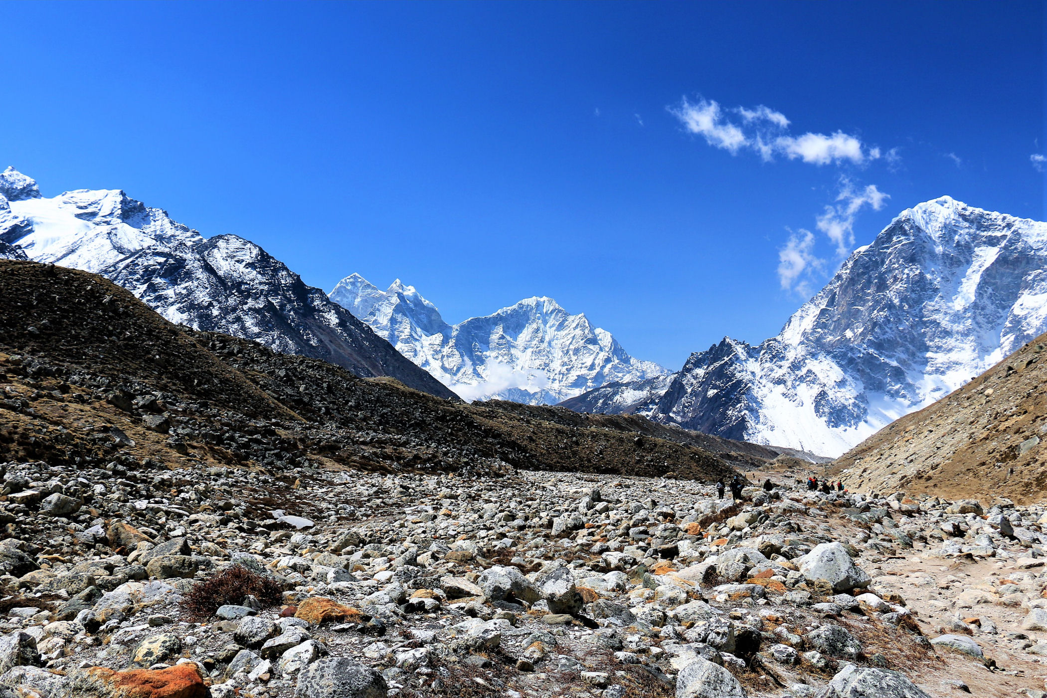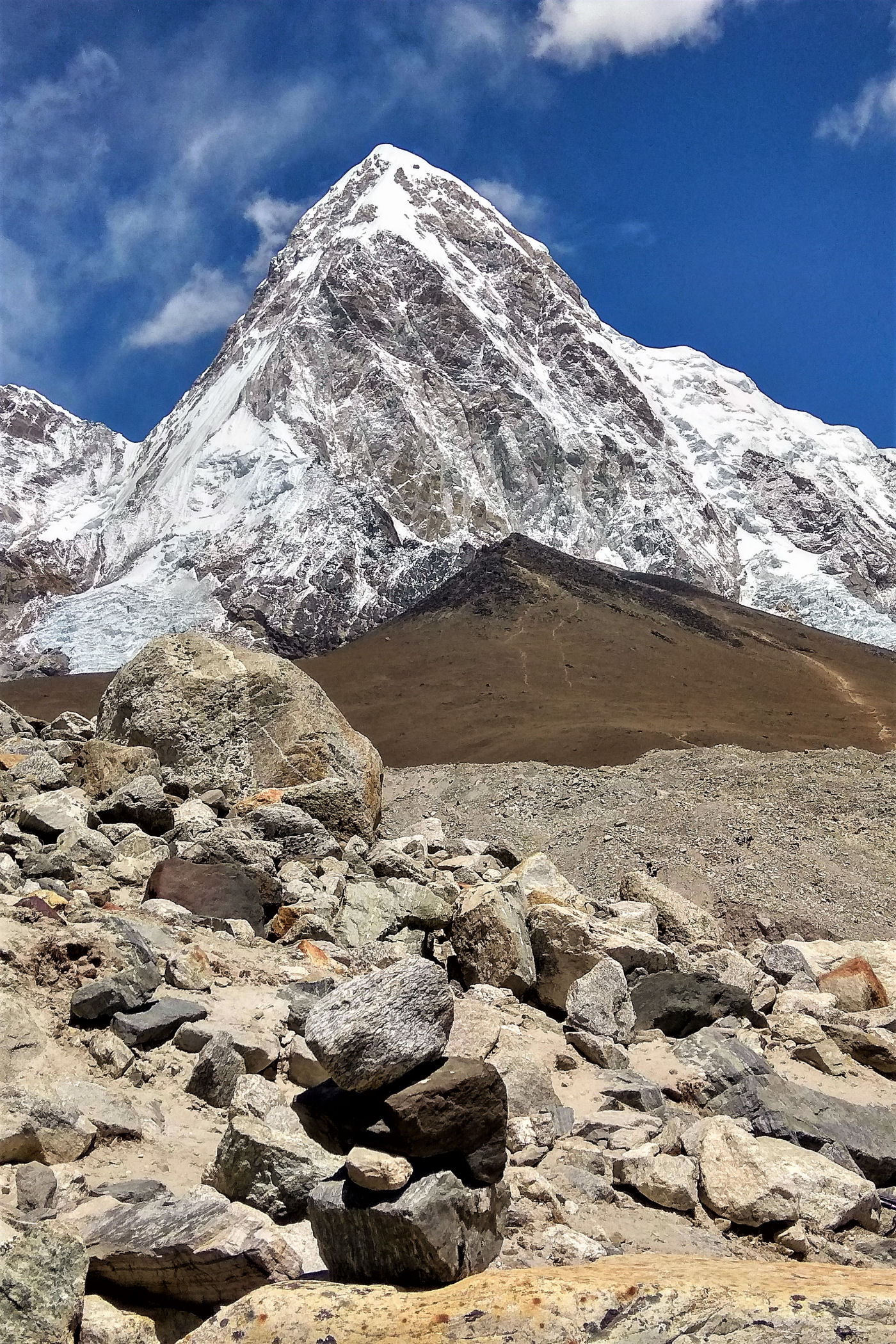 Tego dnia między punktem wyjścia , a celem nie ma już żadnej cywilizacji, a co za tym idzie – żadnego postoju. Można co prawda zboczyć ze szlaku do włoskiej stacji badawczej, ale my tego nie robimy. Mamy do pokonania zaledwie 270m różnicy wysokości i 6km drogi, ale zajmuje nam to prawie 4 godziny. Wszyscy są już strasznie zmęczeni, wysokość robi swoje. Cały dzisiejszy szlak ciągnie się wzdłuż Lodowca Khumbu. Po lewej stronie masyw Lobuche (6135m), po prawej Mehra Peak (5820m) , za nim przepiękny szczyt Nuptse (7864m). Krajobraz jest już całkowicie surowy, tylko kamienie, skały i lód, zero roślinności.