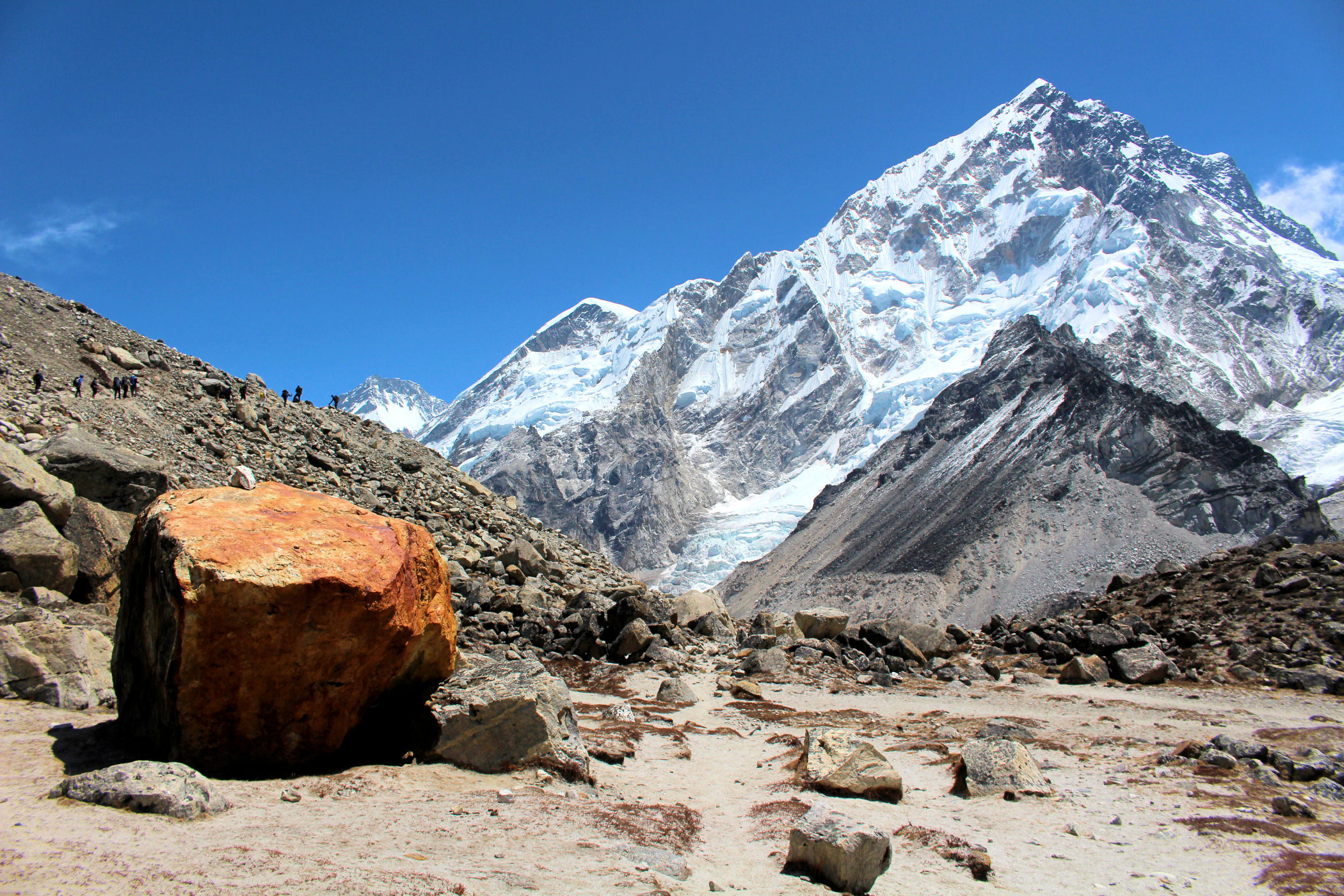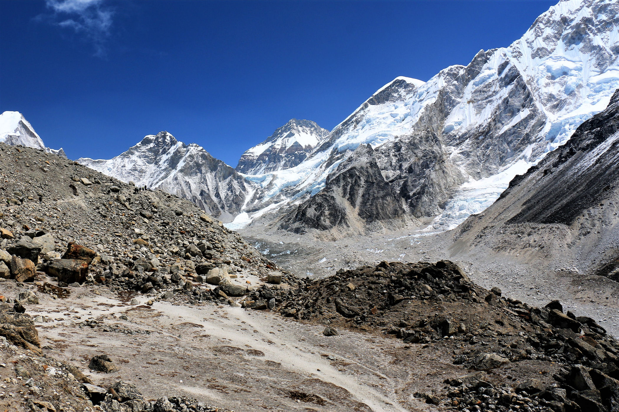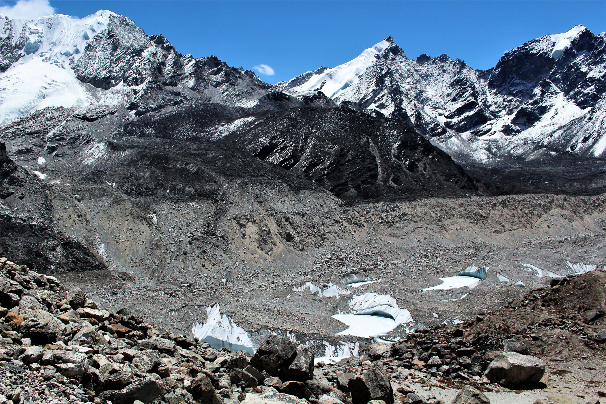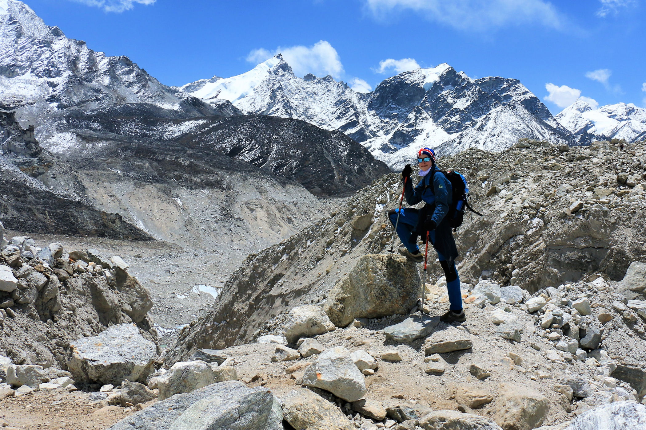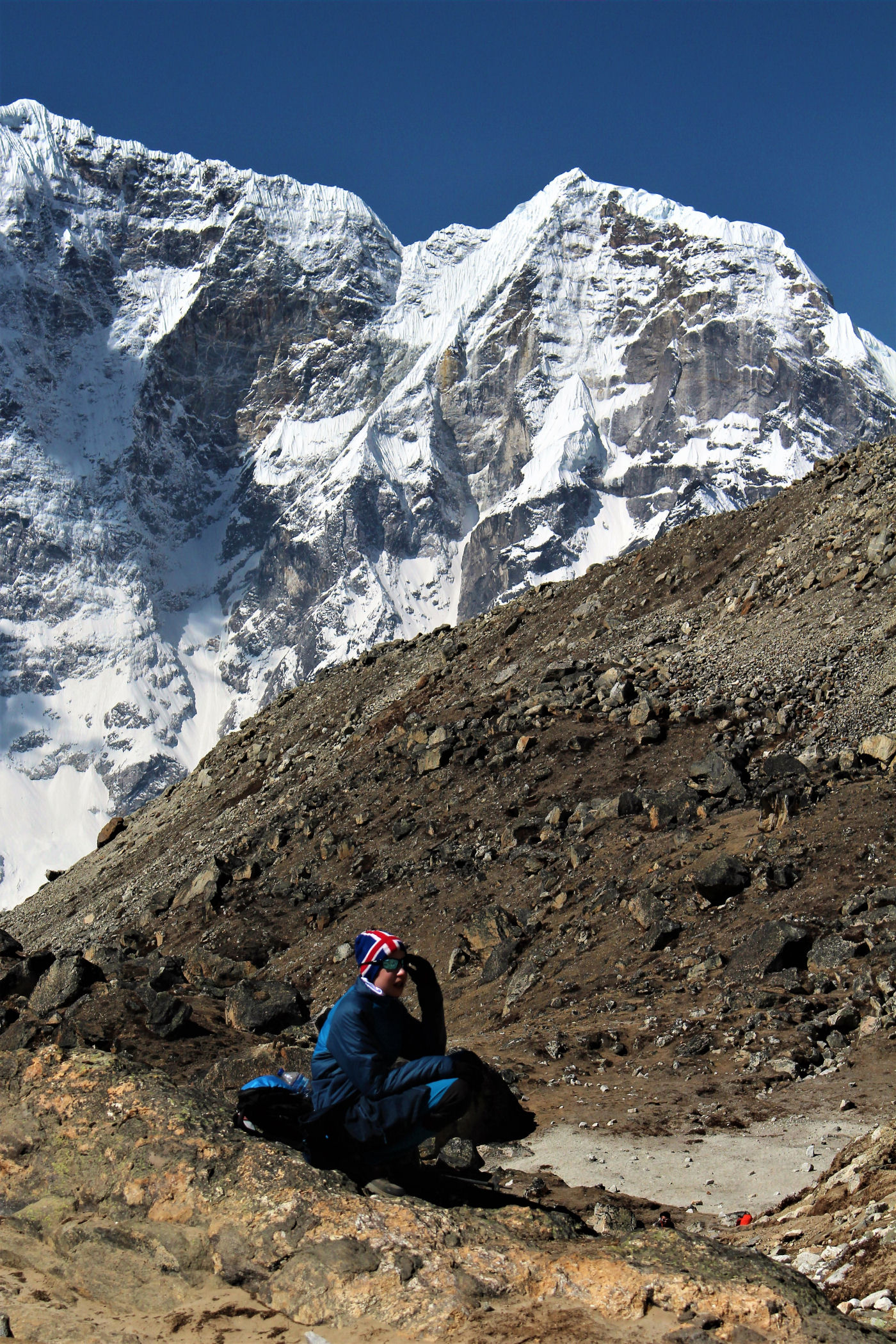 Tego dnia między punktem wyjścia , a celem nie ma już żadnej cywilizacji, a co za tym idzie – żadnego postoju. Można co prawda zboczyć ze szlaku do włoskiej stacji badawczej, ale my tego nie robimy. Mamy do pokonania zaledwie 270m różnicy wysokości i 6km drogi, ale zajmuje nam to prawie 4 godziny. Wszyscy są już strasznie zmęczeni, wysokość robi swoje. Cały dzisiejszy szlak ciągnie się wzdłuż Lodowca Khumbu. Po lewej stronie masyw Lobuche (6135m), po prawej Mehra Peak (5820m) , za nim przepiękny szczyt Nuptse (7864m). Krajobraz jest już całkowicie surowy, tylko kamienie, skały i lód, zero roślinności.