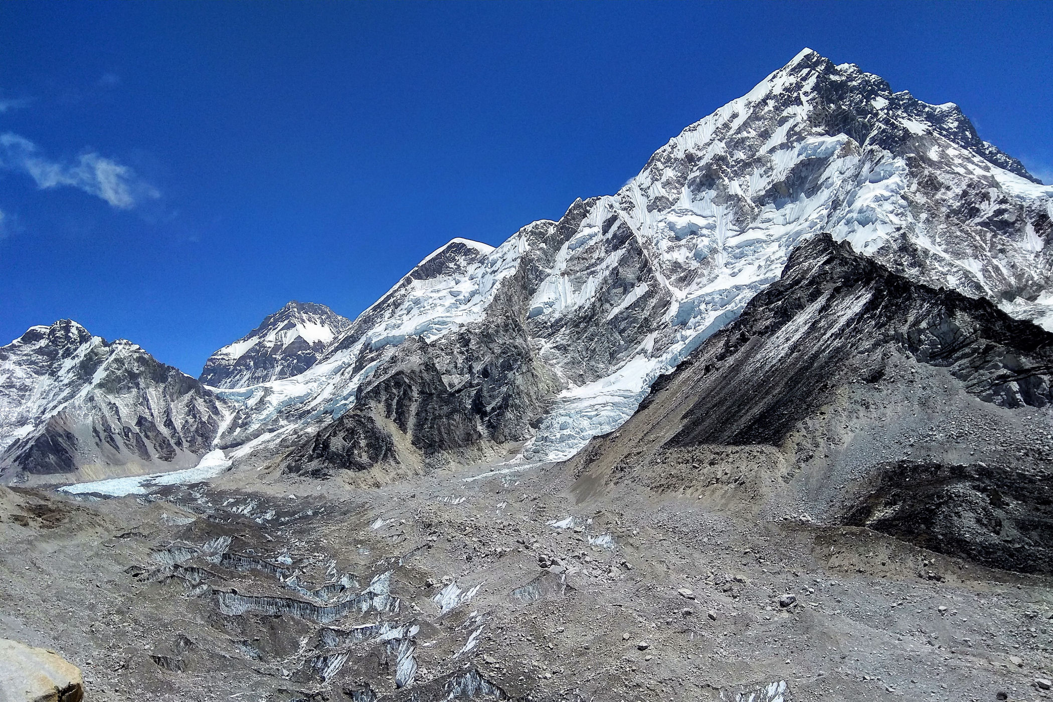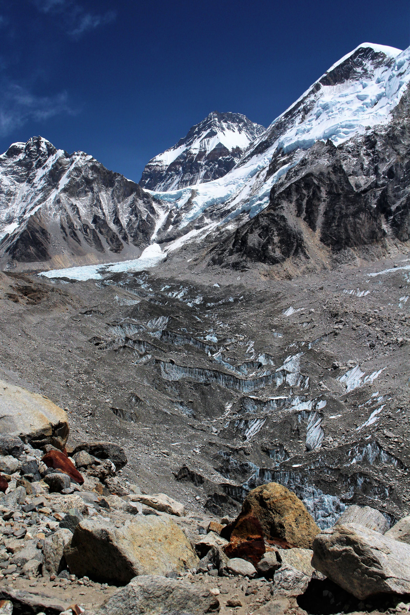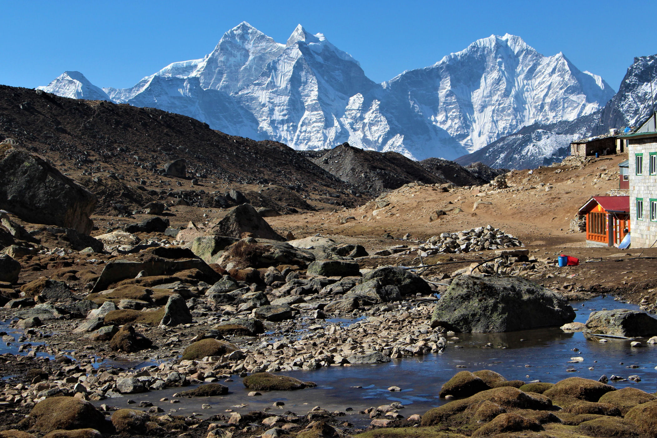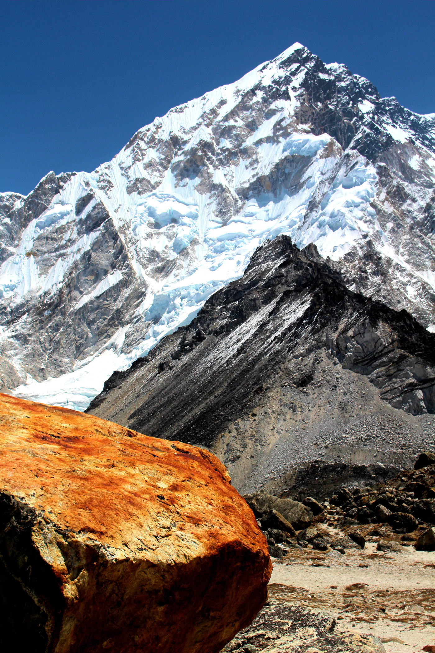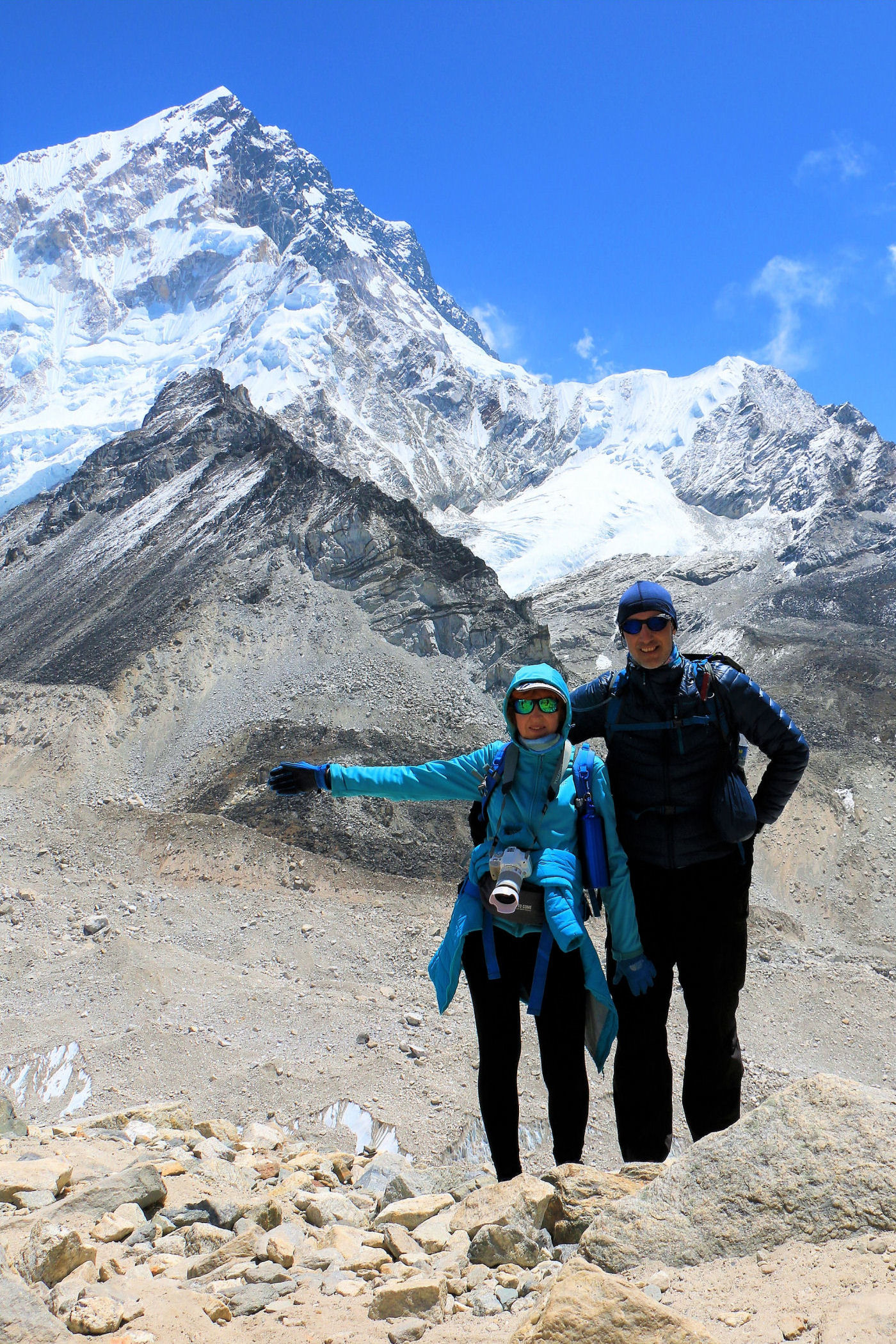 Tego dnia między punktem wyjścia , a celem nie ma już żadnej cywilizacji, a co za tym idzie – żadnego postoju. Można co prawda zboczyć ze szlaku do włoskiej stacji badawczej, ale my tego nie robimy. Mamy do pokonania zaledwie 270m różnicy wysokości i 6km drogi, ale zajmuje nam to prawie 4 godziny. Wszyscy są już strasznie zmęczeni, wysokość robi swoje. Cały dzisiejszy szlak ciągnie się wzdłuż Lodowca Khumbu. Po lewej stronie masyw Lobuche (6135m), po prawej Mehra Peak (5820m) , za nim przepiękny szczyt Nuptse (7864m). Krajobraz jest już całkowicie surowy, tylko kamienie, skały i lód, zero roślinności.