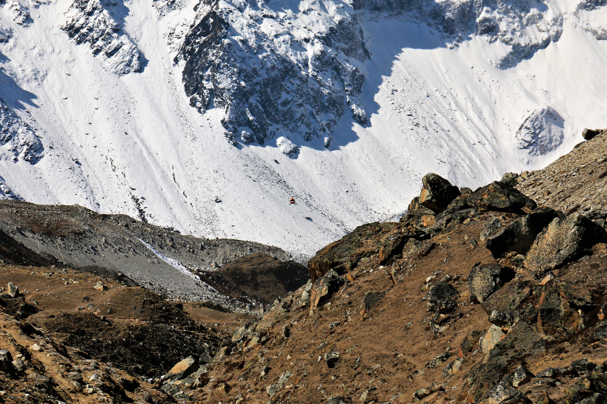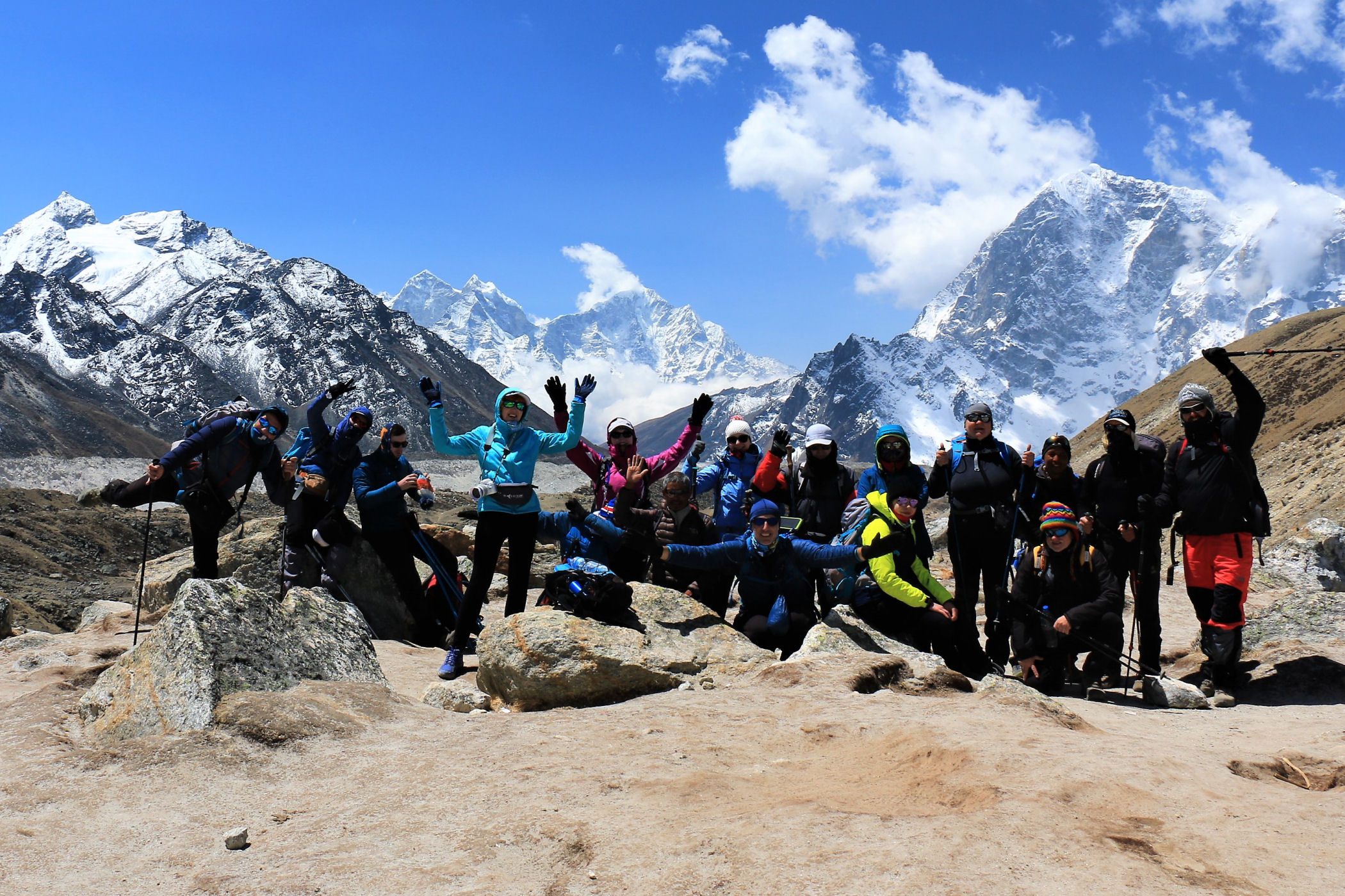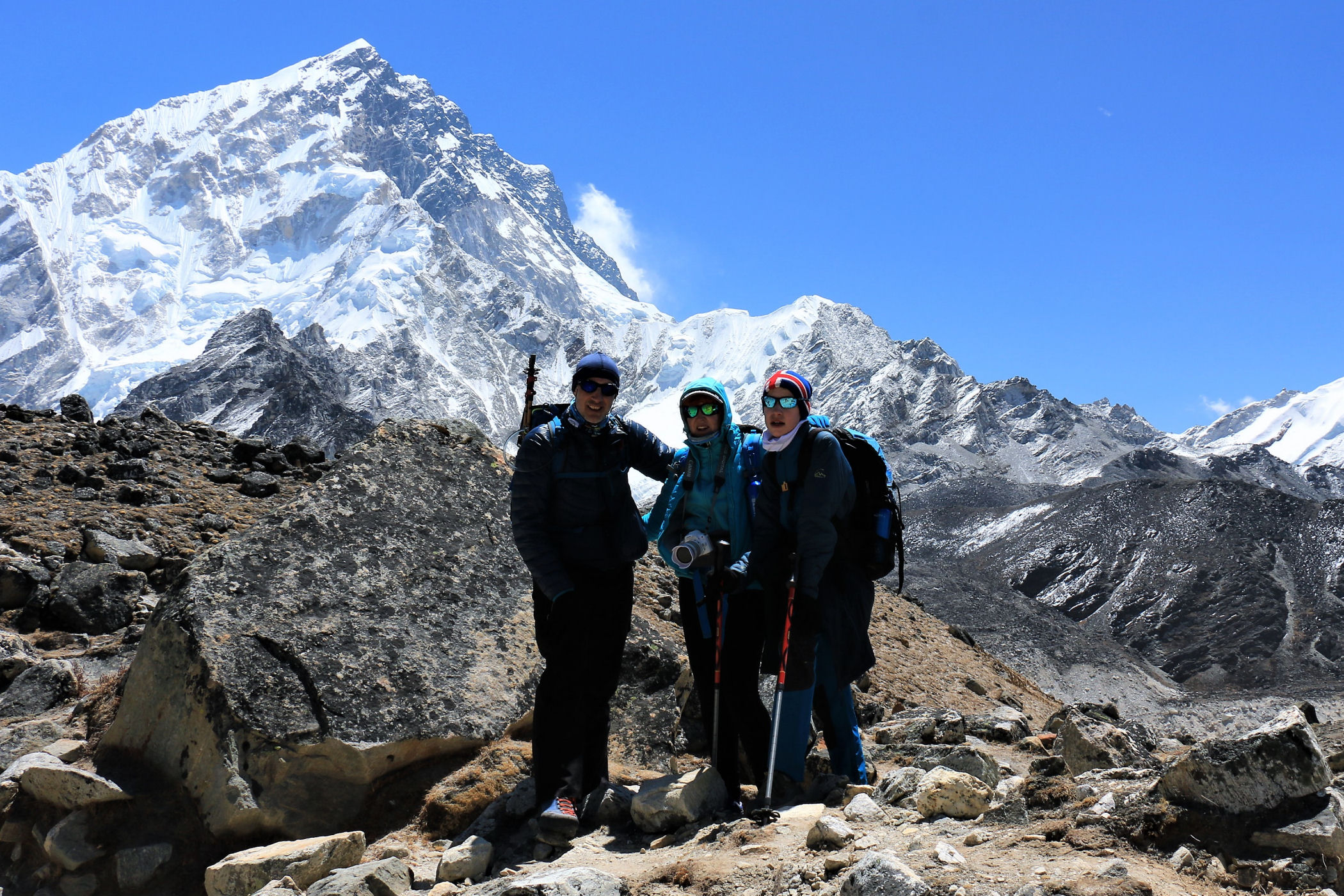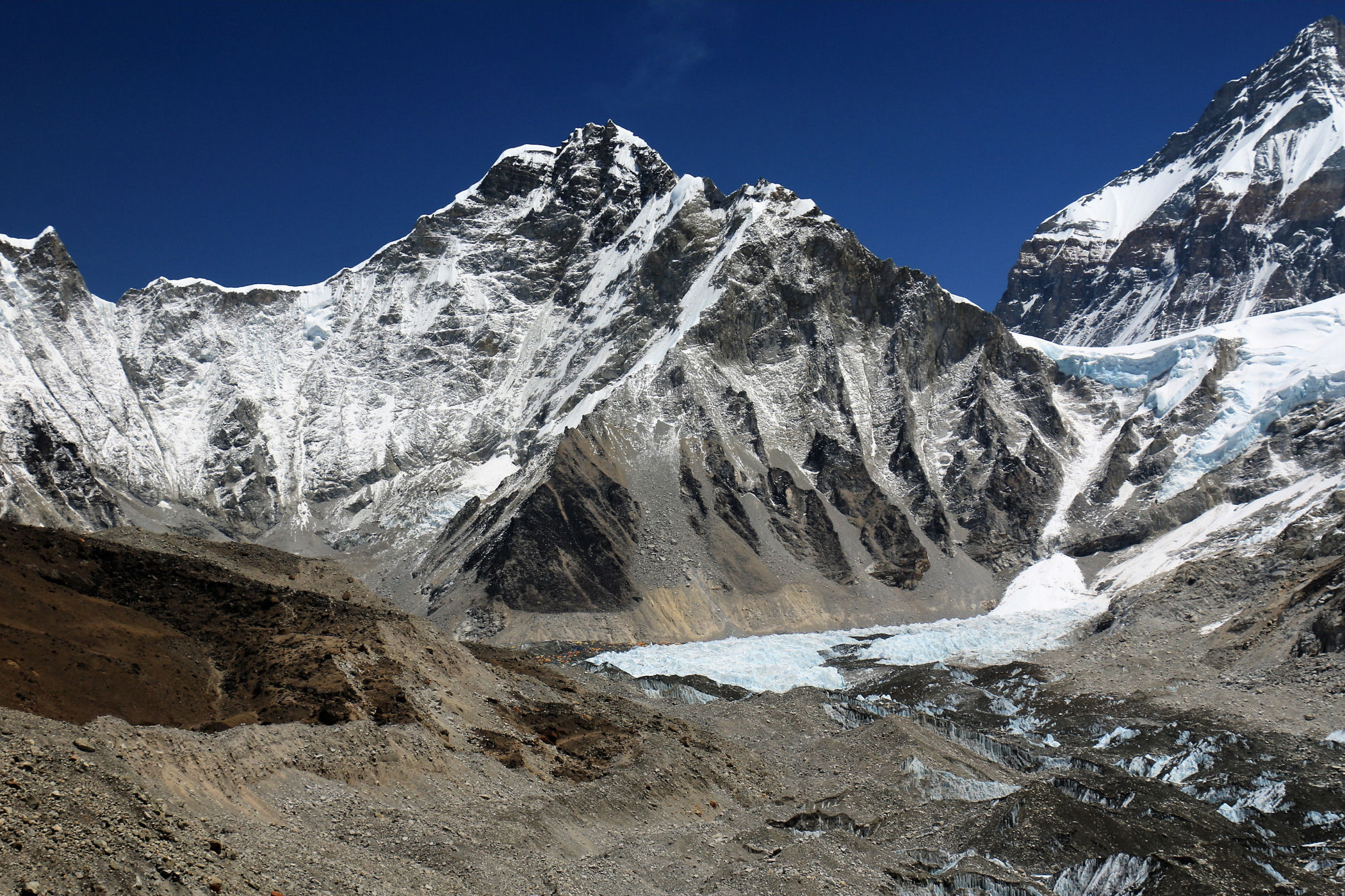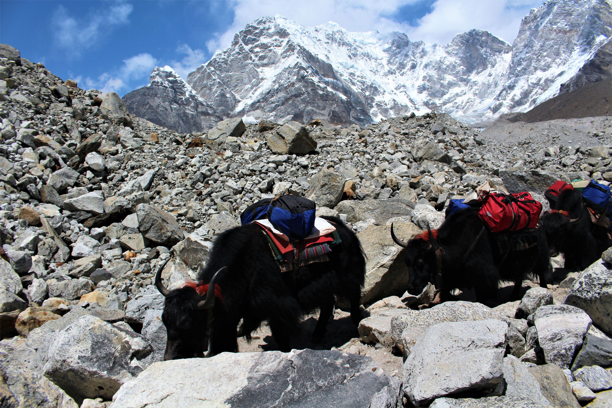 Tego dnia między punktem wyjścia , a celem nie ma już żadnej cywilizacji, a co za tym idzie – żadnego postoju. Można co prawda zboczyć ze szlaku do włoskiej stacji badawczej, ale my tego nie robimy. Mamy do pokonania zaledwie 270m różnicy wysokości i 6km drogi, ale zajmuje nam to prawie 4 godziny. Wszyscy są już strasznie zmęczeni, wysokość robi swoje. Cały dzisiejszy szlak ciągnie się wzdłuż Lodowca Khumbu. Po lewej stronie masyw Lobuche (6135m), po prawej Mehra Peak (5820m) , za nim przepiękny szczyt Nuptse (7864m). Krajobraz jest już całkowicie surowy, tylko kamienie, skały i lód, zero roślinności.