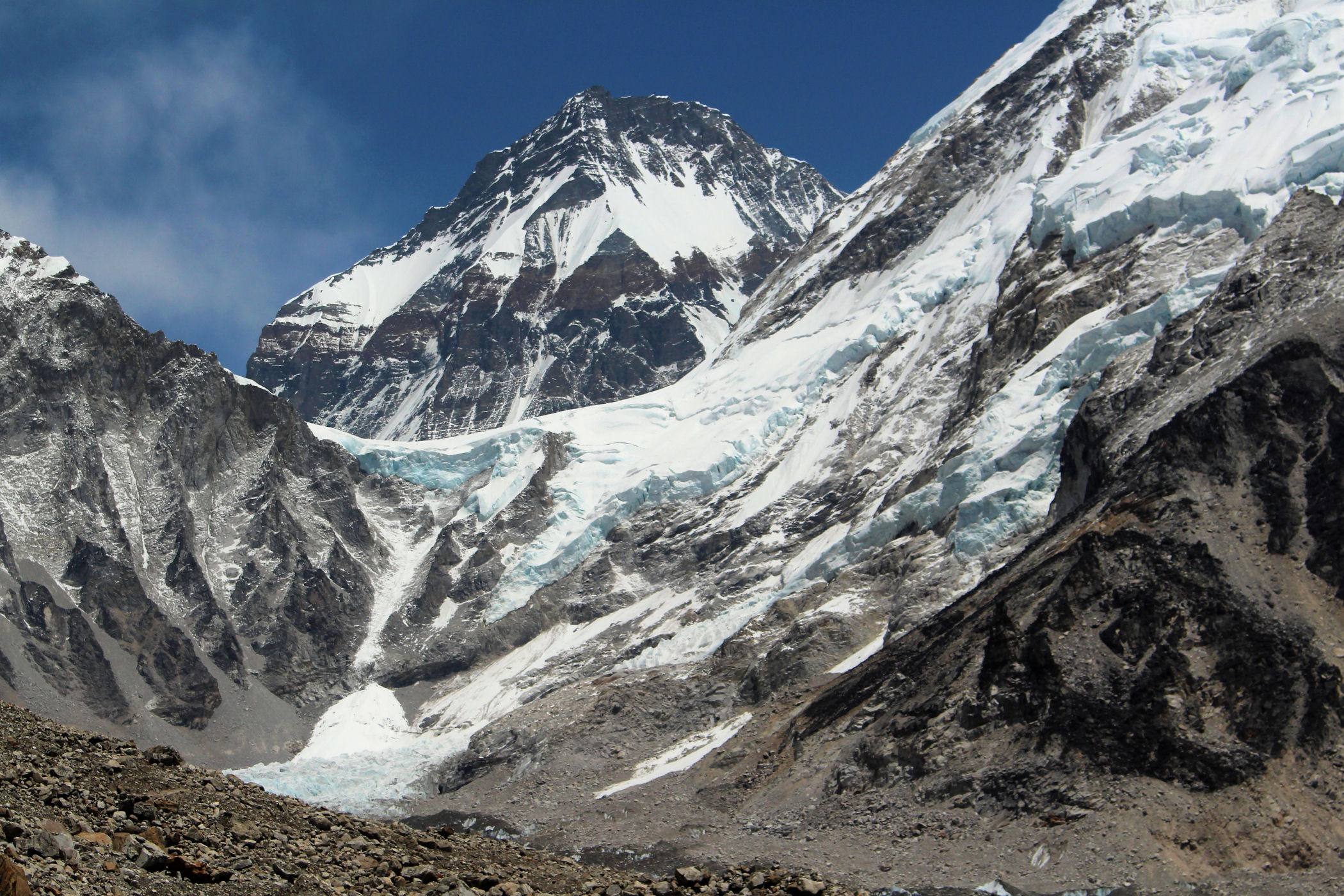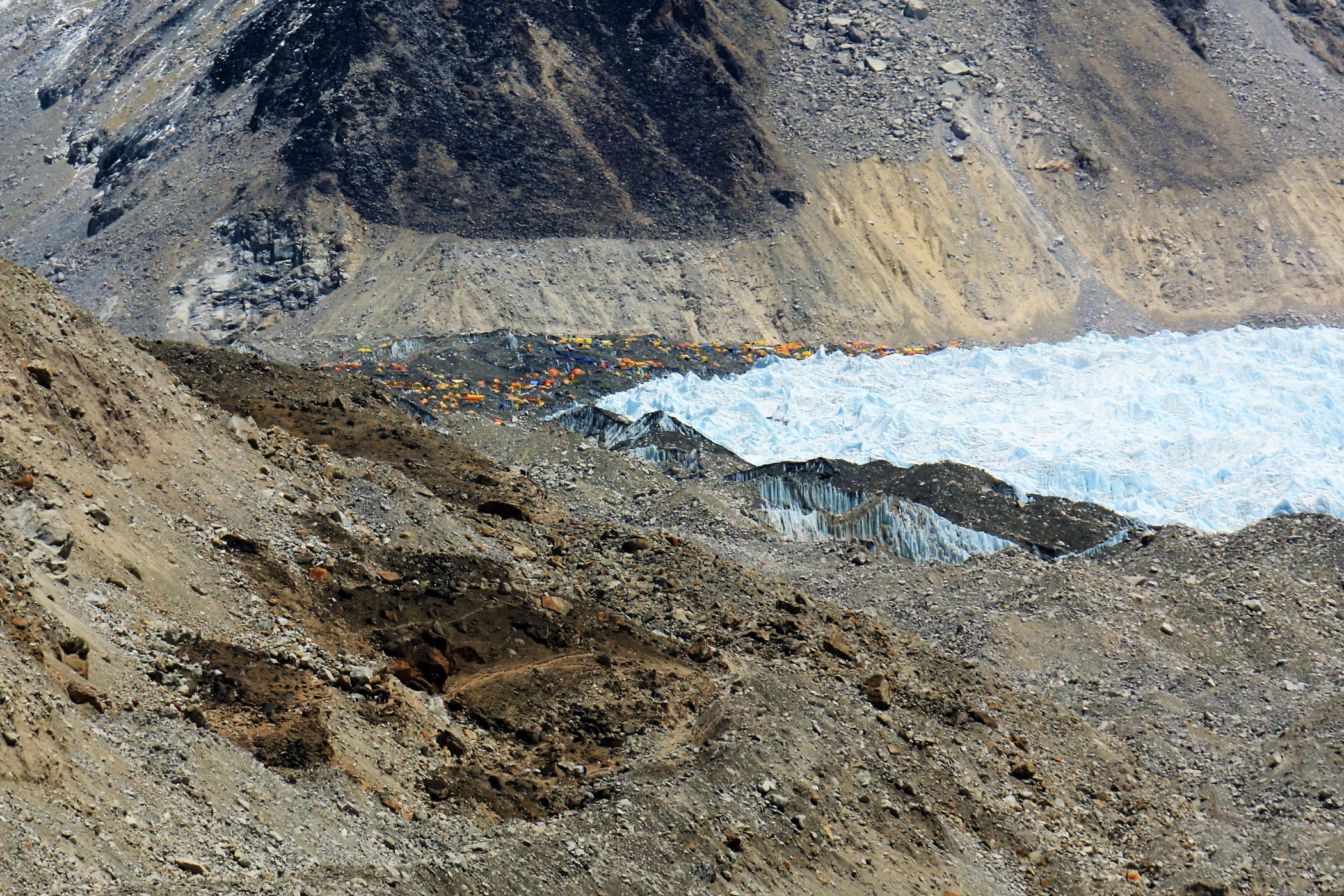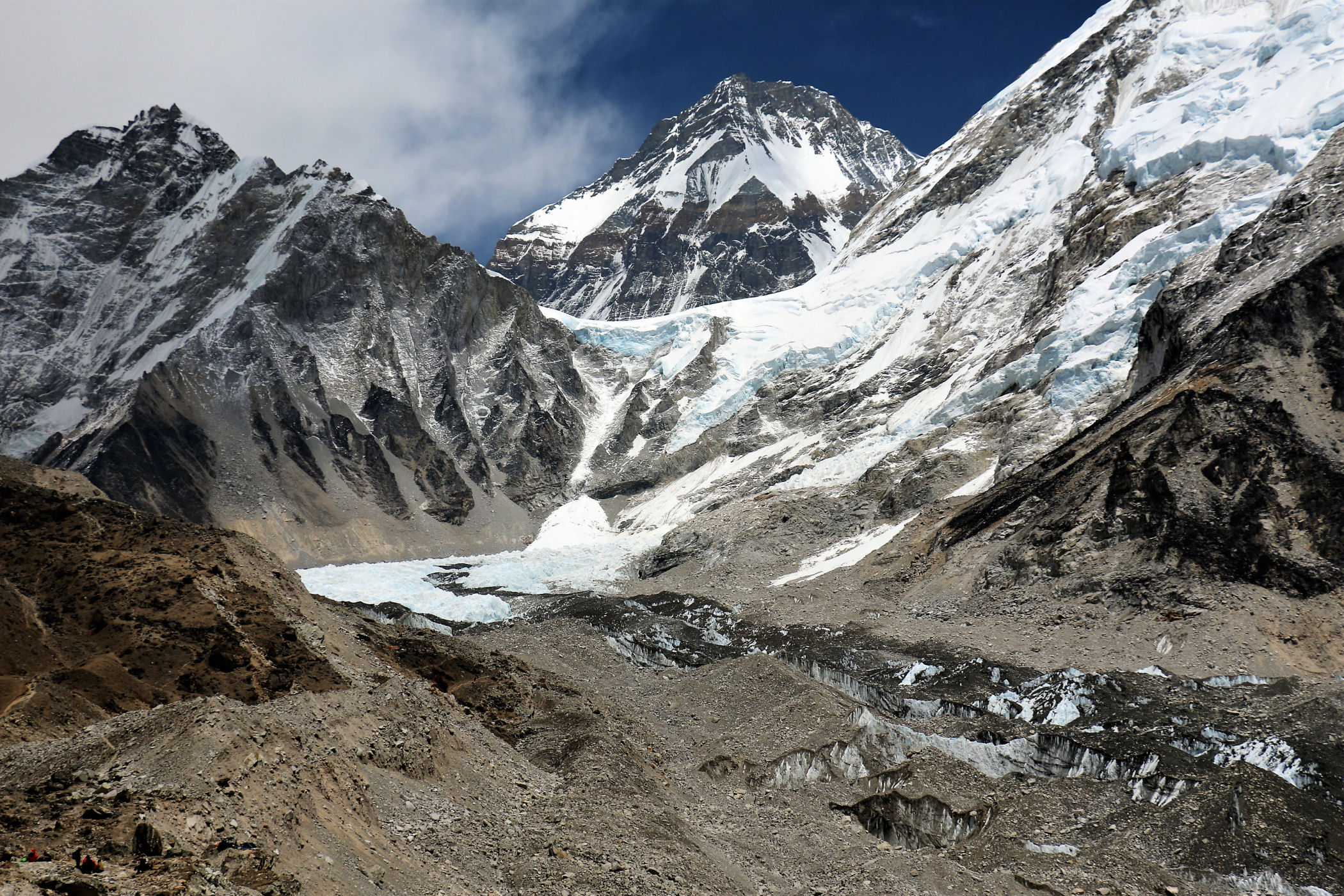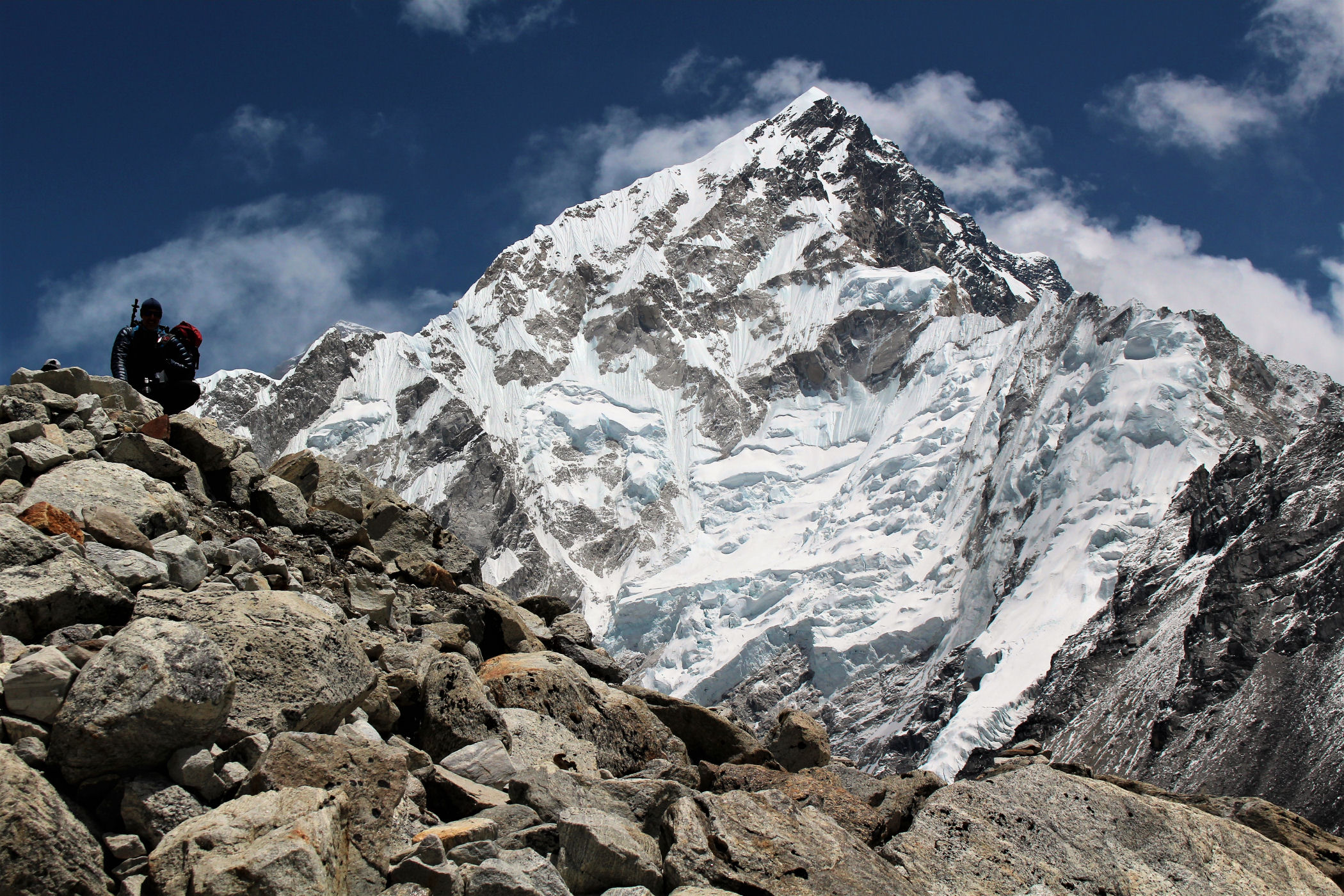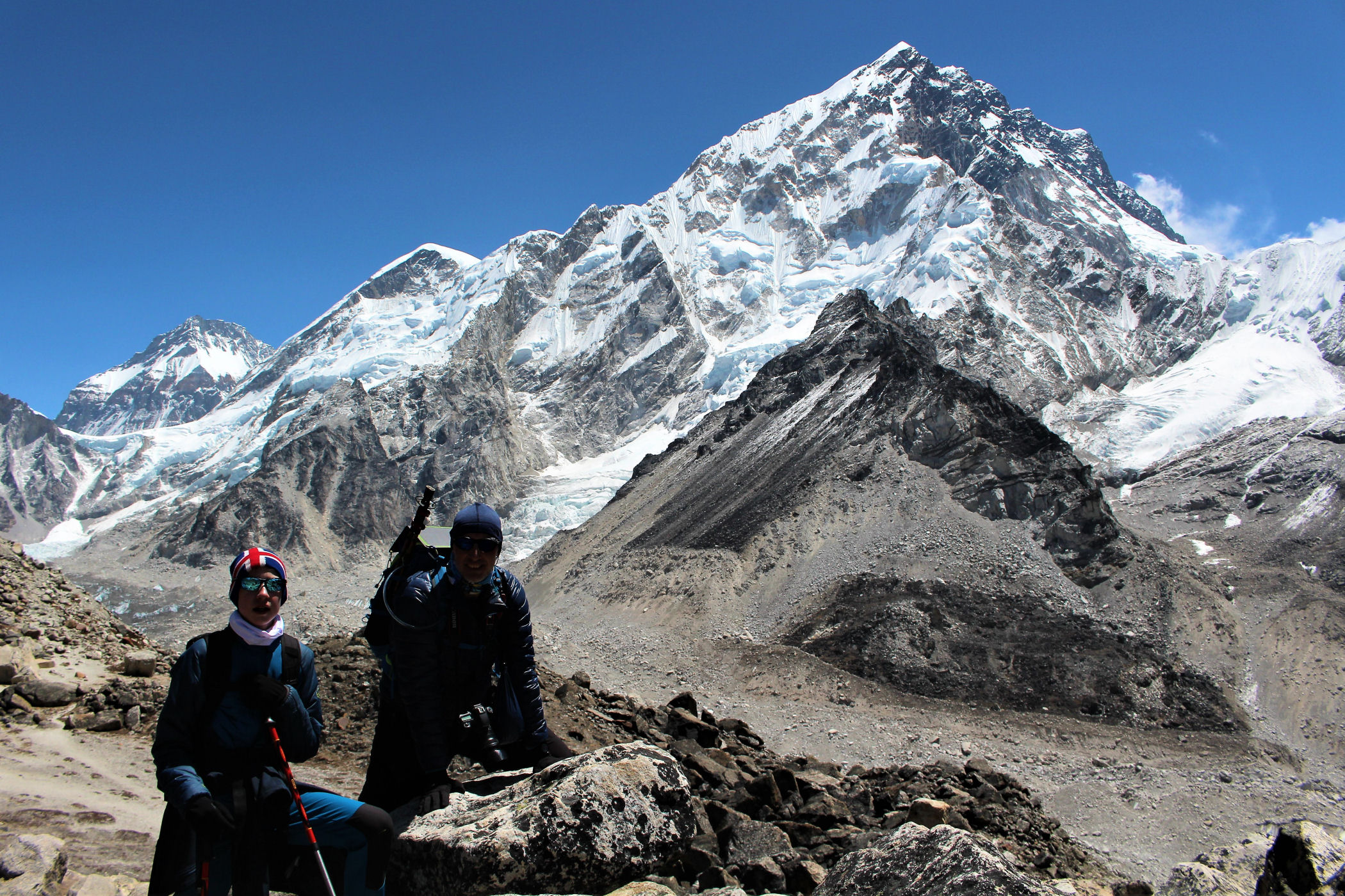 Tego dnia między punktem wyjścia , a celem nie ma już żadnej cywilizacji, a co za tym idzie – żadnego postoju. Można co prawda zboczyć ze szlaku do włoskiej stacji badawczej, ale my tego nie robimy. Mamy do pokonania zaledwie 270m różnicy wysokości i 6km drogi, ale zajmuje nam to prawie 4 godziny. Wszyscy są już strasznie zmęczeni, wysokość robi swoje. Cały dzisiejszy szlak ciągnie się wzdłuż Lodowca Khumbu. Po lewej stronie masyw Lobuche (6135m), po prawej Mehra Peak (5820m) , za nim przepiękny szczyt Nuptse (7864m). Krajobraz jest już całkowicie surowy, tylko kamienie, skały i lód, zero roślinności.
