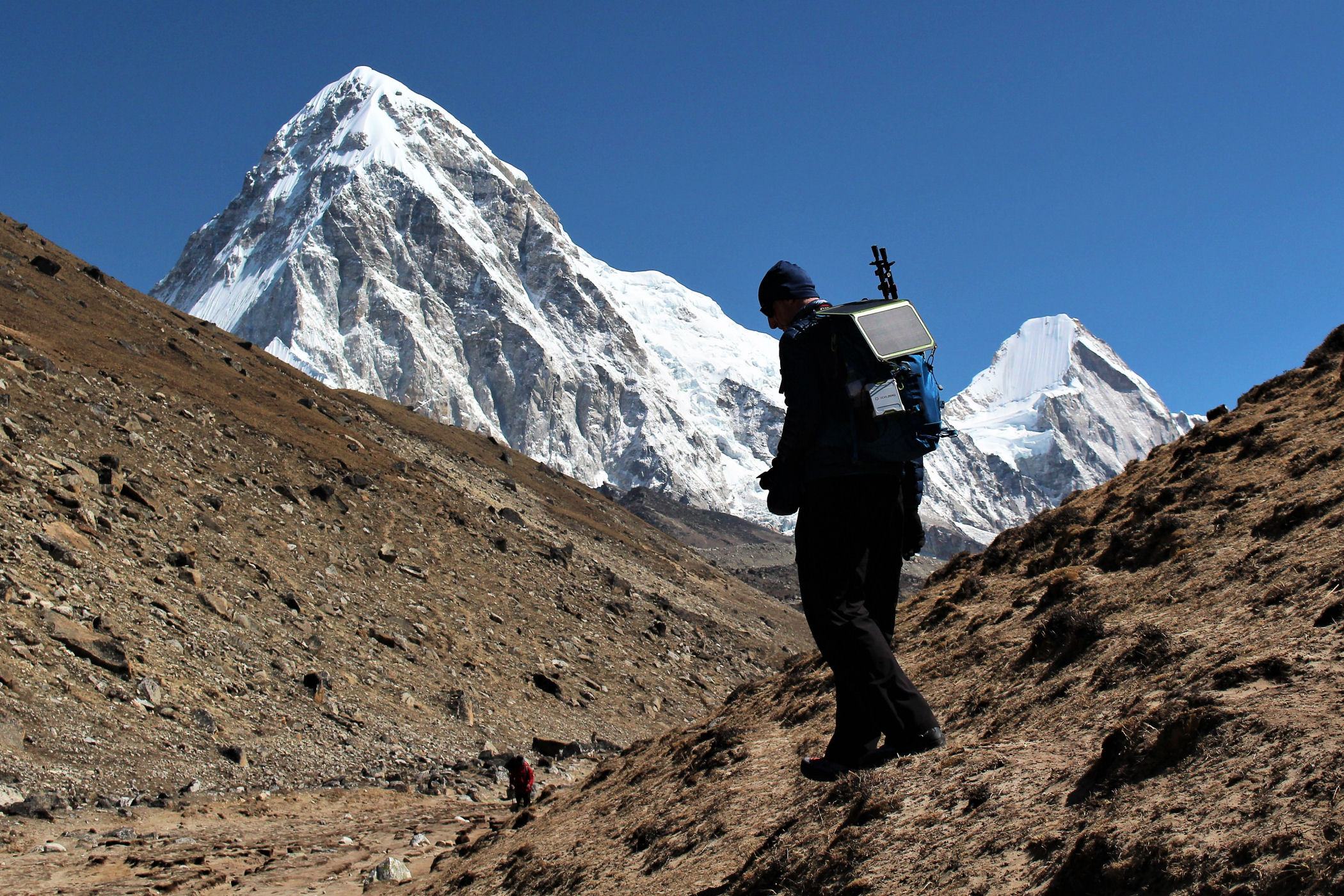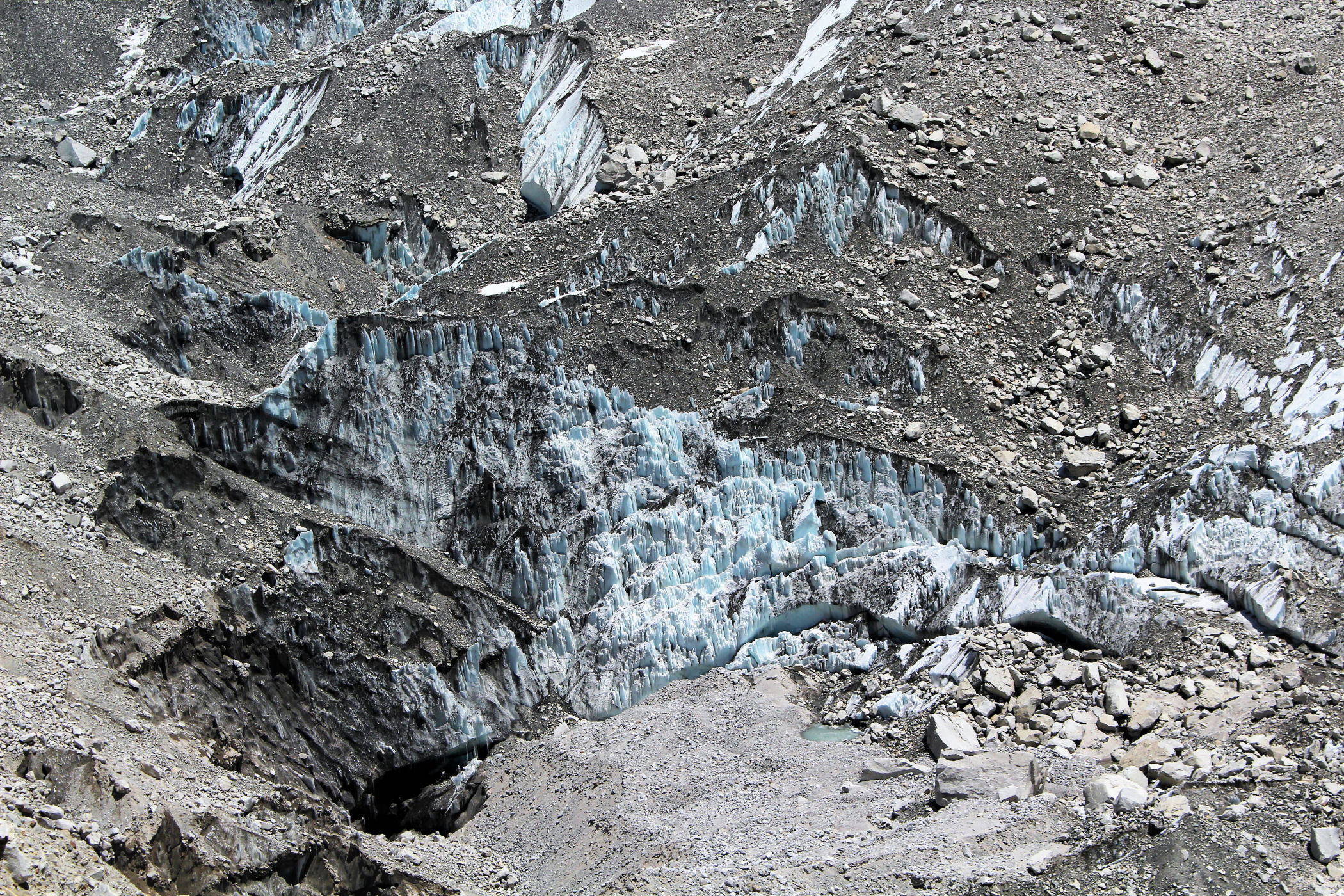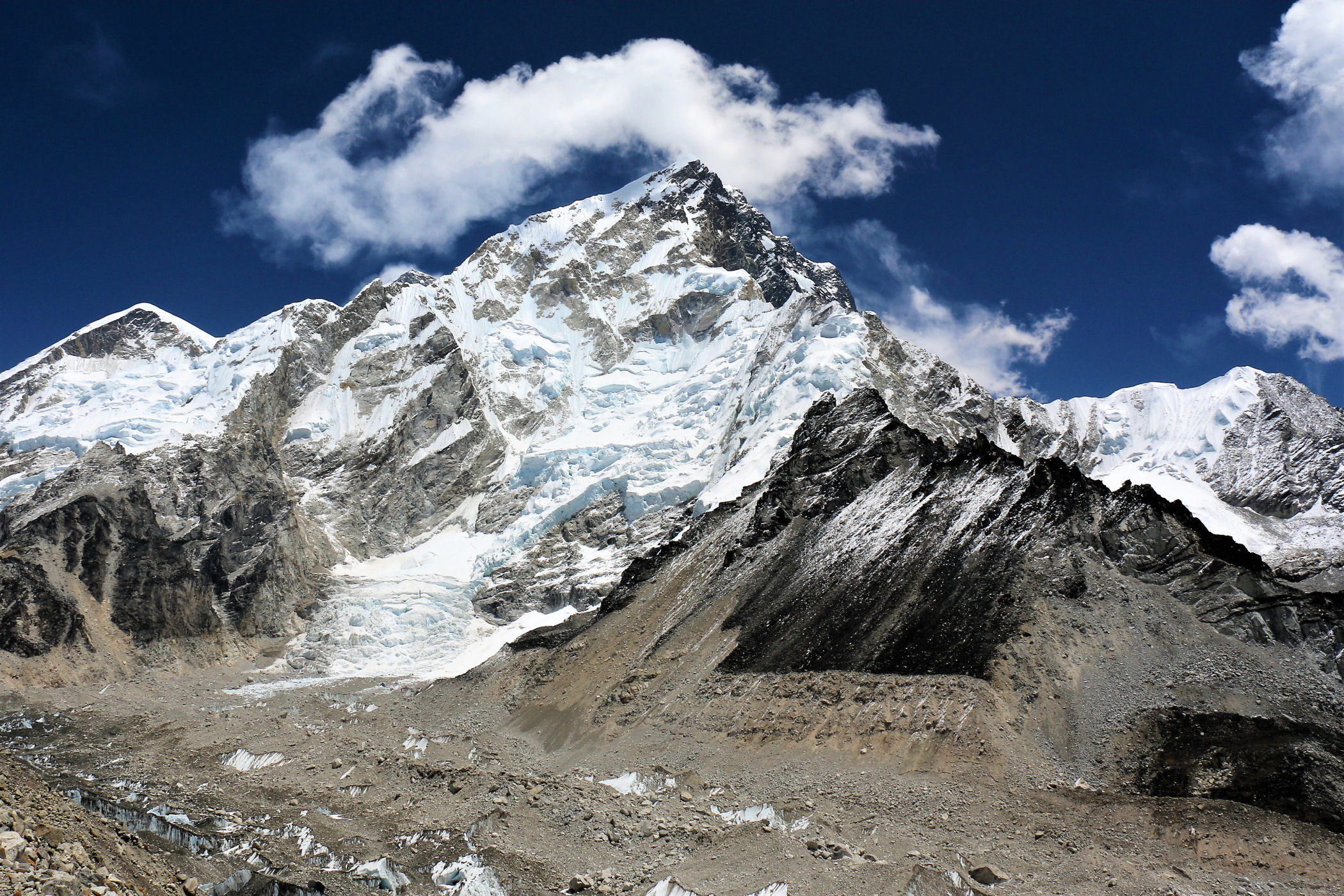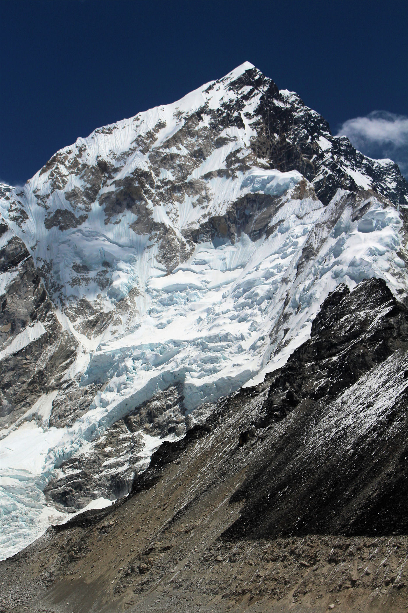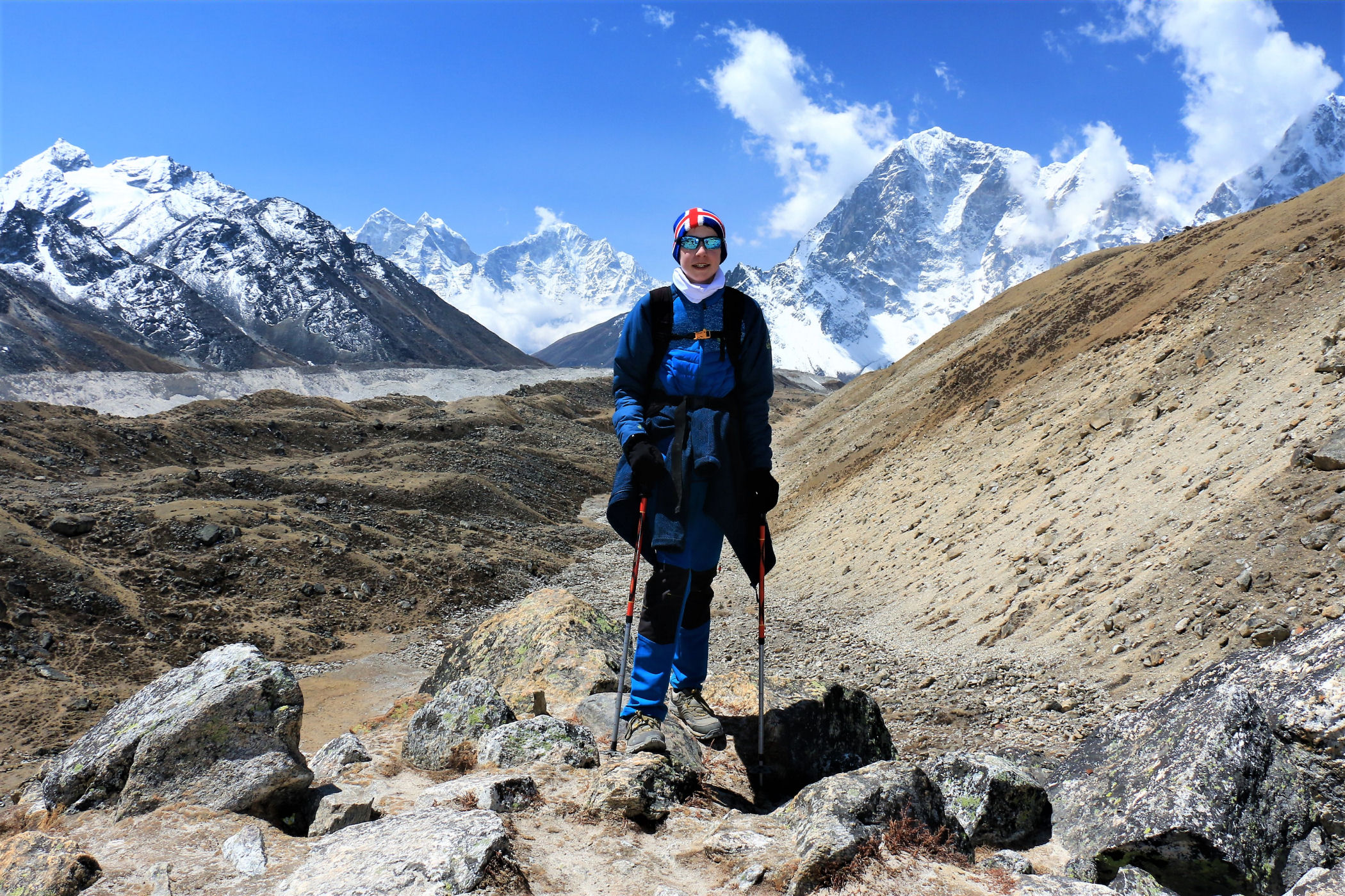 Tego dnia między punktem wyjścia , a celem nie ma już żadnej cywilizacji, a co za tym idzie – żadnego postoju. Można co prawda zboczyć ze szlaku do włoskiej stacji badawczej, ale my tego nie robimy. Mamy do pokonania zaledwie 270m różnicy wysokości i 6km drogi, ale zajmuje nam to prawie 4 godziny. Wszyscy są już strasznie zmęczeni, wysokość robi swoje. Cały dzisiejszy szlak ciągnie się wzdłuż Lodowca Khumbu. Po lewej stronie masyw Lobuche (6135m), po prawej Mehra Peak (5820m) , za nim przepiękny szczyt Nuptse (7864m). Krajobraz jest już całkowicie surowy, tylko kamienie, skały i lód, zero roślinności.