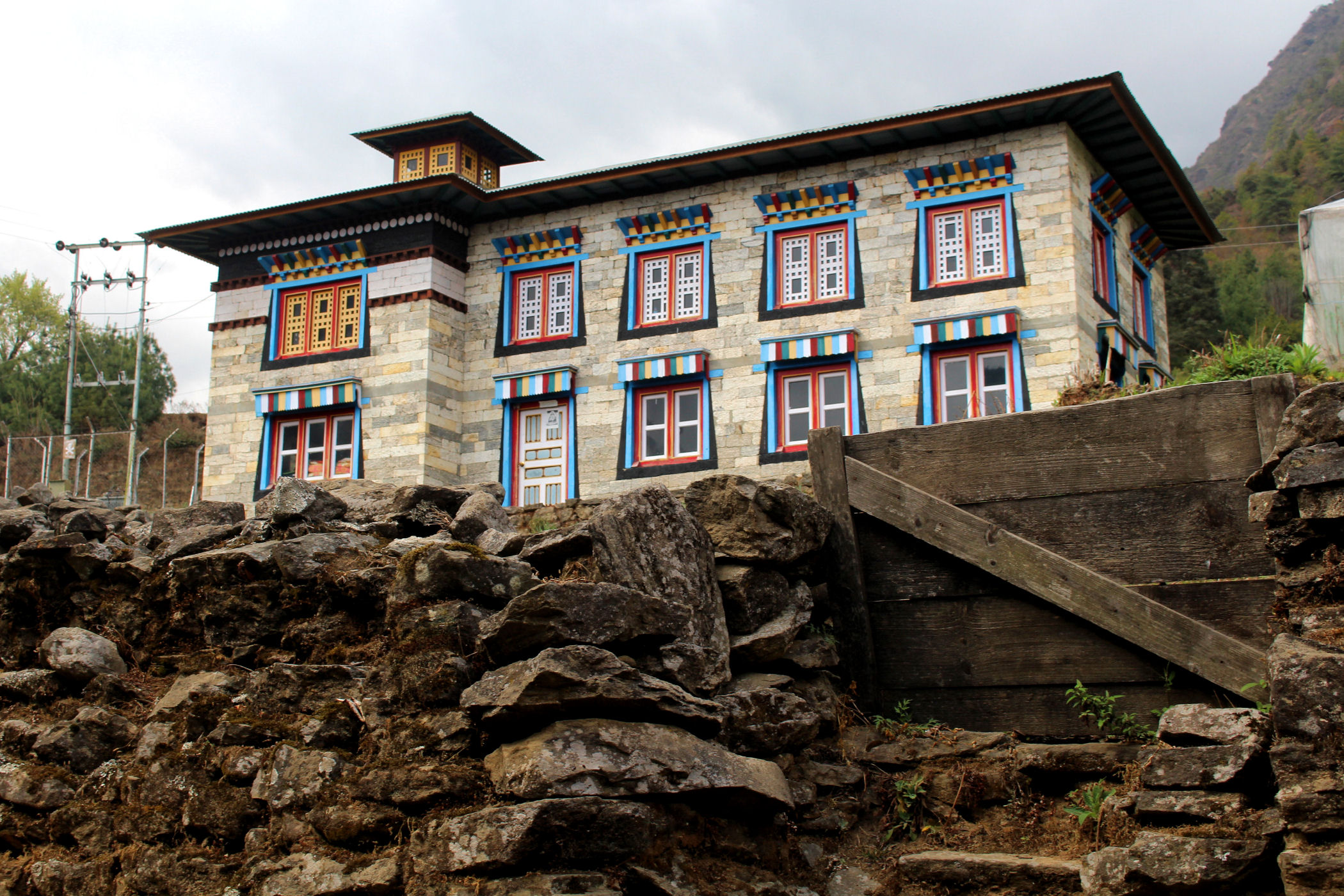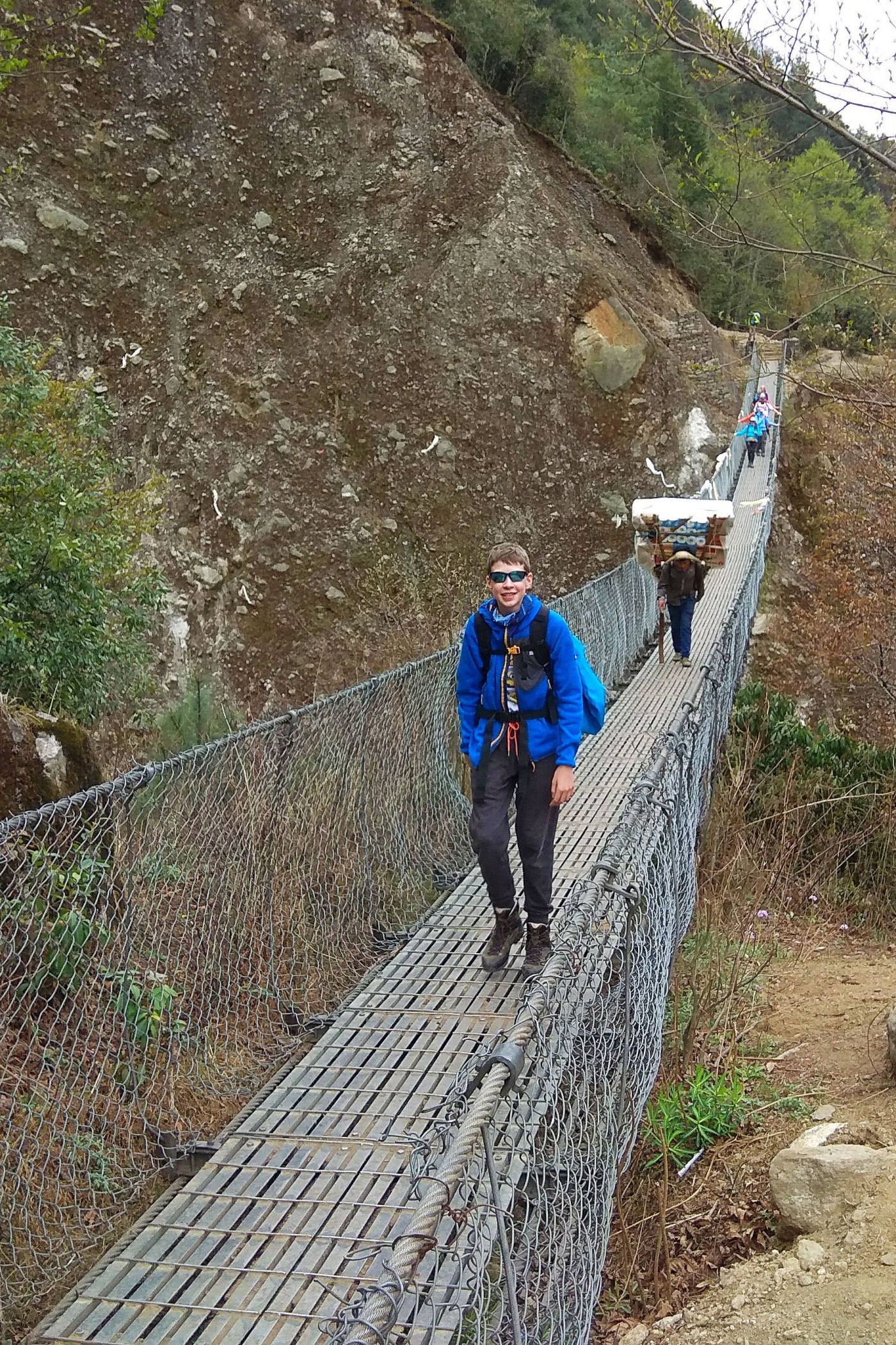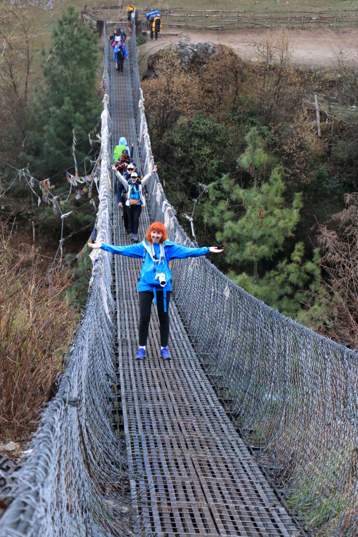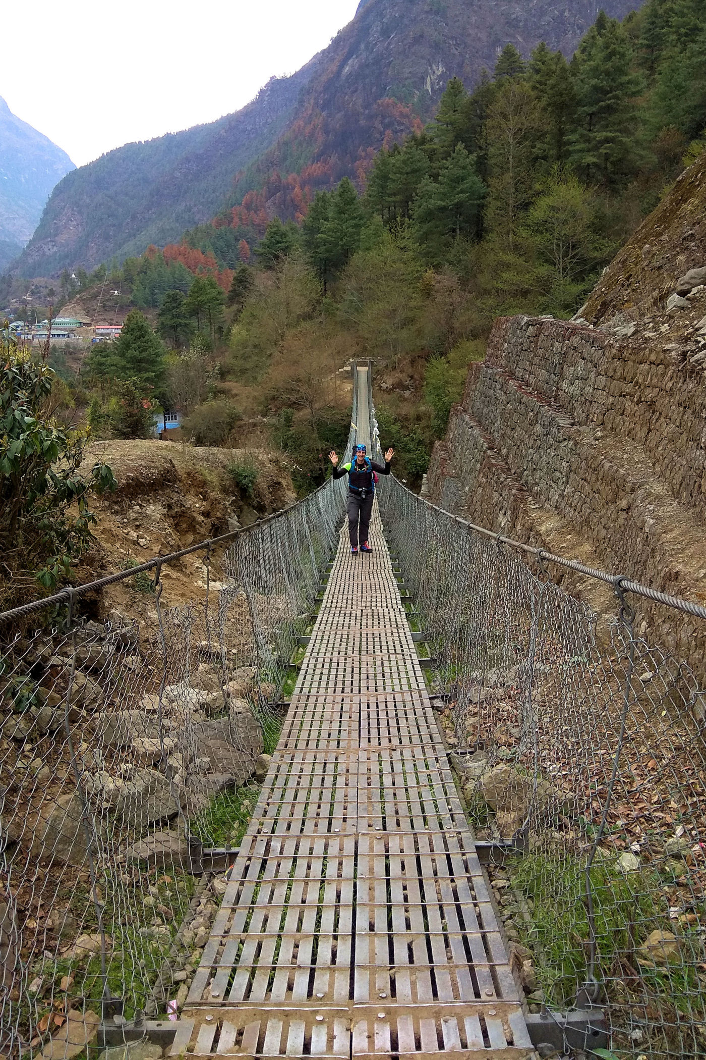 Pierwszy dzień trekkingu to tak na prawdę zejście 250m w dół. Szlak jednak pnie się raz w górę, raz w dół. Trasę pokonujemy częściowo w deszczu, nie jest ciężko, to dobry dzień na rozruszanie się i aklimatyzację. Mijamy kolejne miejscowości : Chheplung z uroczą stupą buddyjską i pierwszym na trasie mostem, Nachipang, Koshigaun, Ghat i po 3 godzinach wędrówki docieramy do naszego celu – Phakding, jeszcze tylko przejście mostem wiszącym nad rzeką Dhudh Kosi i meldujemy się w pierwszej lodży : Sherpa Farmhouse . Pokoje i restauracja są tu bardzo sympatyczne, czyste, mamy nawet prześcieradła i poduszki, a nasi pechowcy bez bagaży dostają nawet kołdry. Zjadamy przepyszną kolację i kładziemy się spać, przed nami bardzo trudny dzień.