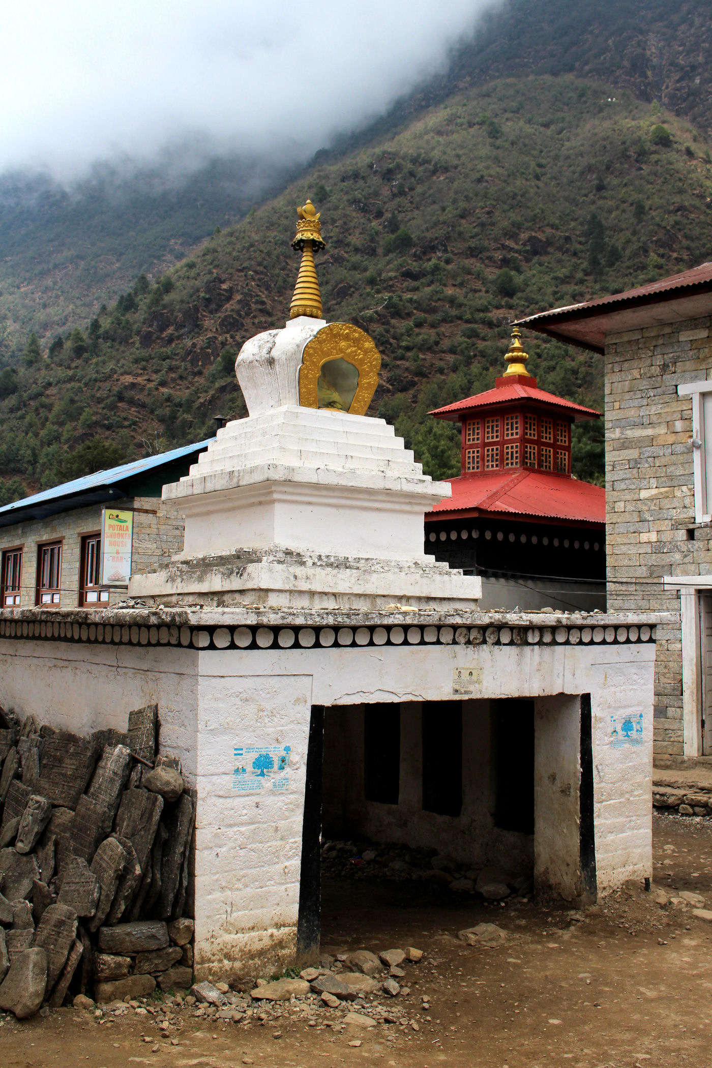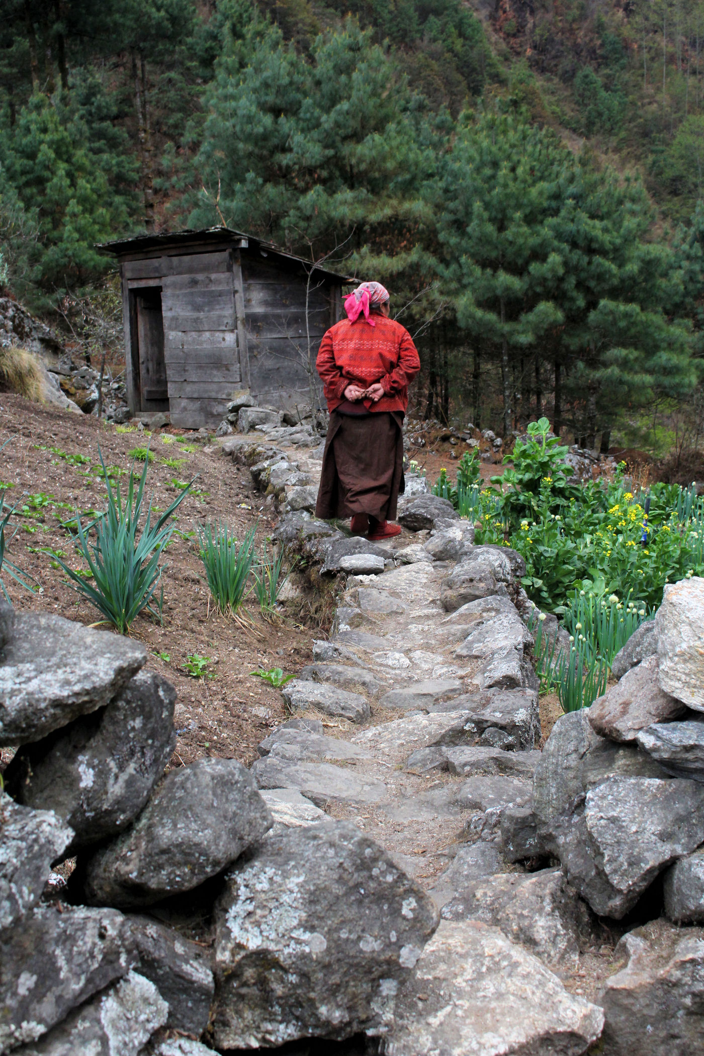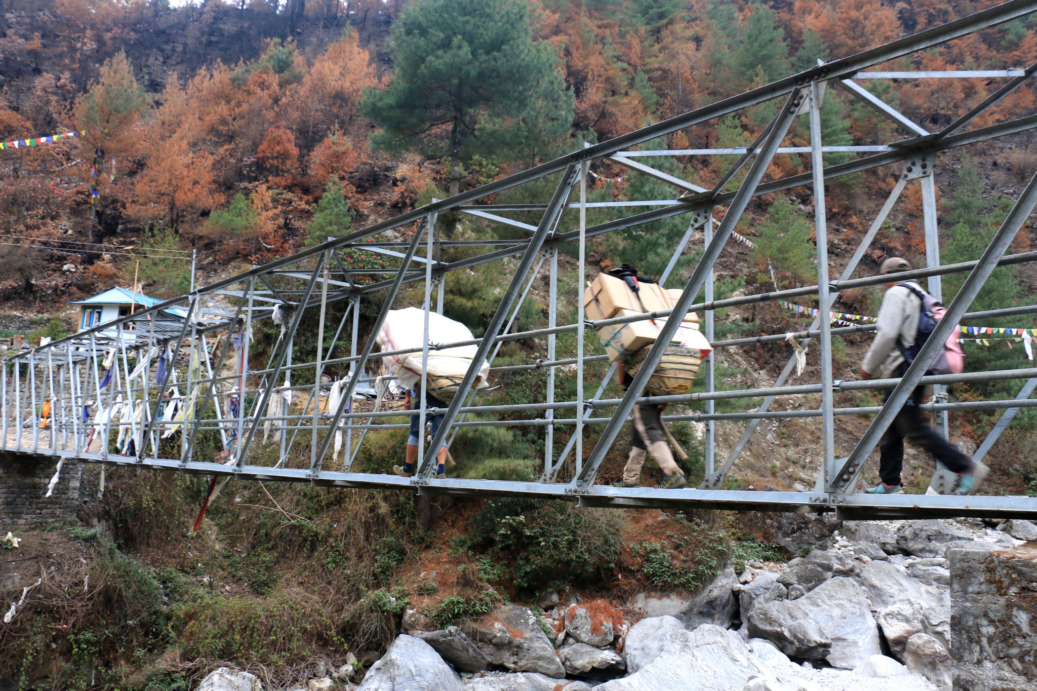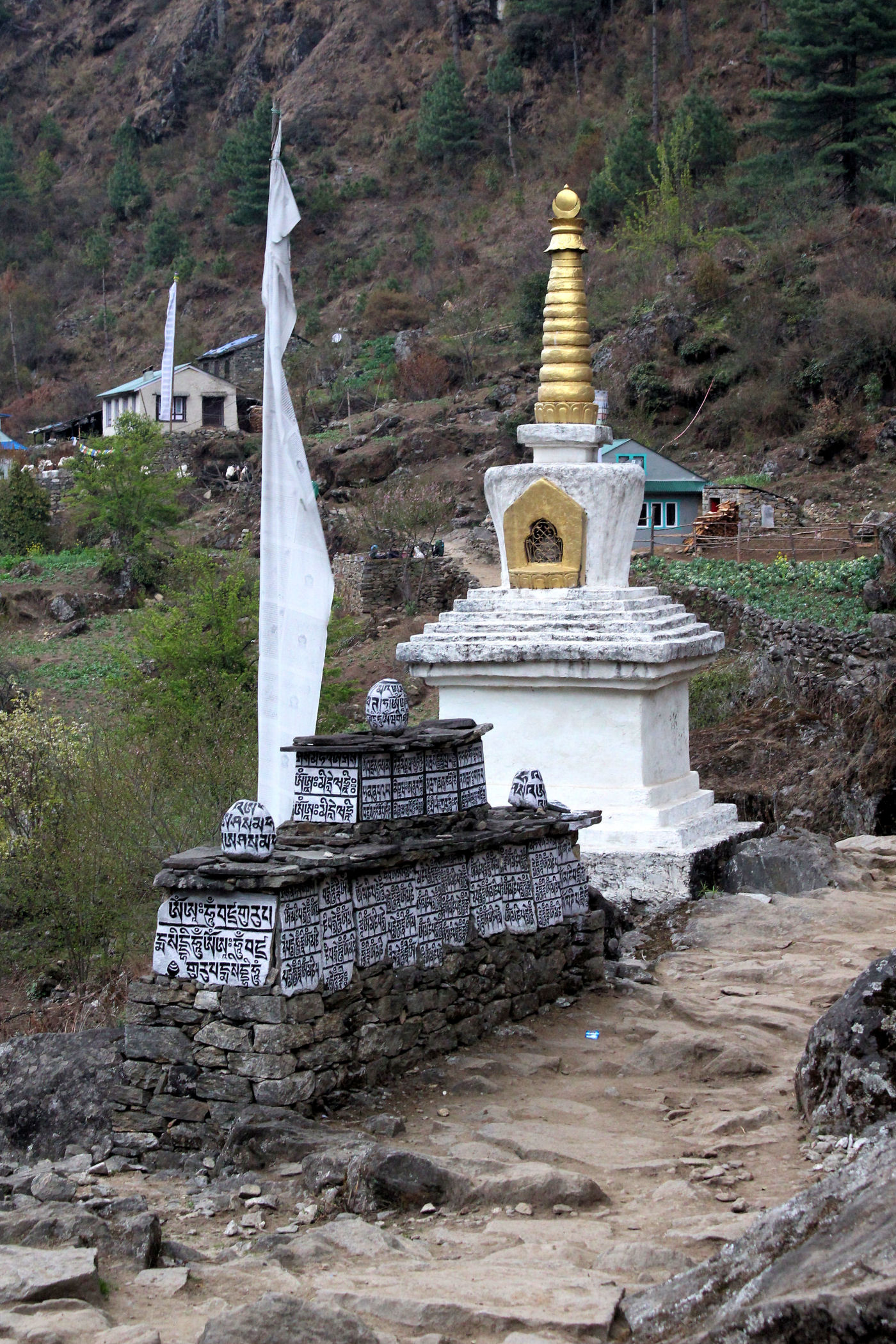 Pierwszy dzień trekkingu to tak na prawdę zejście 250m w dół. Szlak jednak pnie się raz w górę, raz w dół. Trasę pokonujemy częściowo w deszczu, nie jest ciężko, to dobry dzień na rozruszanie się i aklimatyzację. Mijamy kolejne miejscowości : Chheplung z uroczą stupą buddyjską i pierwszym na trasie mostem, Nachipang, Koshigaun, Ghat i po 3 godzinach wędrówki docieramy do naszego celu – Phakding, jeszcze tylko przejście mostem wiszącym nad rzeką Dhudh Kosi i meldujemy się w pierwszej lodży : Sherpa Farmhouse . Pokoje i restauracja są tu bardzo sympatyczne, czyste, mamy nawet prześcieradła i poduszki, a nasi pechowcy bez bagaży dostają nawet kołdry. Zjadamy przepyszną kolację i kładziemy się spać, przed nami bardzo trudny dzień.