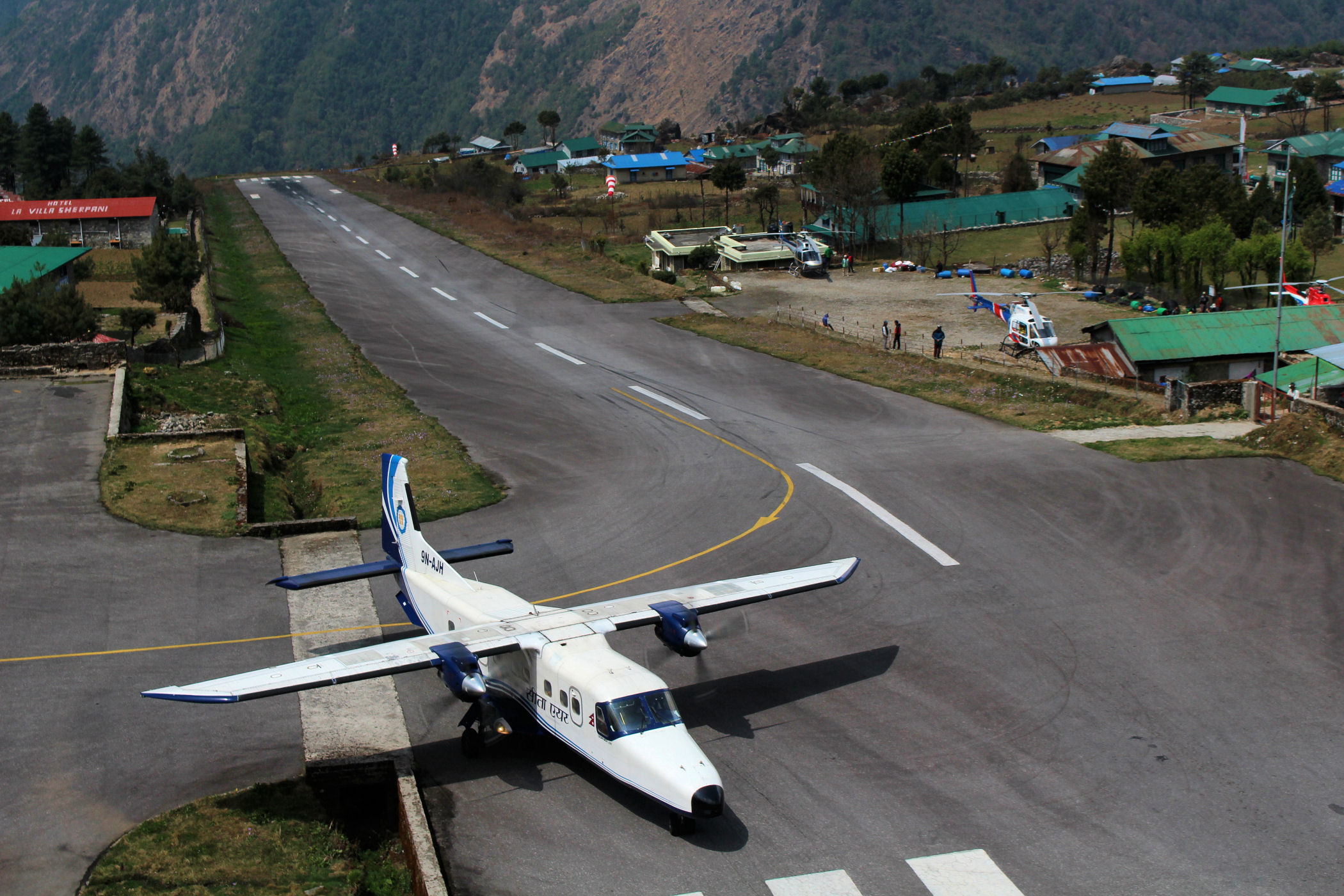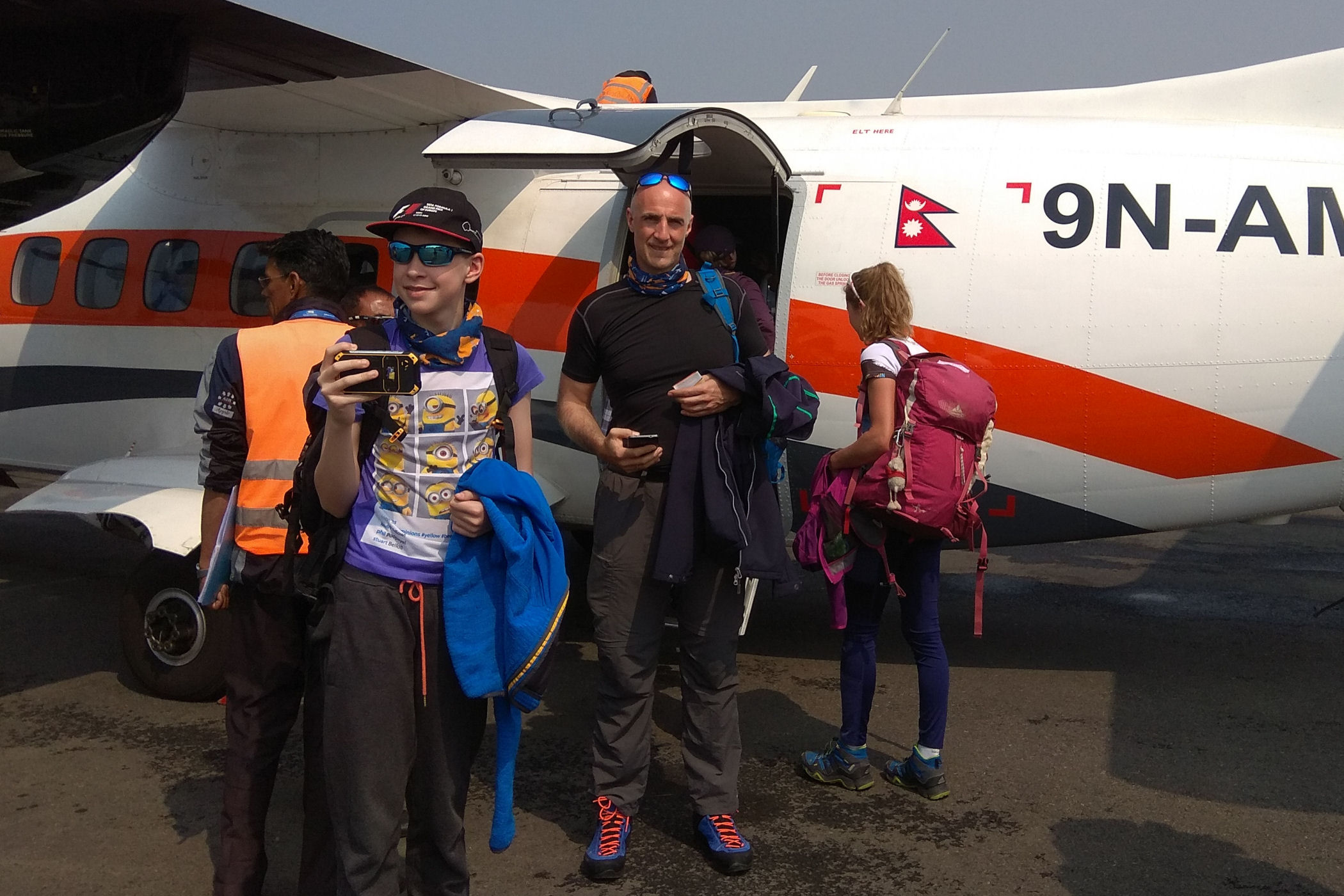 9.30 jesteśmy już w samolocie – mamy ogromne szczęście, bo jesteśmy w jednym z ostatnich samolotów tego dnia, a przez kolejne 3 nic nie będzie latać ze względu na pogodę. We wnętrzu mieści się 20 osób + stewardesa. Przelot to wielkie emocje – lecimy w końcu ku naszej największej przygodzie, do tego czeka nas wizja lądowania na najbardziej niebezpiecznym lotnisku świata. 10.15 szczęśliwie lądujemy na lotnisku TENZINGA HILAREGO.