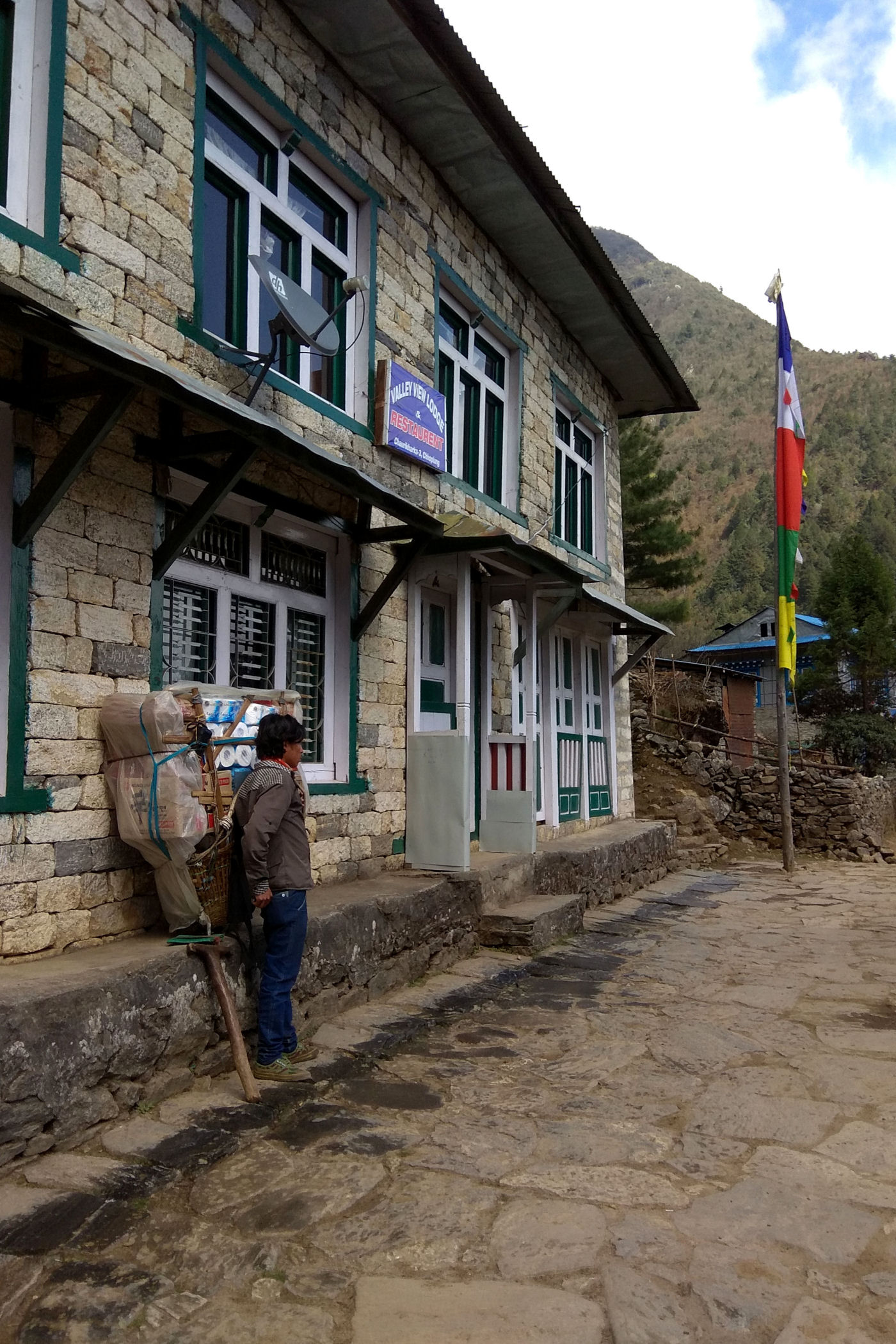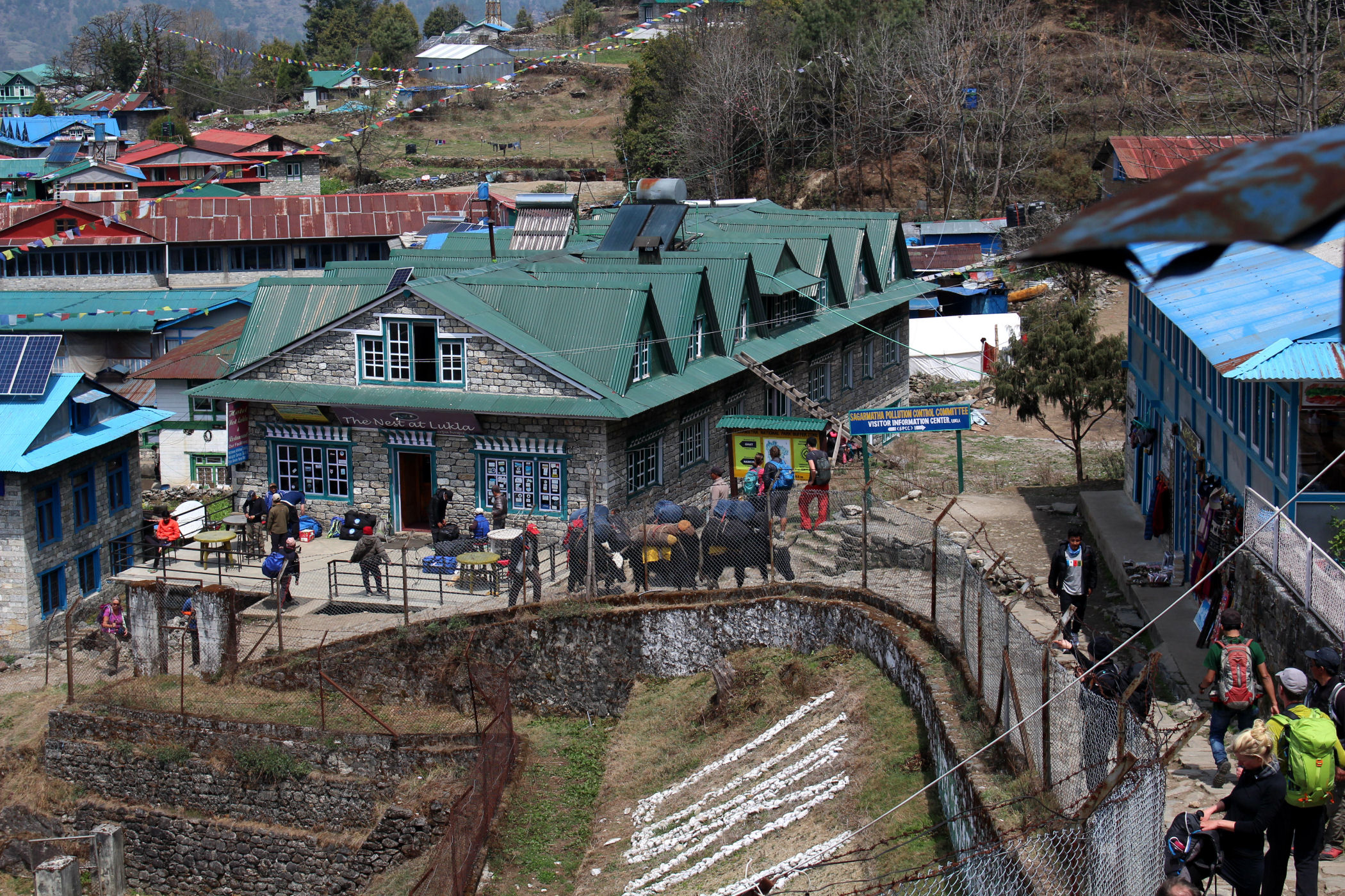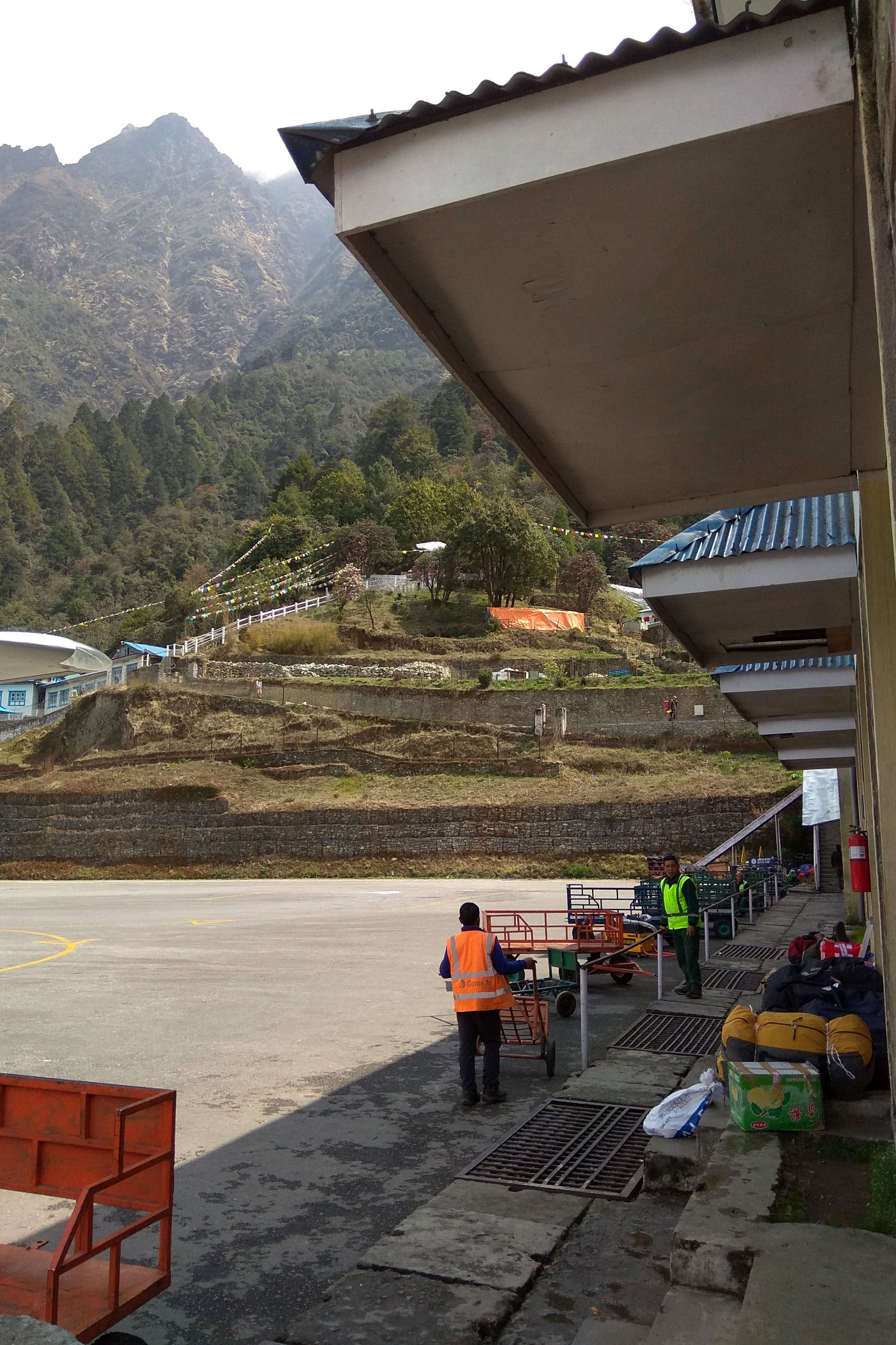 Kiedy lądujemy okazuje się, że część bagaży nie dotarła, oczekujemy więc na kolejne samoloty na schodach powyżej pasa startowego. Loty zostają jednak wstrzymane i 5 osób przez kolejne 3 dni musi sobie poradzić bez swoich rzeczy. Pobyt w Lukli zaczynamy od lunchu w MEET AND GREET (hotel i restauracja), której właścicielem jest szef agencji z którą wędrujemy, a potem ruszamy na pierwszą (najkrótszą) część naszej wędrówki.