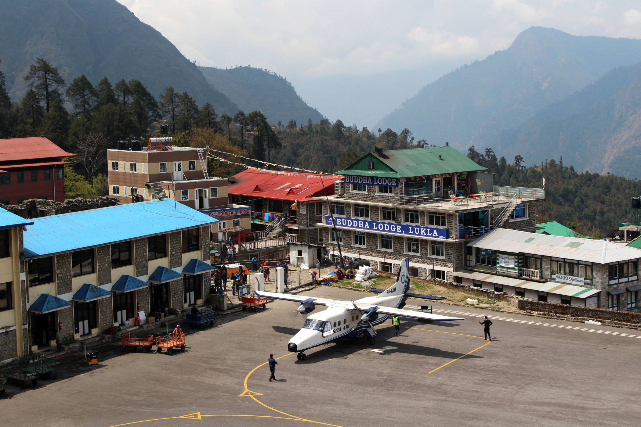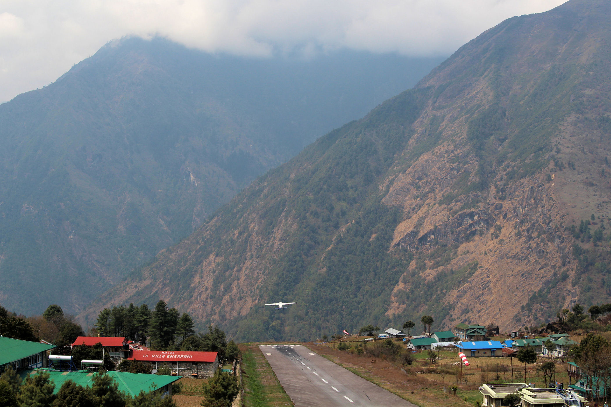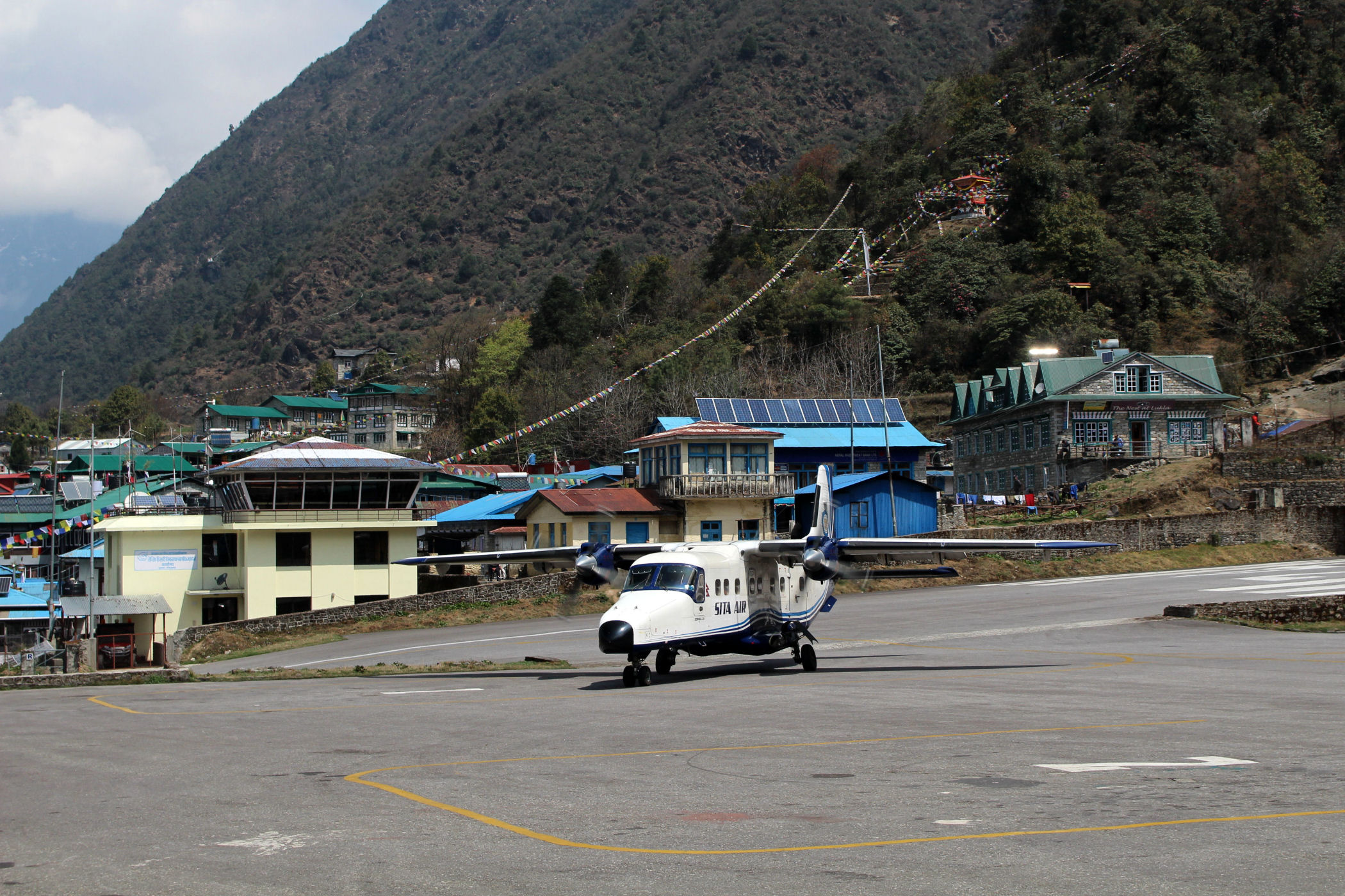 Lukla znajduje się na wysokości 2860m n.p.m. i swój rozwój zawdzięcza najważniejszemu i jedynemu w tym rejonie lotnisku, które nie cieszy się dobrą sławą. Obsługuje ono dziennie średnio 500 pasażerów, a ma zaledwie jeden krótki pas startowy o długości 460 m i szerokości 20 m, jest więc przystosowane tylko do małych samolotów i helikopterów. Pas startowy zaczyna się litą skałą, a kończy 600-metrową przepaścią, nie da się więc zawrócić w razie problemów. Lądujące maszyny muszą trafić w wąski pas i wyhamować przed kończącą go ścianą, do tego nachylenie pasa wynosi aż 12 stopni. Ze względy na wysokość (prawie 3000m), porywiste wiatry i niski pułap chmur loty odbywają się tylko w godzinach porannych.